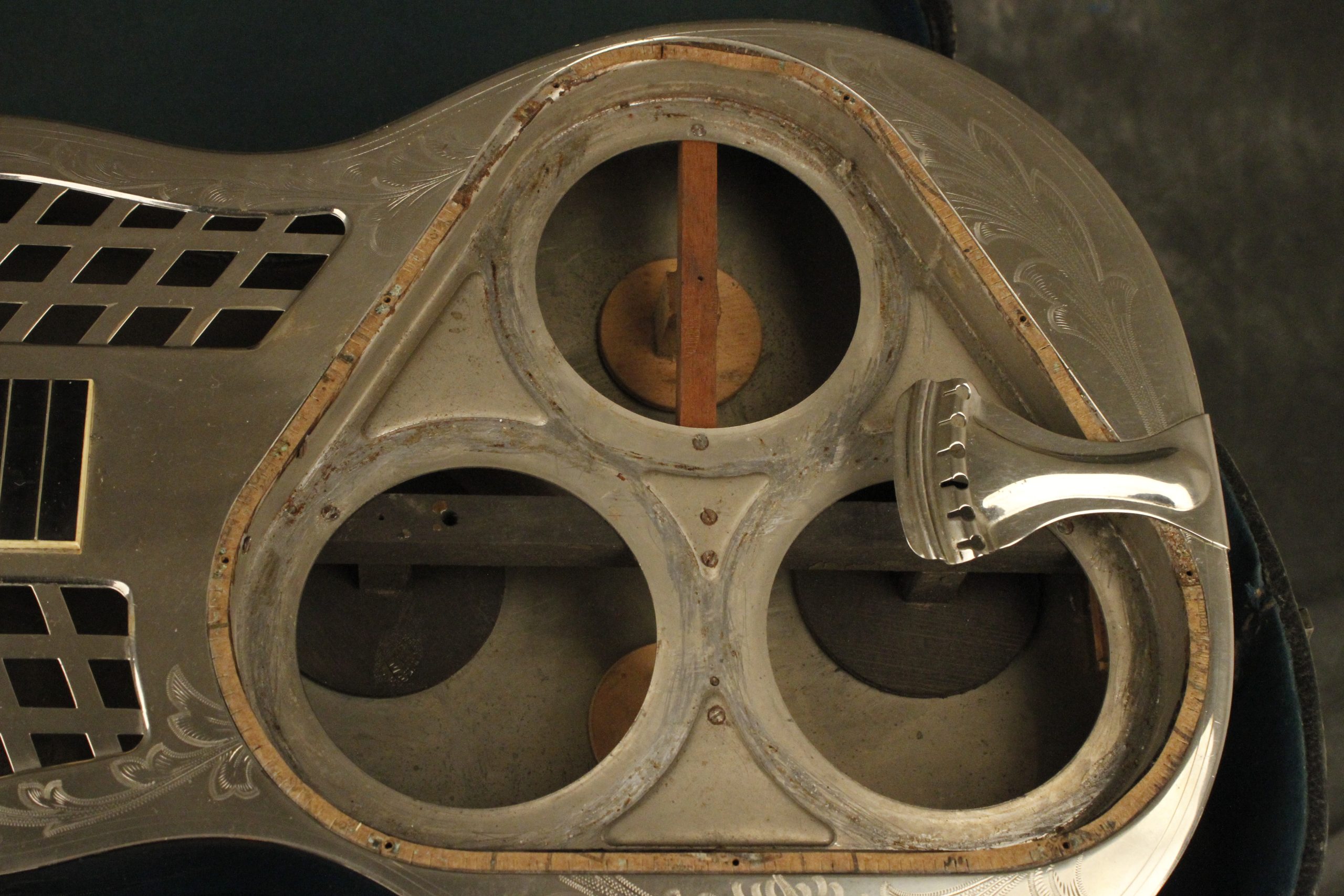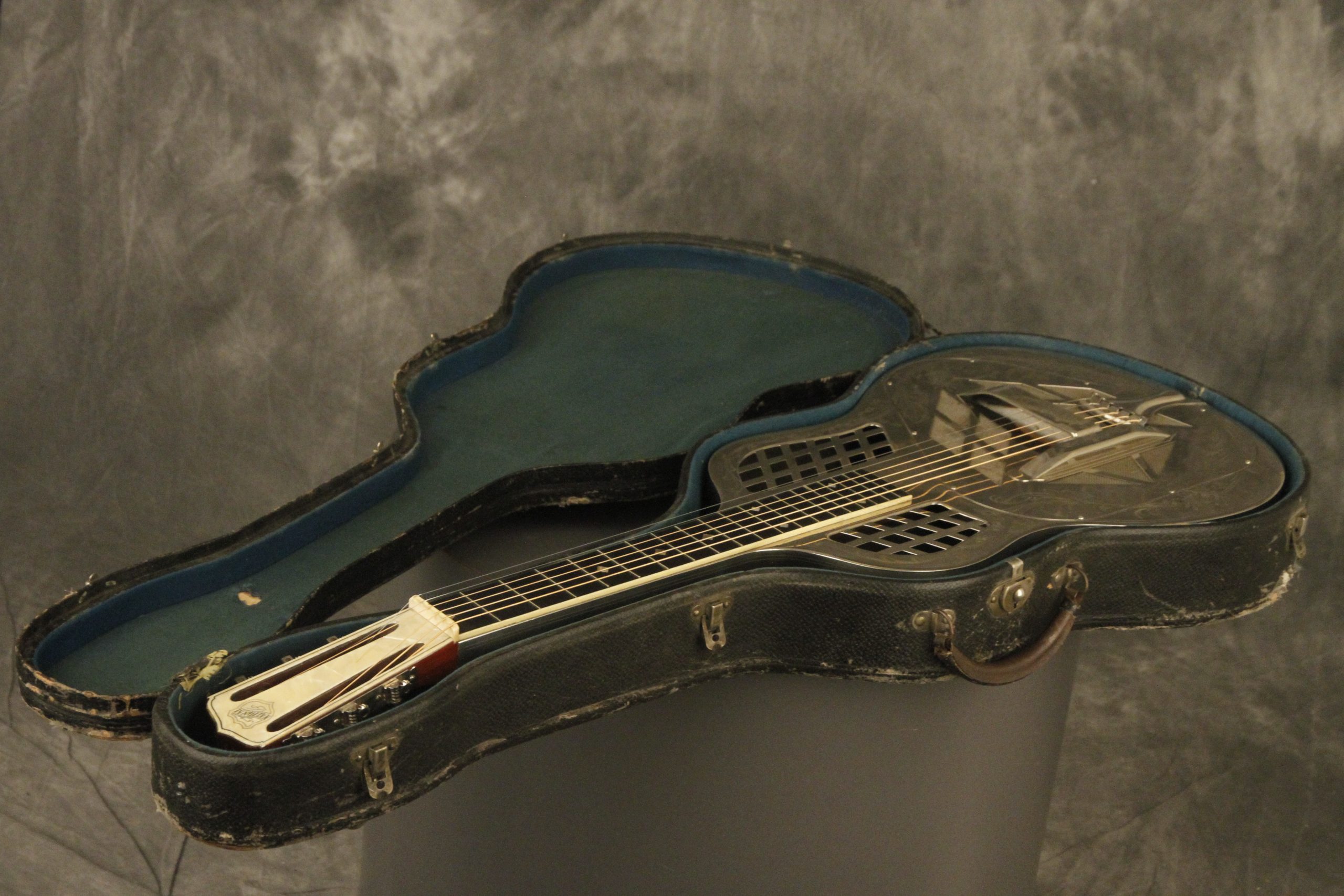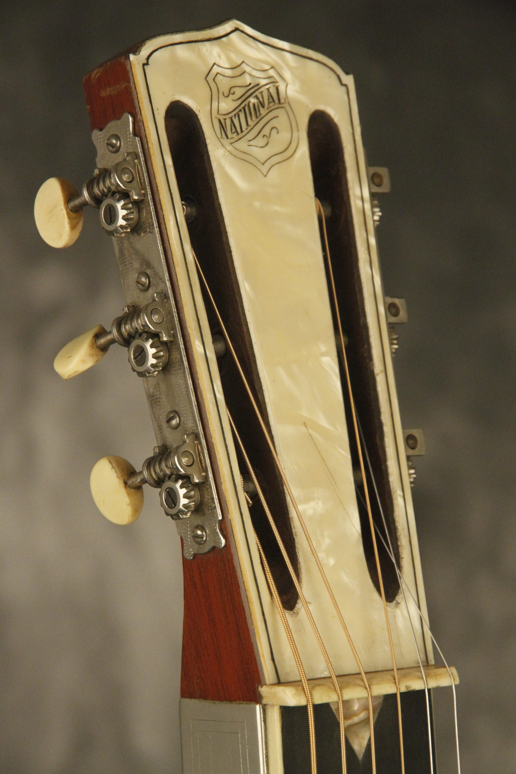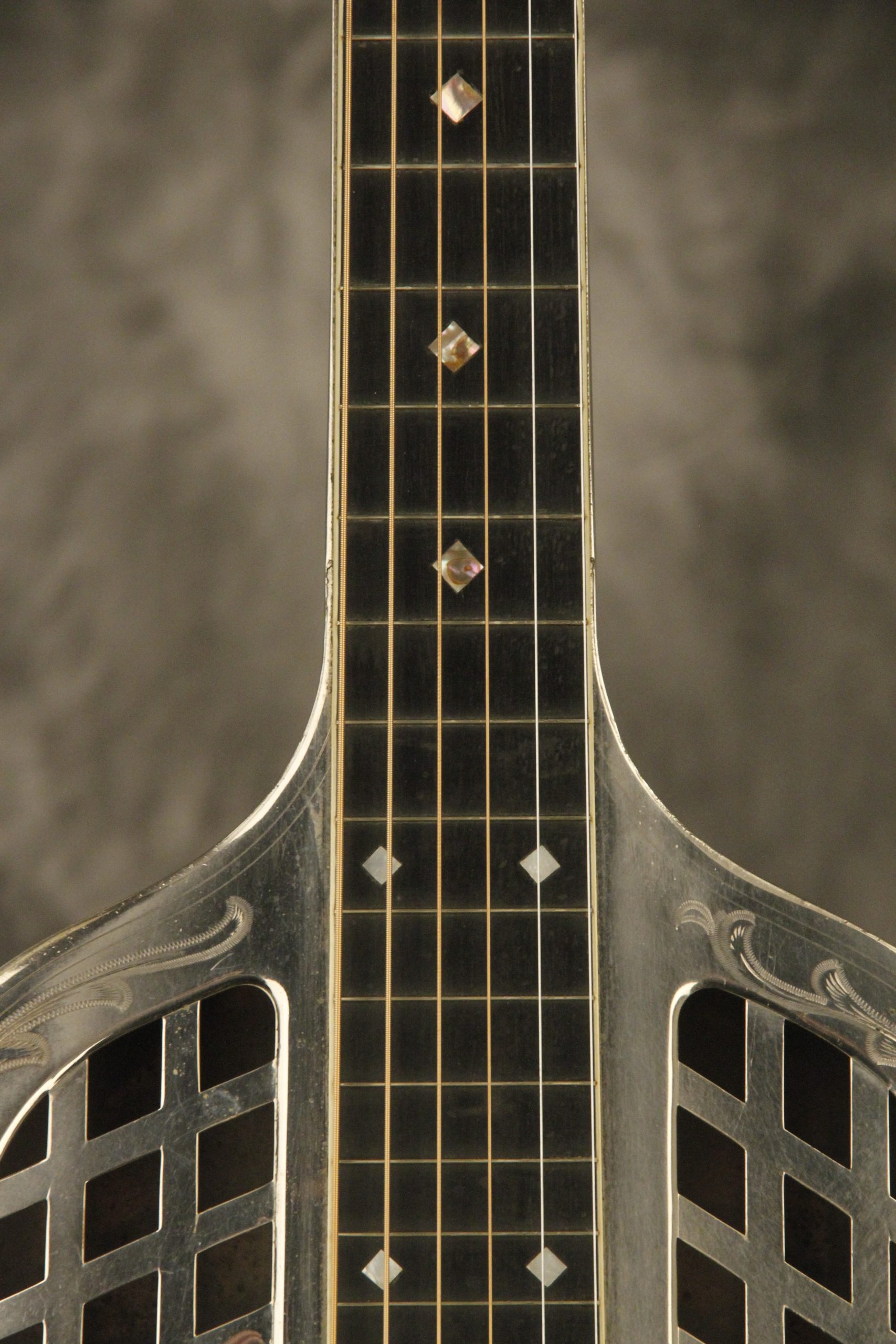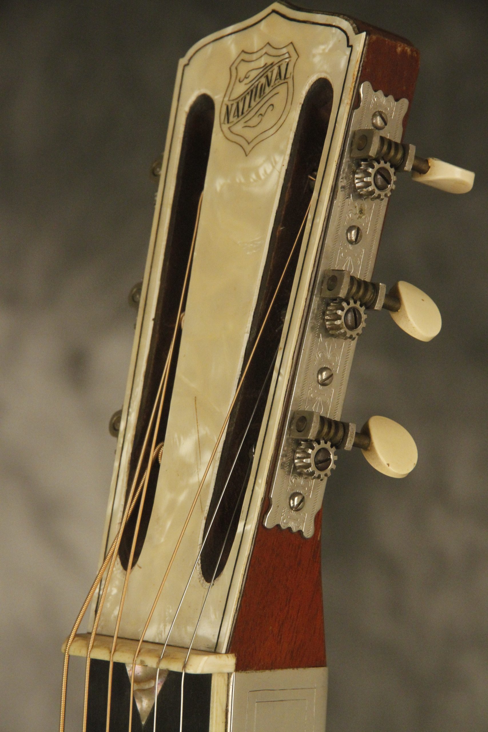 1930's National Style 4 Tri-Cone Resonator. The 3-set strip tuners on the bass side have been changed, but everything else appears to be original along with its original hardshell case. It's in great shape with some minor nicks + dings and other cosmetic wear. Everything remains structurally sound with no cracks, breaks or repairs.