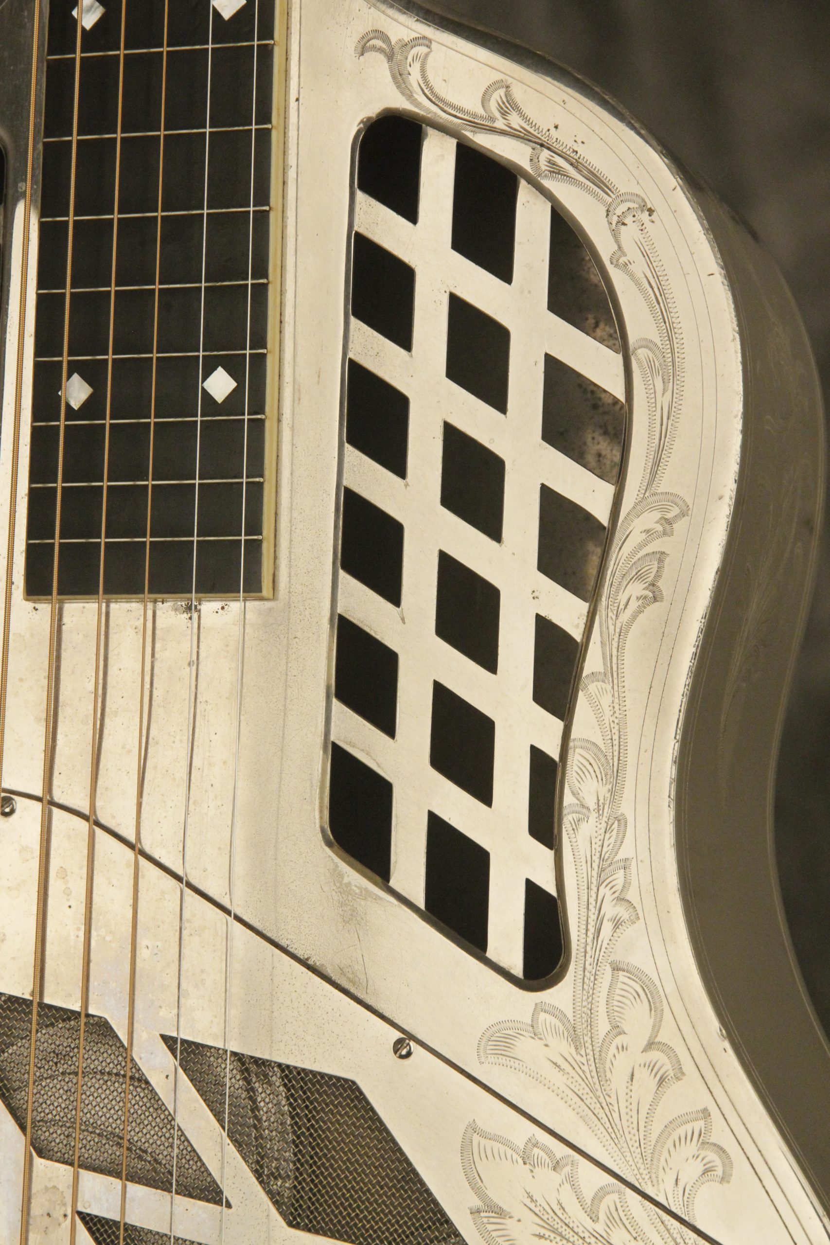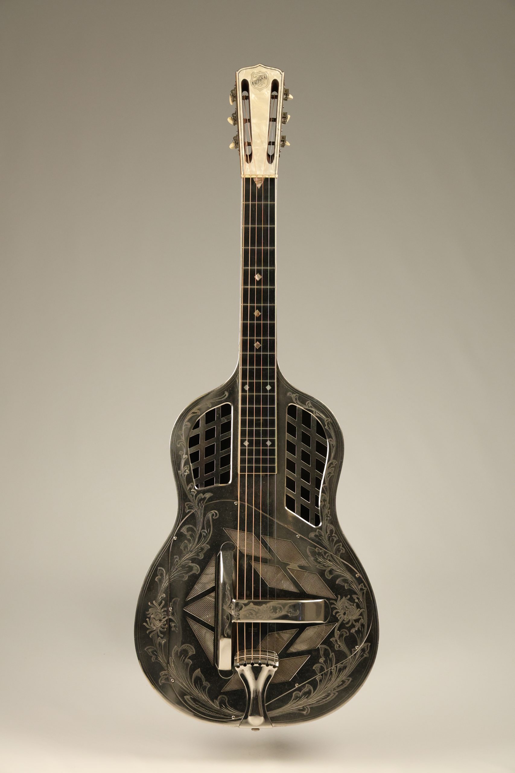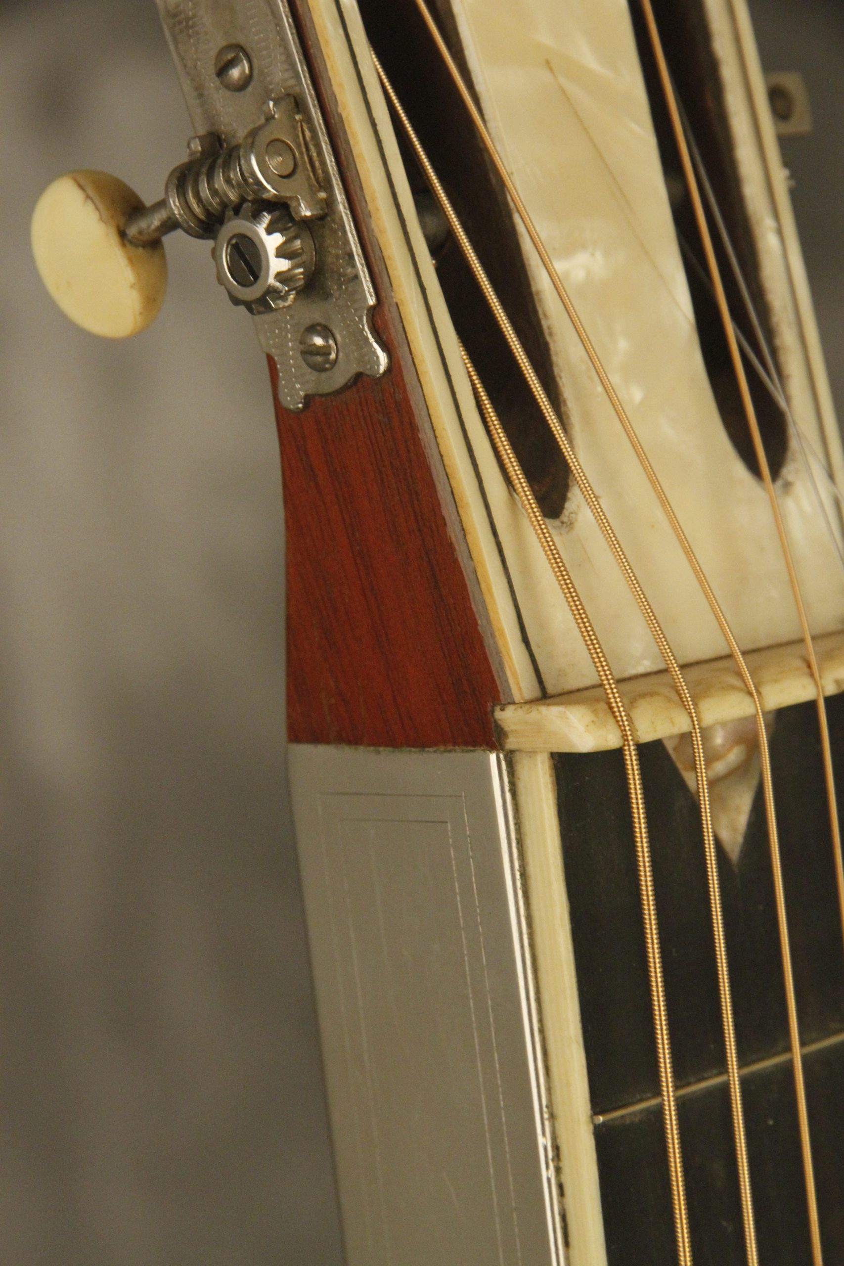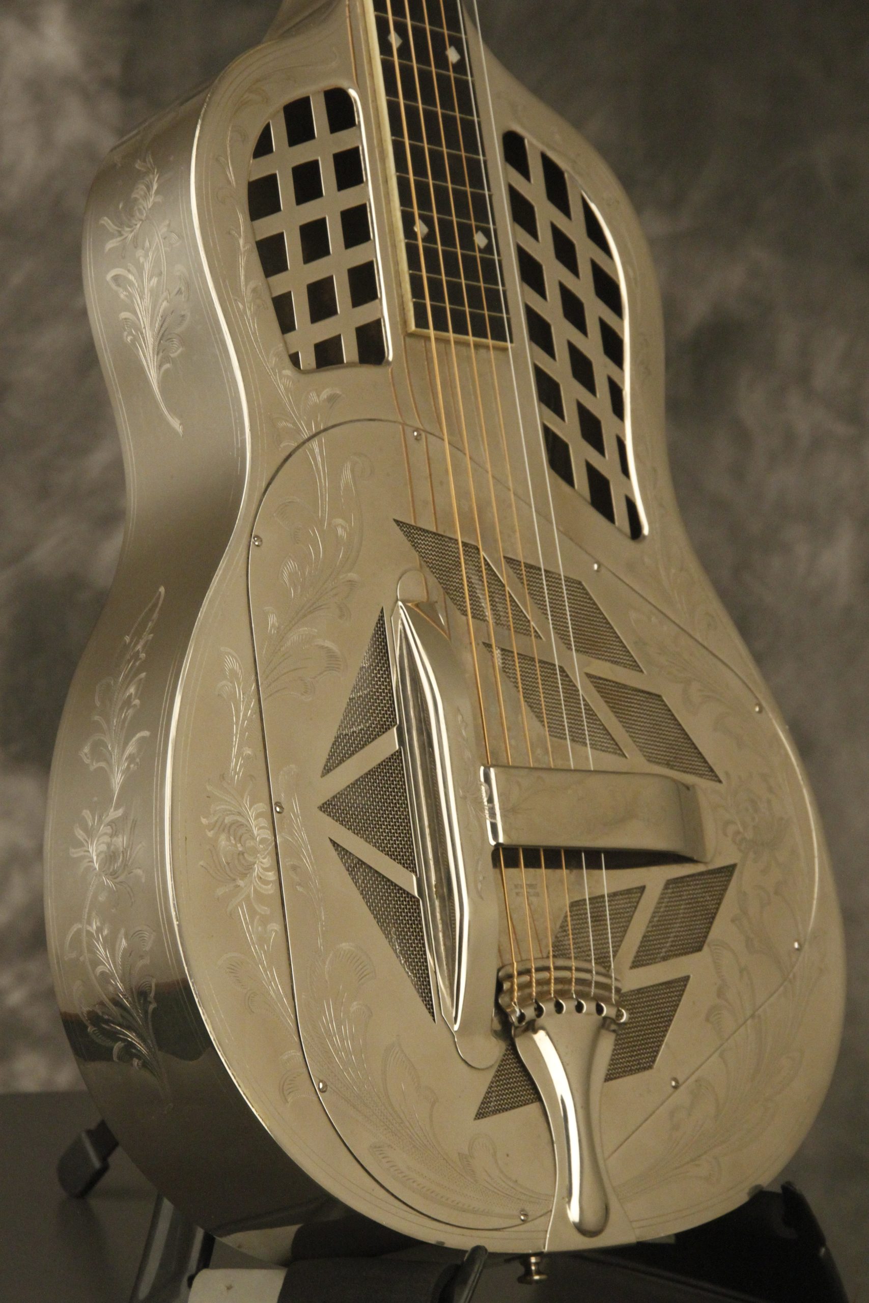 1930's National Style 4 Tri-Cone Resonator. The 3-set strip tuners on the bass side have been changed, but everything else appears to be original along with its original hardshell case. It's in great shape with some minor nicks + dings and other cosmetic wear. Everything remains structurally sound with no cracks, breaks or repairs.