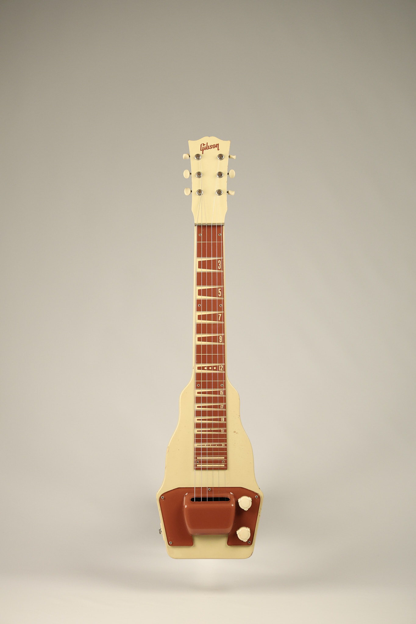 1950 Gibson BR-9 lap steel guitar in its original finish. It's all original with the exception of the replaced tuning buttons, jackplate and the outside of the original case has been painted over. It looks good with nicks + dings, some chipped areas in the finish on the bottom edge and other cosmetic wear. The neck support in the case is a little loose, but will be packed very well. All electronics work and sound great.