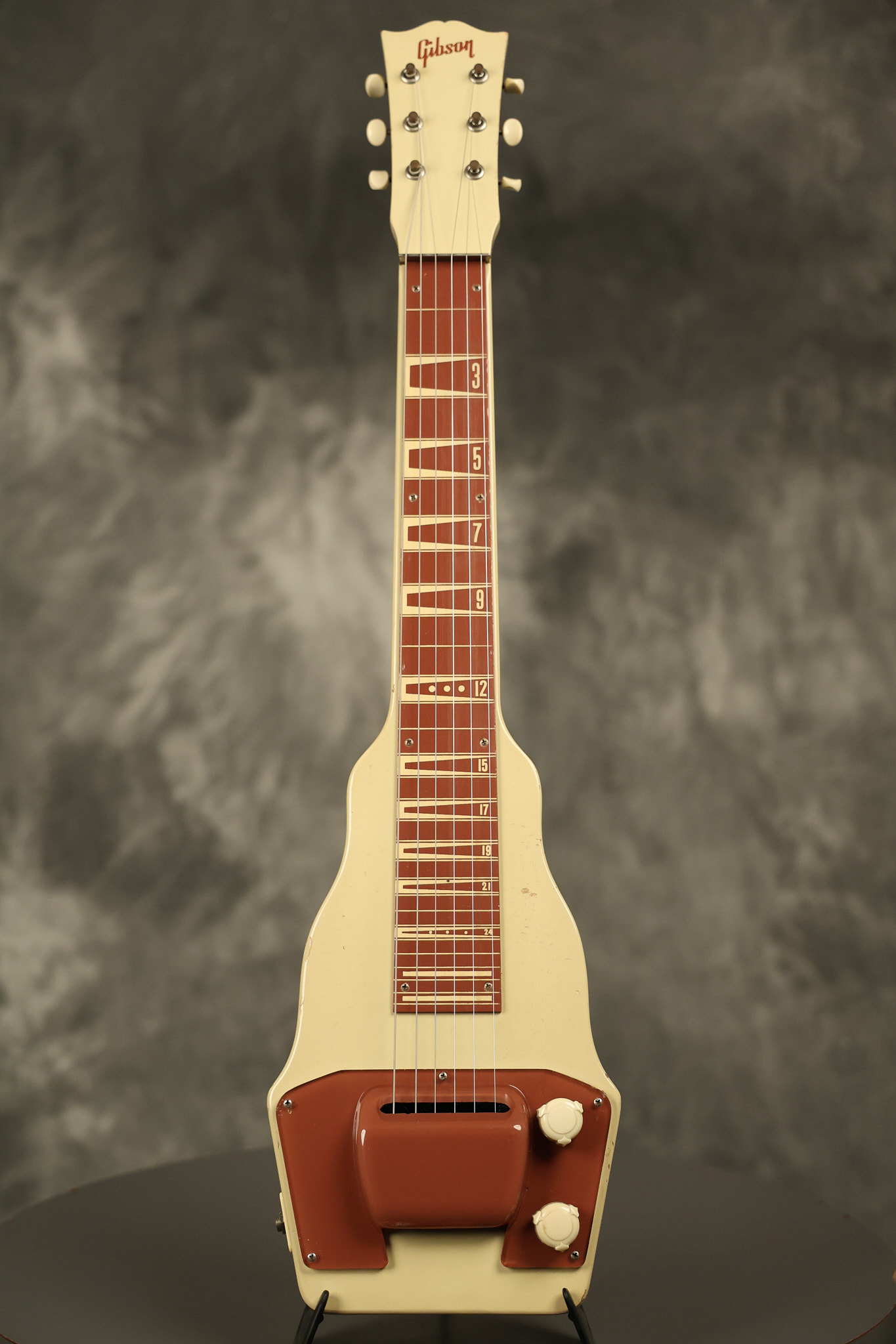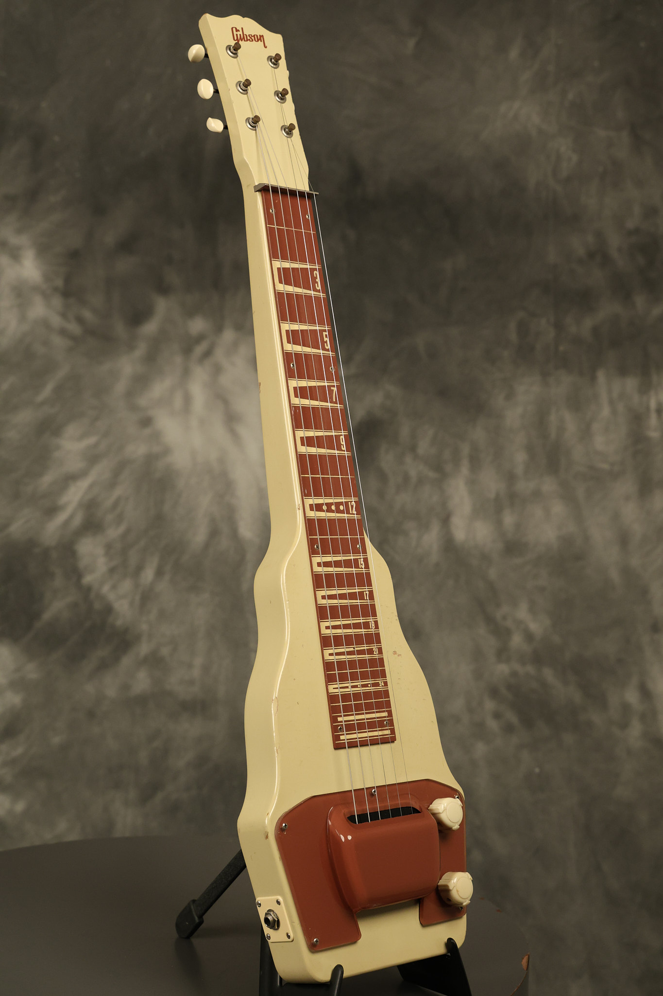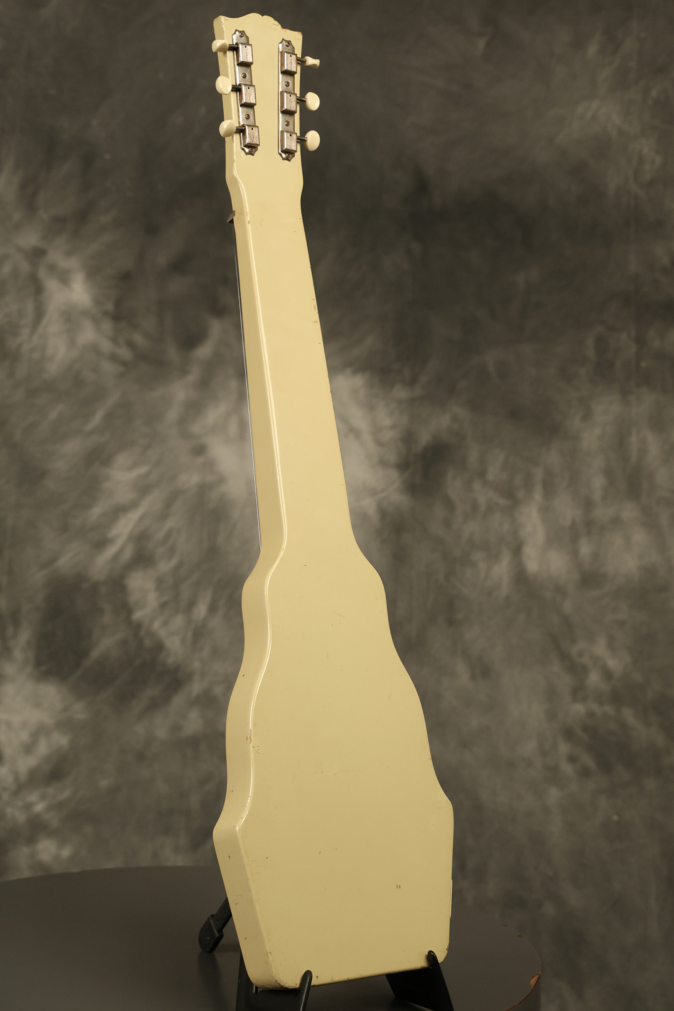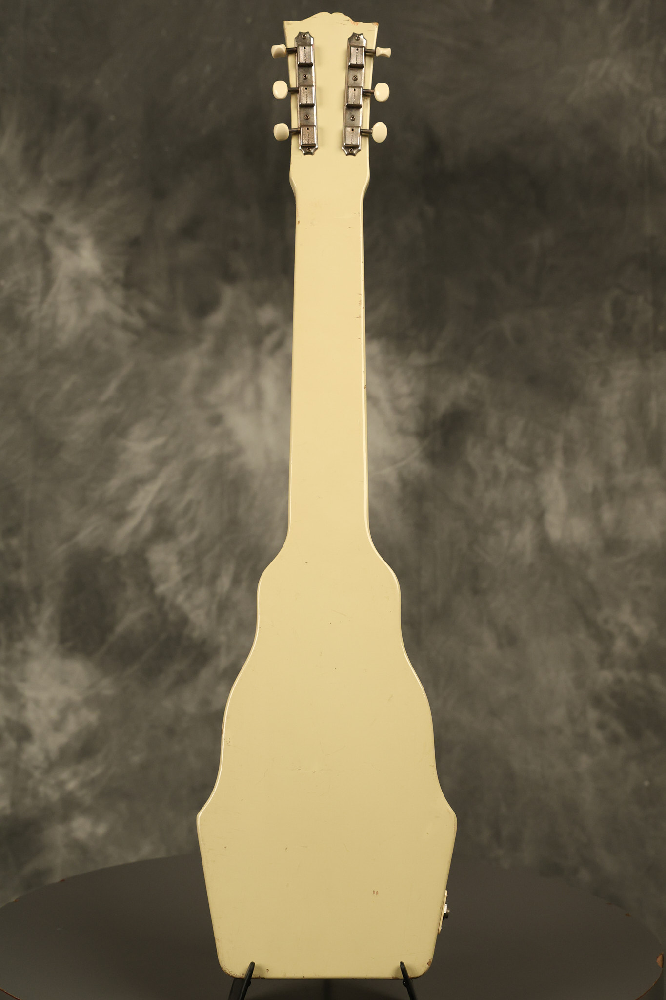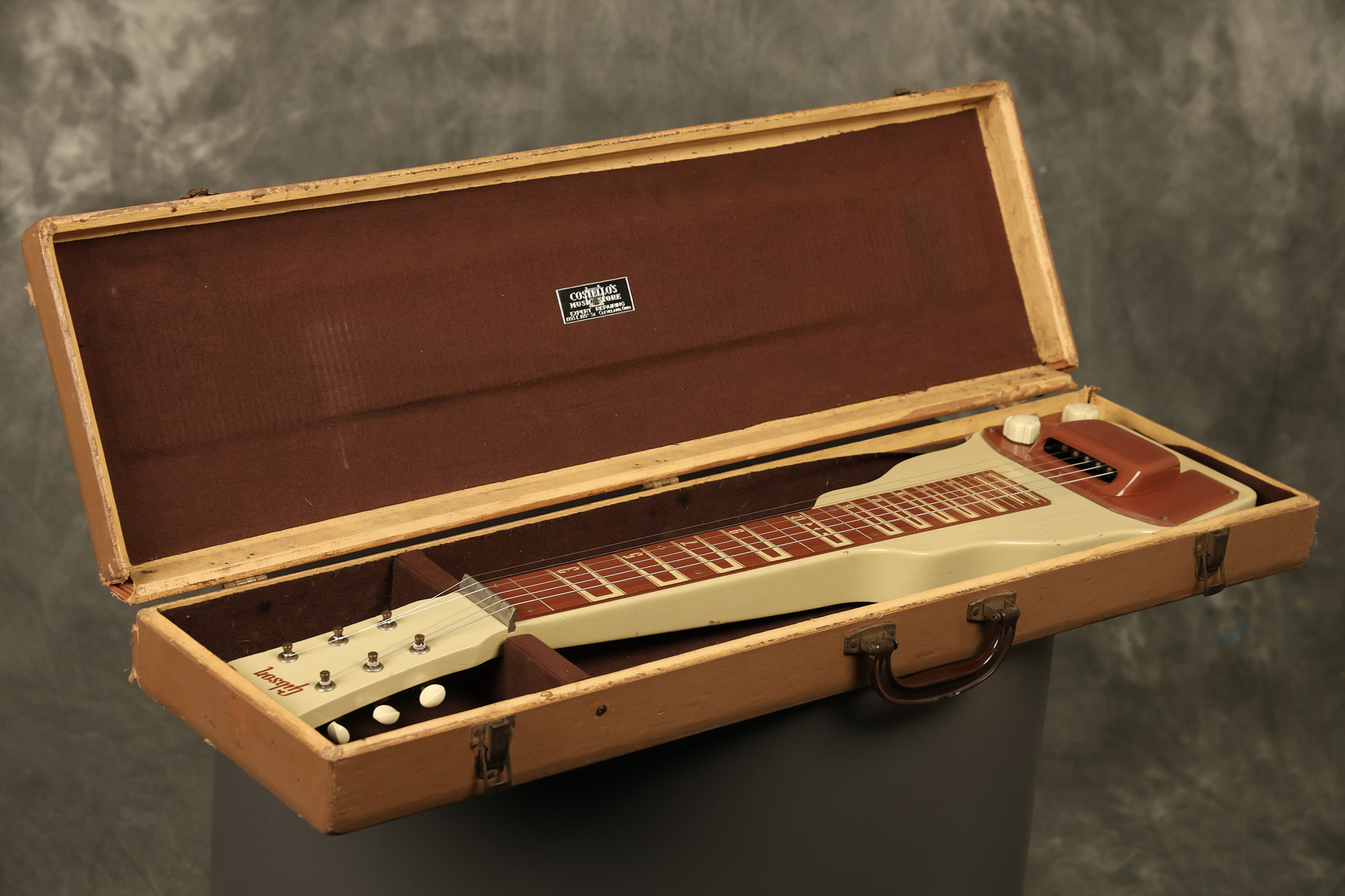 1950 Gibson BR-9 lap steel guitar in its original finish. It's all original with the exception of the replaced tuning buttons, jackplate and the outside of the original case has been painted over. It looks good with nicks + dings, some chipped areas in the finish on the bottom edge and other cosmetic wear. The neck support in the case is a little loose, but will be packed very well. All electronics work and sound great.