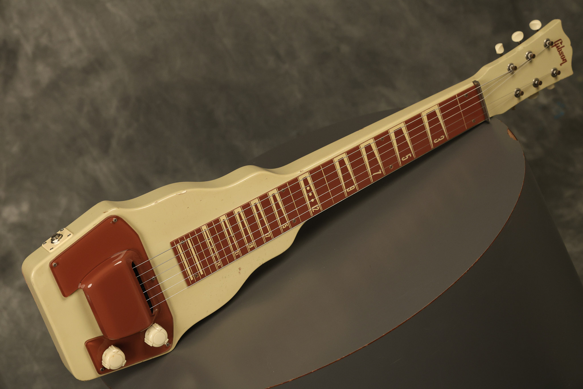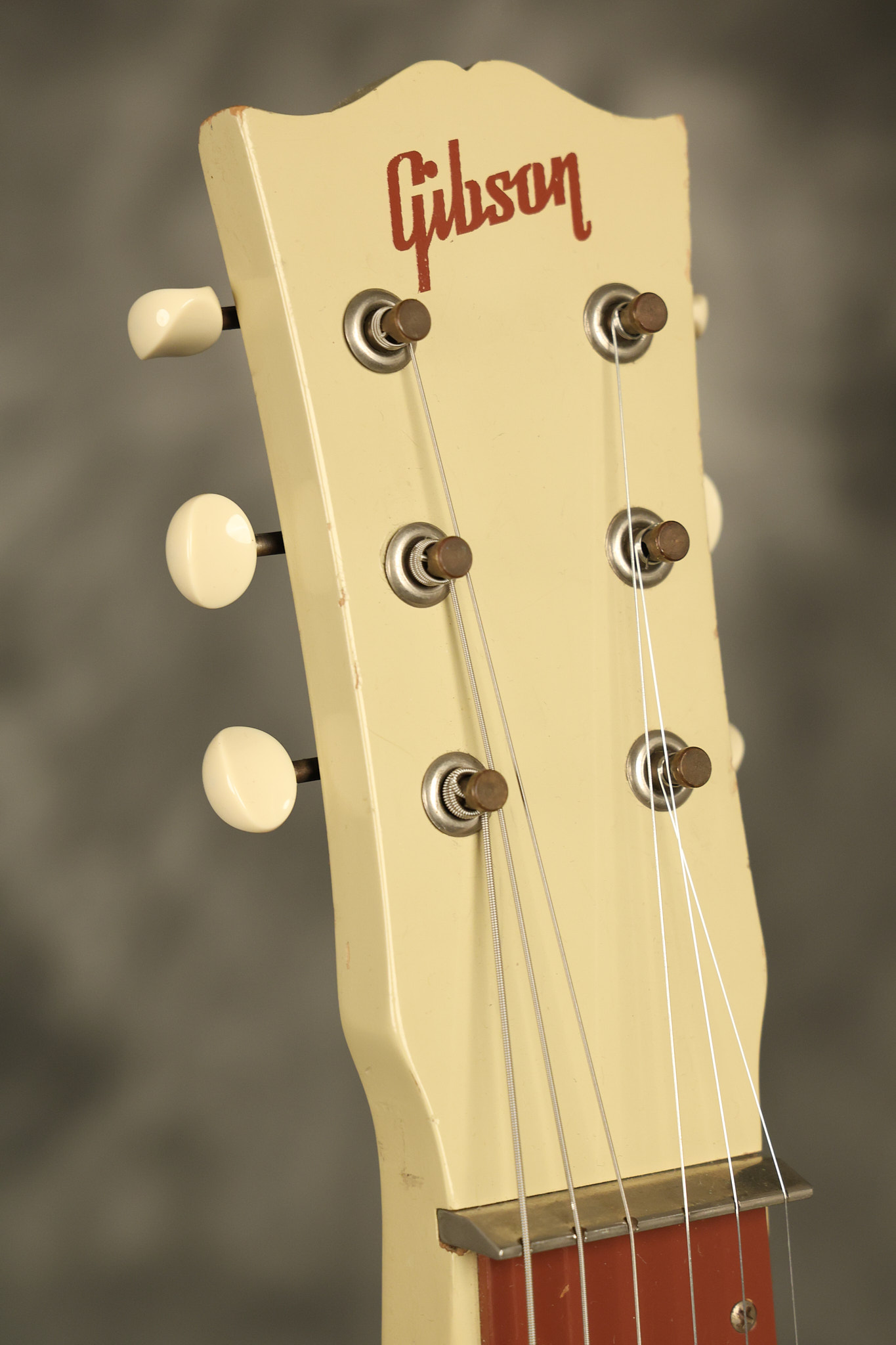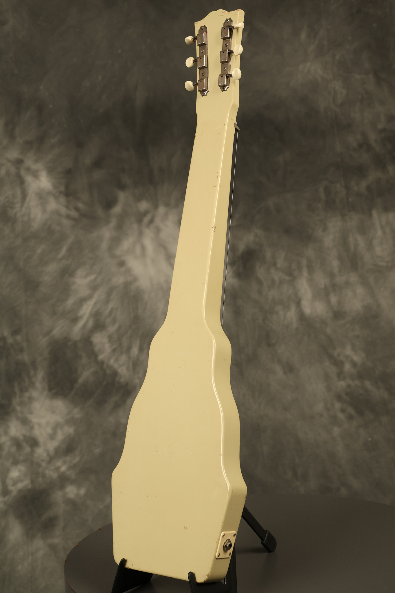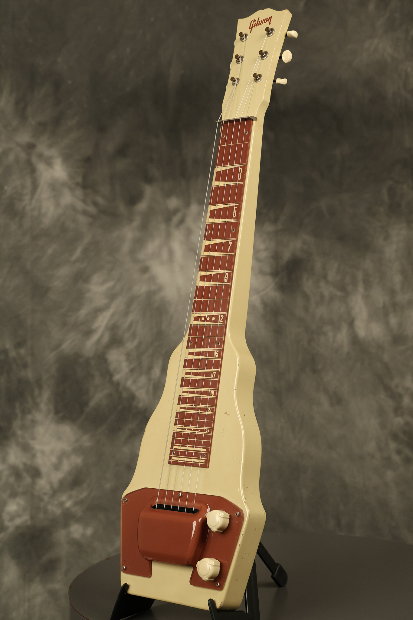 1950 Gibson BR-9 lap steel guitar in its original finish. It's all original with the exception of the replaced tuning buttons, jackplate and the outside of the original case has been painted over. It looks good with nicks + dings, some chipped areas in the finish on the bottom edge and other cosmetic wear. The neck support in the case is a little loose, but will be packed very well. All electronics work and sound great.