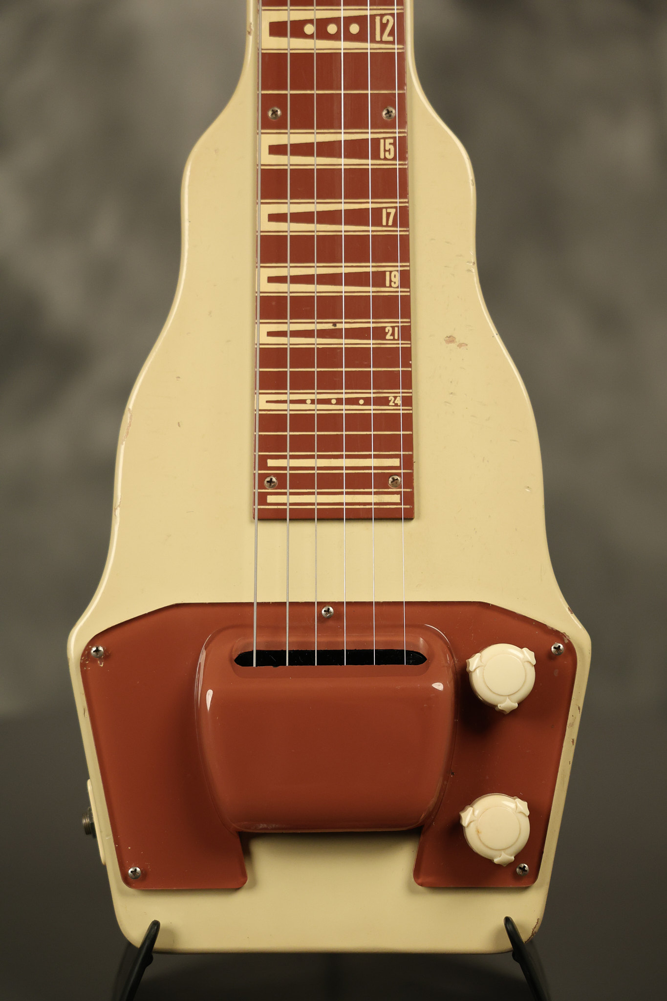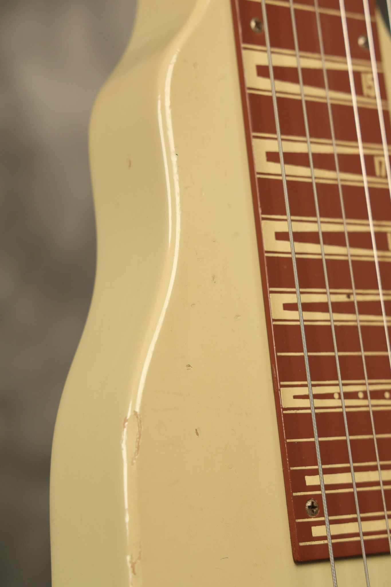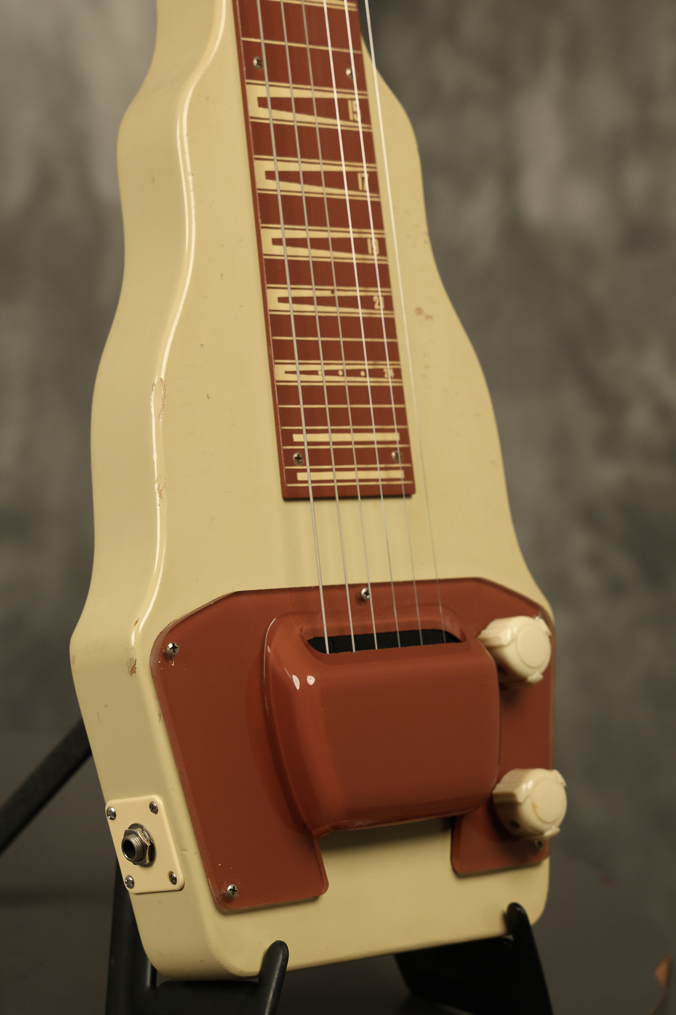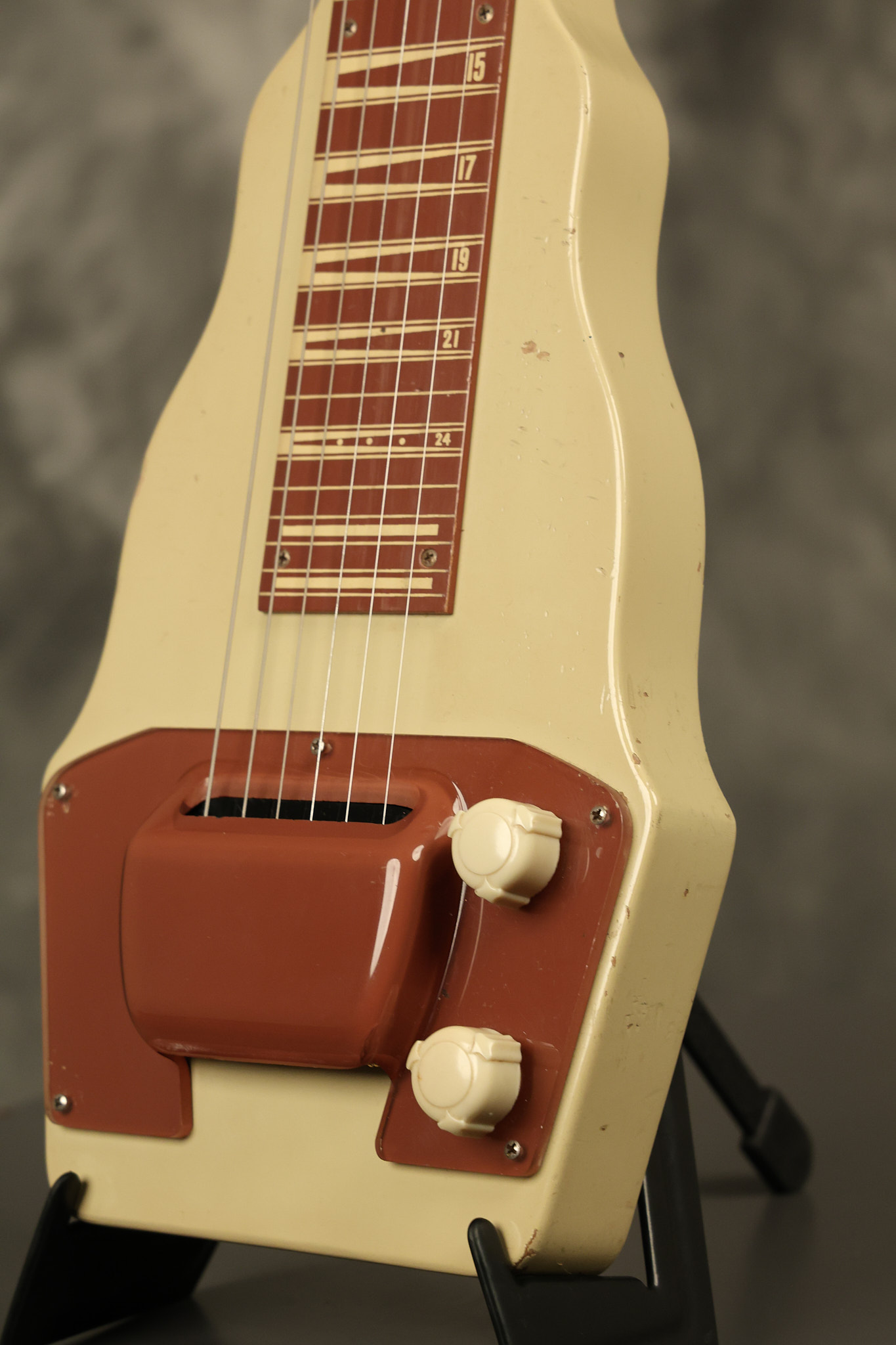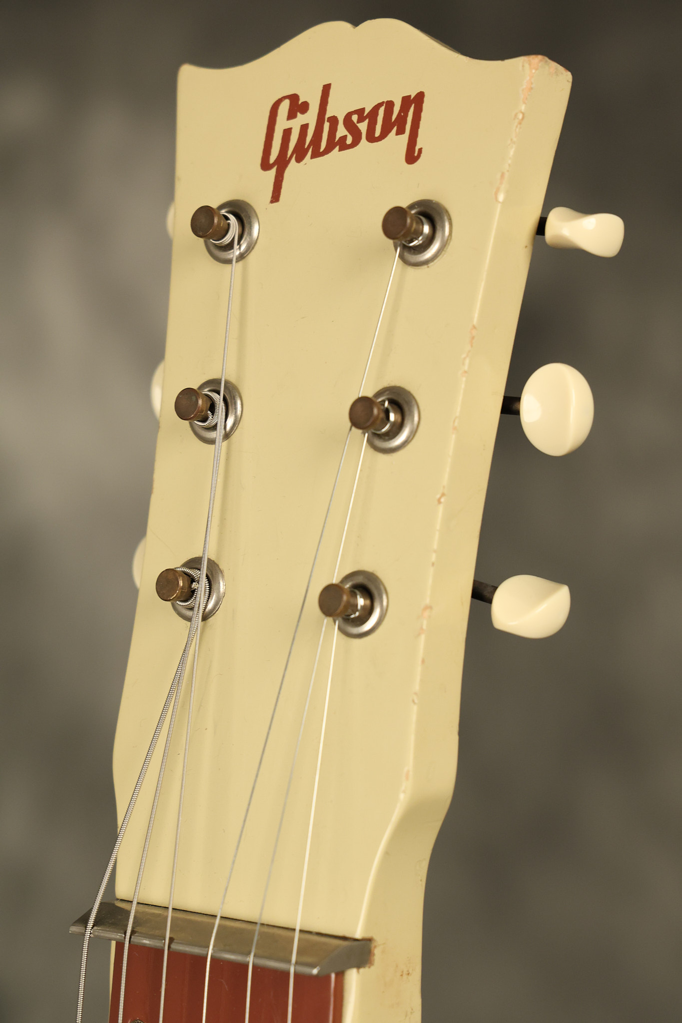 1950 Gibson BR-9 lap steel guitar in its original finish. It's all original with the exception of the replaced tuning buttons, jackplate and the outside of the original case has been painted over. It looks good with nicks + dings, some chipped areas in the finish on the bottom edge and other cosmetic wear. The neck support in the case is a little loose, but will be packed very well. All electronics work and sound great.