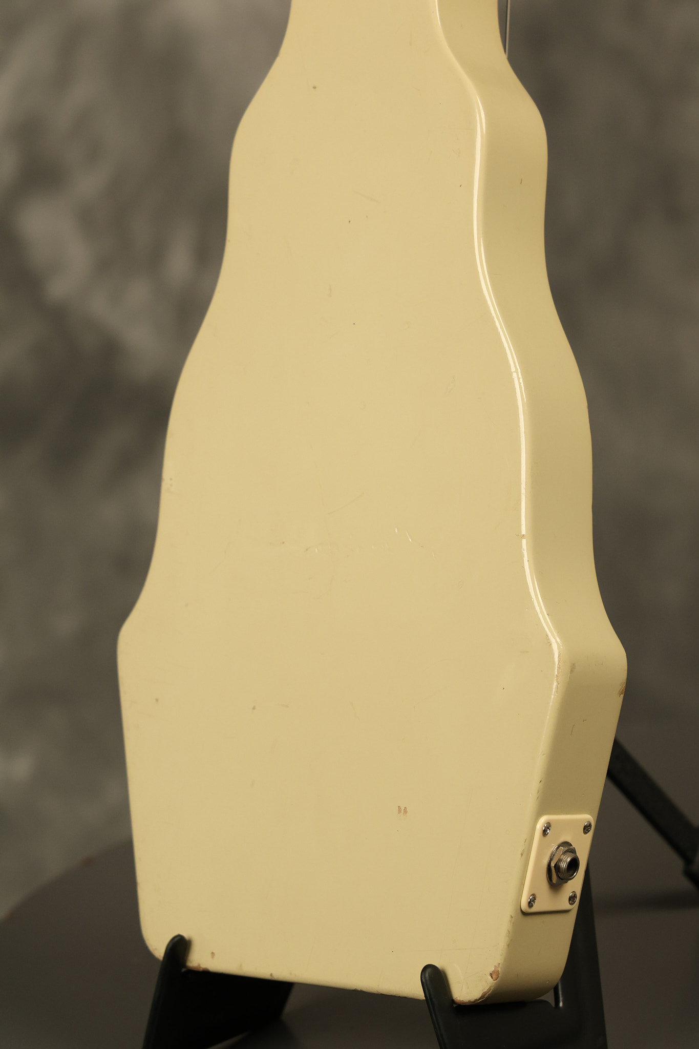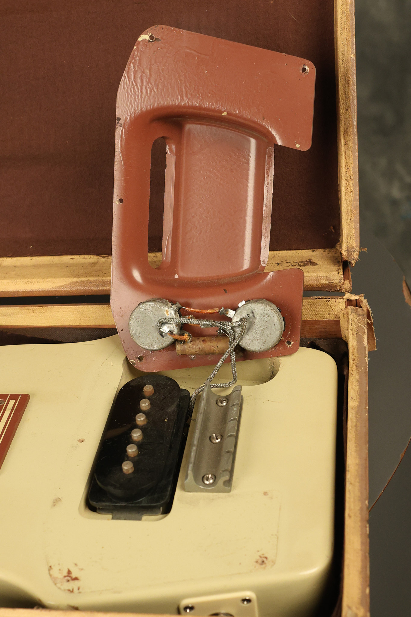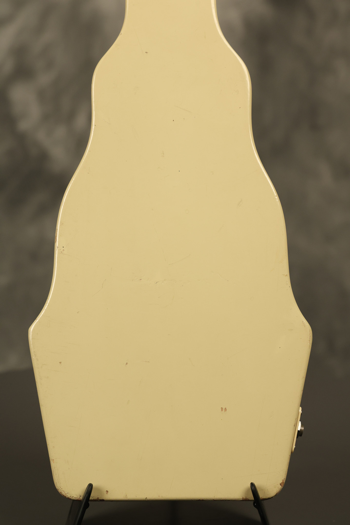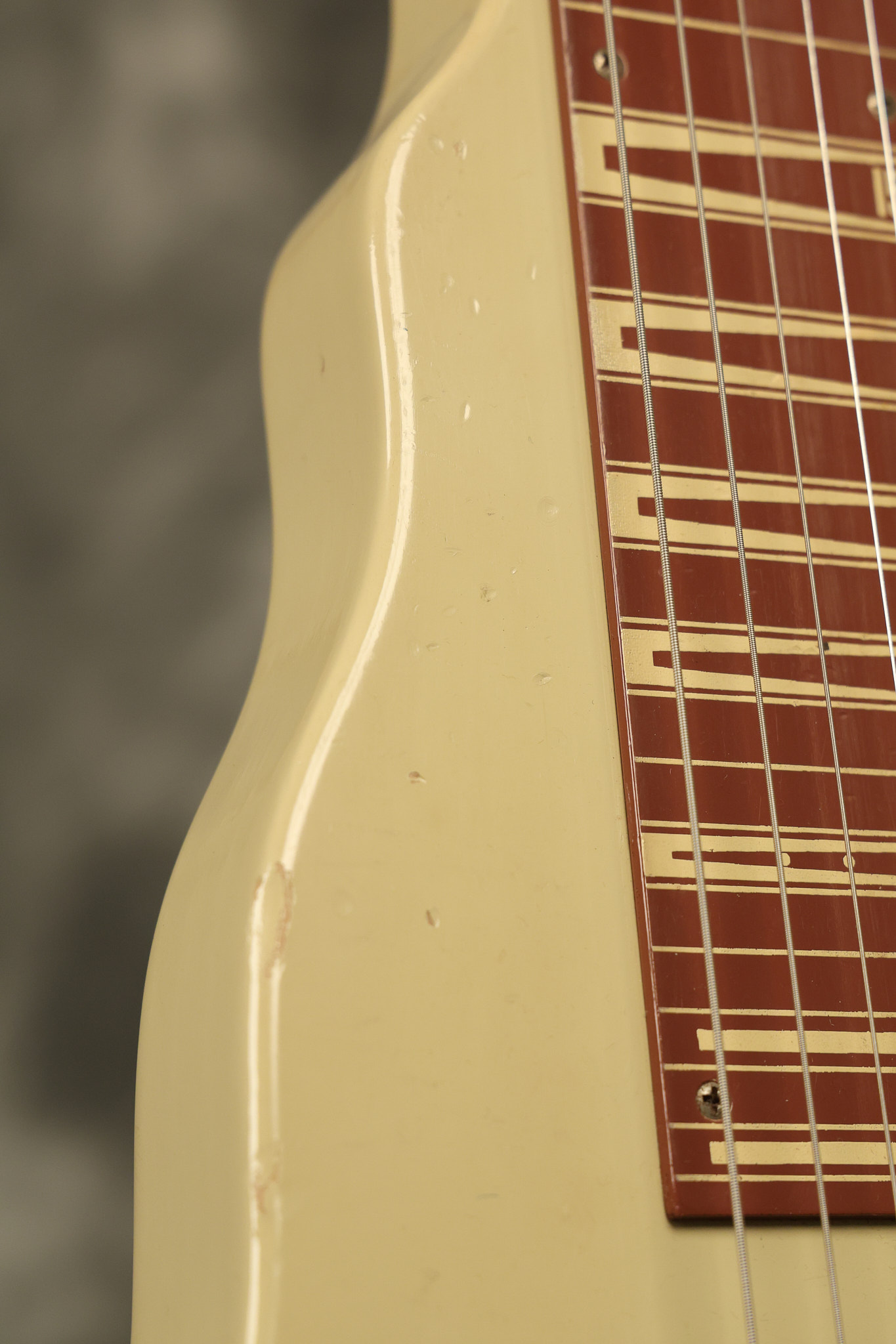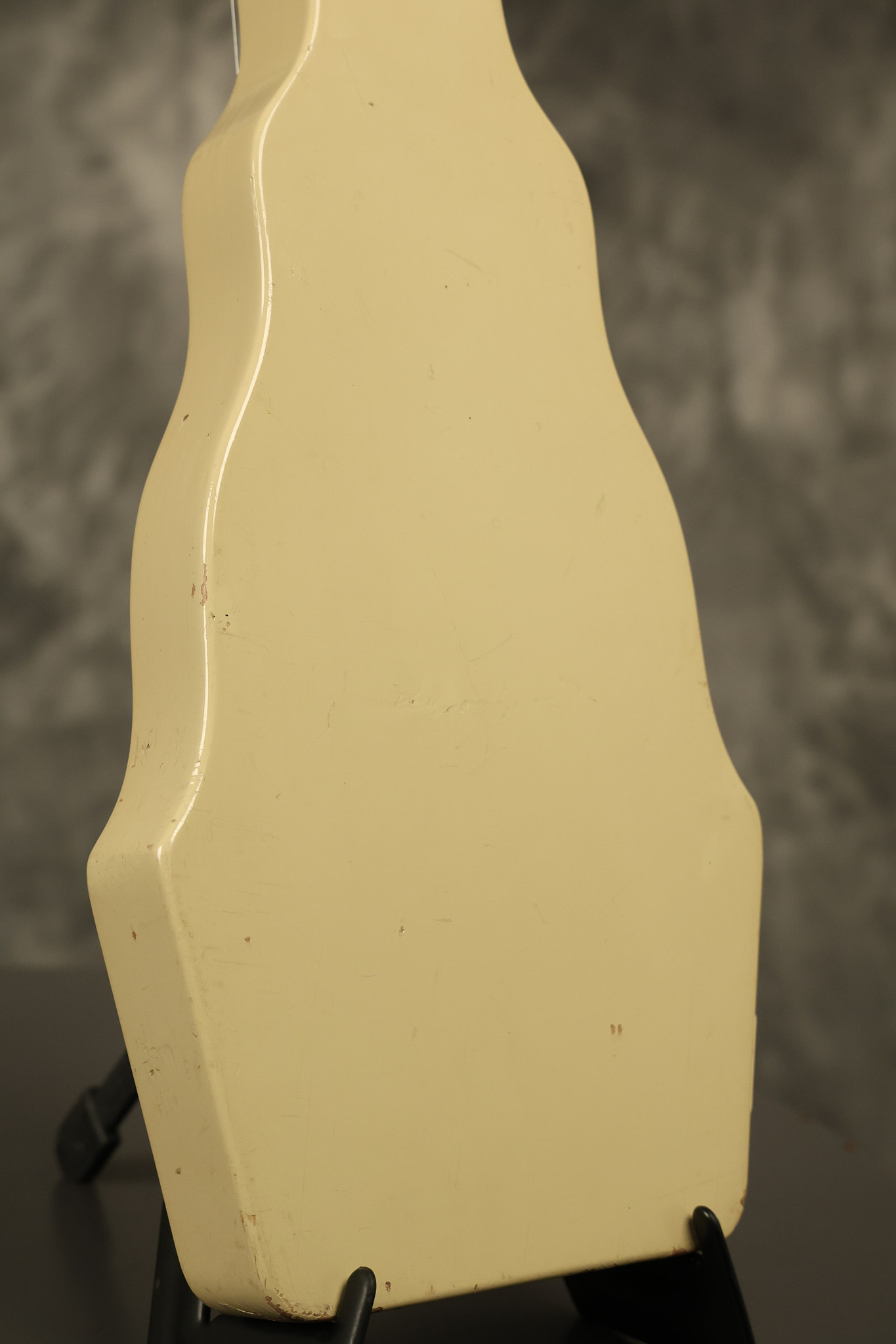 1950 Gibson BR-9 lap steel guitar in its original finish. It's all original with the exception of the replaced tuning buttons, jackplate and the outside of the original case has been painted over. It looks good with nicks + dings, some chipped areas in the finish on the bottom edge and other cosmetic wear. The neck support in the case is a little loose, but will be packed very well. All electronics work and sound great.