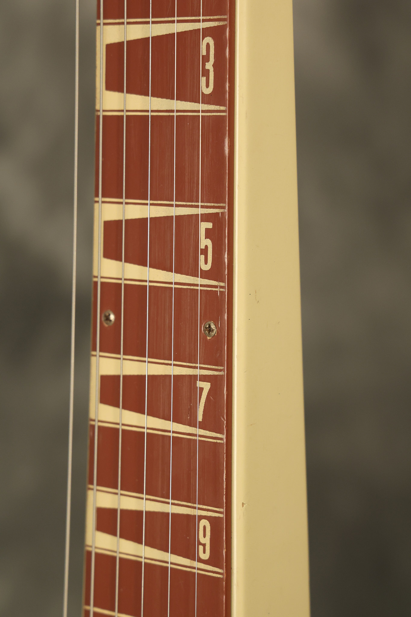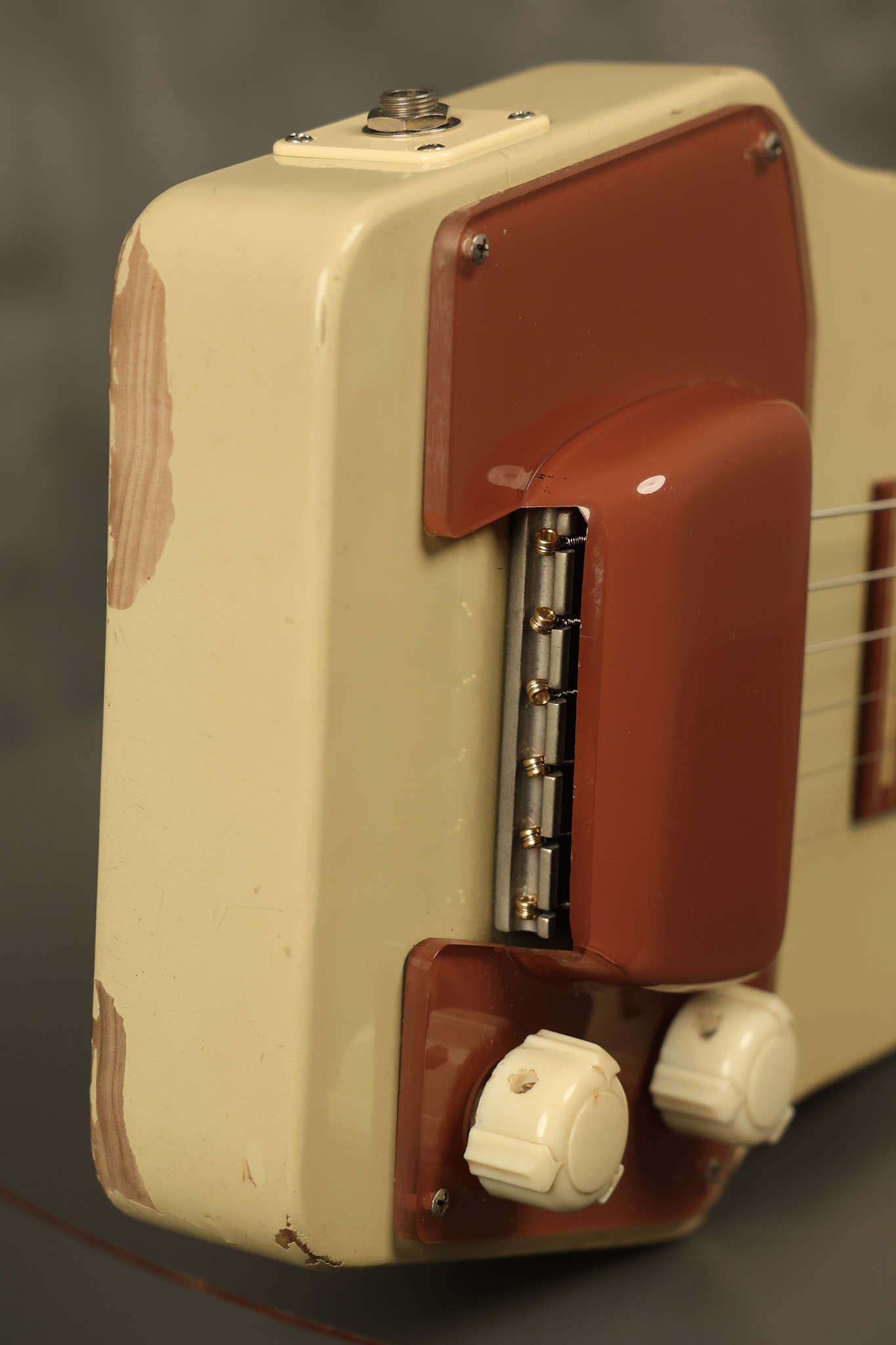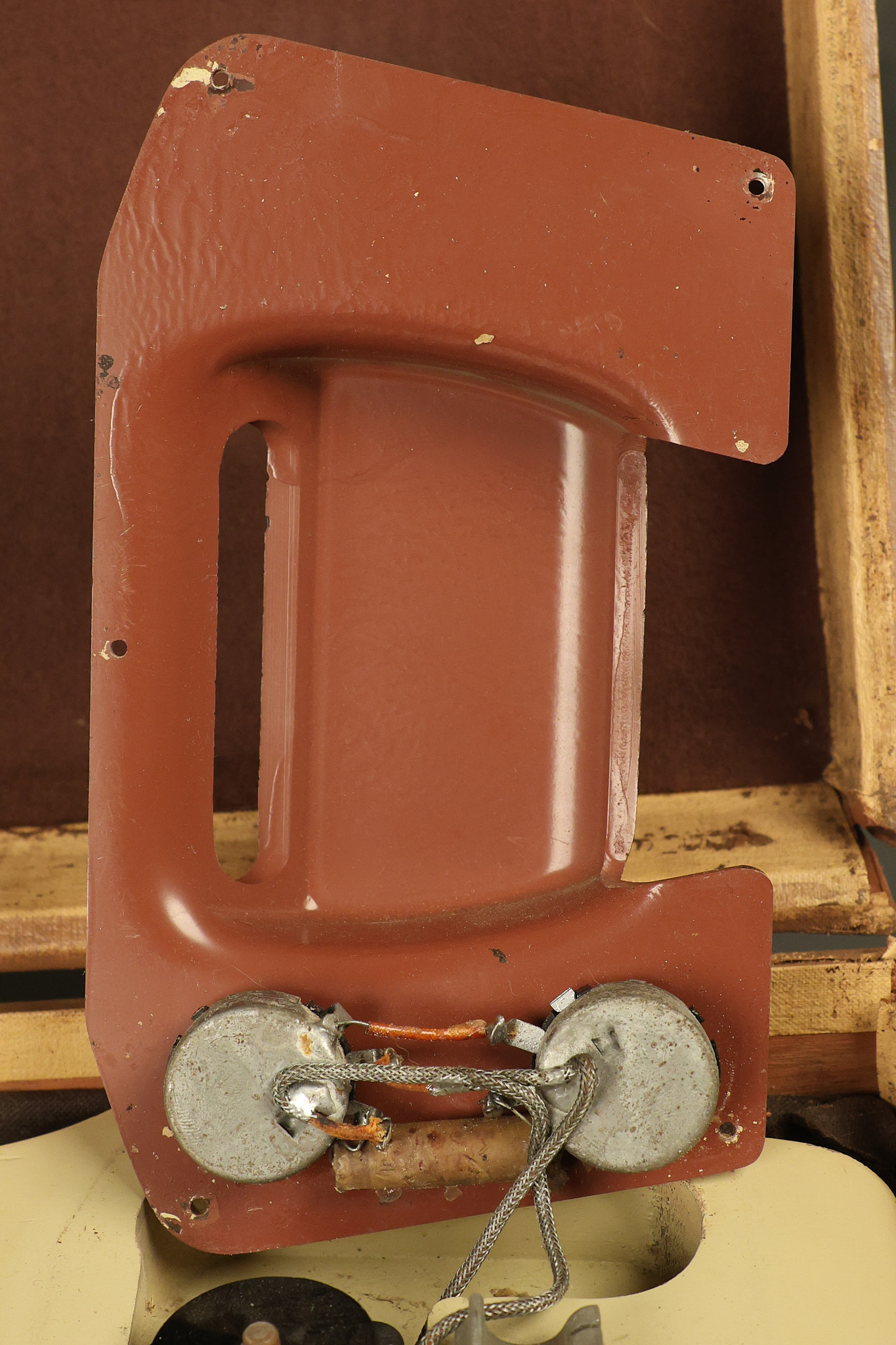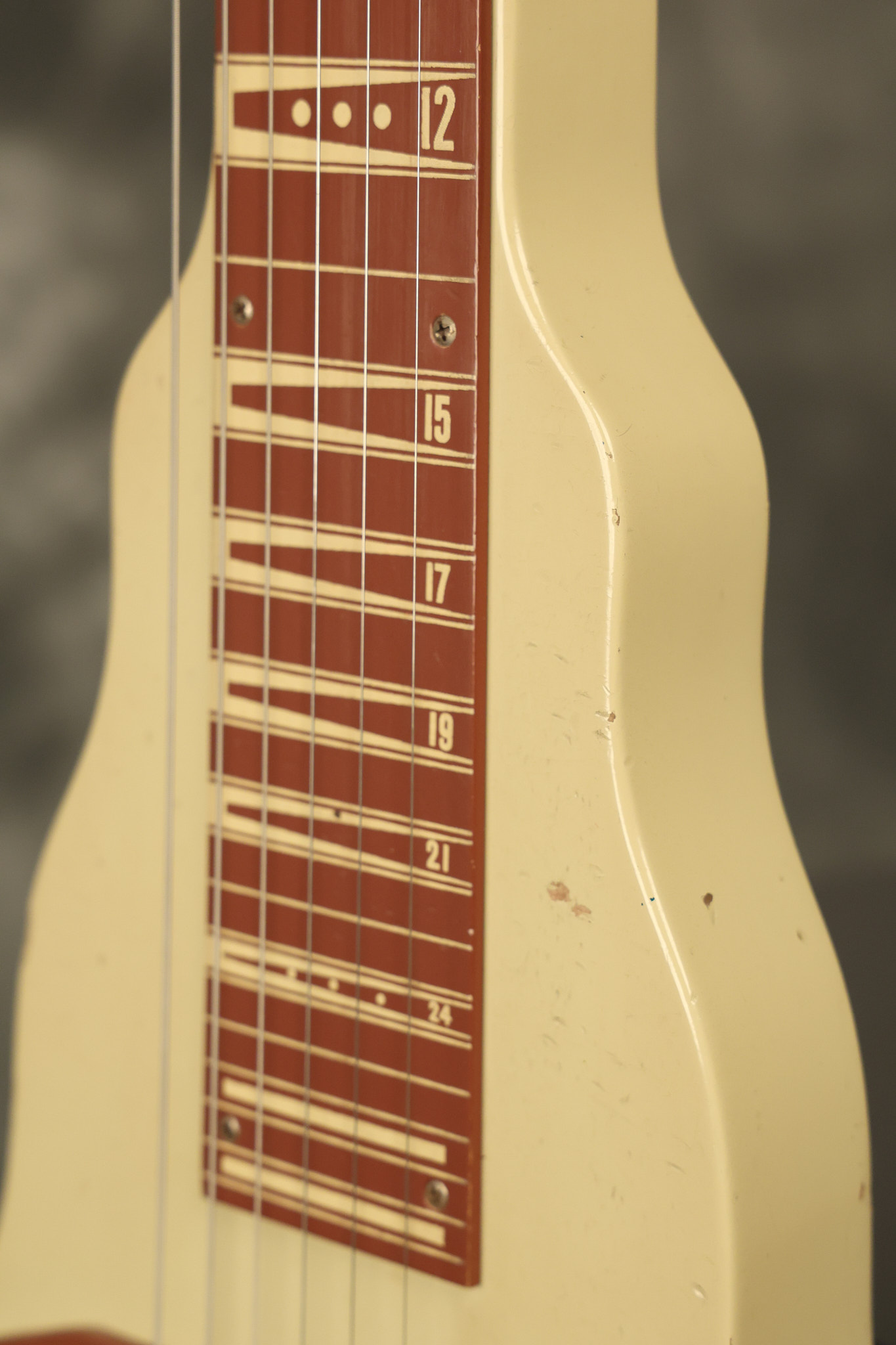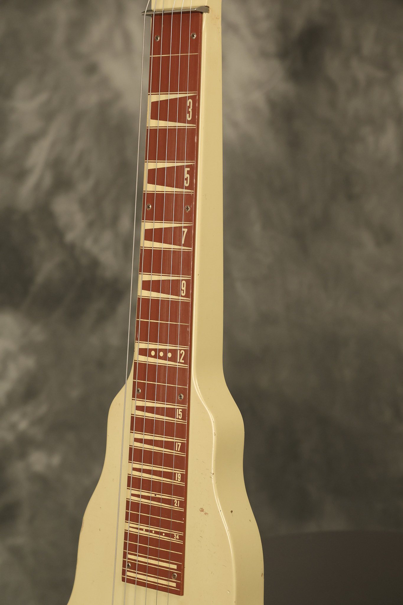 1950 Gibson BR-9 lap steel guitar in its original finish. It's all original with the exception of the replaced tuning buttons, jackplate and the outside of the original case has been painted over. It looks good with nicks + dings, some chipped areas in the finish on the bottom edge and other cosmetic wear. The neck support in the case is a little loose, but will be packed very well. All electronics work and sound great.