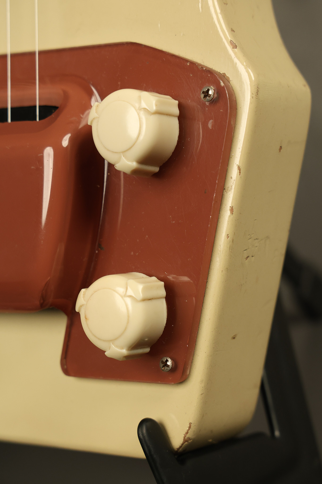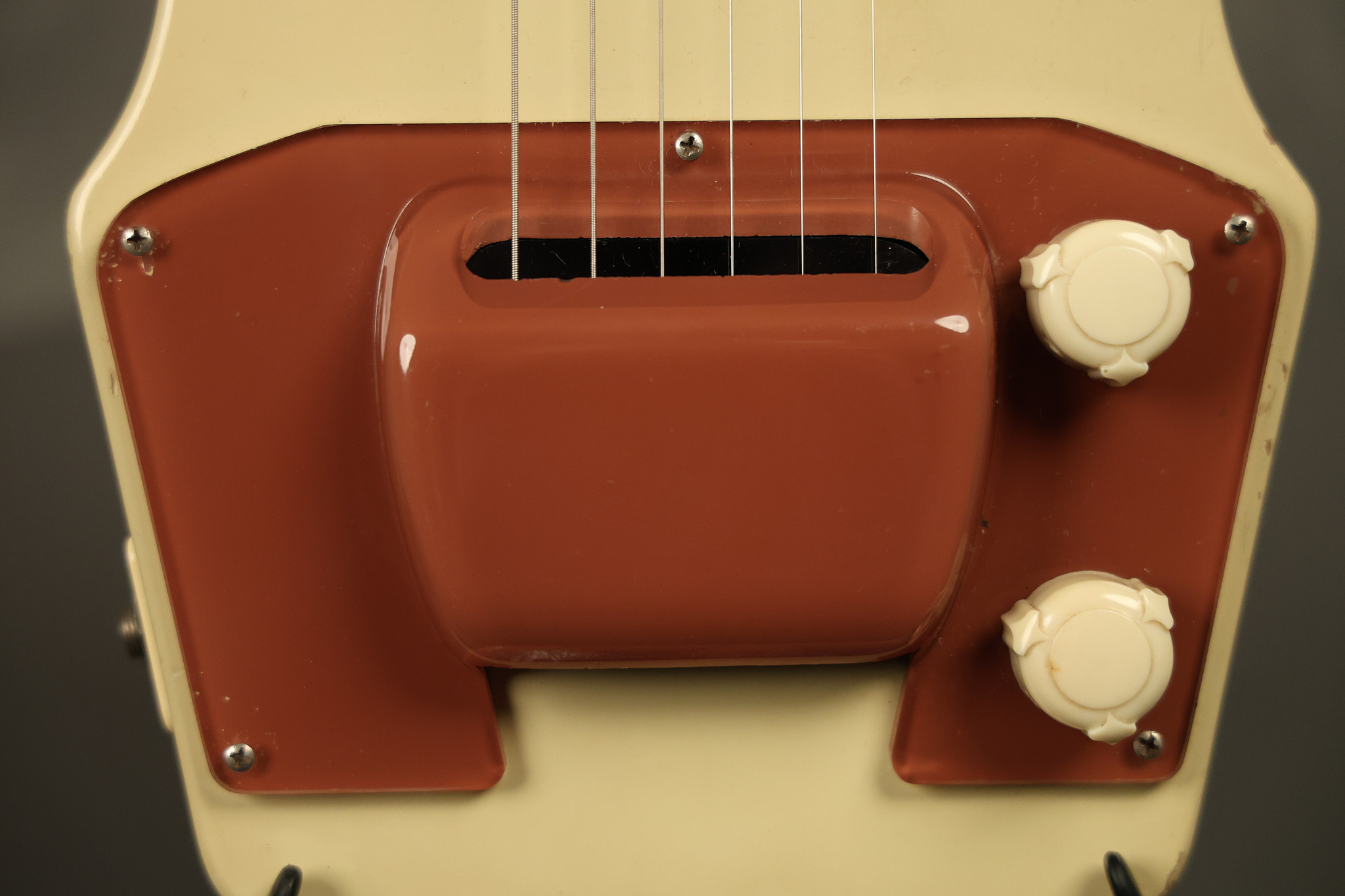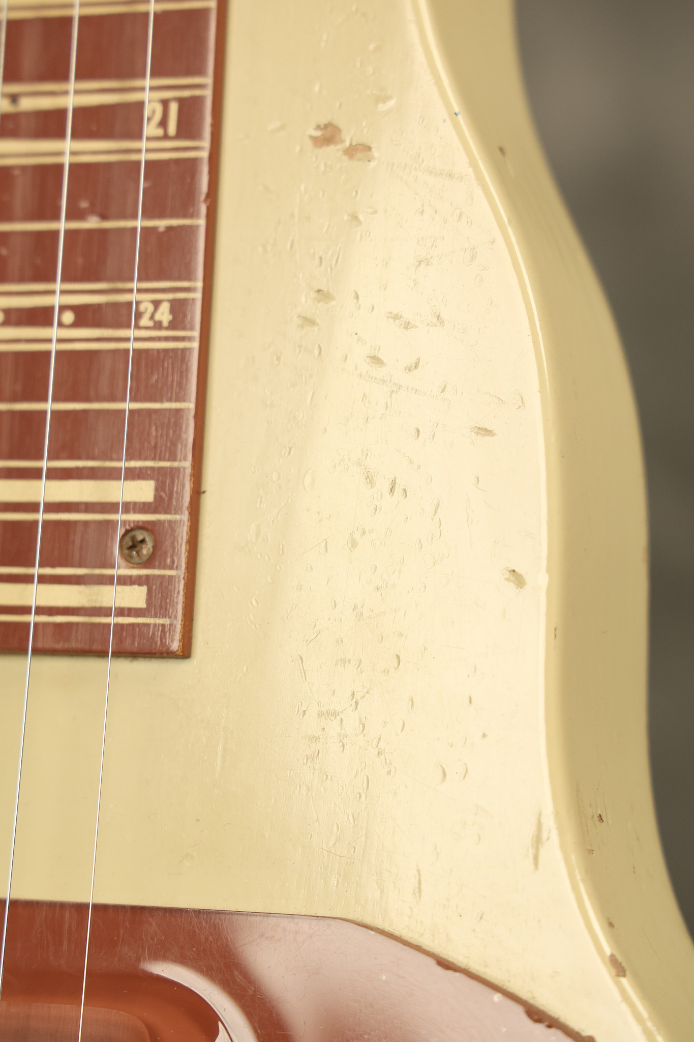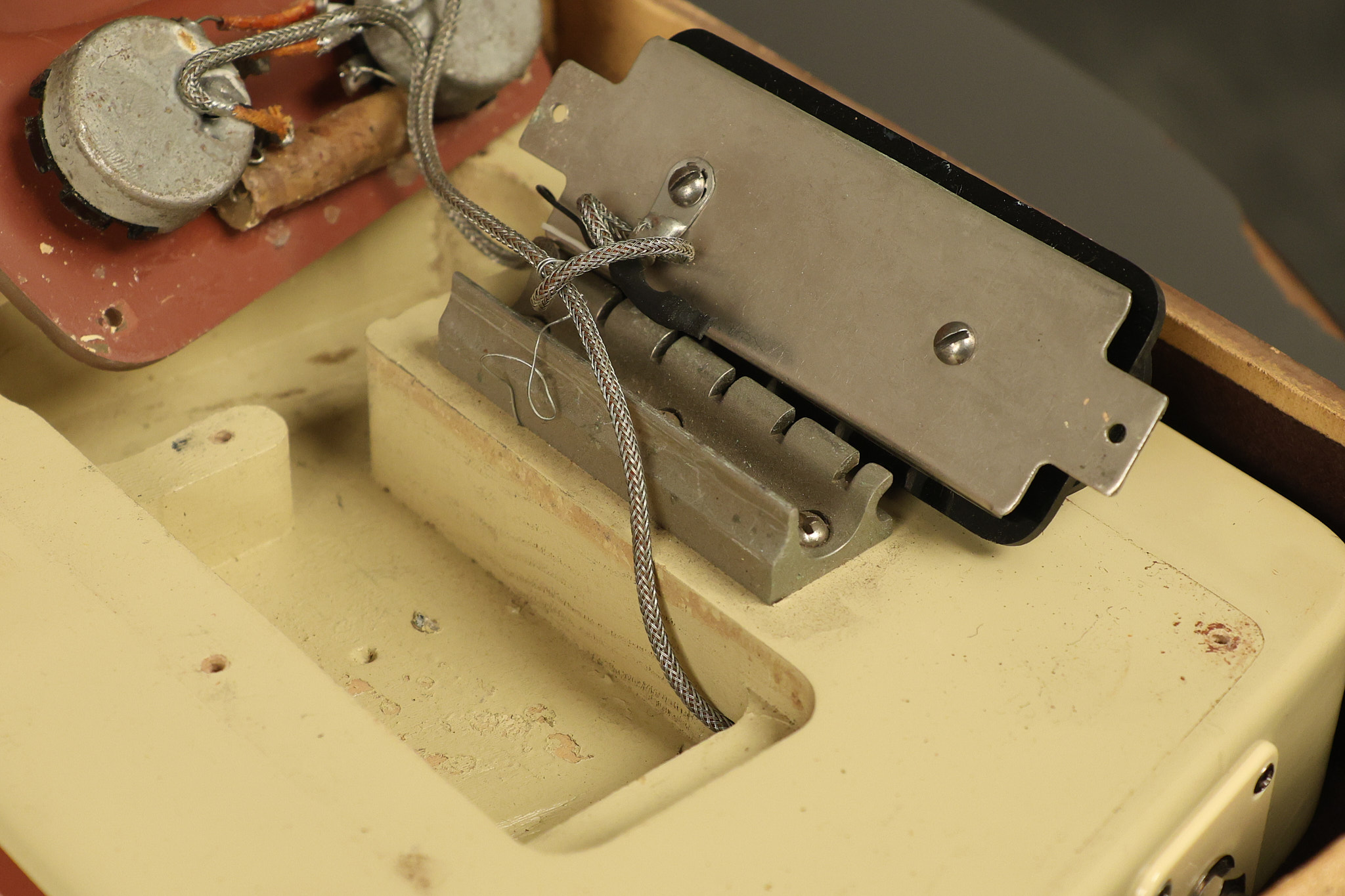 1950 Gibson BR-9 lap steel guitar in its original finish. It's all original with the exception of the replaced tuning buttons, jackplate and the outside of the original case has been painted over. It looks good with nicks + dings, some chipped areas in the finish on the bottom edge and other cosmetic wear. The neck support in the case is a little loose, but will be packed very well. All electronics work and sound great.