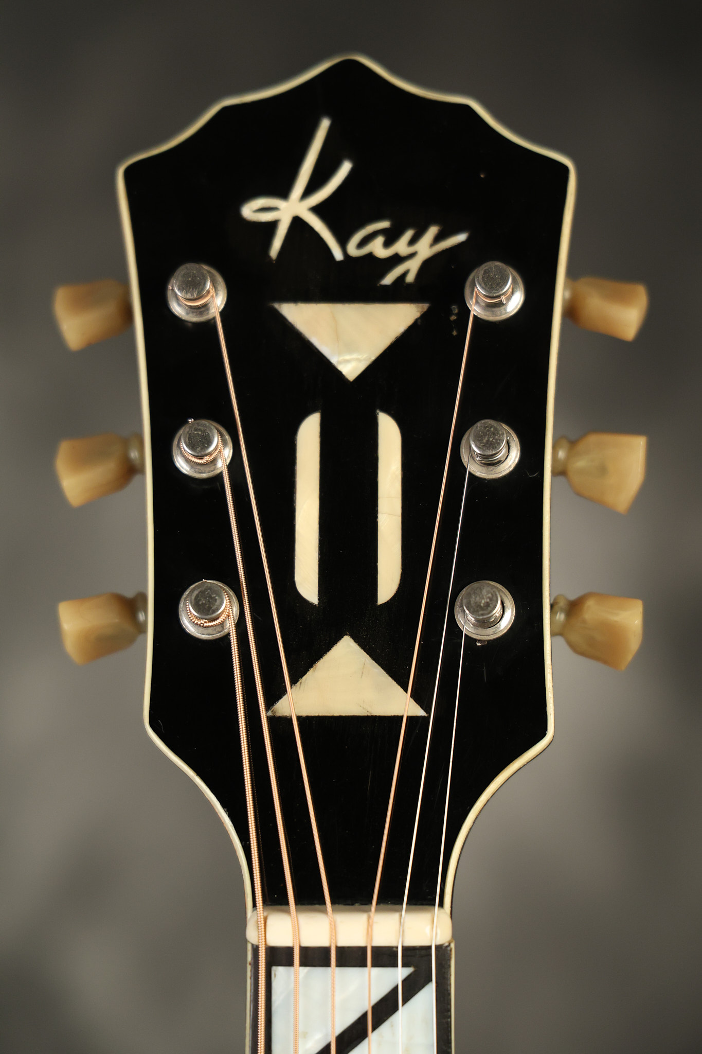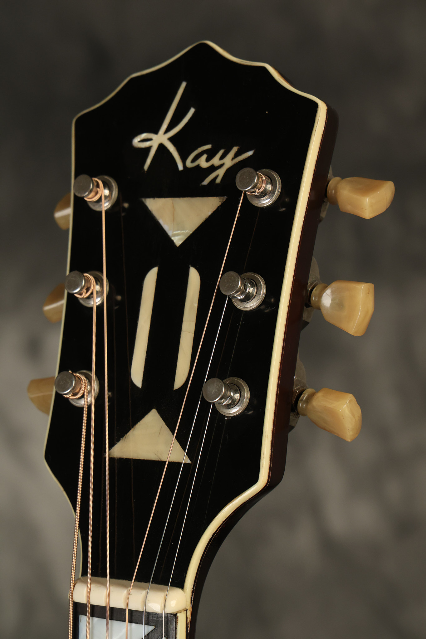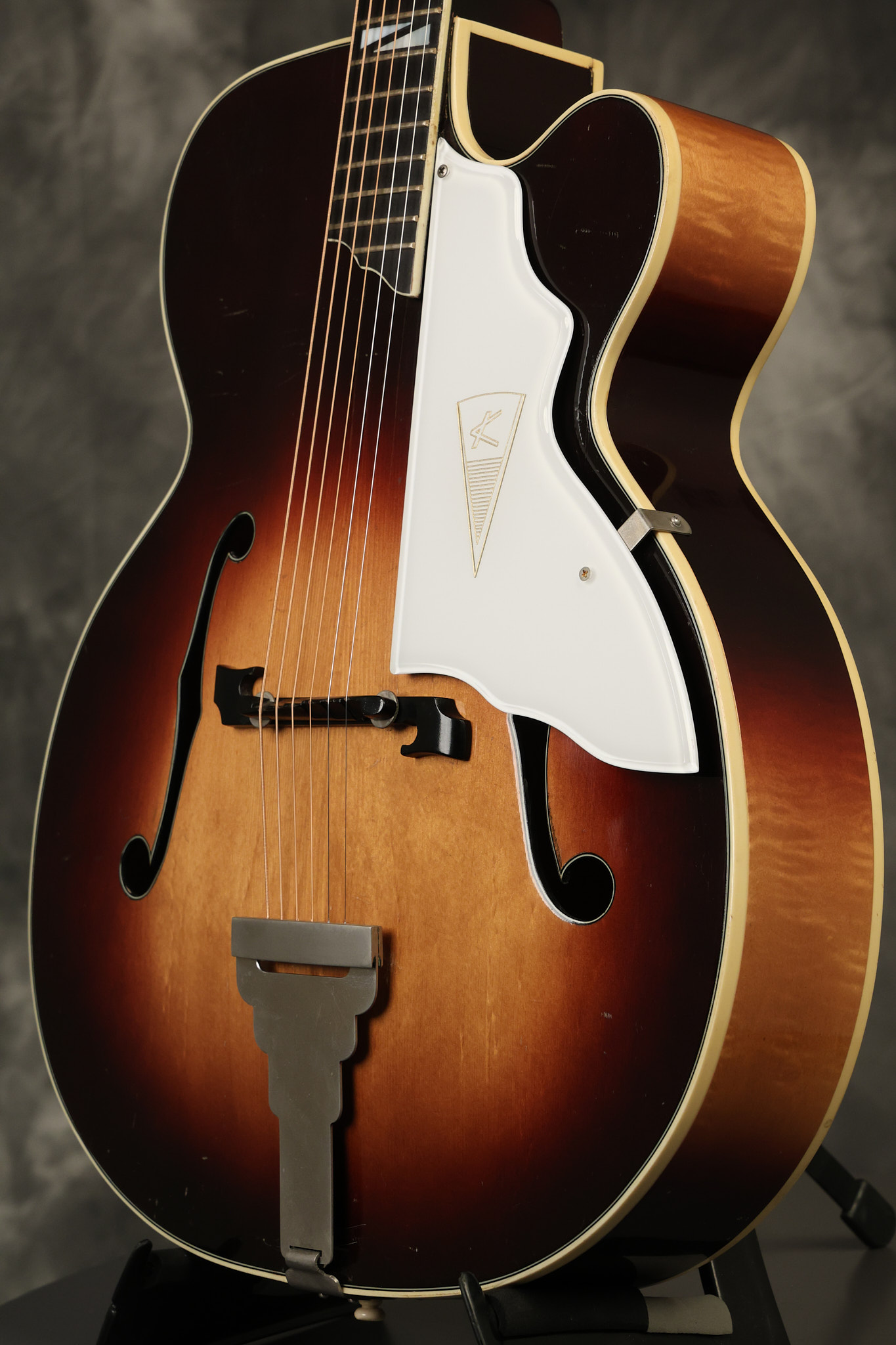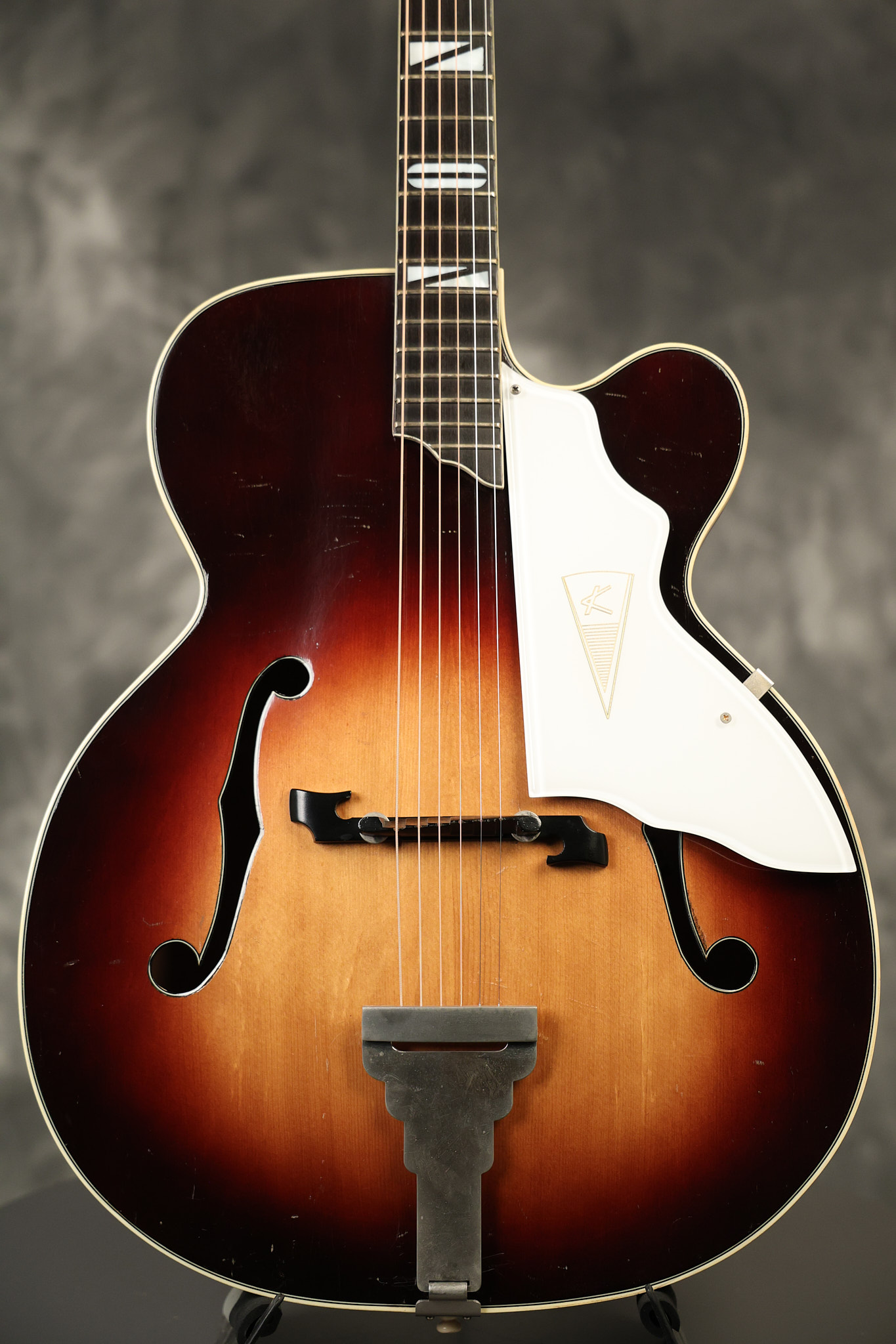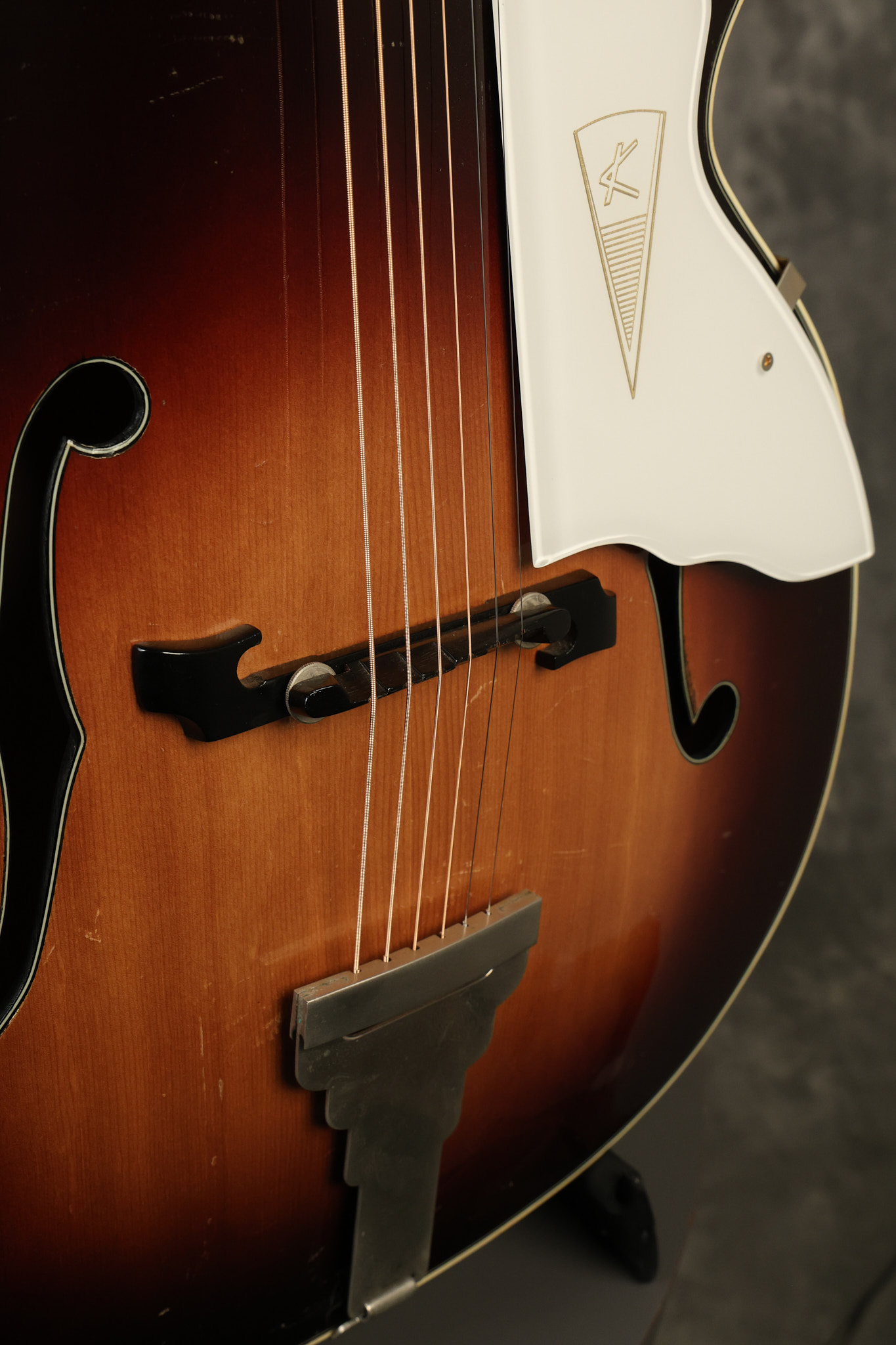 1950's Kay model K21 in its original Sunburst finish on a Spruce top with highly figured maple back + sides. It has a great playing neck with great frets and a big round neck profile. It's all original with the exception of the reproduction pickguard (one addition screw hole concealed by the pickugard). There were two other sets of tuners at one time and have left some extra screw holes which are conceals by the original Kluson Sealfast tuners that have been reinstalled. A nice later hardshell case is included. It's in very good condition with some nicks + dings, extremely minor finish checking and other cosmetic wear. On the back edge of the inside cutaway there is some glue residue seen along with edge of the binding where the a slightly shrunken area of the binding had been reglued. The guitar itself remains structurally sound and sounds great.
