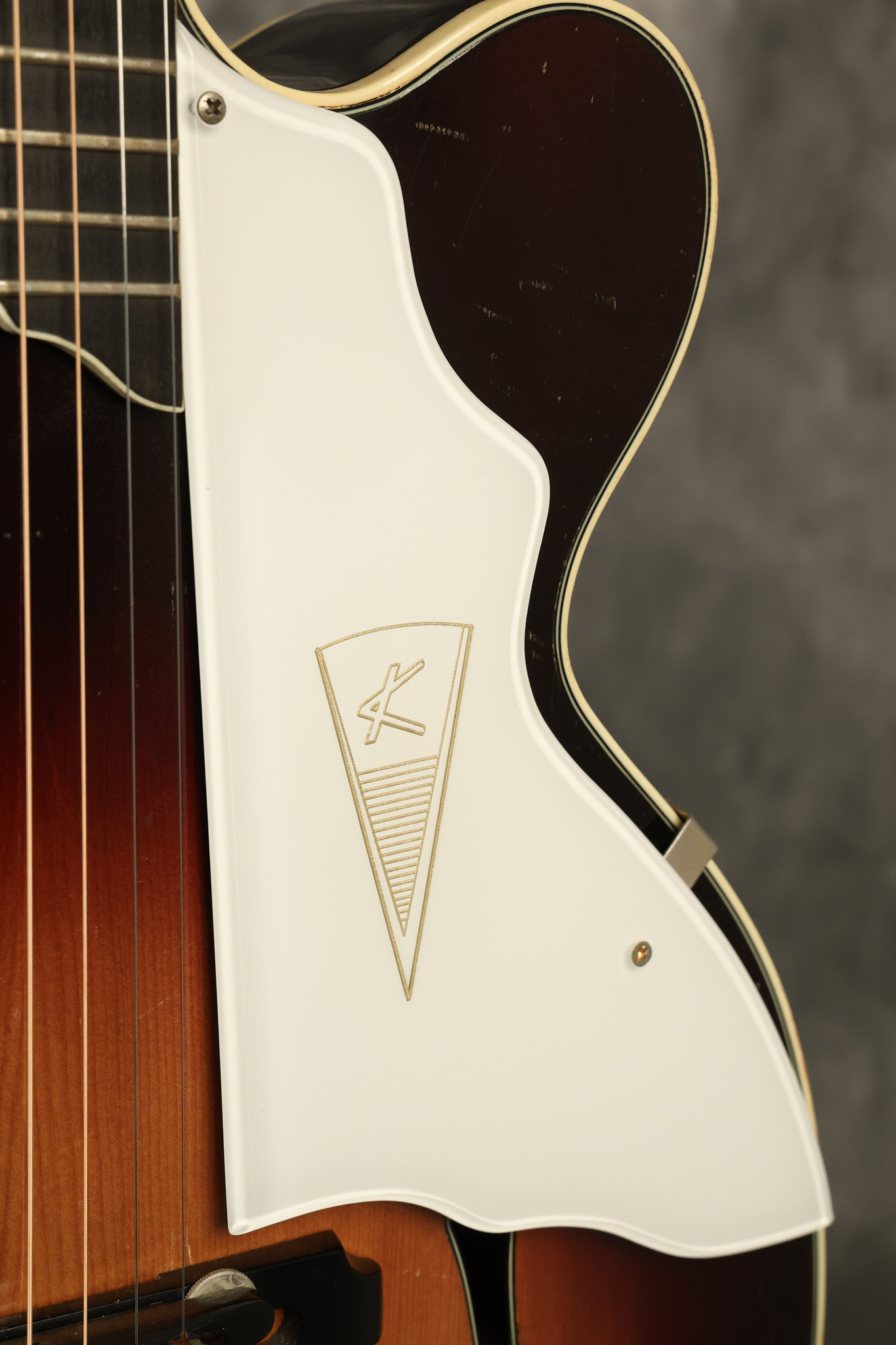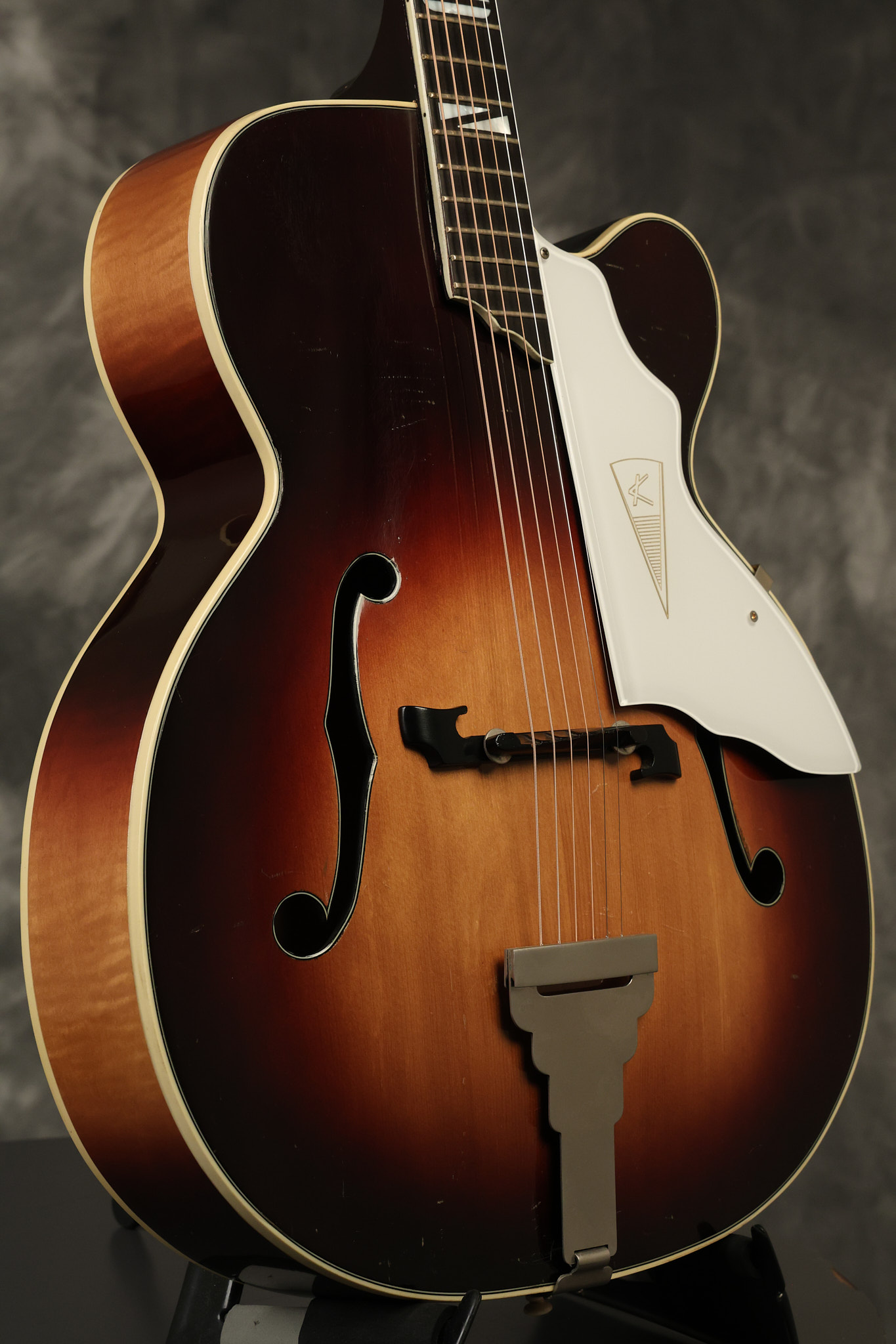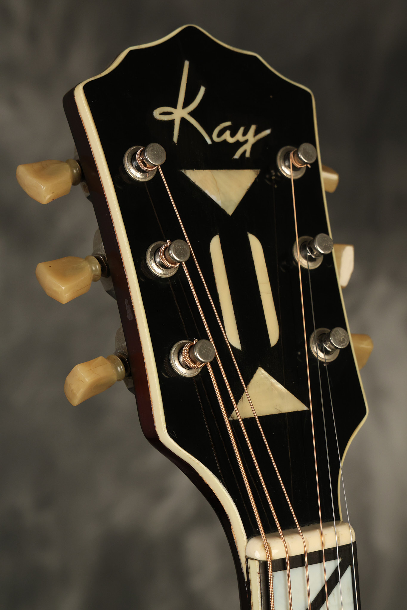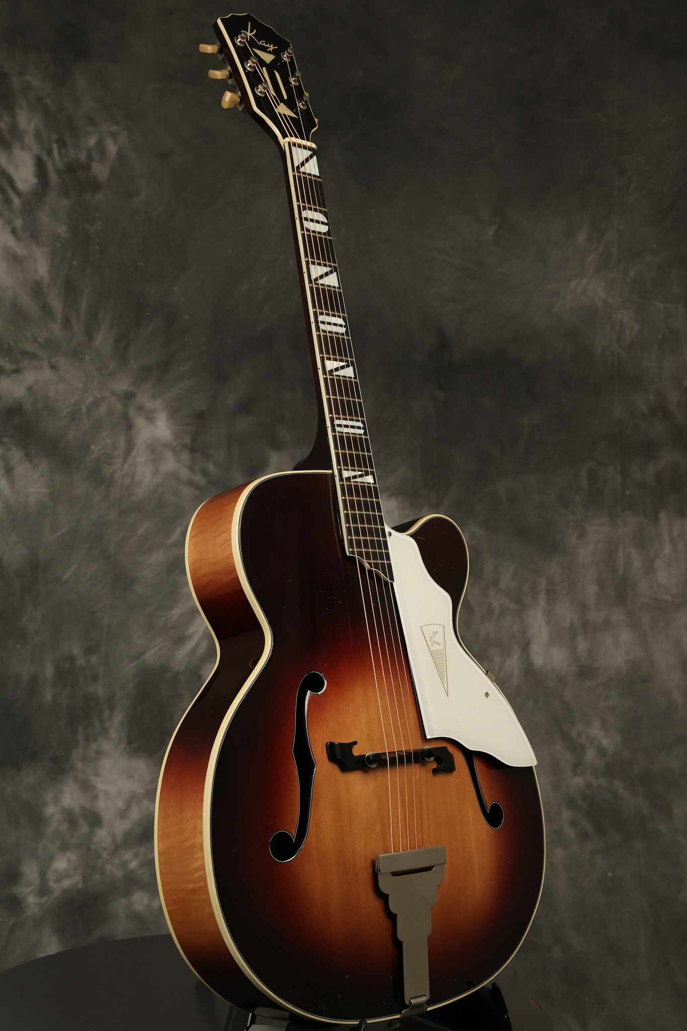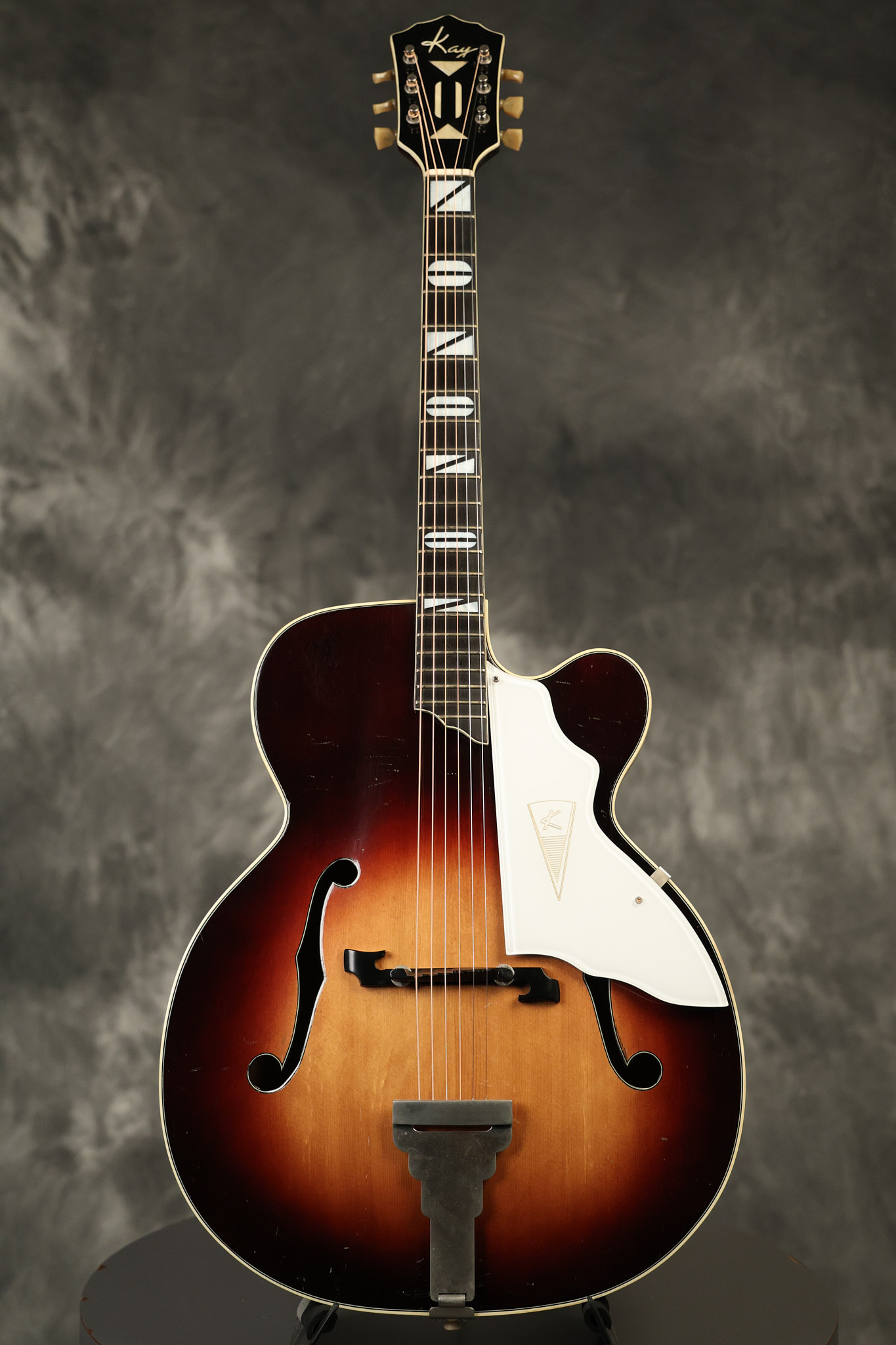 1950's Kay model K21 in its original Sunburst finish on a Spruce top with highly figured maple back + sides. It has a great playing neck with great frets and a big round neck profile. It's all original with the exception of the reproduction pickguard (one addition screw hole concealed by the pickugard). There were two other sets of tuners at one time and have left some extra screw holes which are conceals by the original Kluson Sealfast tuners that have been reinstalled. A nice later hardshell case is included. It's in very good condition with some nicks + dings, extremely minor finish checking and other cosmetic wear. On the back edge of the inside cutaway there is some glue residue seen along with edge of the binding where the a slightly shrunken area of the binding had been reglued. The guitar itself remains structurally sound and sounds great.