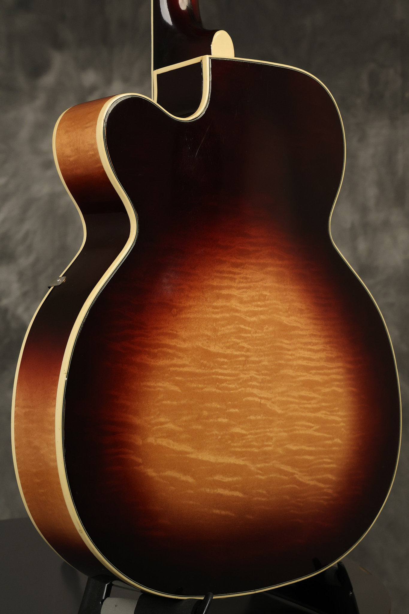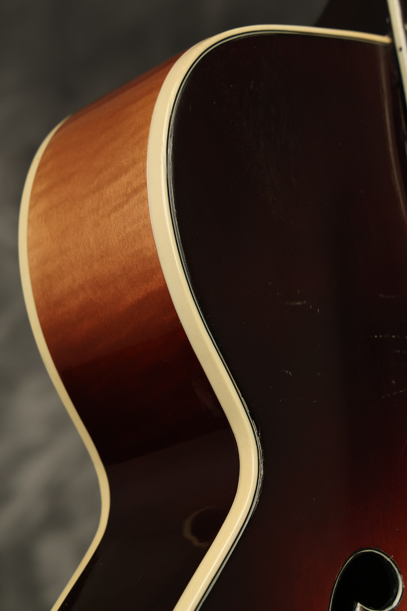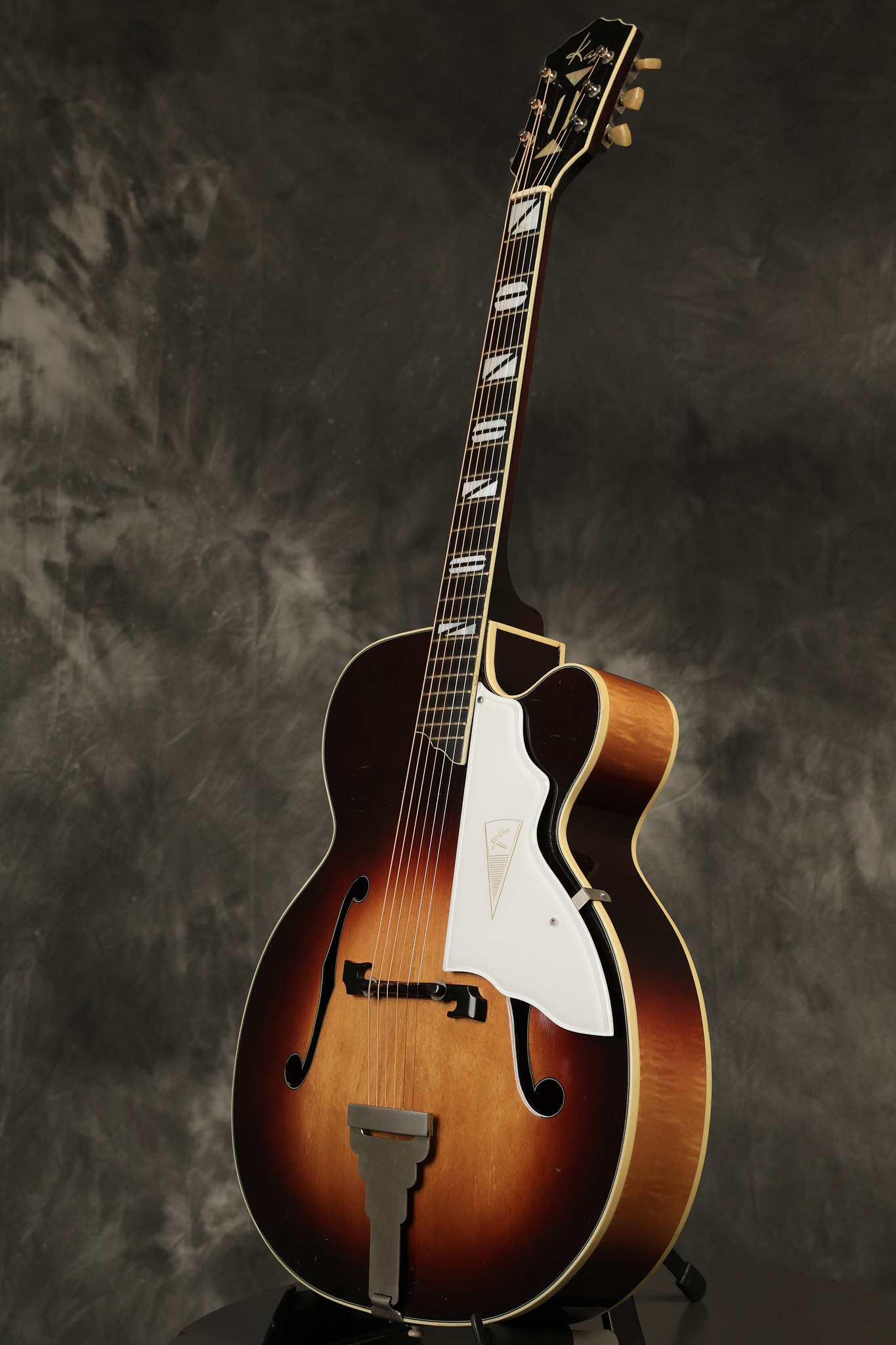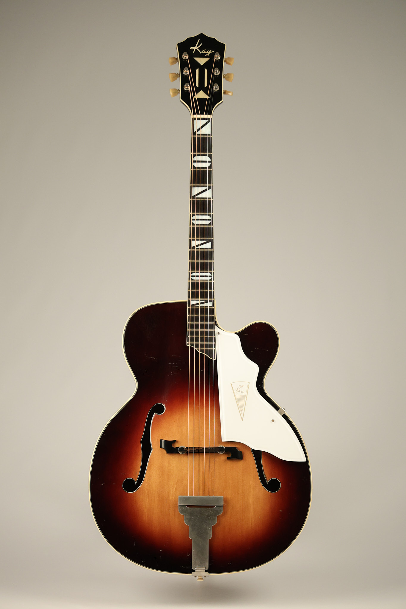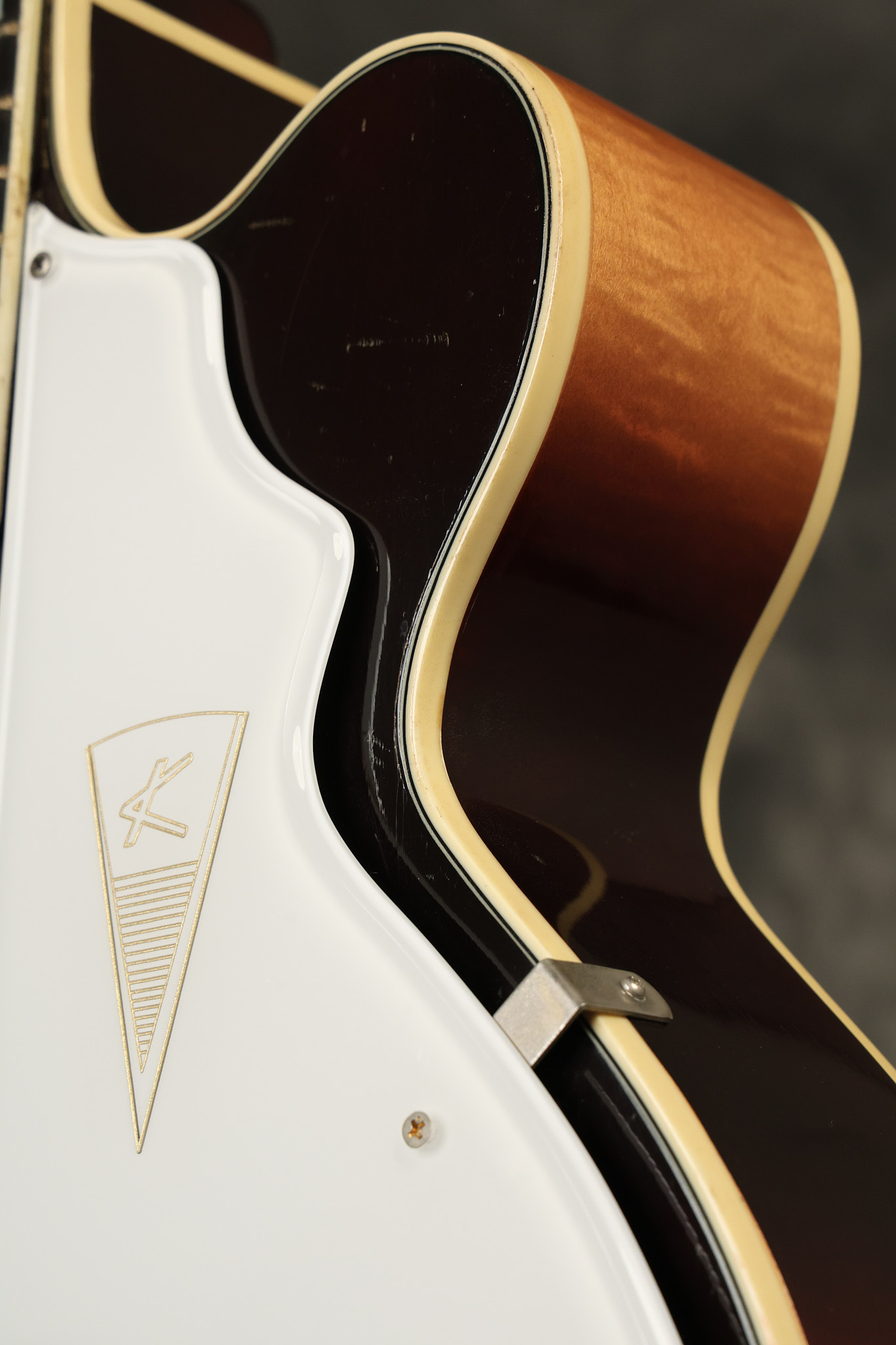 1950's Kay model K21 in its original Sunburst finish on a Spruce top with highly figured maple back + sides. It has a great playing neck with great frets and a big round neck profile. It's all original with the exception of the reproduction pickguard (one addition screw hole concealed by the pickugard). There were two other sets of tuners at one time and have left some extra screw holes which are conceals by the original Kluson Sealfast tuners that have been reinstalled. A nice later hardshell case is included. It's in very good condition with some nicks + dings, extremely minor finish checking and other cosmetic wear. On the back edge of the inside cutaway there is some glue residue seen along with edge of the binding where the a slightly shrunken area of the binding had been reglued. The guitar itself remains structurally sound and sounds great.
