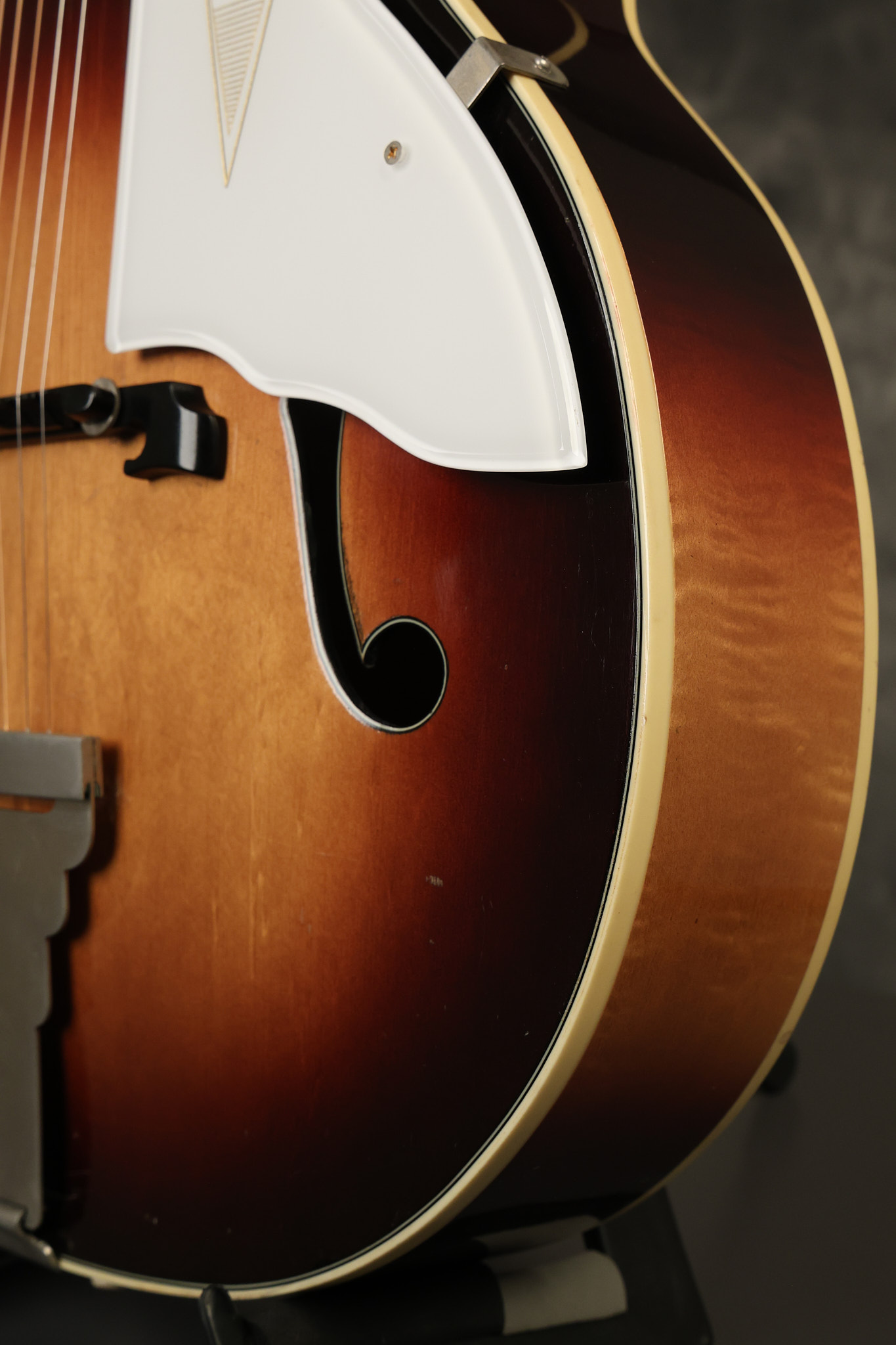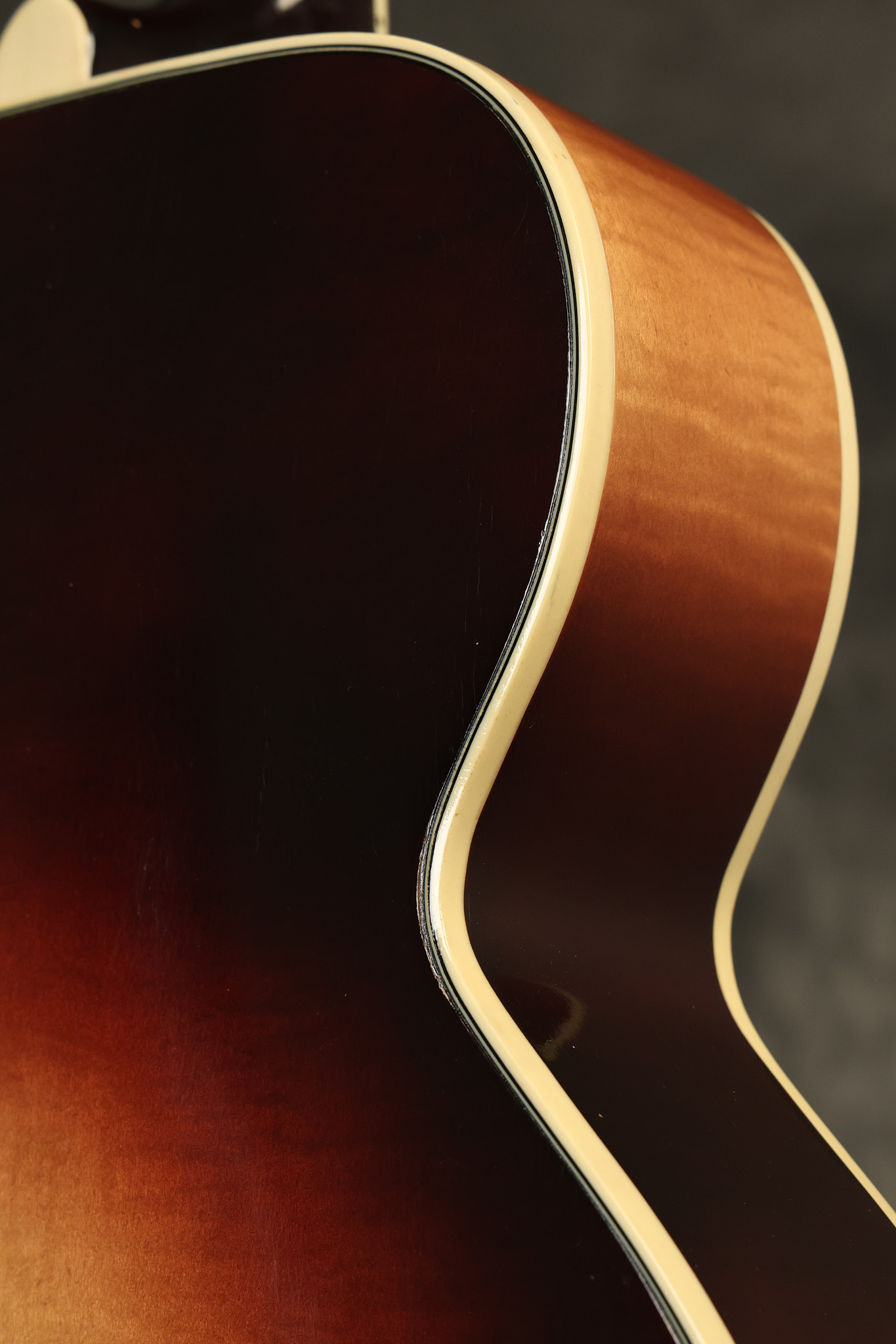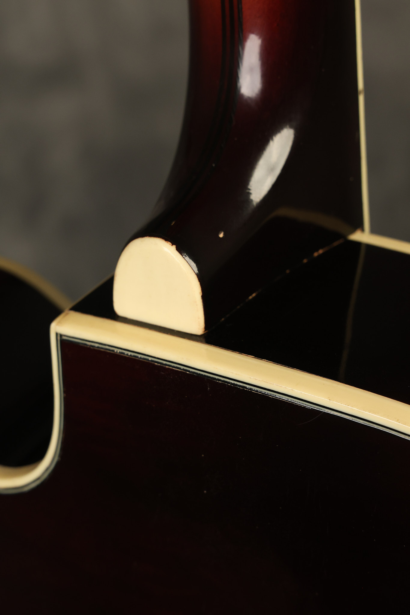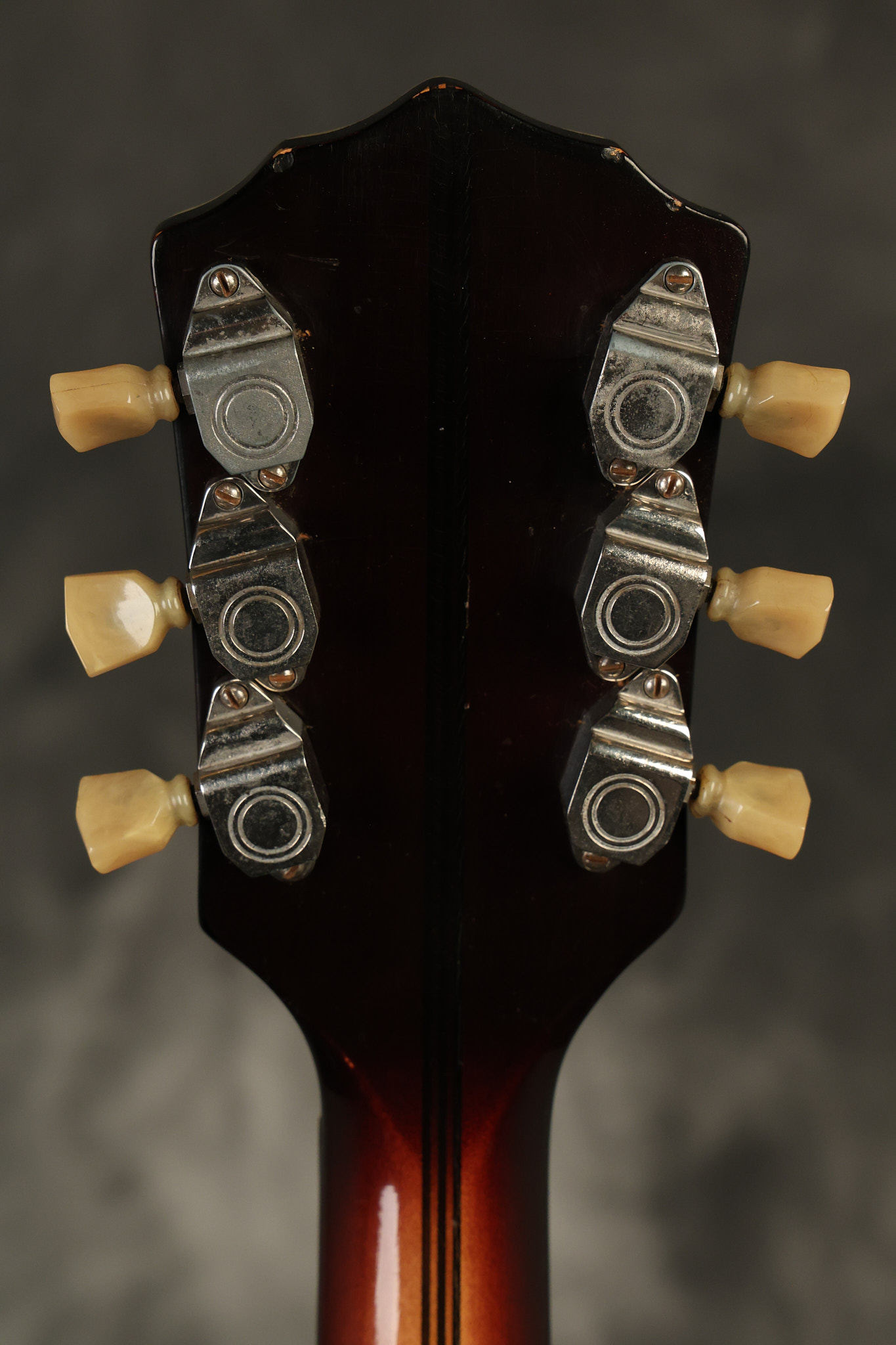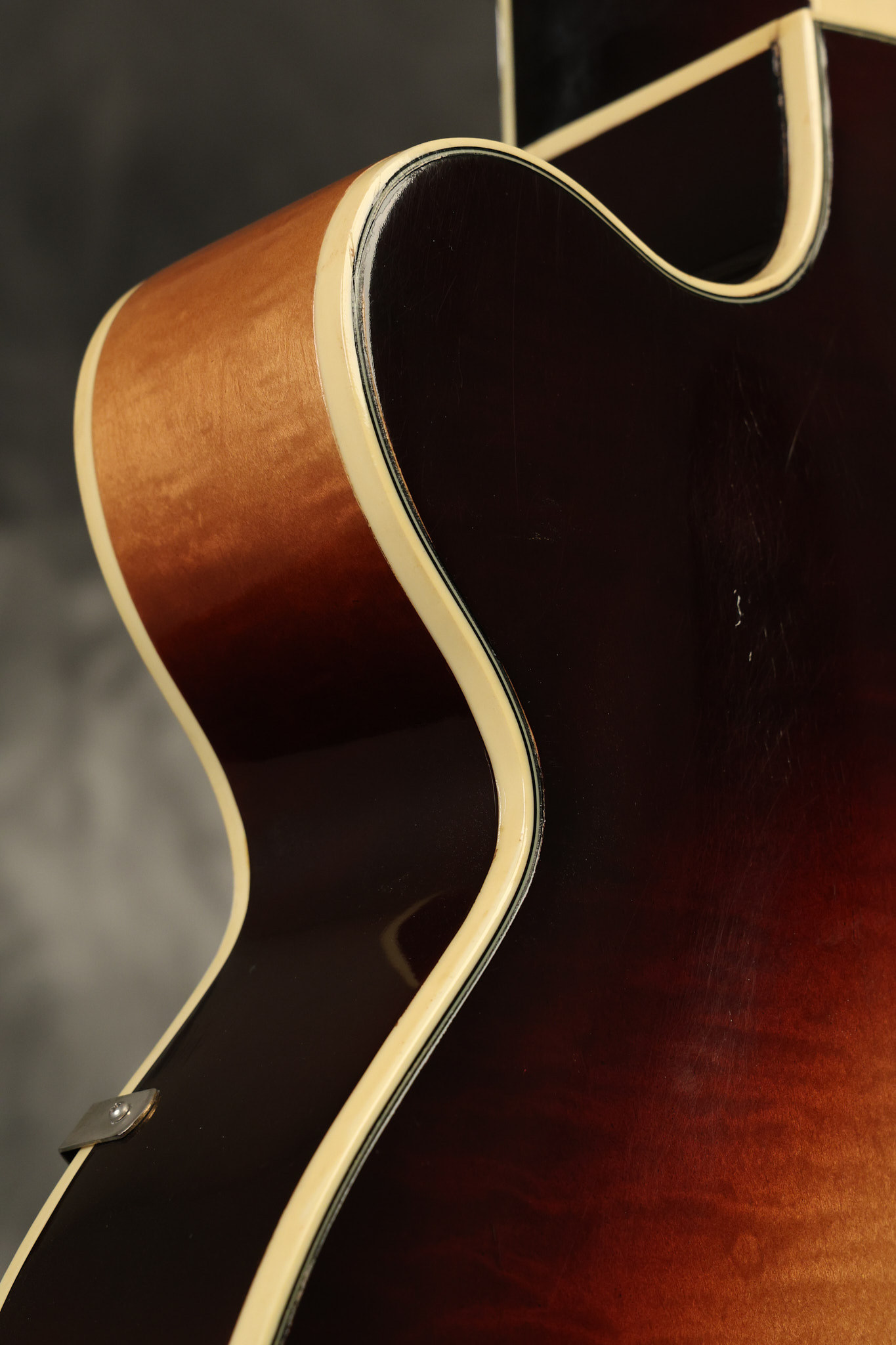 1950's Kay model K21 in its original Sunburst finish on a Spruce top with highly figured maple back + sides. It has a great playing neck with great frets and a big round neck profile. It's all original with the exception of the reproduction pickguard (one addition screw hole concealed by the pickugard). There were two other sets of tuners at one time and have left some extra screw holes which are conceals by the original Kluson Sealfast tuners that have been reinstalled. A nice later hardshell case is included. It's in very good condition with some nicks + dings, extremely minor finish checking and other cosmetic wear. On the back edge of the inside cutaway there is some glue residue seen along with edge of the binding where the a slightly shrunken area of the binding had been reglued. The guitar itself remains structurally sound and sounds great.