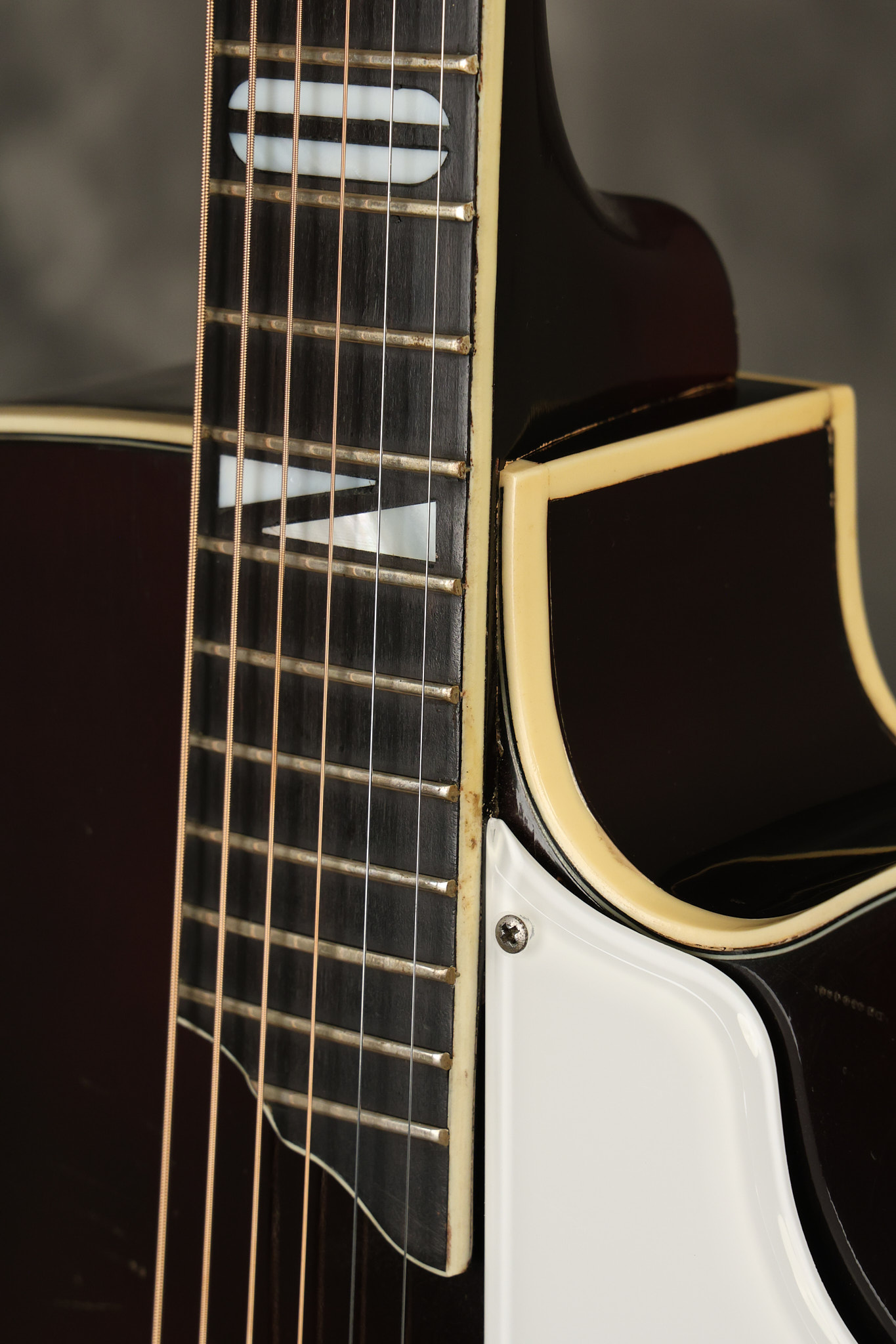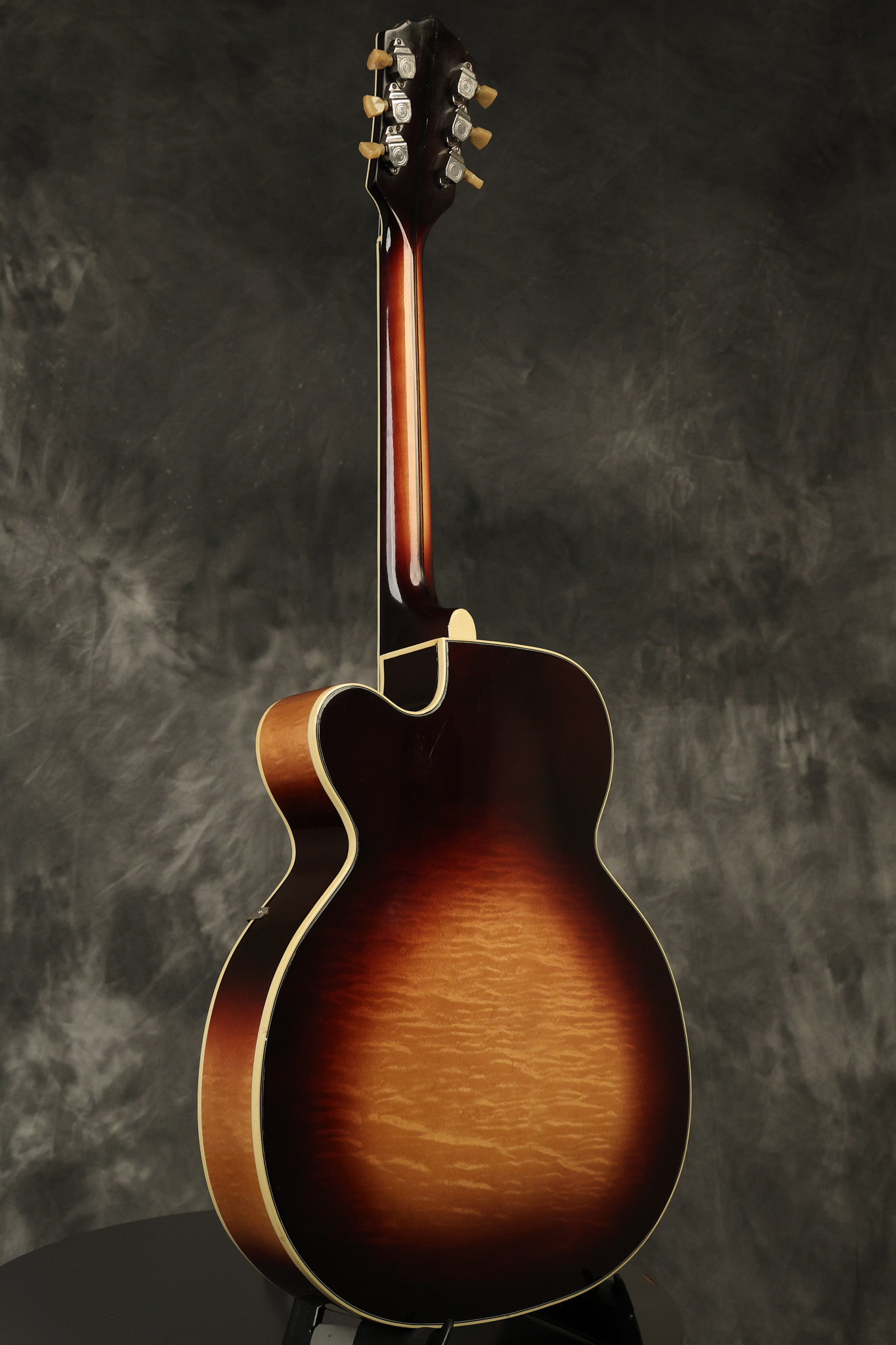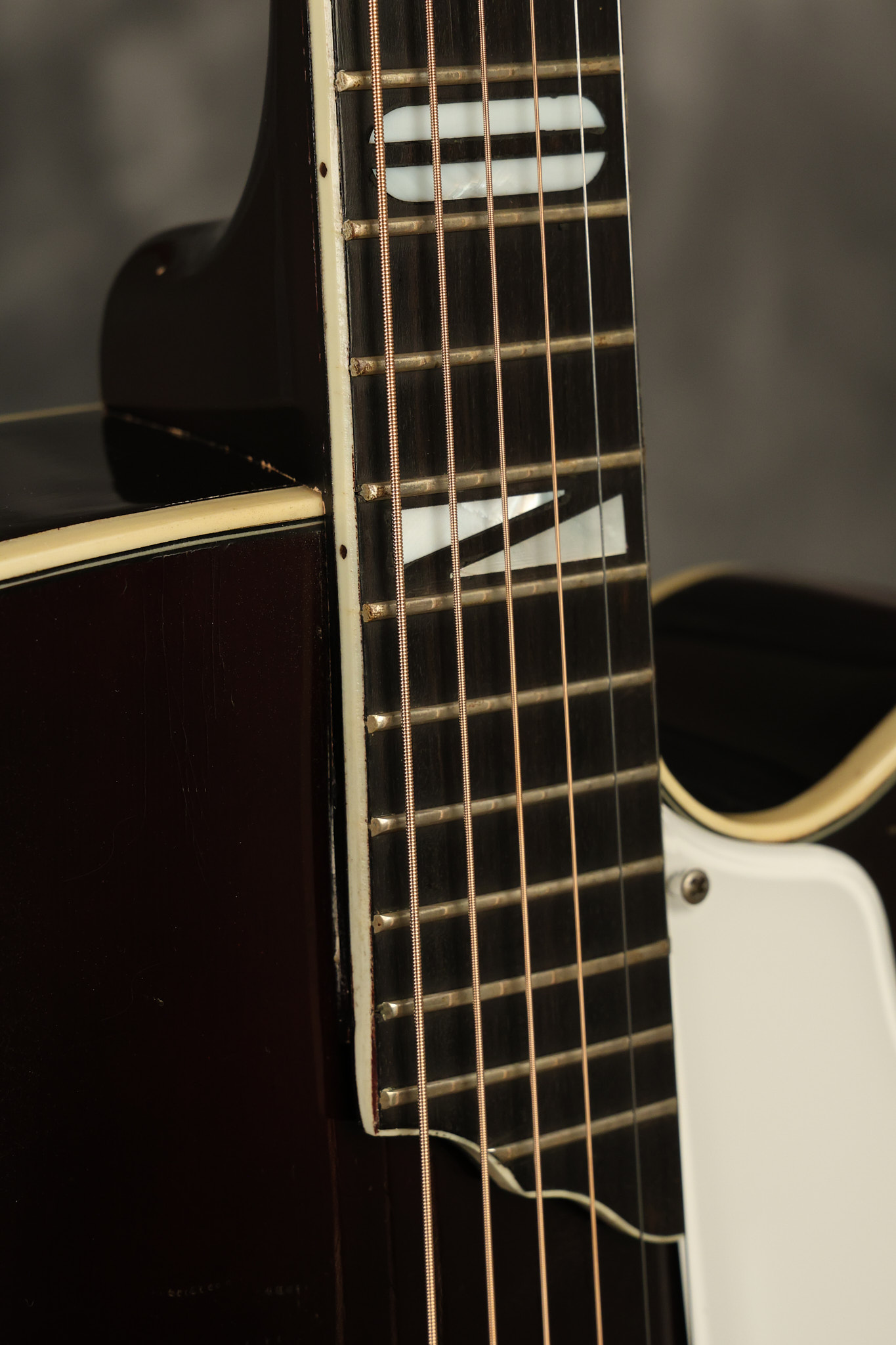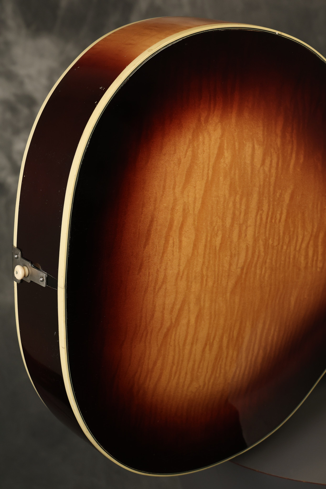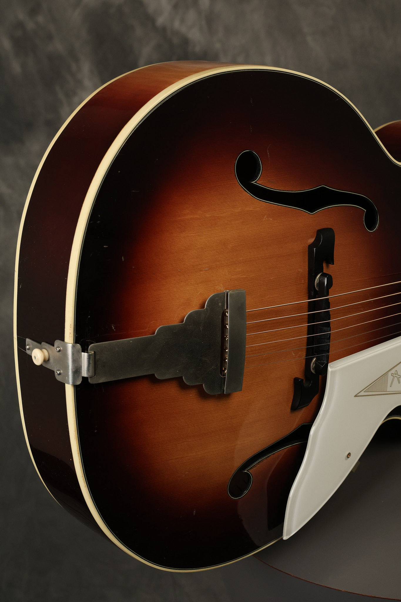 1950's Kay model K21 in its original Sunburst finish on a Spruce top with highly figured maple back + sides. It has a great playing neck with great frets and a big round neck profile. It's all original with the exception of the reproduction pickguard (one addition screw hole concealed by the pickugard). There were two other sets of tuners at one time and have left some extra screw holes which are conceals by the original Kluson Sealfast tuners that have been reinstalled. A nice later hardshell case is included. It's in very good condition with some nicks + dings, extremely minor finish checking and other cosmetic wear. On the back edge of the inside cutaway there is some glue residue seen along with edge of the binding where the a slightly shrunken area of the binding had been reglued. The guitar itself remains structurally sound and sounds great.