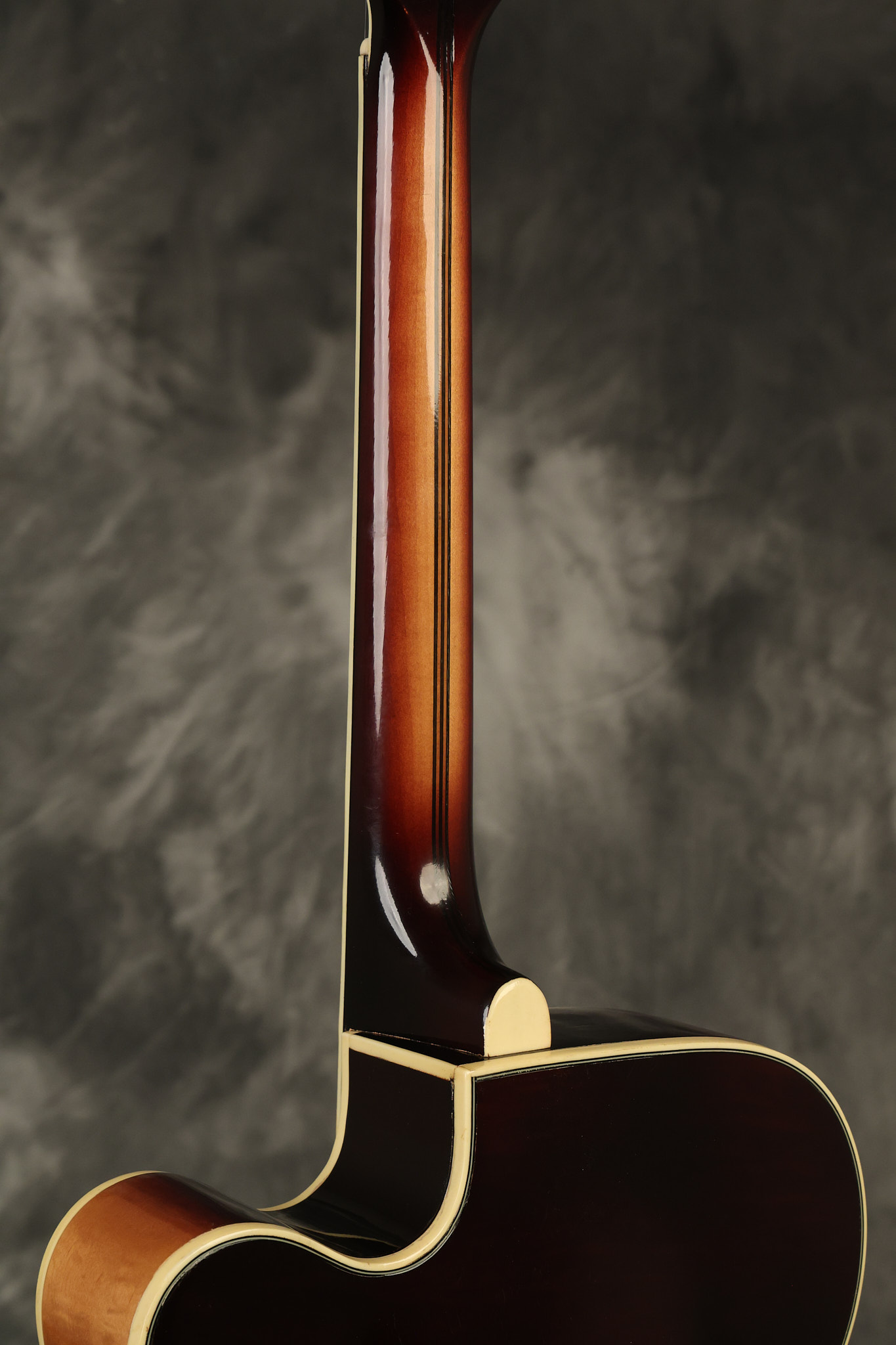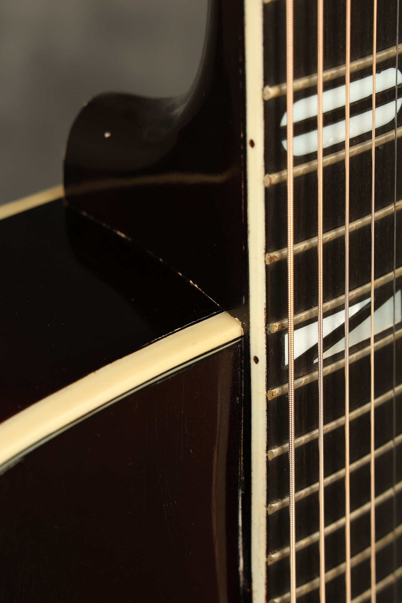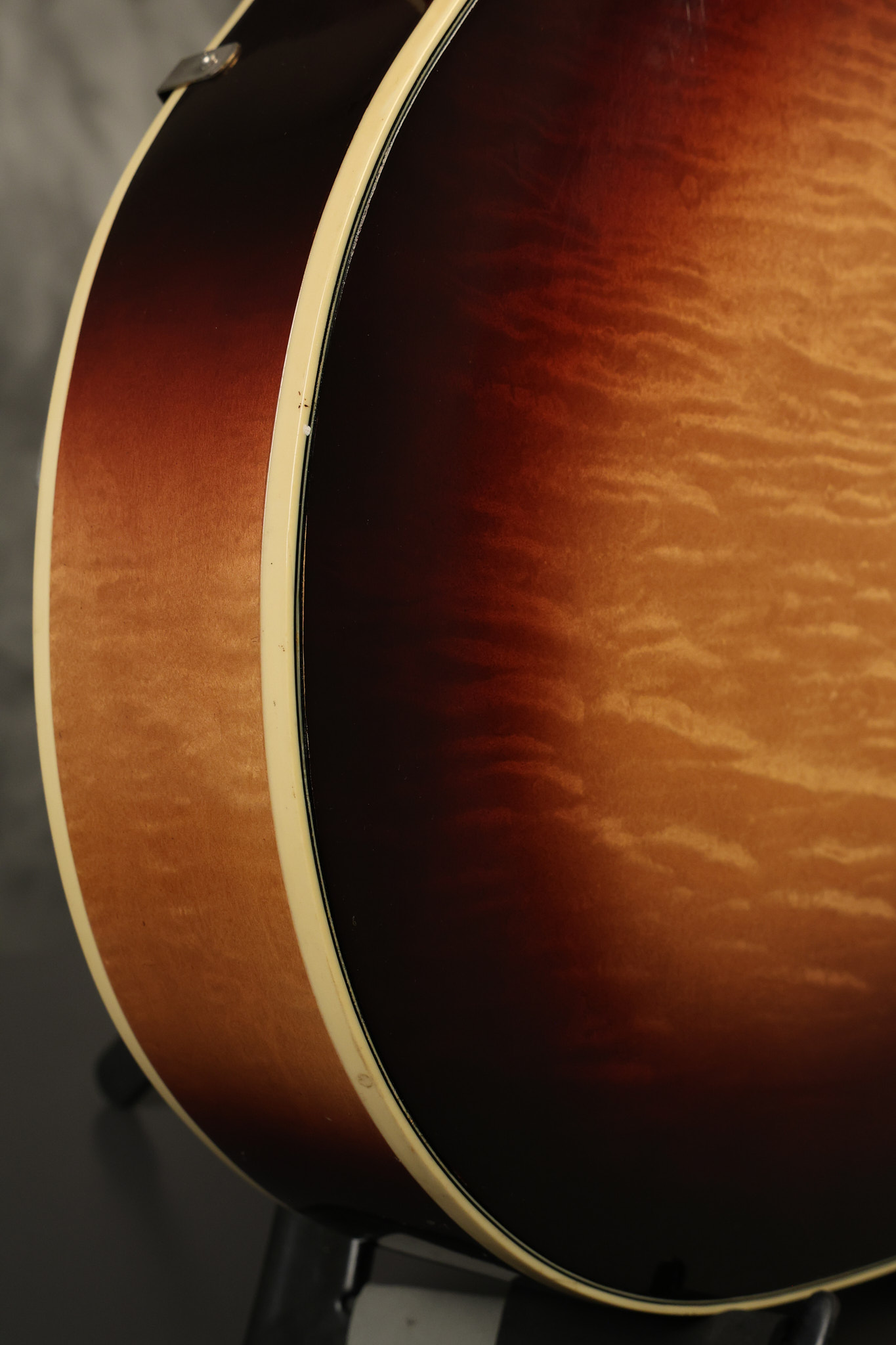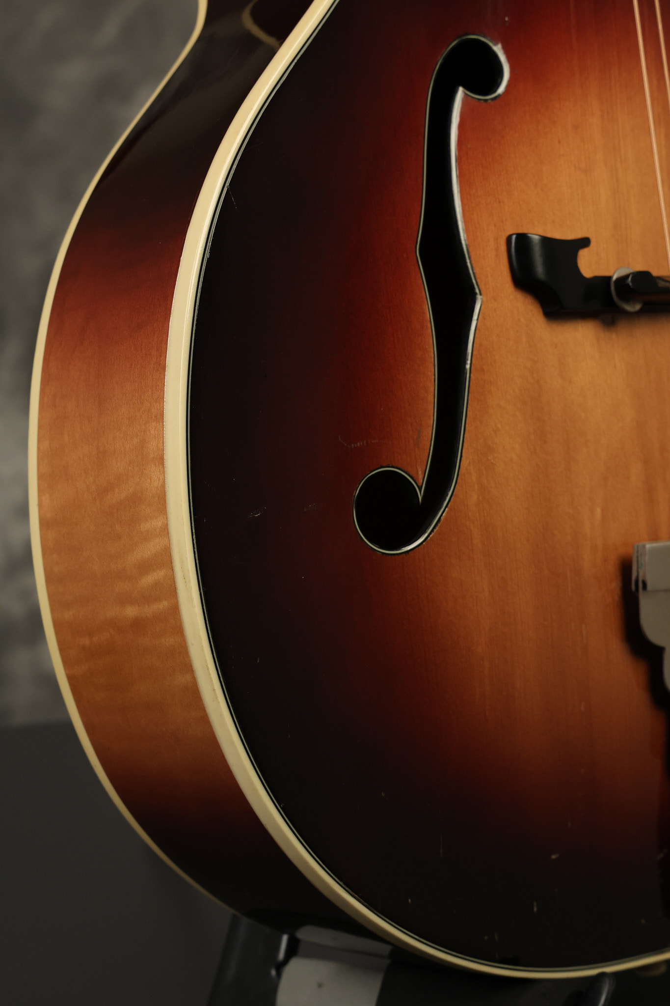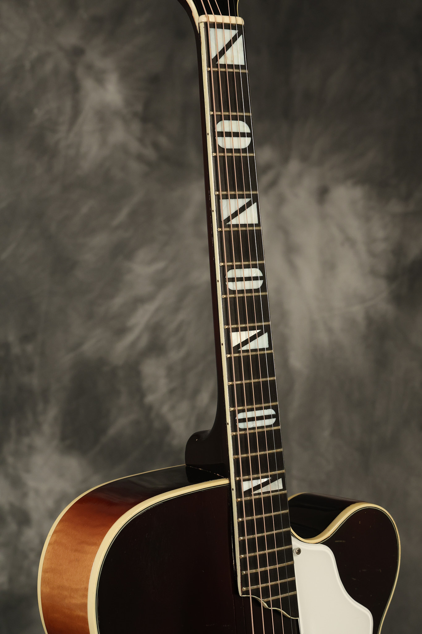 1950's Kay model K21 in its original Sunburst finish on a Spruce top with highly figured maple back + sides. It has a great playing neck with great frets and a big round neck profile. It's all original with the exception of the reproduction pickguard (one addition screw hole concealed by the pickugard). There were two other sets of tuners at one time and have left some extra screw holes which are conceals by the original Kluson Sealfast tuners that have been reinstalled. A nice later hardshell case is included. It's in very good condition with some nicks + dings, extremely minor finish checking and other cosmetic wear. On the back edge of the inside cutaway there is some glue residue seen along with edge of the binding where the a slightly shrunken area of the binding had been reglued. The guitar itself remains structurally sound and sounds great.
