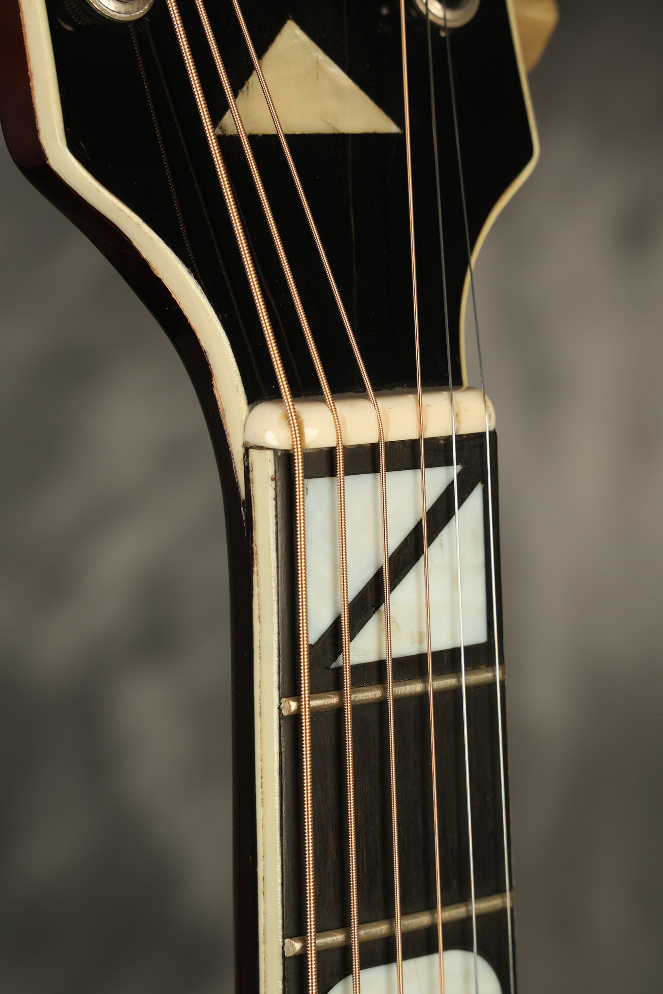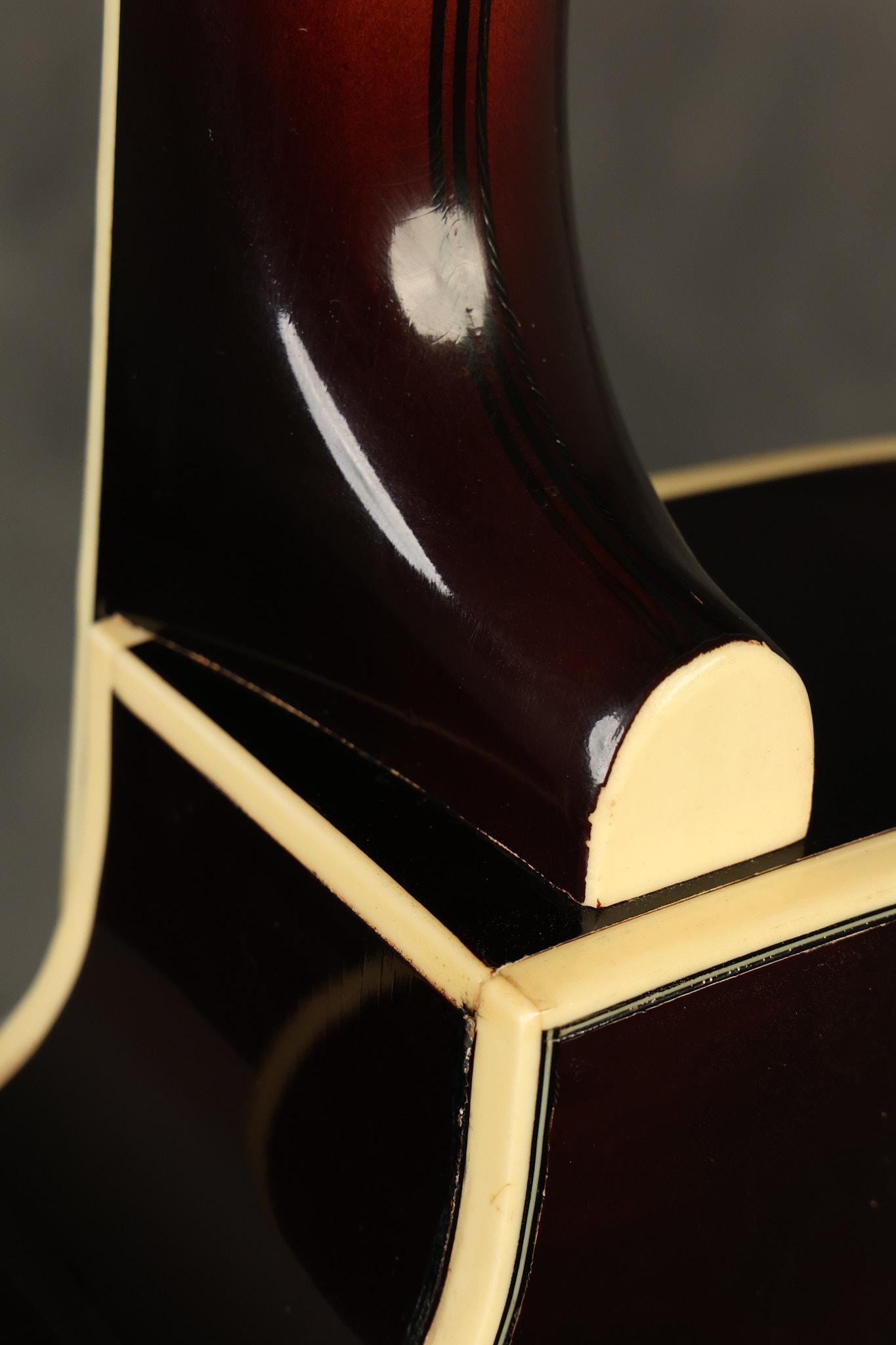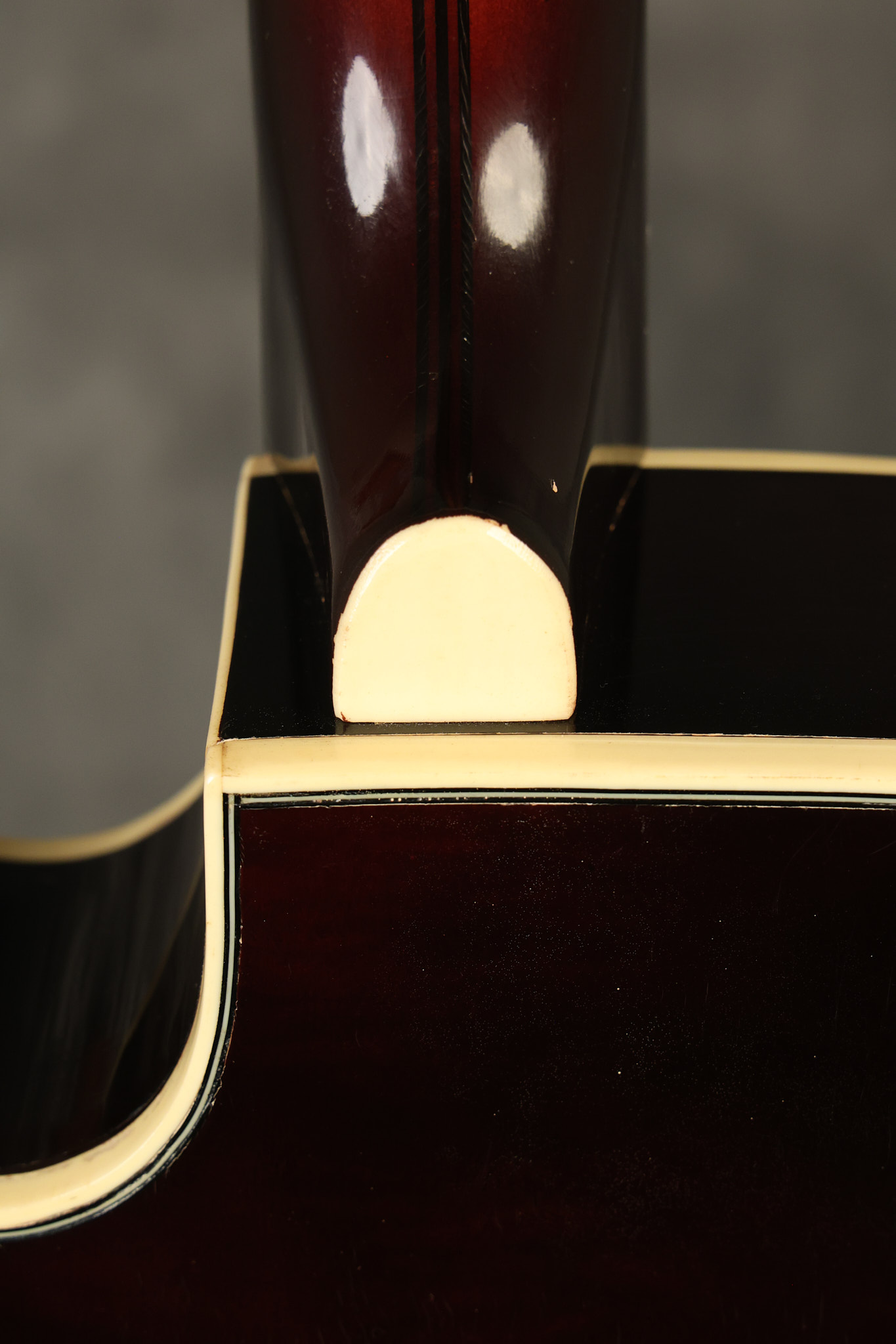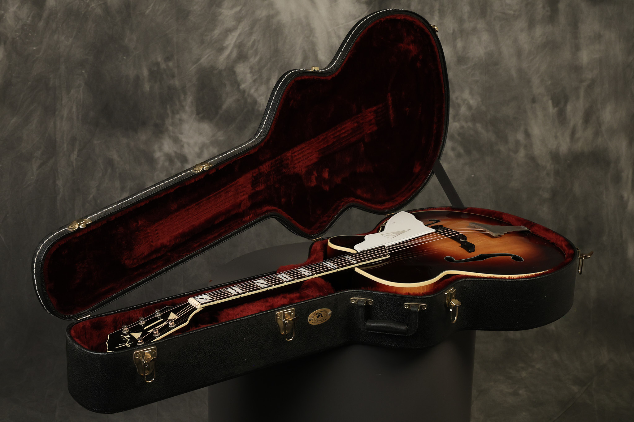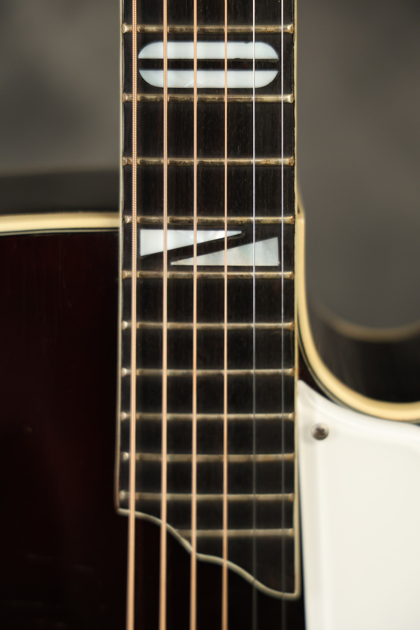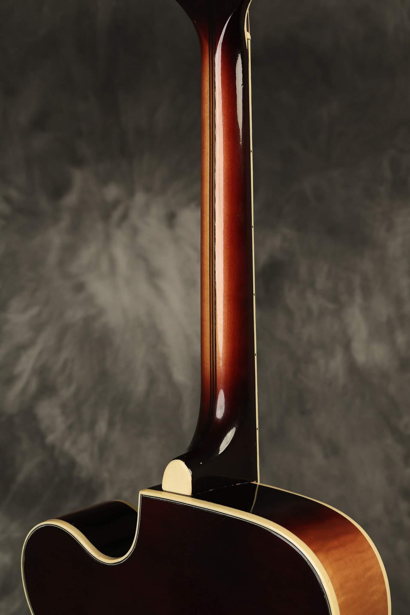 1950's Kay model K21 in its original Sunburst finish on a Spruce top with highly figured maple back + sides. It has a great playing neck with great frets and a big round neck profile. It's all original with the exception of the reproduction pickguard (one addition screw hole concealed by the pickugard). There were two other sets of tuners at one time and have left some extra screw holes which are conceals by the original Kluson Sealfast tuners that have been reinstalled. A nice later hardshell case is included. It's in very good condition with some nicks + dings, extremely minor finish checking and other cosmetic wear. On the back edge of the inside cutaway there is some glue residue seen along with edge of the binding where the a slightly shrunken area of the binding had been reglued. The guitar itself remains structurally sound and sounds great.