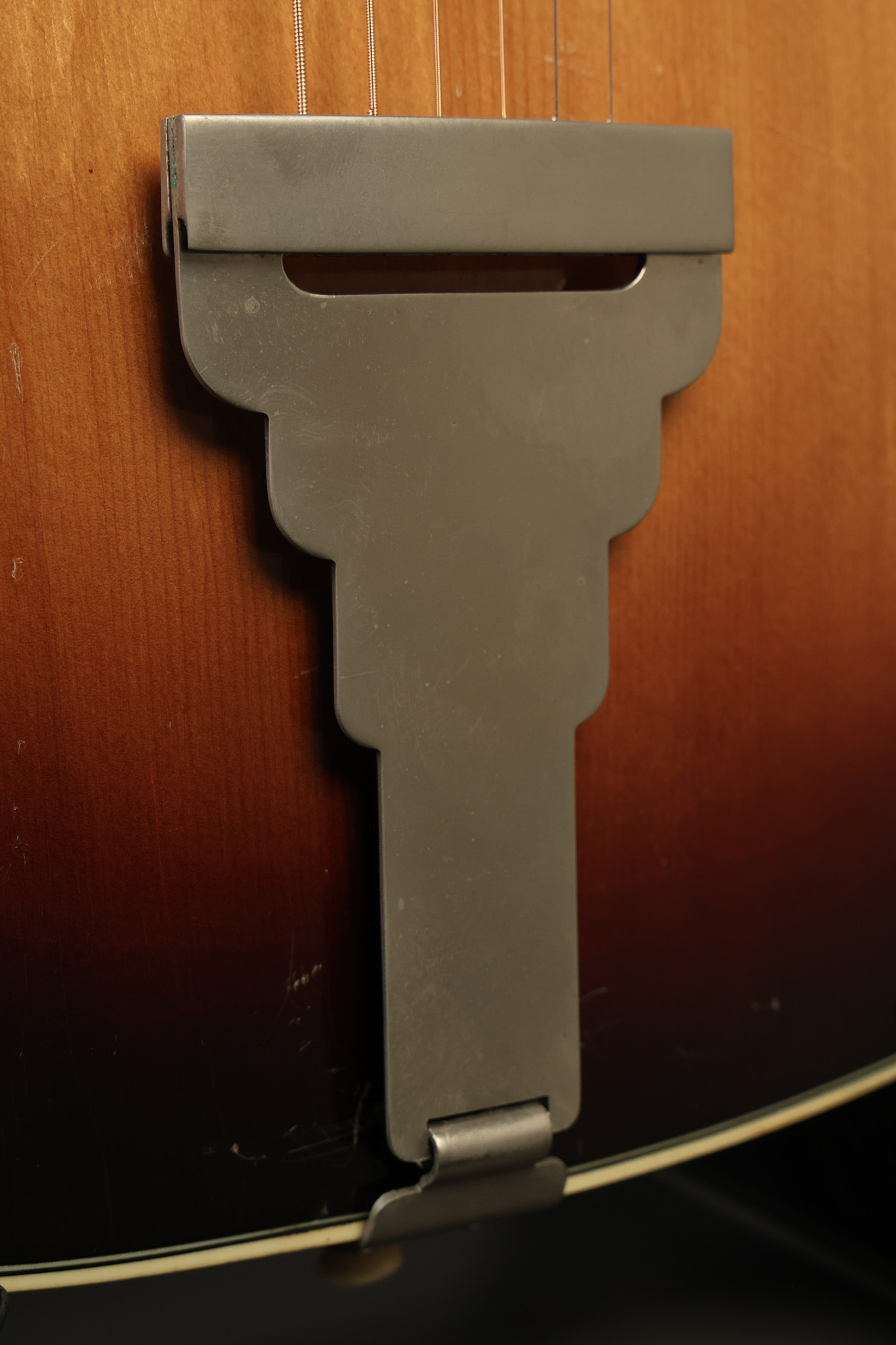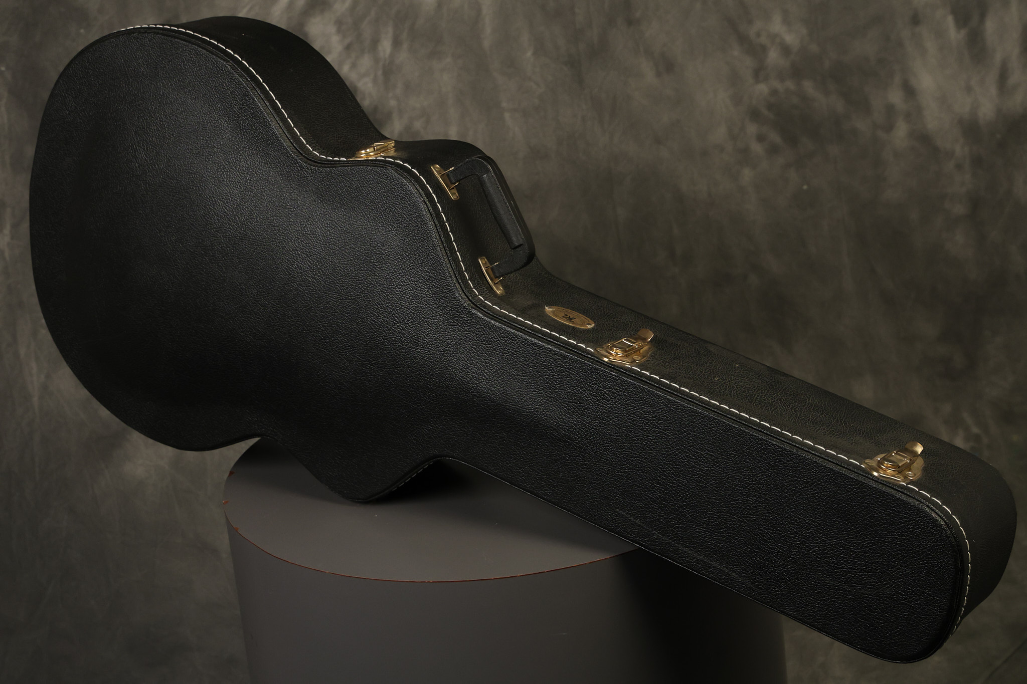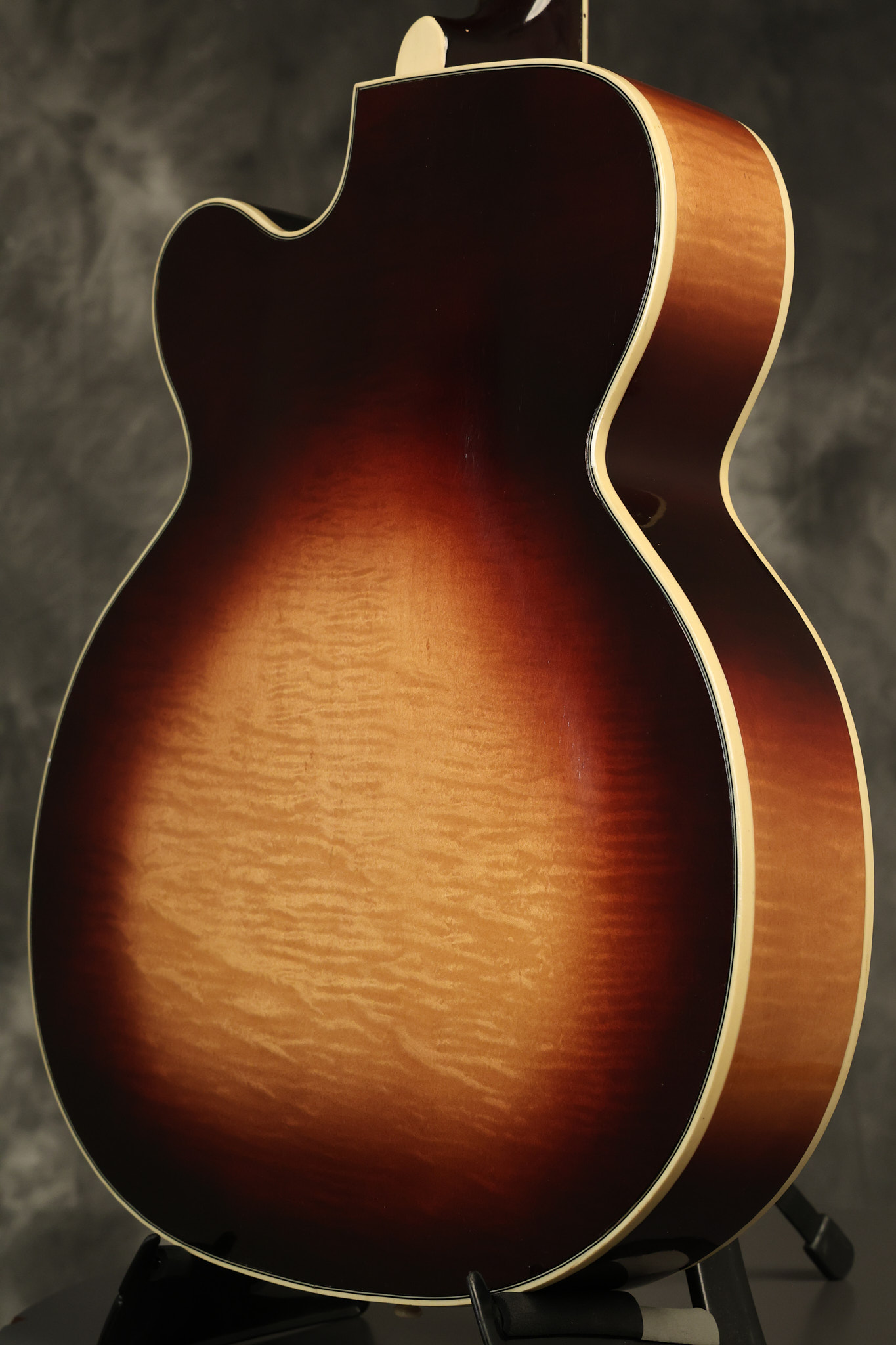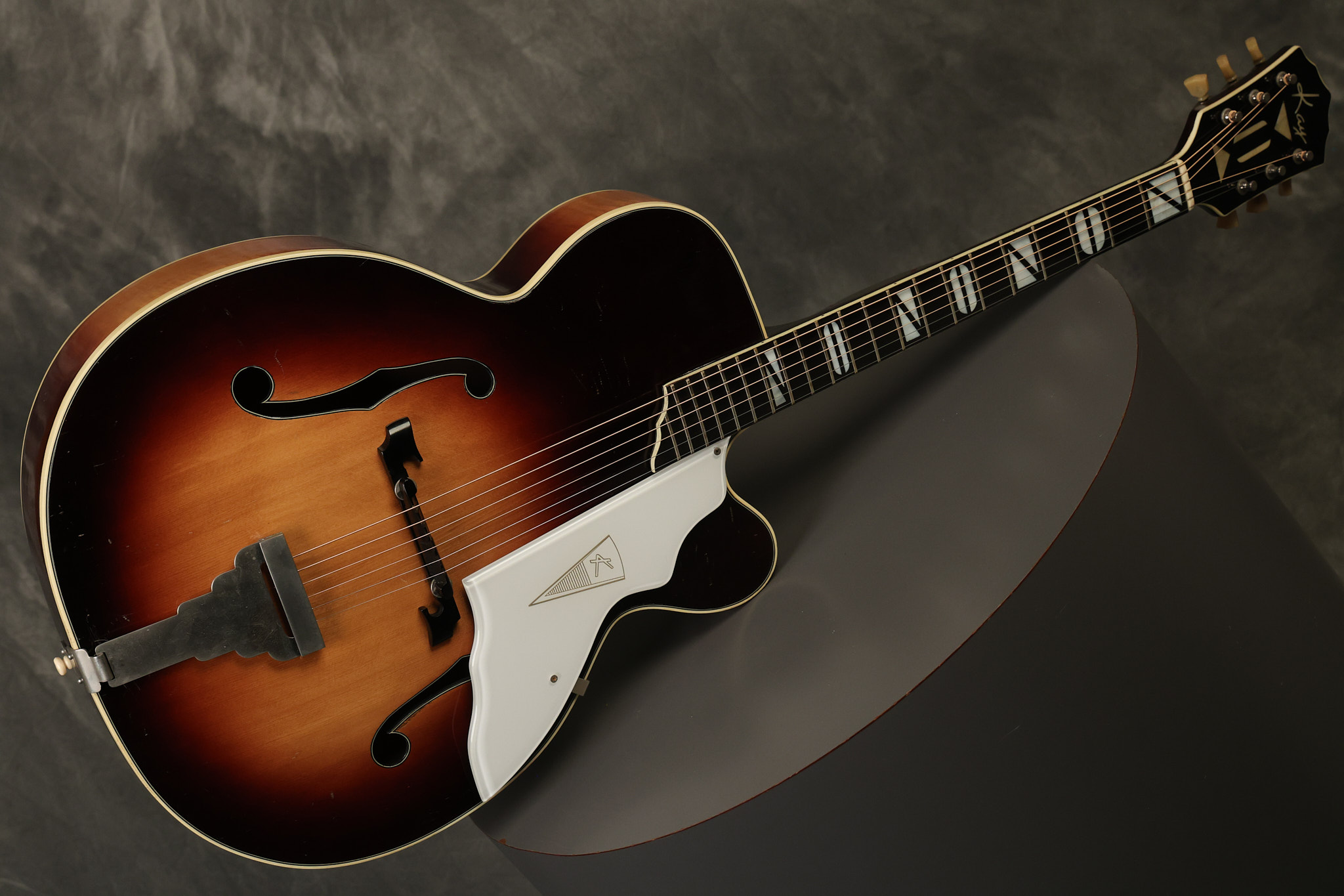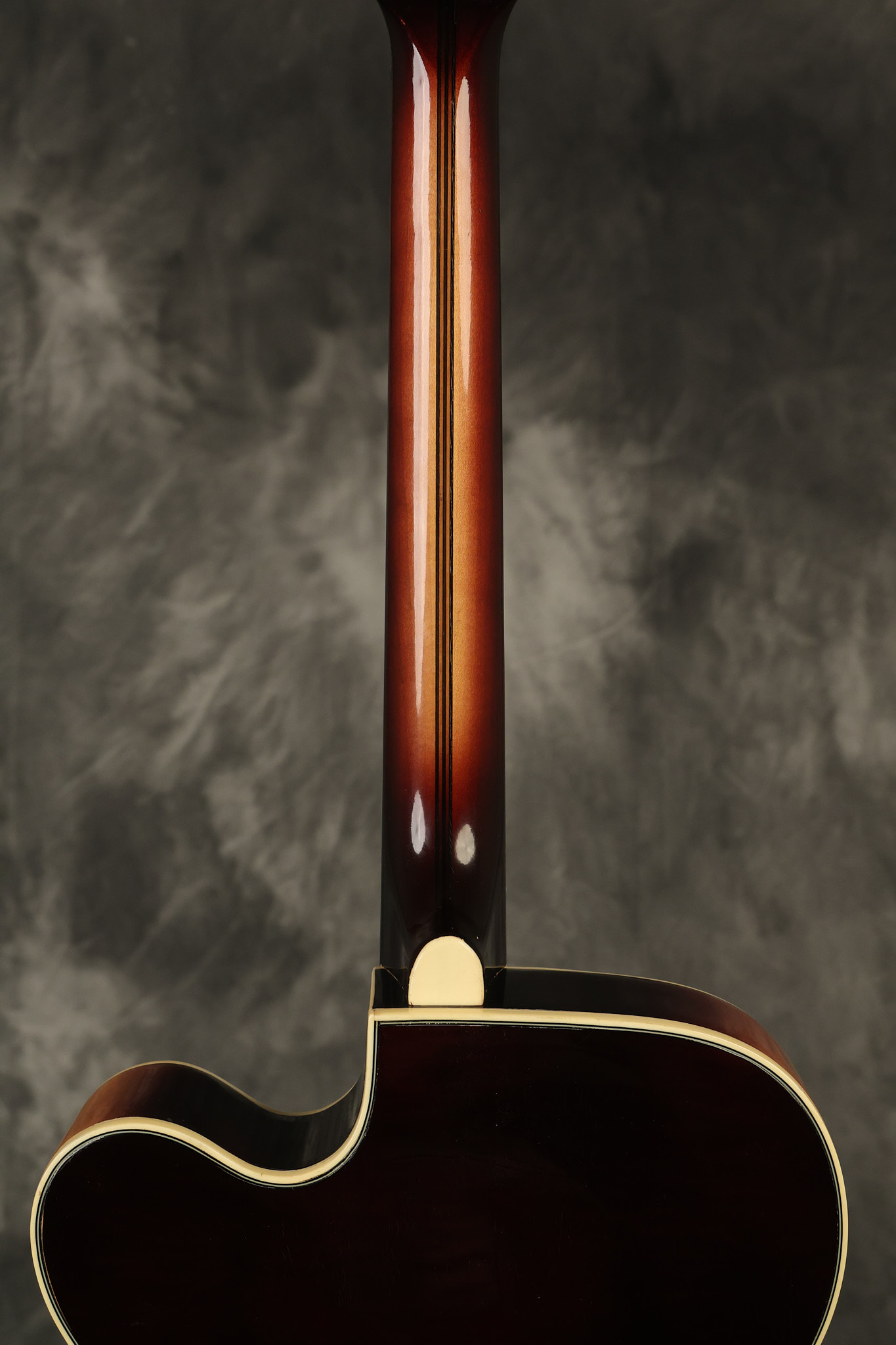 1950's Kay model K21 in its original Sunburst finish on a Spruce top with highly figured maple back + sides. It has a great playing neck with great frets and a big round neck profile. It's all original with the exception of the reproduction pickguard (one addition screw hole concealed by the pickugard). There were two other sets of tuners at one time and have left some extra screw holes which are conceals by the original Kluson Sealfast tuners that have been reinstalled. A nice later hardshell case is included. It's in very good condition with some nicks + dings, extremely minor finish checking and other cosmetic wear. On the back edge of the inside cutaway there is some glue residue seen along with edge of the binding where the a slightly shrunken area of the binding had been reglued. The guitar itself remains structurally sound and sounds great.