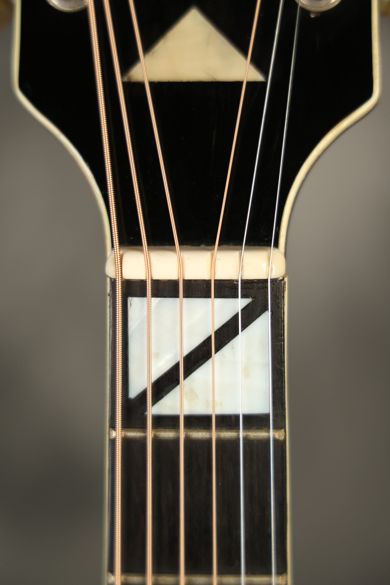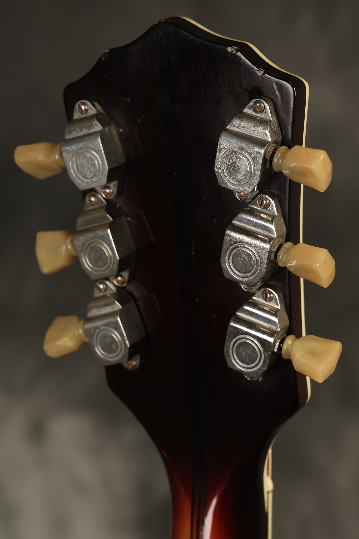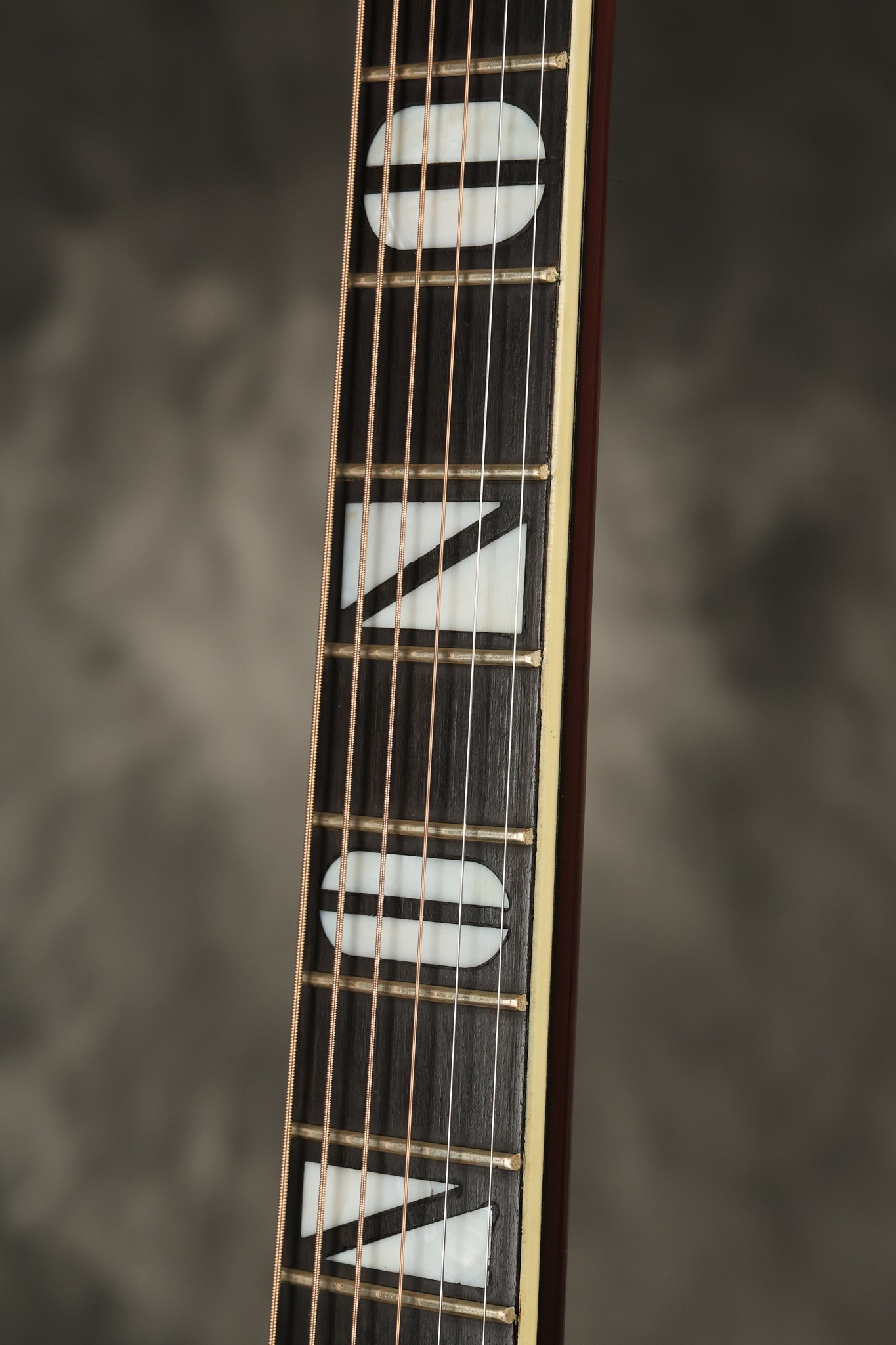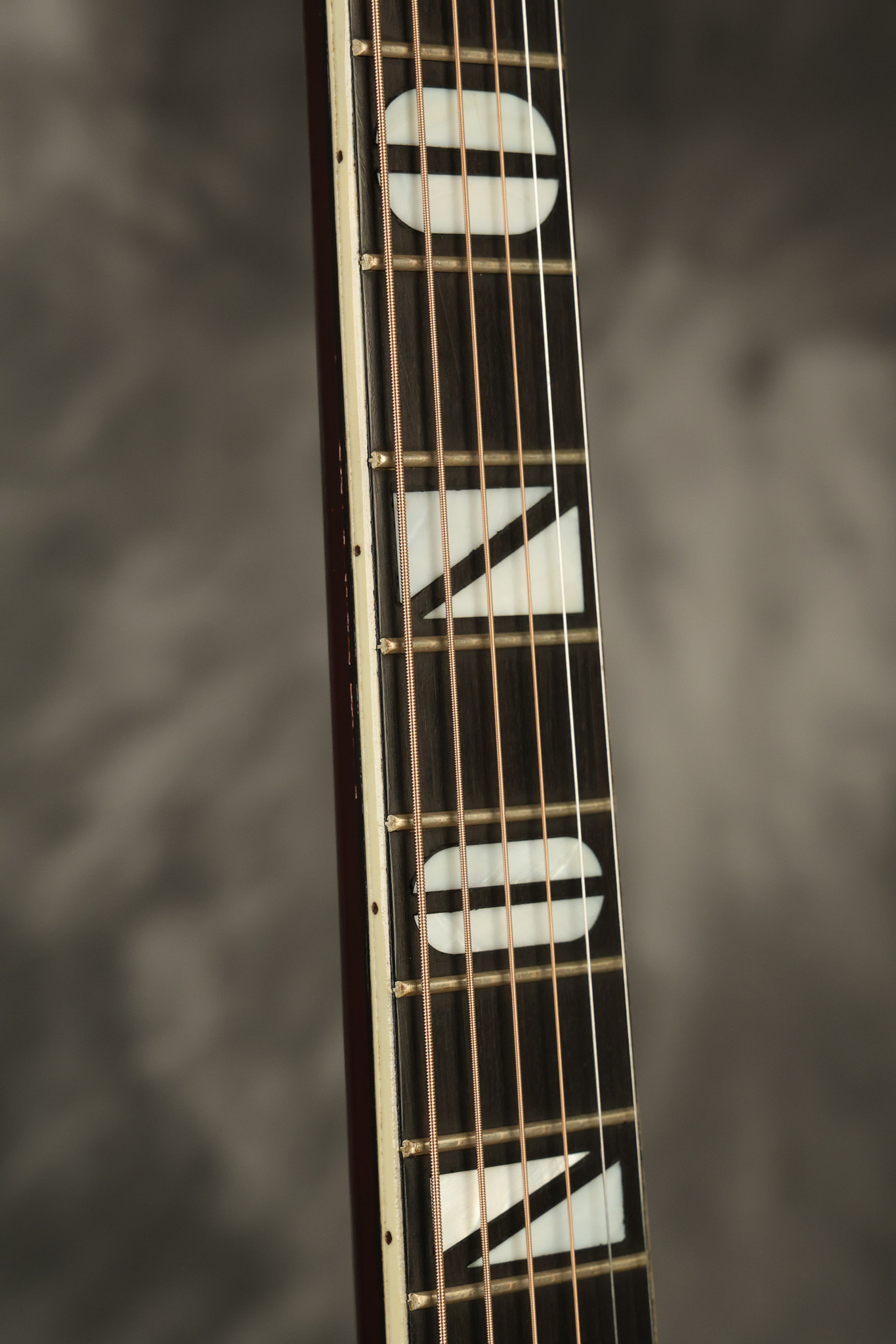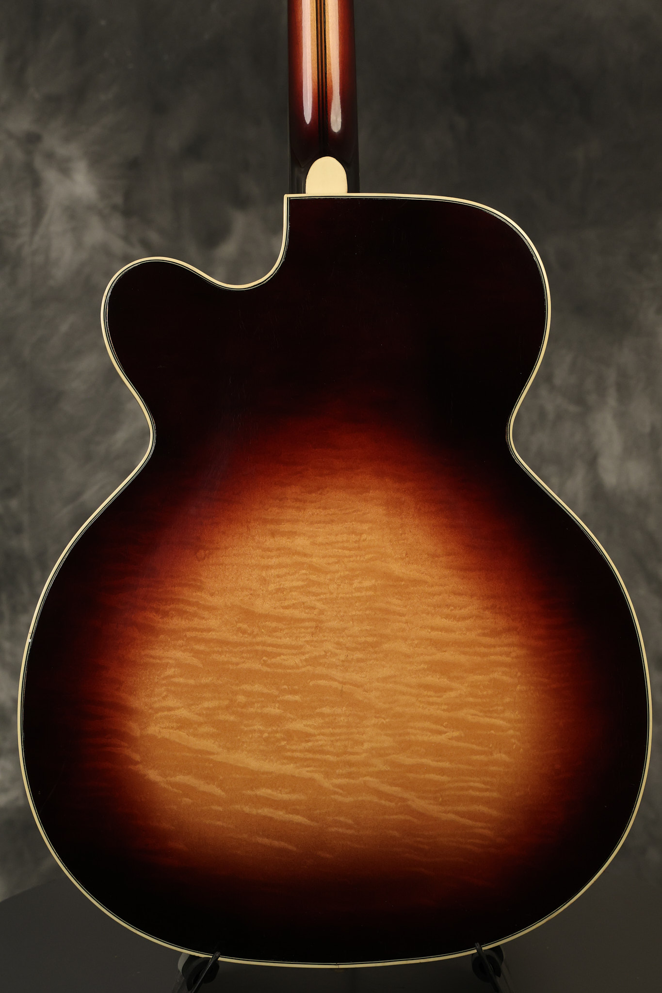 1950's Kay model K21 in its original Sunburst finish on a Spruce top with highly figured maple back + sides. It has a great playing neck with great frets and a big round neck profile. It's all original with the exception of the reproduction pickguard (one addition screw hole concealed by the pickugard). There were two other sets of tuners at one time and have left some extra screw holes which are conceals by the original Kluson Sealfast tuners that have been reinstalled. A nice later hardshell case is included. It's in very good condition with some nicks + dings, extremely minor finish checking and other cosmetic wear. On the back edge of the inside cutaway there is some glue residue seen along with edge of the binding where the a slightly shrunken area of the binding had been reglued. The guitar itself remains structurally sound and sounds great.