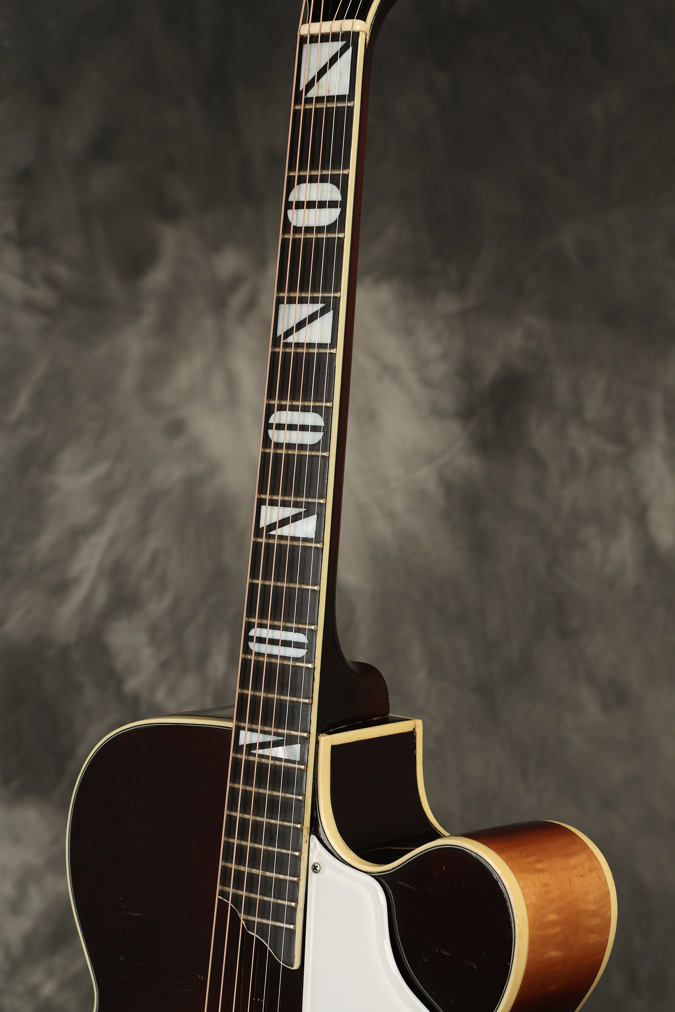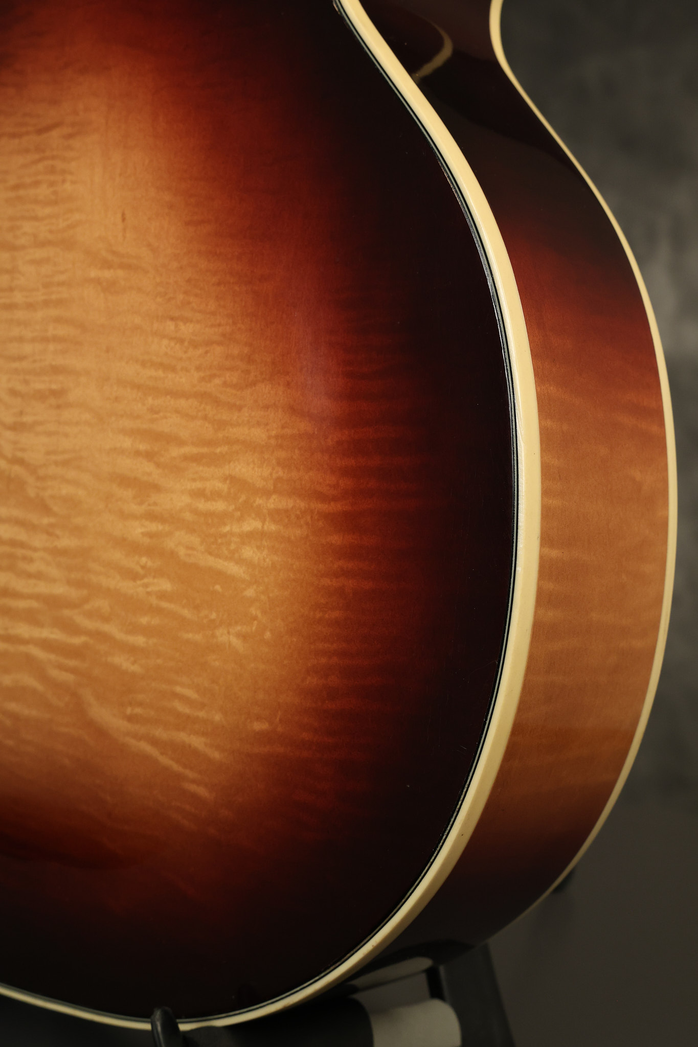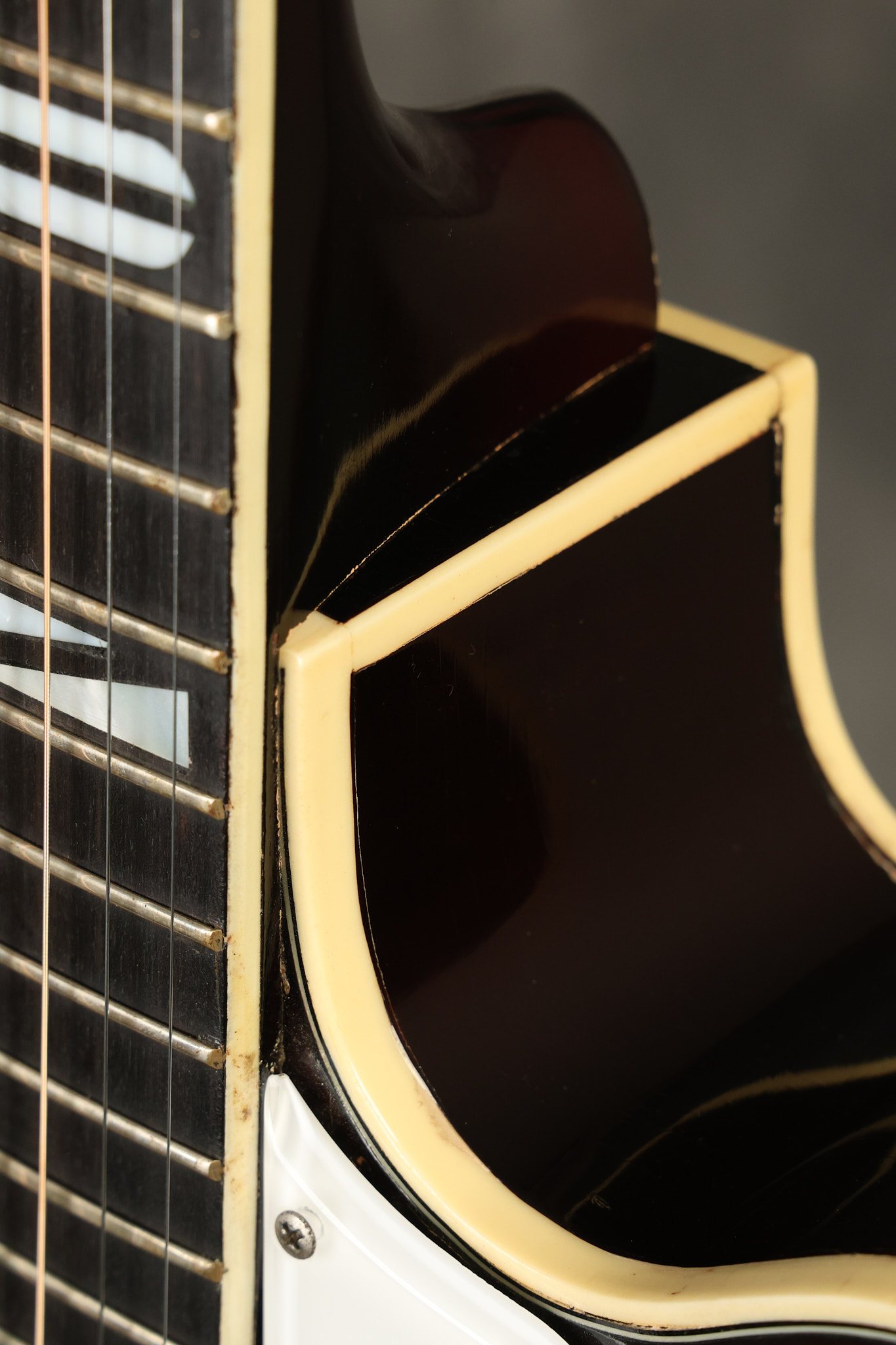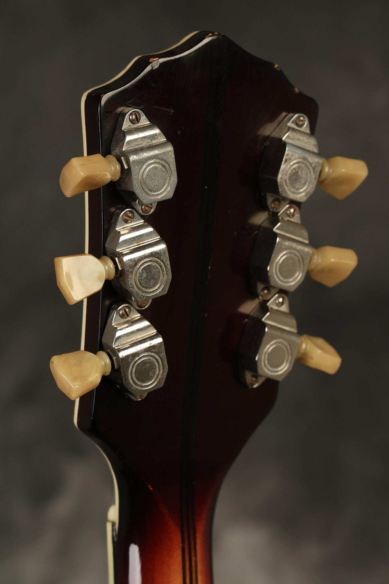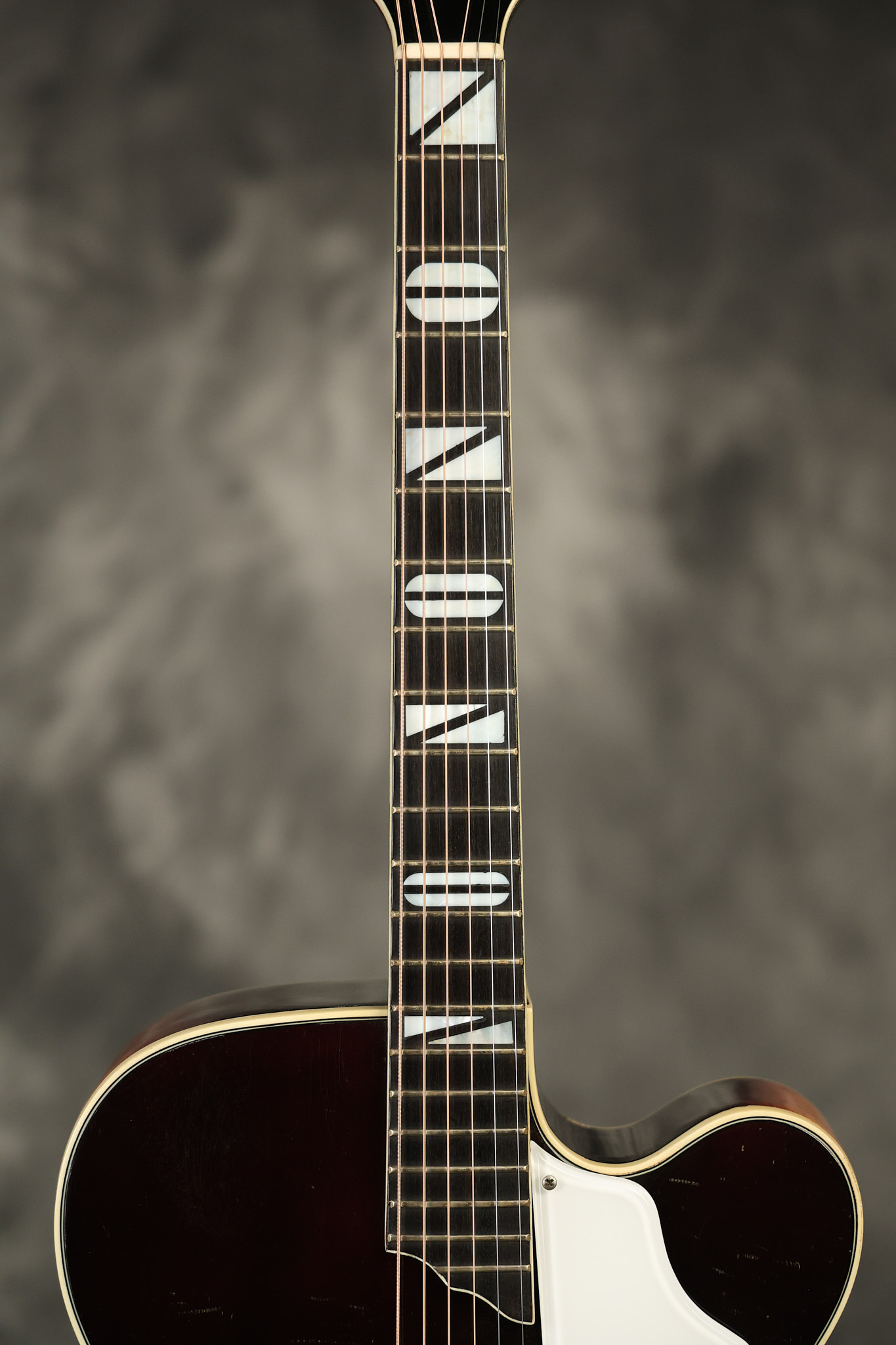 1950's Kay model K21 in its original Sunburst finish on a Spruce top with highly figured maple back + sides. It has a great playing neck with great frets and a big round neck profile. It's all original with the exception of the reproduction pickguard (one addition screw hole concealed by the pickugard). There were two other sets of tuners at one time and have left some extra screw holes which are conceals by the original Kluson Sealfast tuners that have been reinstalled. A nice later hardshell case is included. It's in very good condition with some nicks + dings, extremely minor finish checking and other cosmetic wear. On the back edge of the inside cutaway there is some glue residue seen along with edge of the binding where the a slightly shrunken area of the binding had been reglued. The guitar itself remains structurally sound and sounds great.