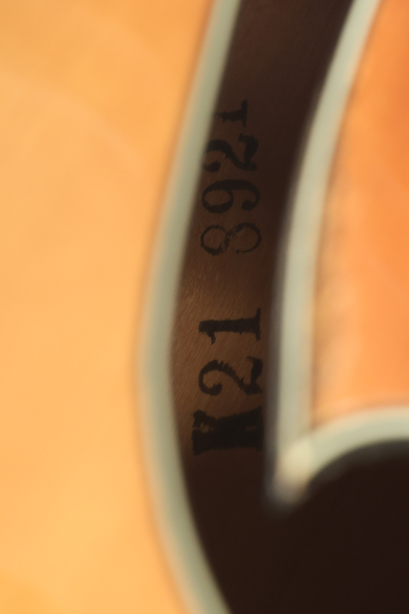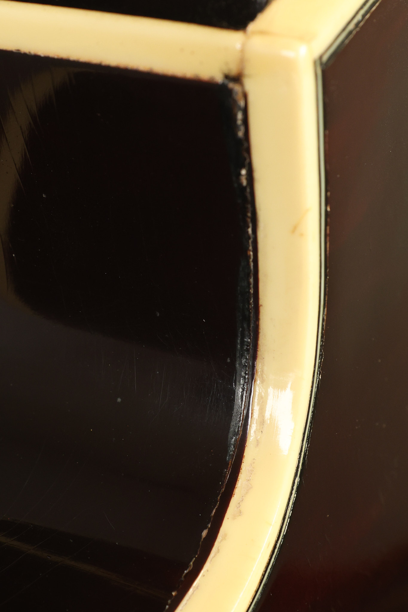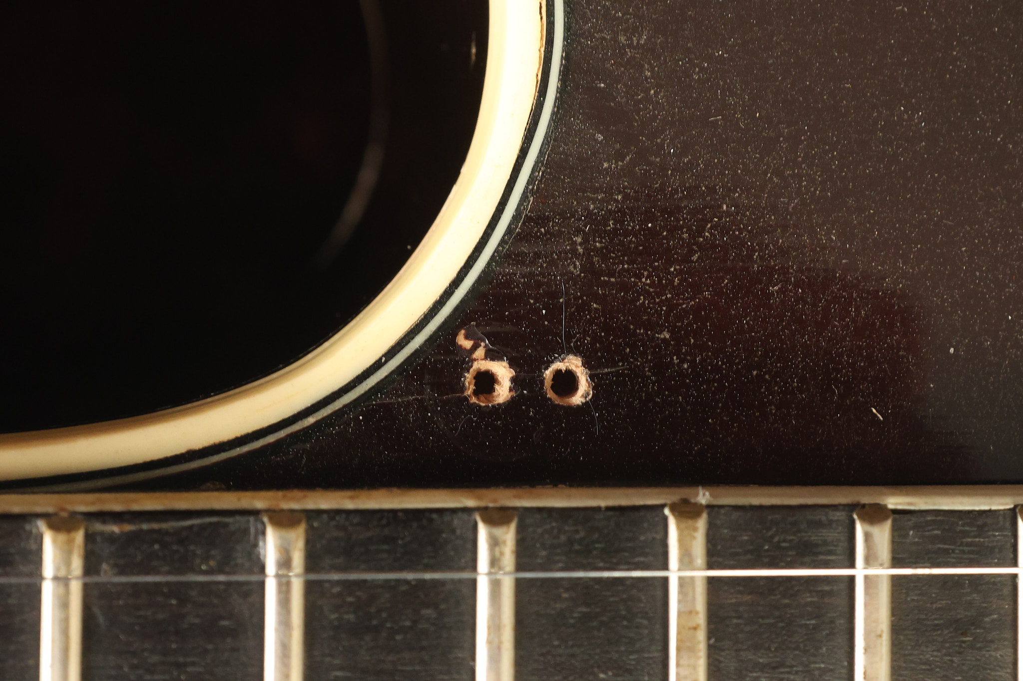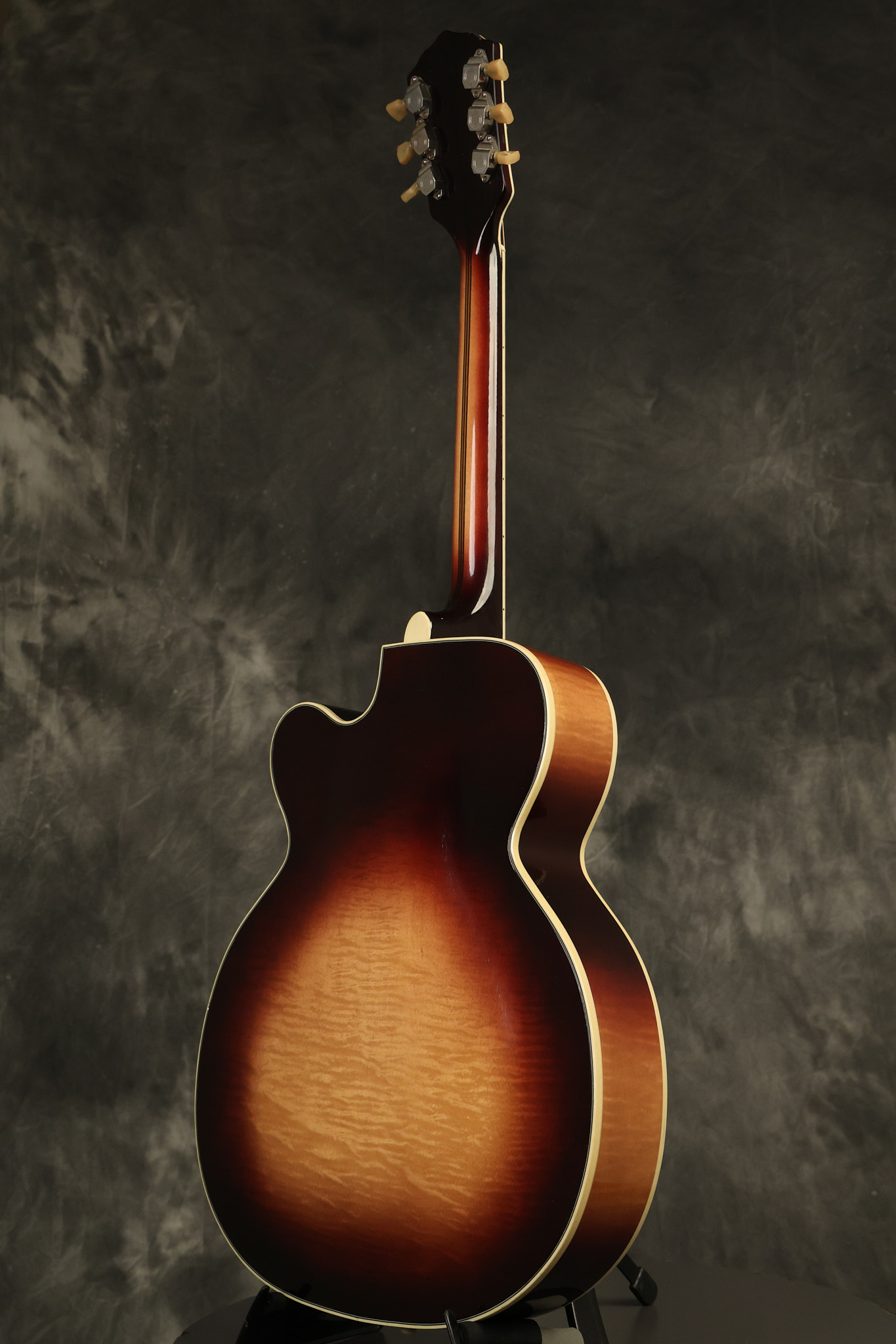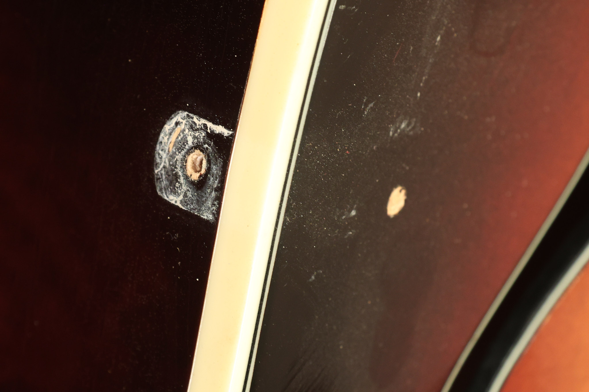 1950's Kay model K21 in its original Sunburst finish on a Spruce top with highly figured maple back + sides. It has a great playing neck with great frets and a big round neck profile. It's all original with the exception of the reproduction pickguard (one addition screw hole concealed by the pickugard). There were two other sets of tuners at one time and have left some extra screw holes which are conceals by the original Kluson Sealfast tuners that have been reinstalled. A nice later hardshell case is included. It's in very good condition with some nicks + dings, extremely minor finish checking and other cosmetic wear. On the back edge of the inside cutaway there is some glue residue seen along with edge of the binding where the a slightly shrunken area of the binding had been reglued. The guitar itself remains structurally sound and sounds great.
