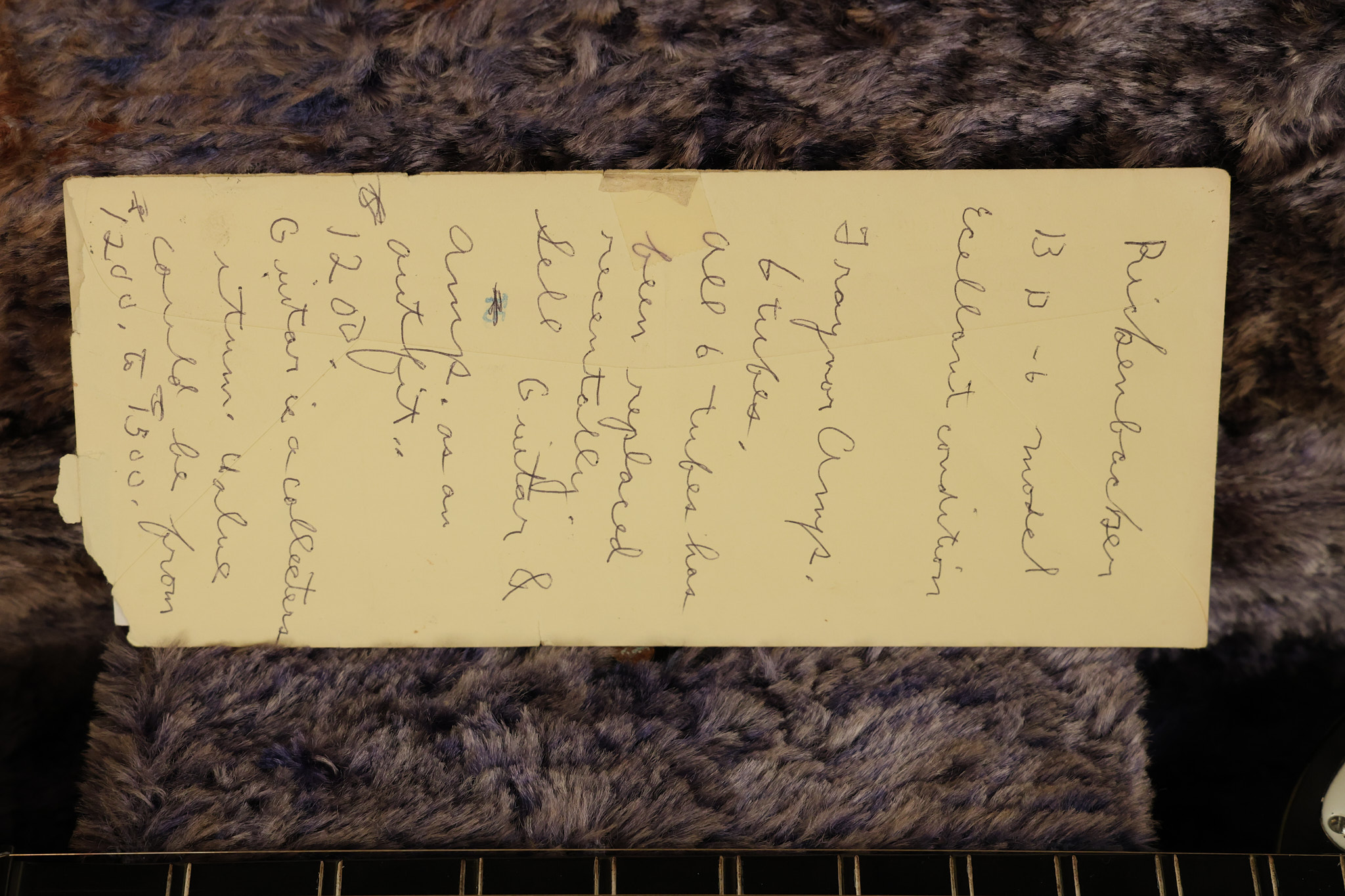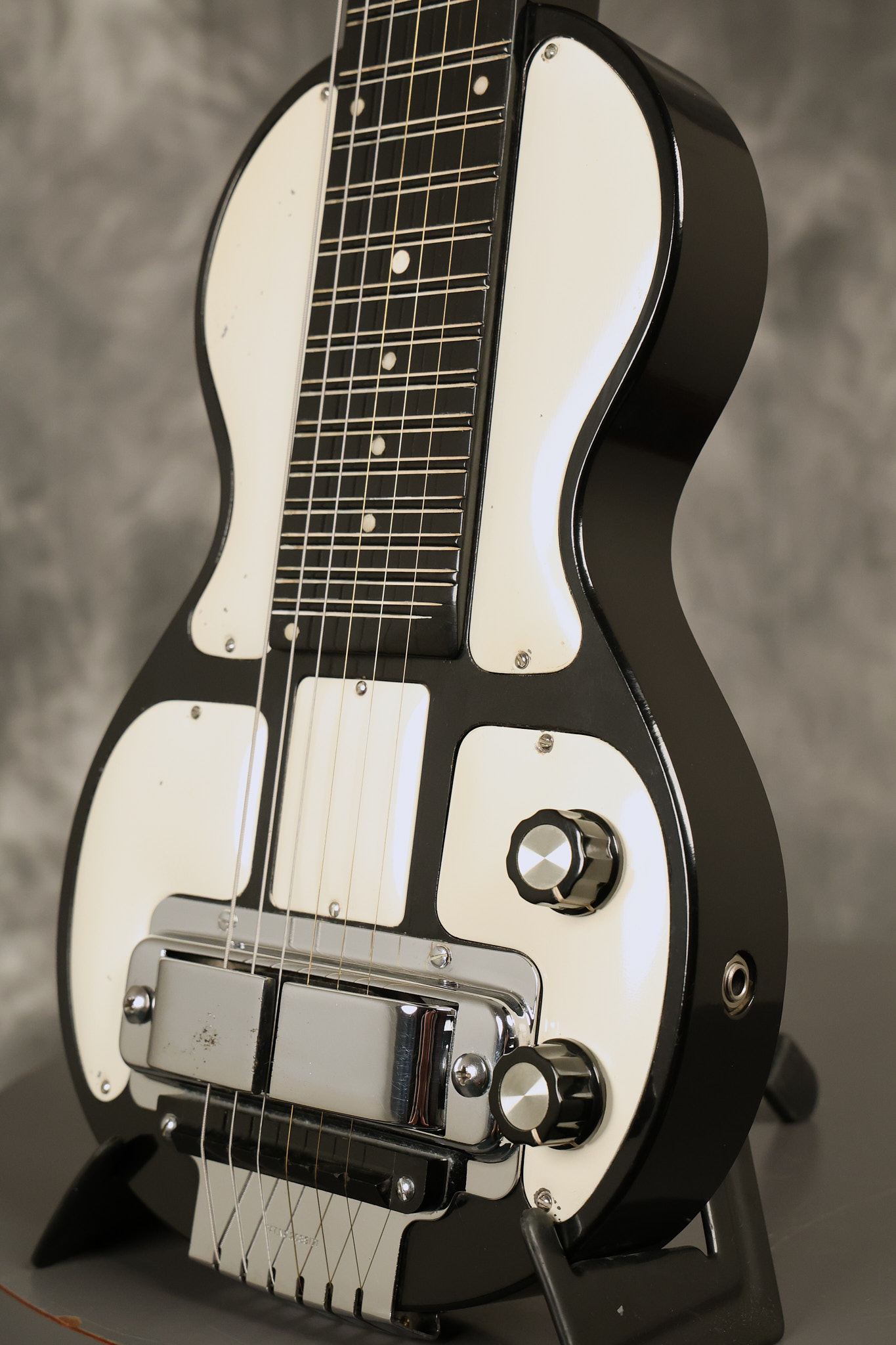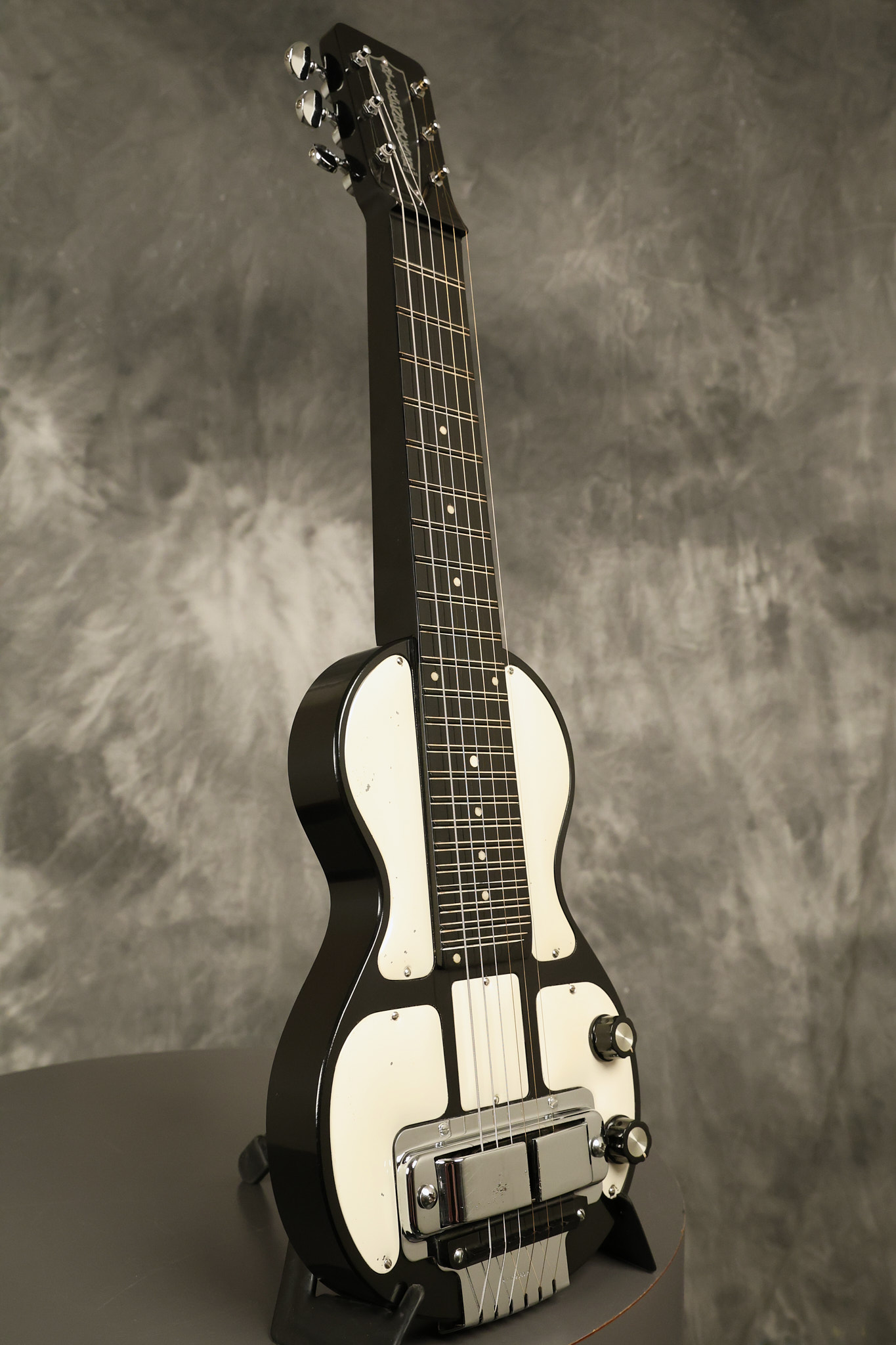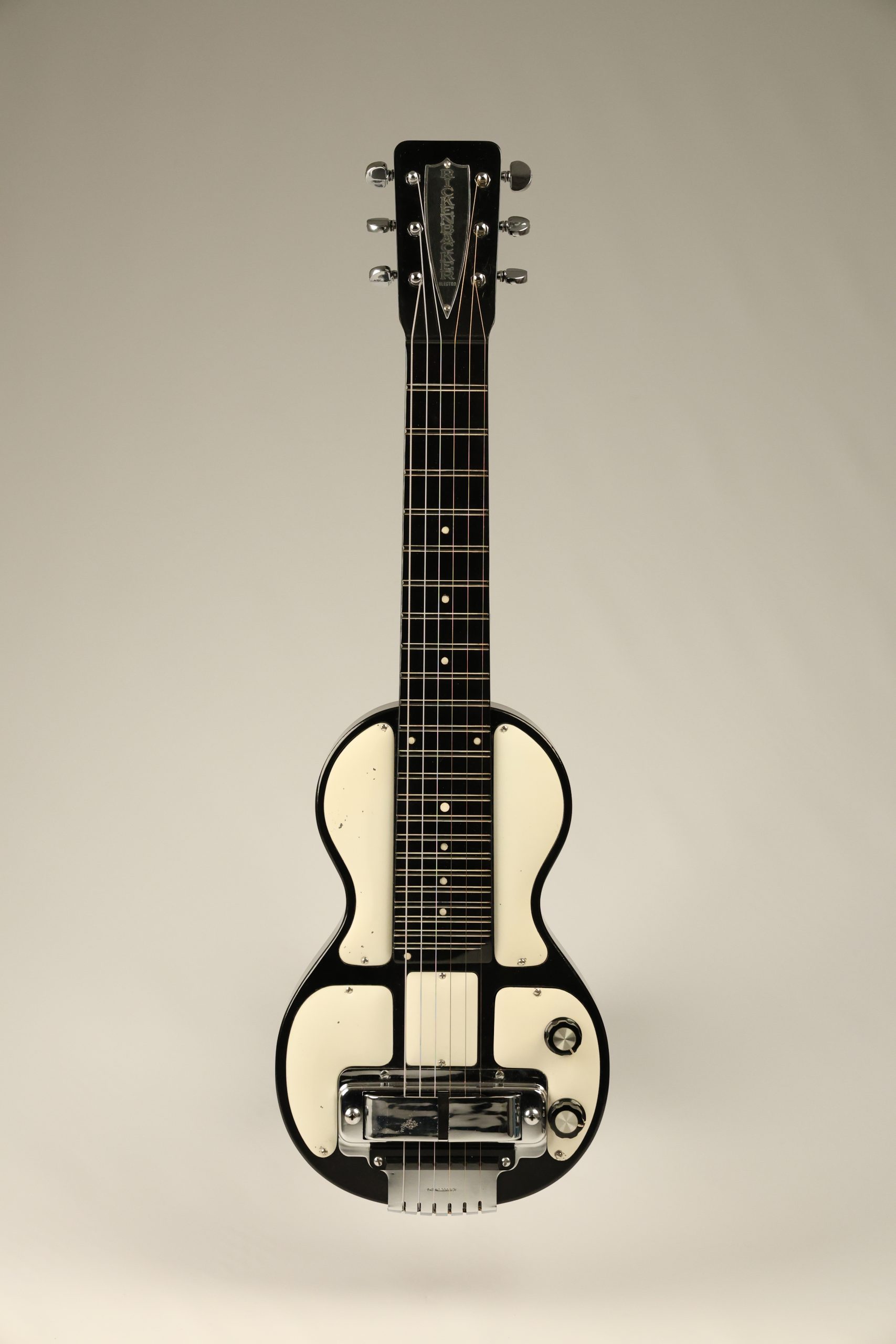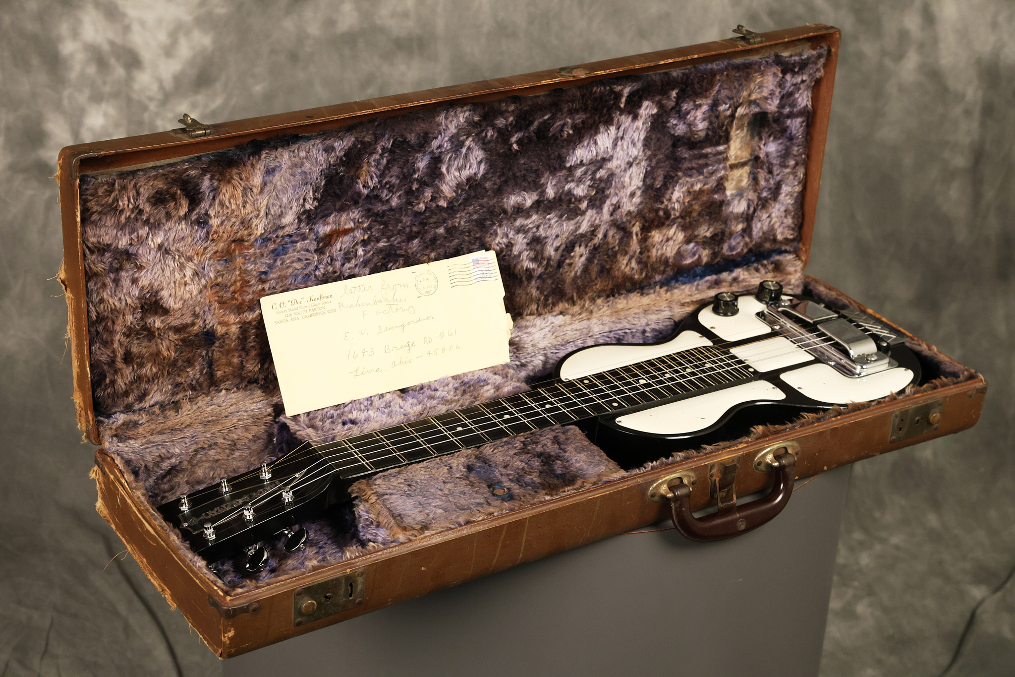 1950's Rickenbacker model B bakelite 6-string lap steel guitar with its original horseshoe pickup. The tuning keys and knobs have been changed. One pot is a new Noble 500K while the other is a CTS dating to 1959. Inside the control cavity, the portion of the bakelite mold with the screw hole on the lower side has a tiny chip out of the side which required a longer screw to properly hold the cover plate down. The original screw is also included. The original hardshell case is also included. This Rickenbacker steel looks good with some nicks + dings and other cosmetic wear as it remains structurally sound. All electronics work and sound great. It includes a letter dating to 1987 from Doc Kauffman to the original owner of this guitar.