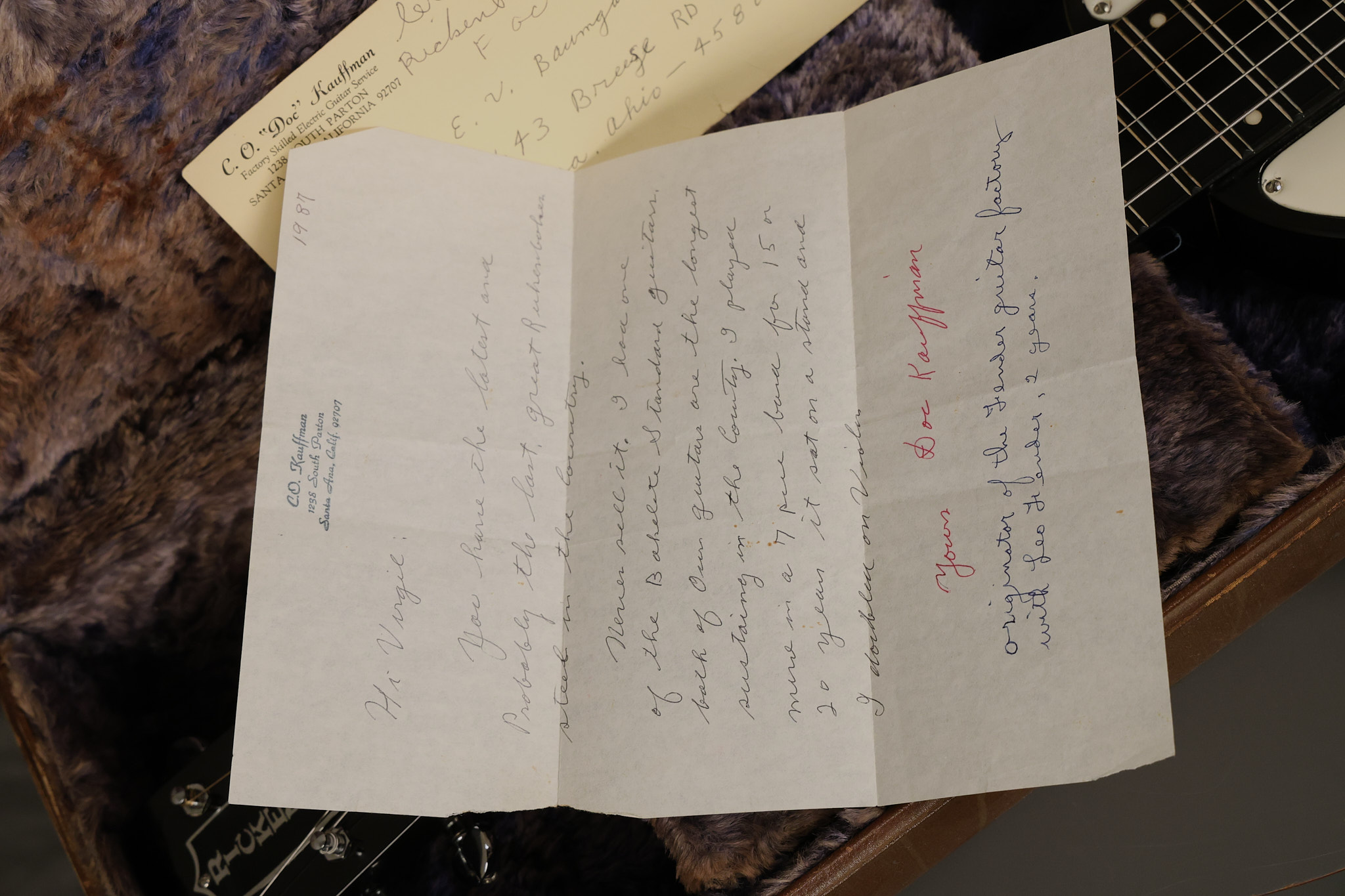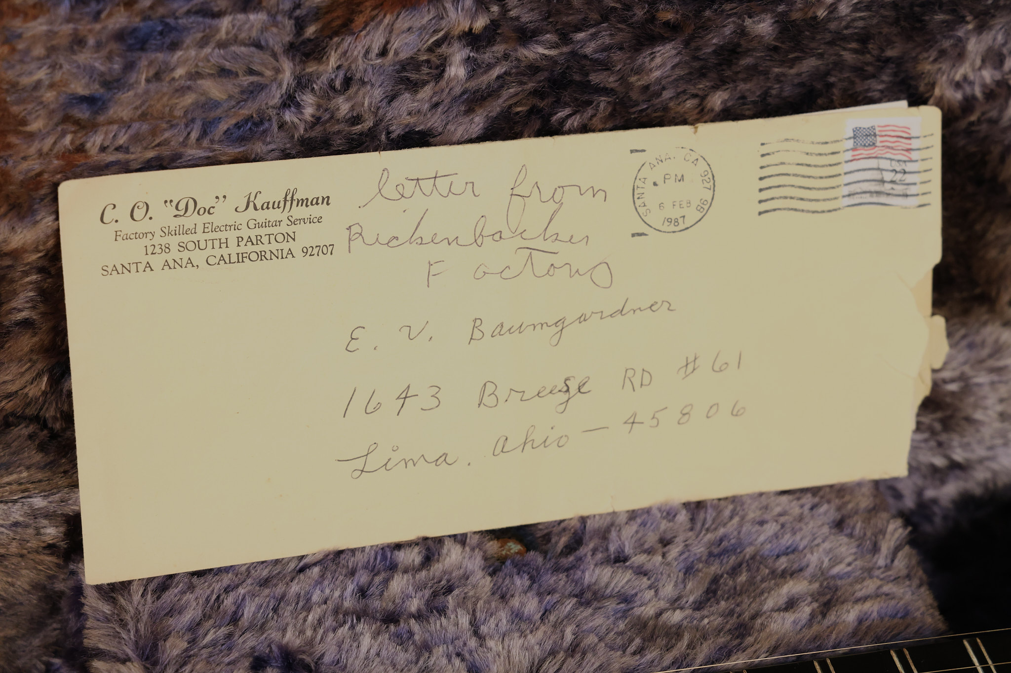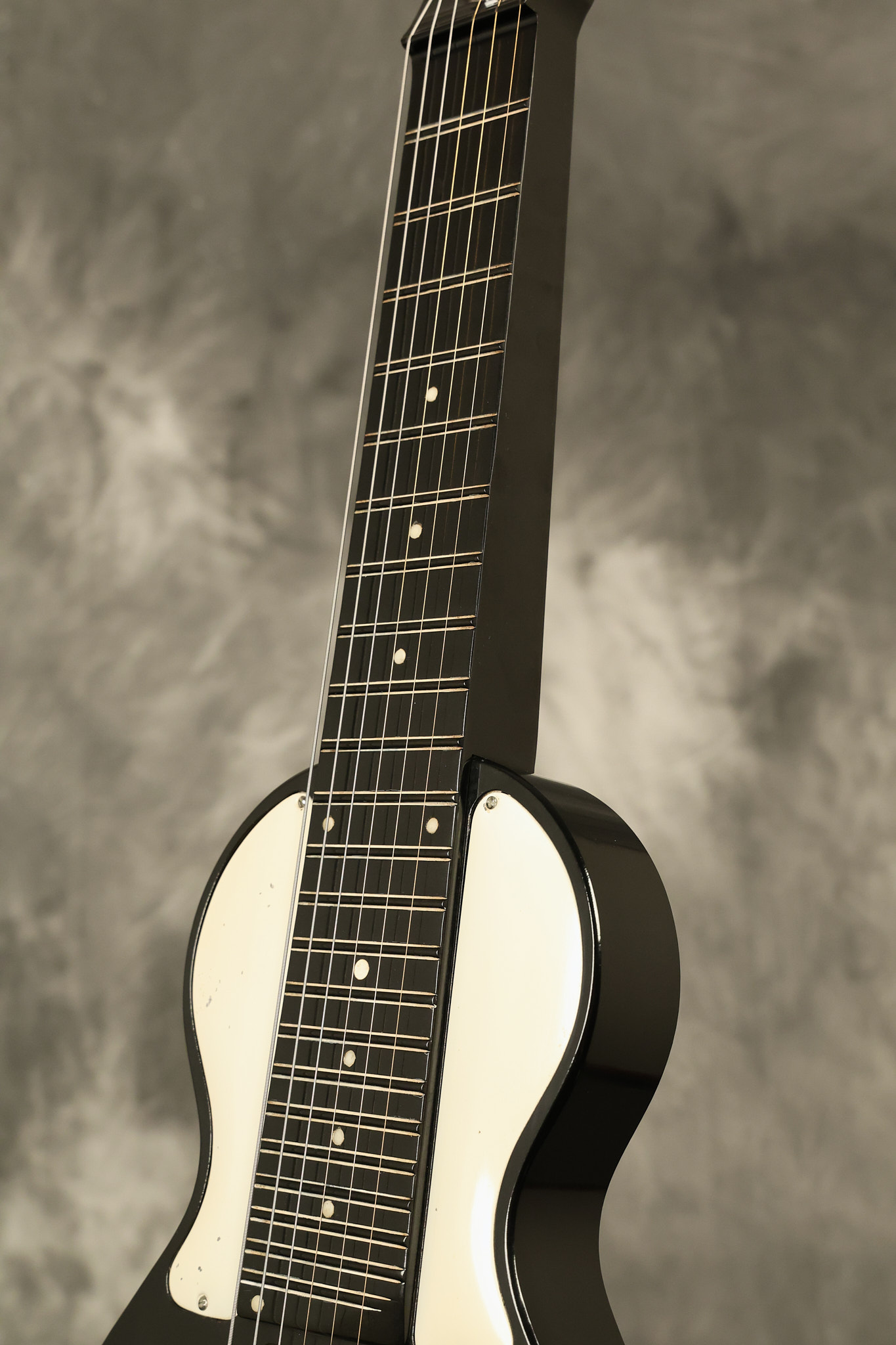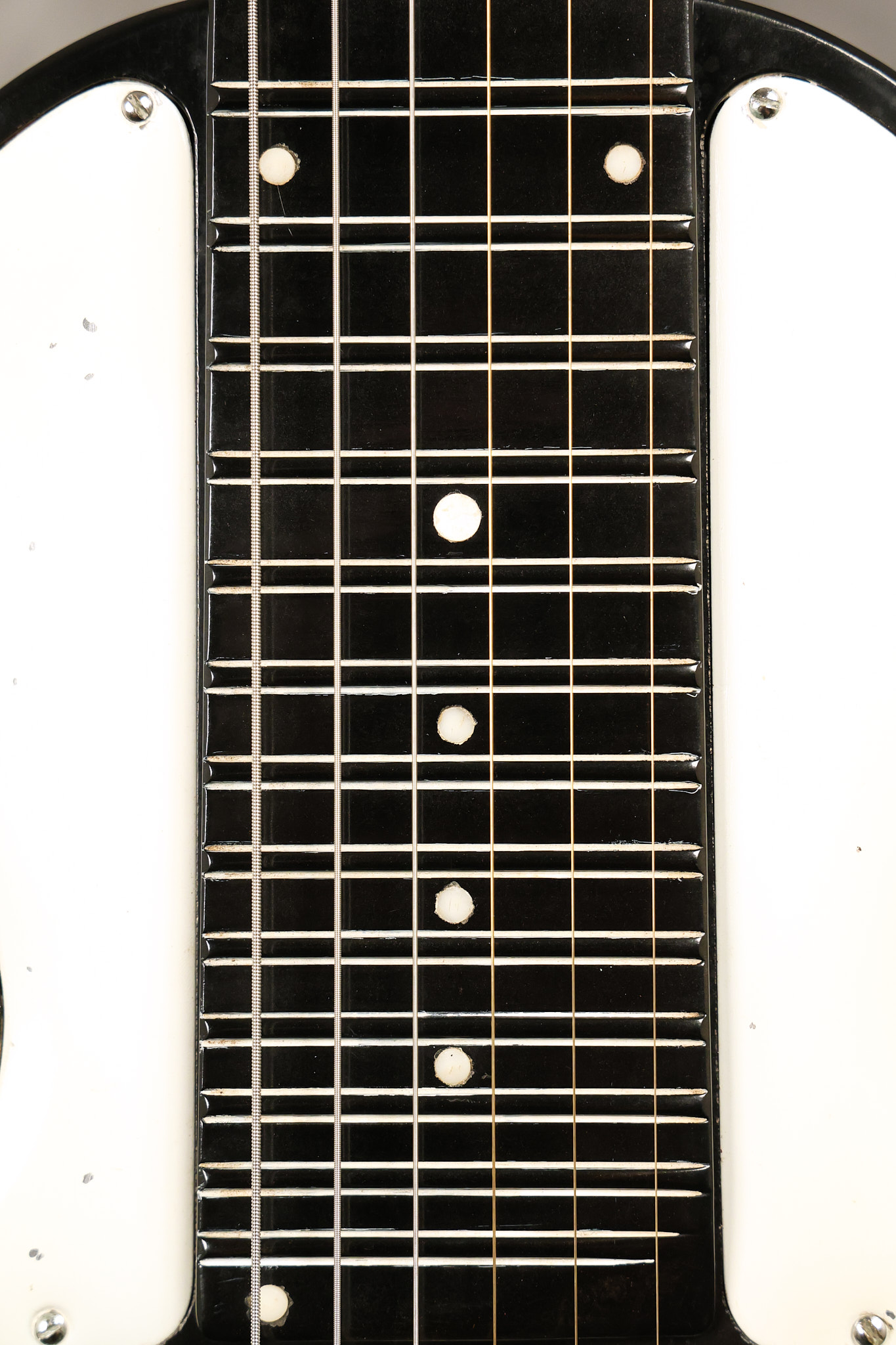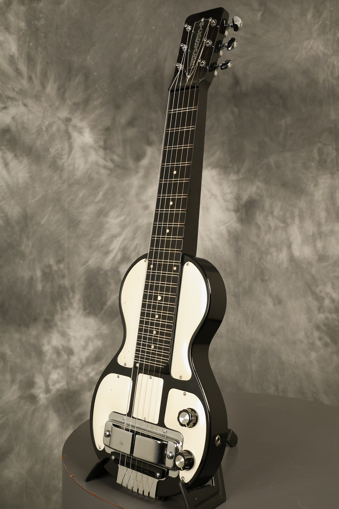 1950's Rickenbacker model B bakelite 6-string lap steel guitar with its original horseshoe pickup. The tuning keys and knobs have been changed. One pot is a new Noble 500K while the other is a CTS dating to 1959. Inside the control cavity, the portion of the bakelite mold with the screw hole on the lower side has a tiny chip out of the side which required a longer screw to properly hold the cover plate down. The original screw is also included. The original hardshell case is also included. This Rickenbacker steel looks good with some nicks + dings and other cosmetic wear as it remains structurally sound. All electronics work and sound great. It includes a letter dating to 1987 from Doc Kauffman to the original owner of this guitar.