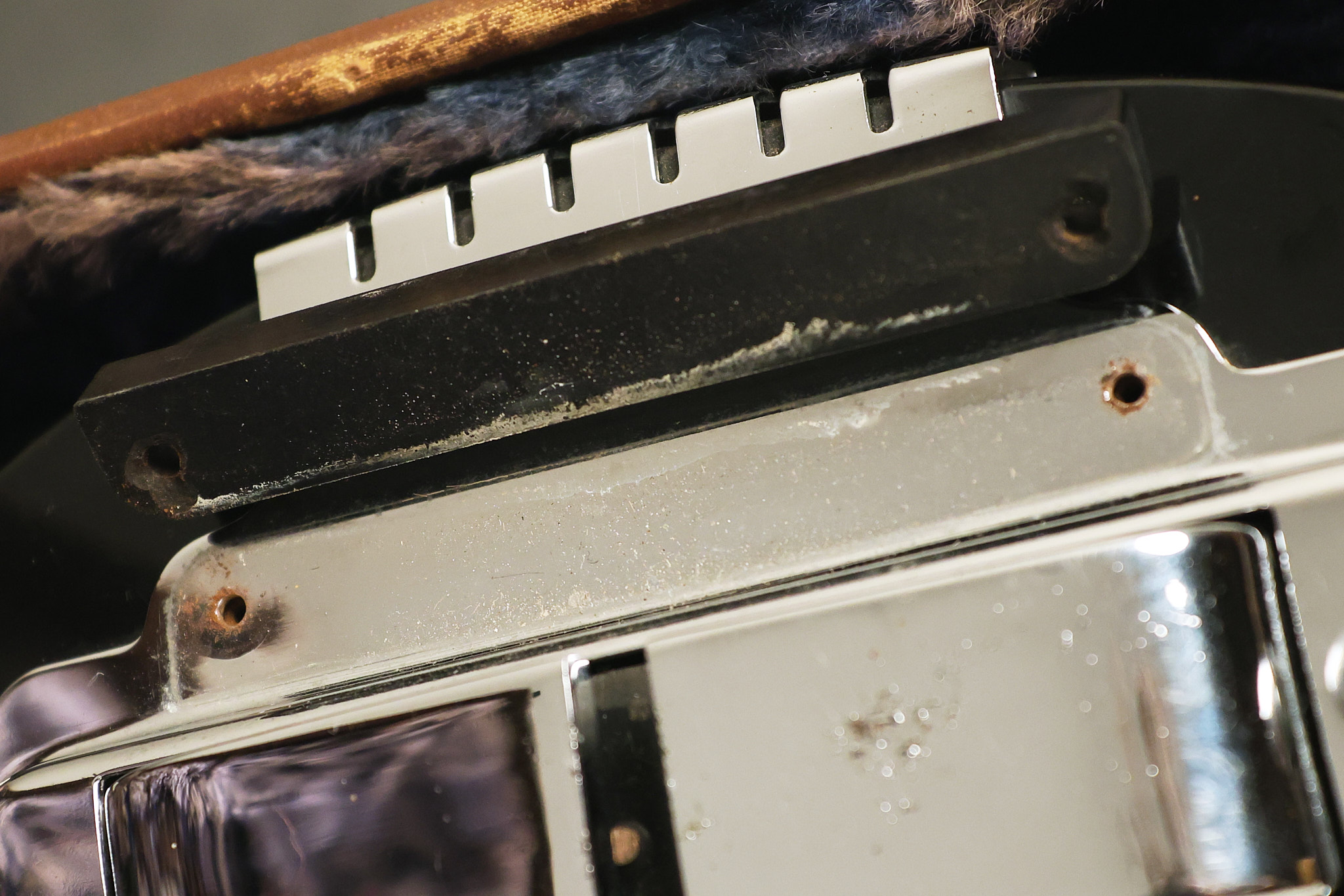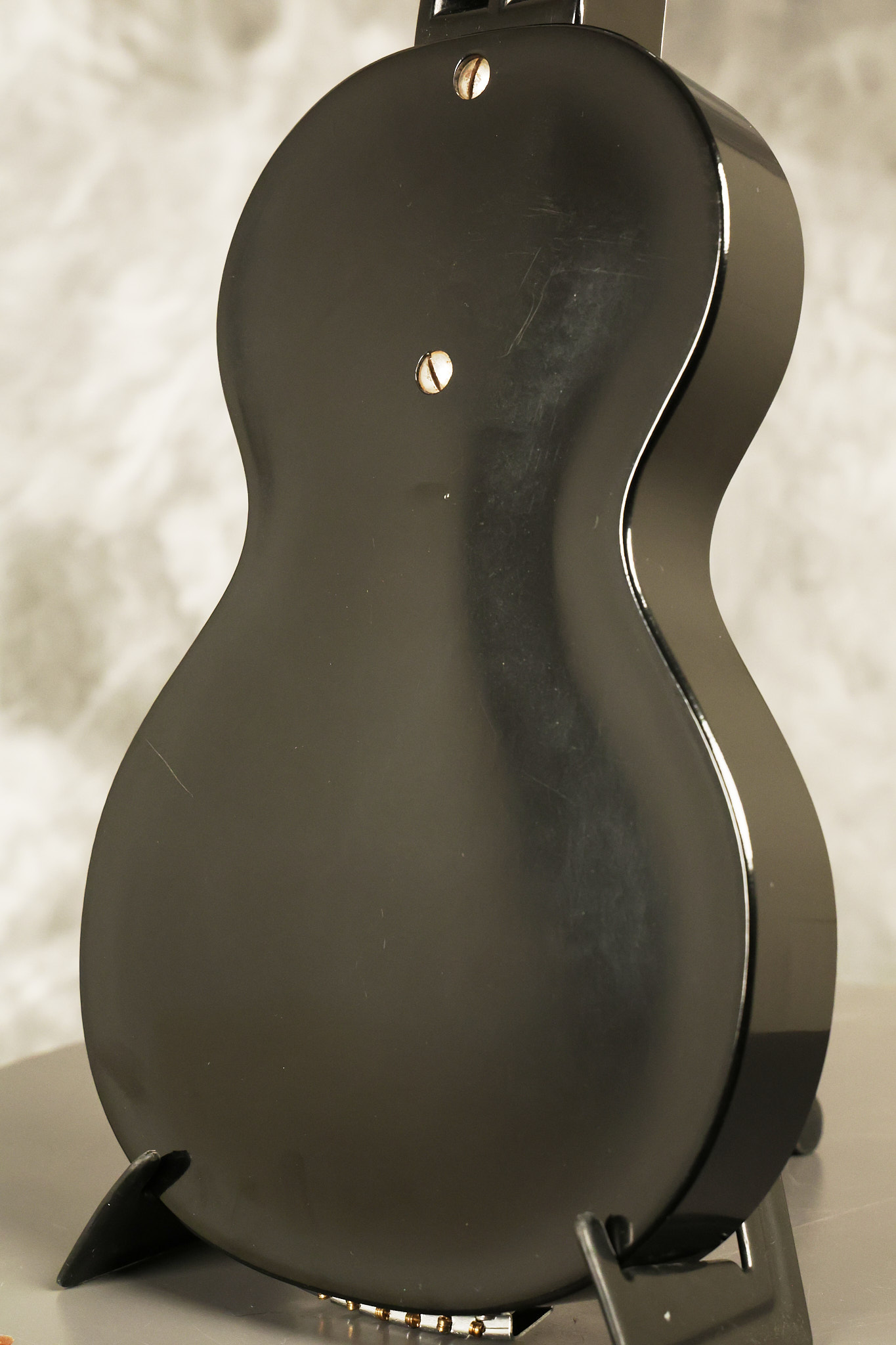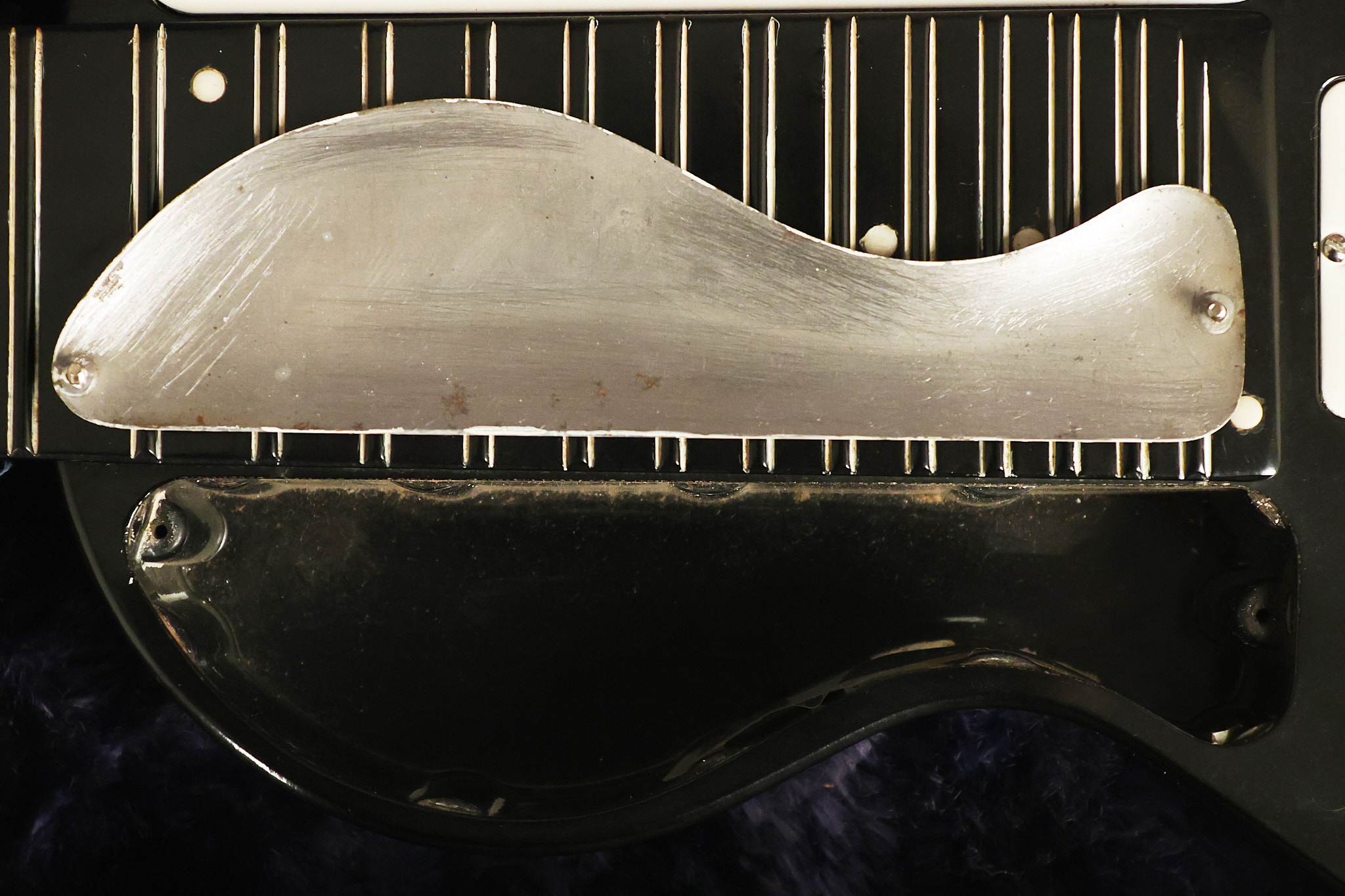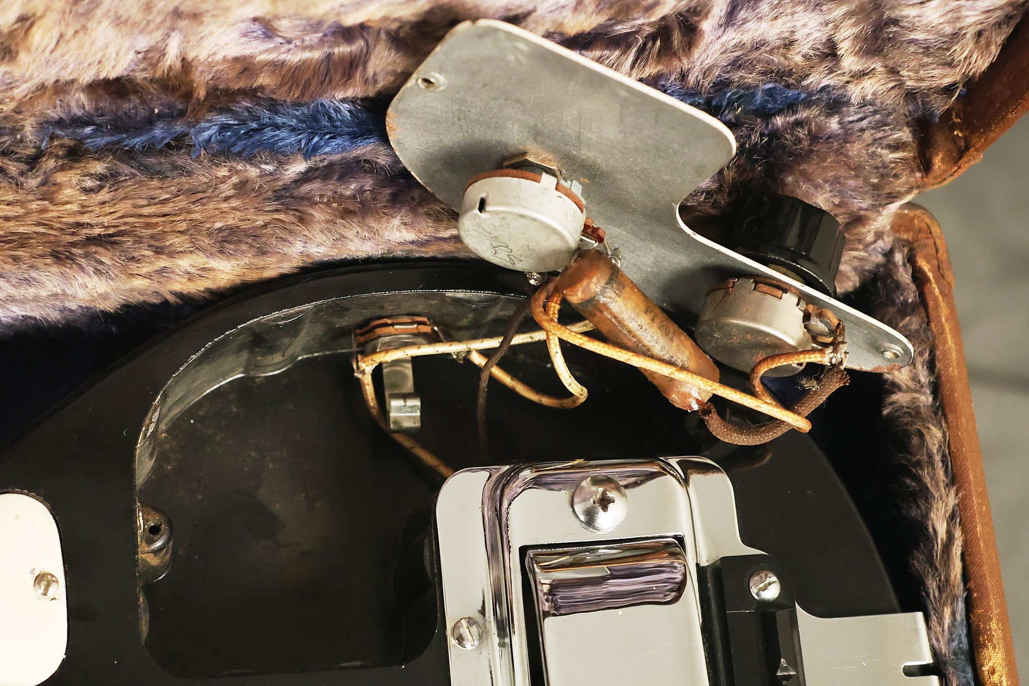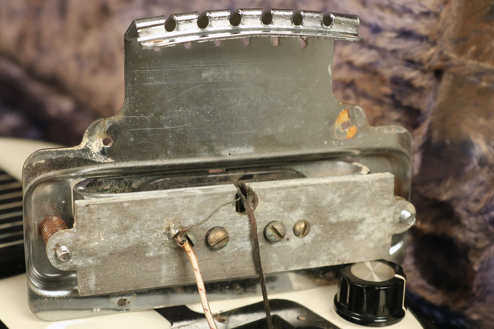 1950's Rickenbacker model B bakelite 6-string lap steel guitar with its original horseshoe pickup. The tuning keys and knobs have been changed. One pot is a new Noble 500K while the other is a CTS dating to 1959. Inside the control cavity, the portion of the bakelite mold with the screw hole on the lower side has a tiny chip out of the side which required a longer screw to properly hold the cover plate down. The original screw is also included. The original hardshell case is also included. This Rickenbacker steel looks good with some nicks + dings and other cosmetic wear as it remains structurally sound. All electronics work and sound great. It includes a letter dating to 1987 from Doc Kauffman to the original owner of this guitar.
