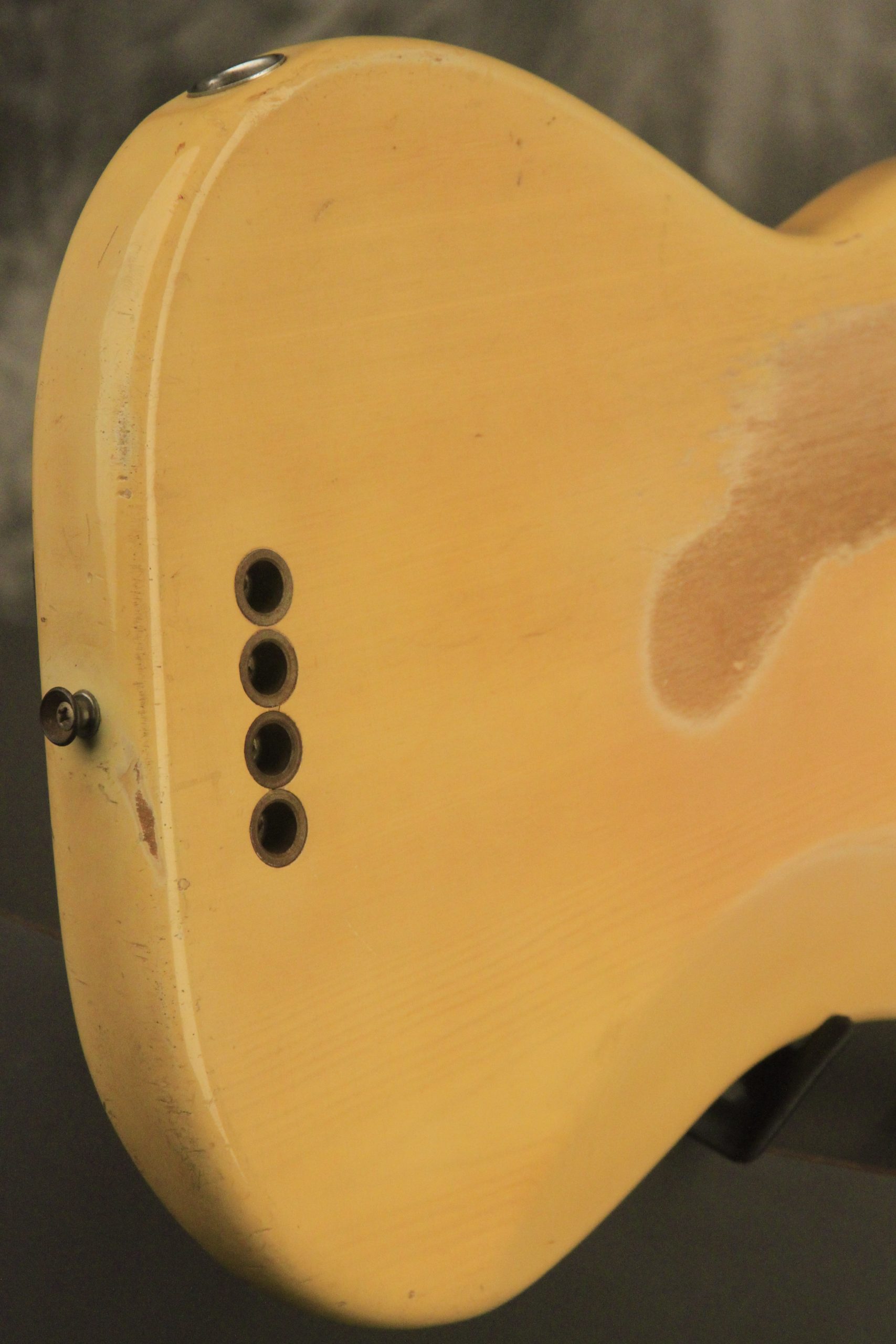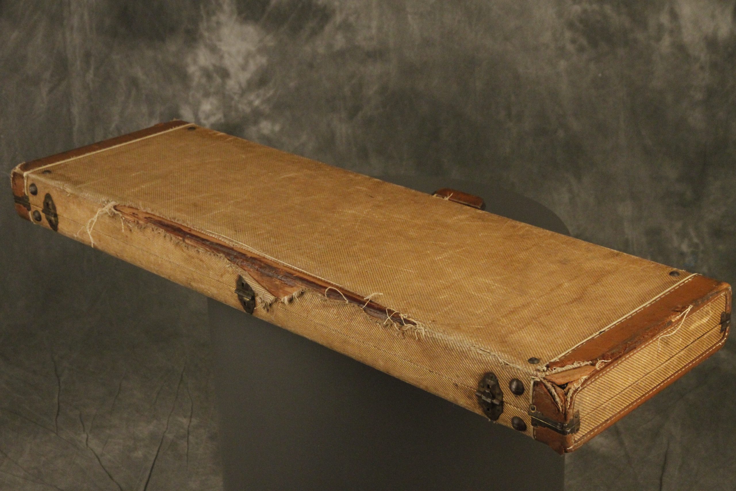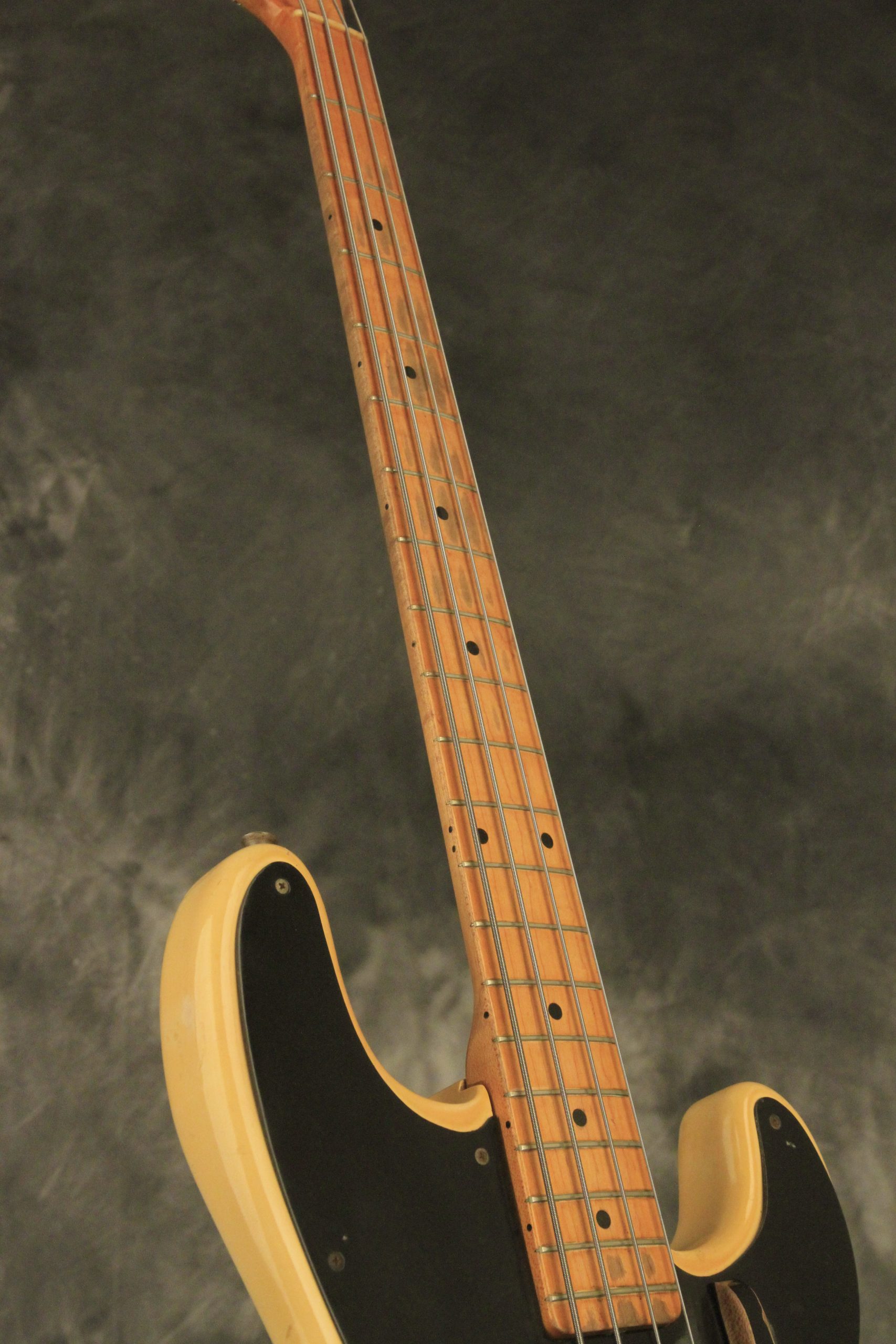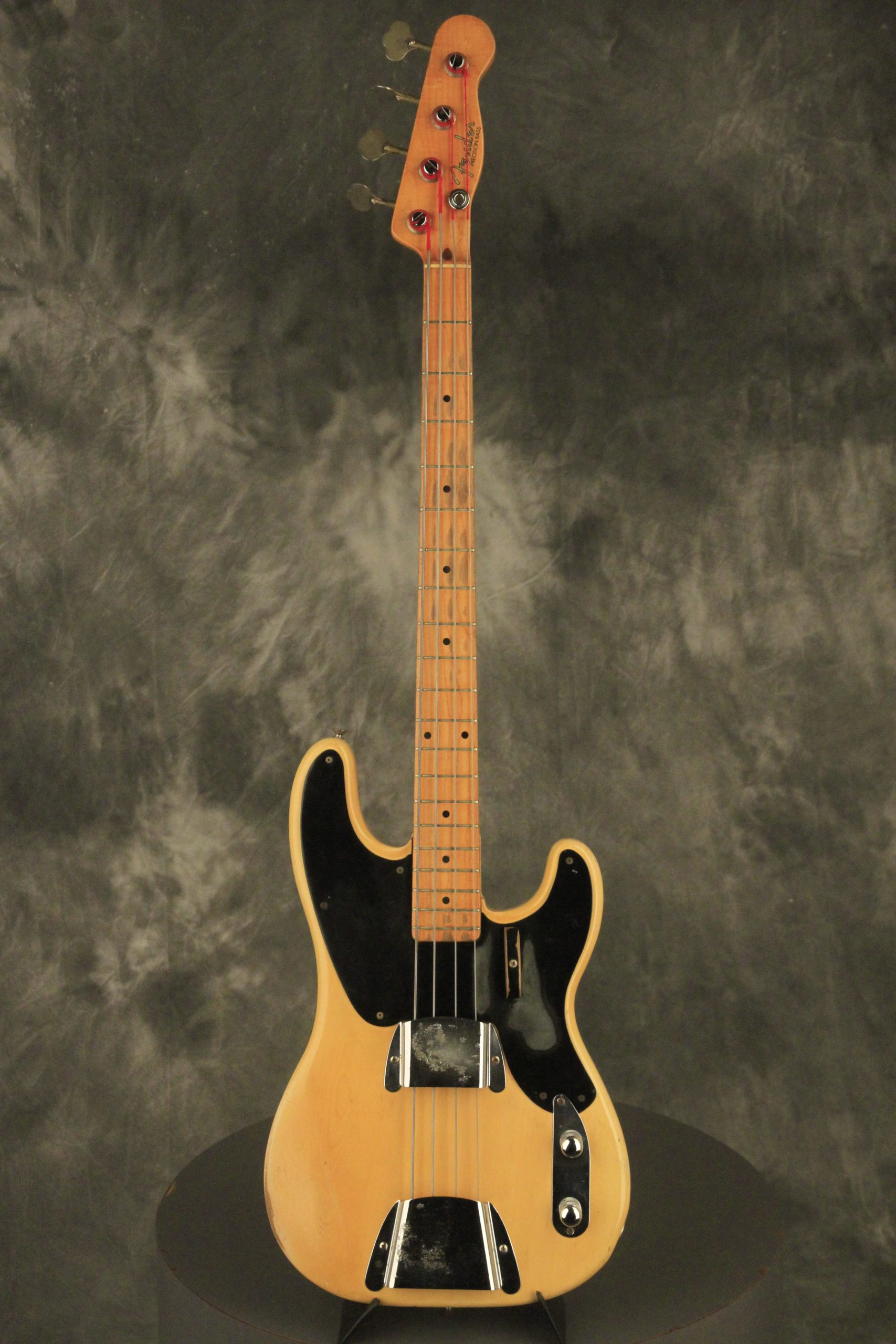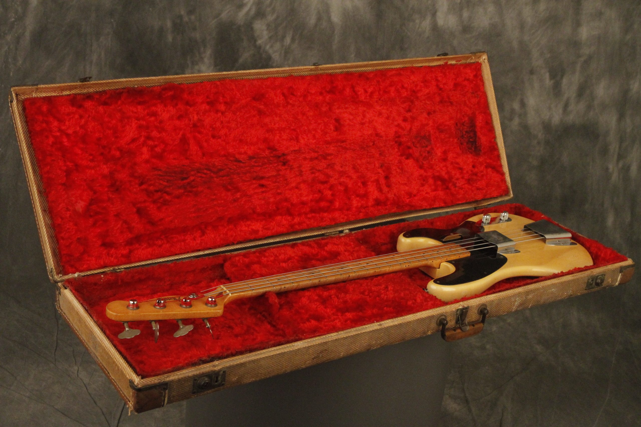 1955 Fender Precision Bass in its original Blonde finish. It has a great playing neck with great frets. It's all original with the exception of one changed pot, an added ground wire and a screw holding the jack cup in place. Aside from the cloth covering being removed from the pickup, it's 100% complete along with both original covers and the original tweed hardshell case. It looks great with nicks + dings, a naturally worn warped pickguard, light finish checking and a lot of play wear. Everything remains structurally sound with no cracks, breaks or repairs. All electronics work and sound great as it provides an authentic early P-Bass tone. The weight is 8 lbs. 3.6 oz.
