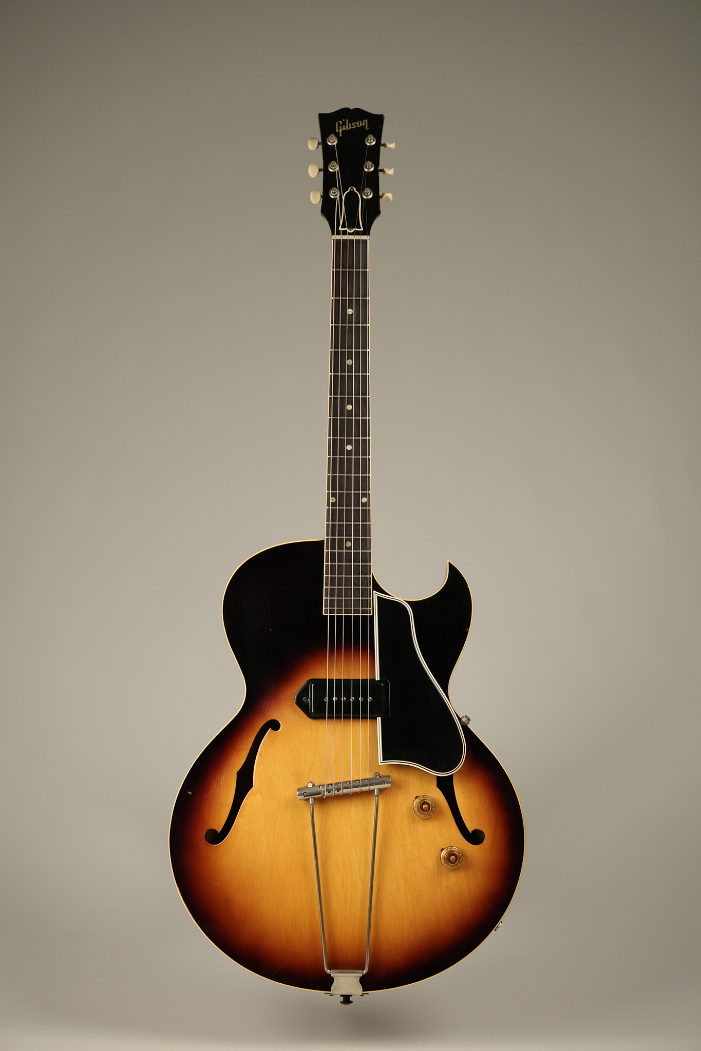 1956 Gibson ES-225 T in its original Sunburst finish. It has a great playing neck with worn, but good frets. The low E buzzes against the surface of the pickup on the last/highest fret. It's all original with the exception of the strap buttons, the buttons for the tuning keys and the screw and outer nut for the pickguard bracket. It's also 100% complete along with its original Brown hardshell case. This 225 looks great and has lots of nicks + dings with several being on the back of the neck near the 7th-10th fret area. There is a surface crack on the back of the body near the bass side edge of the lower bout along with lots of finish checking and other cosmetic wear. These are all cosmetic issues as everything remains structurally sound. All electronics work and sound great with its original P-90.