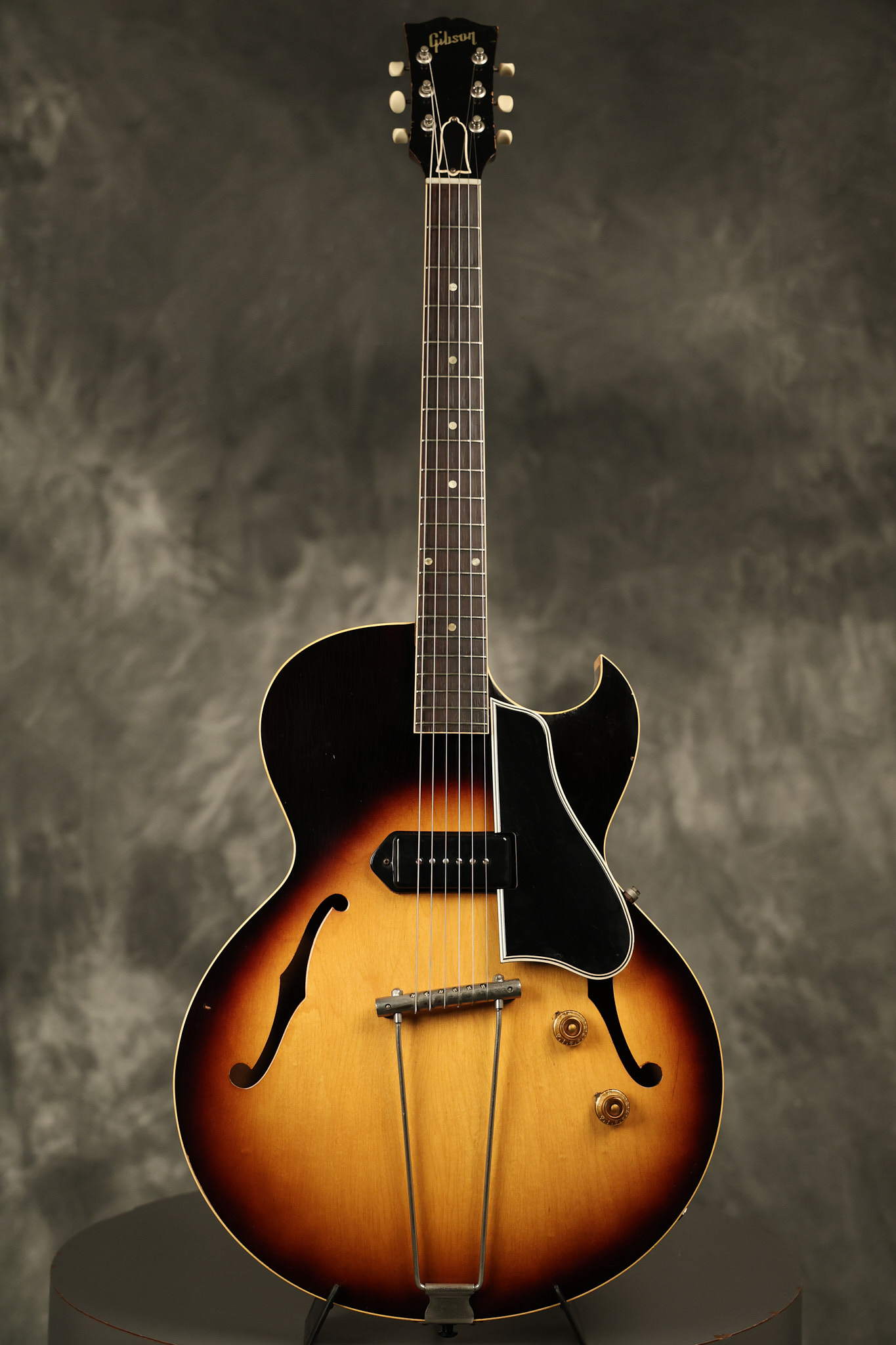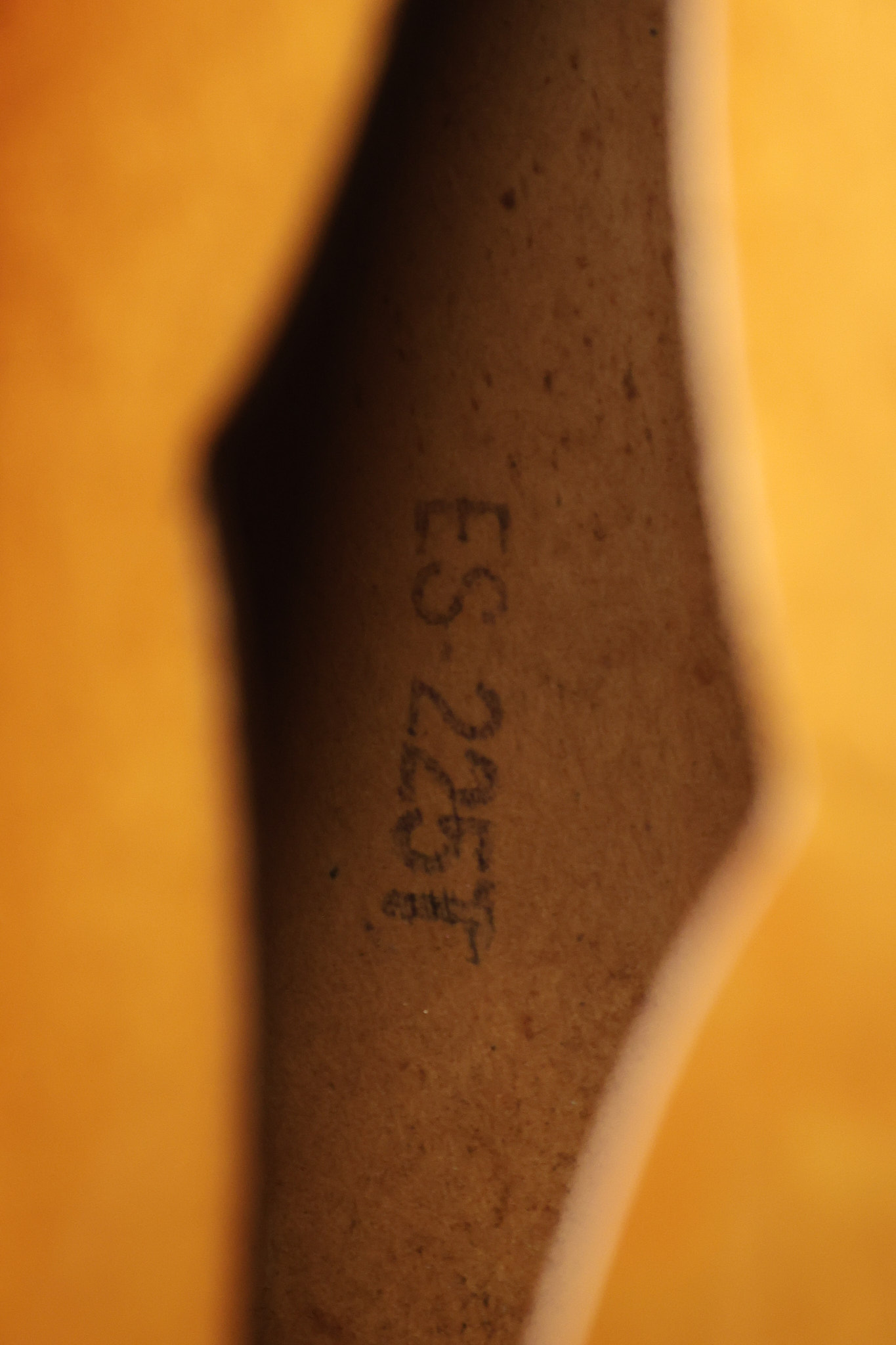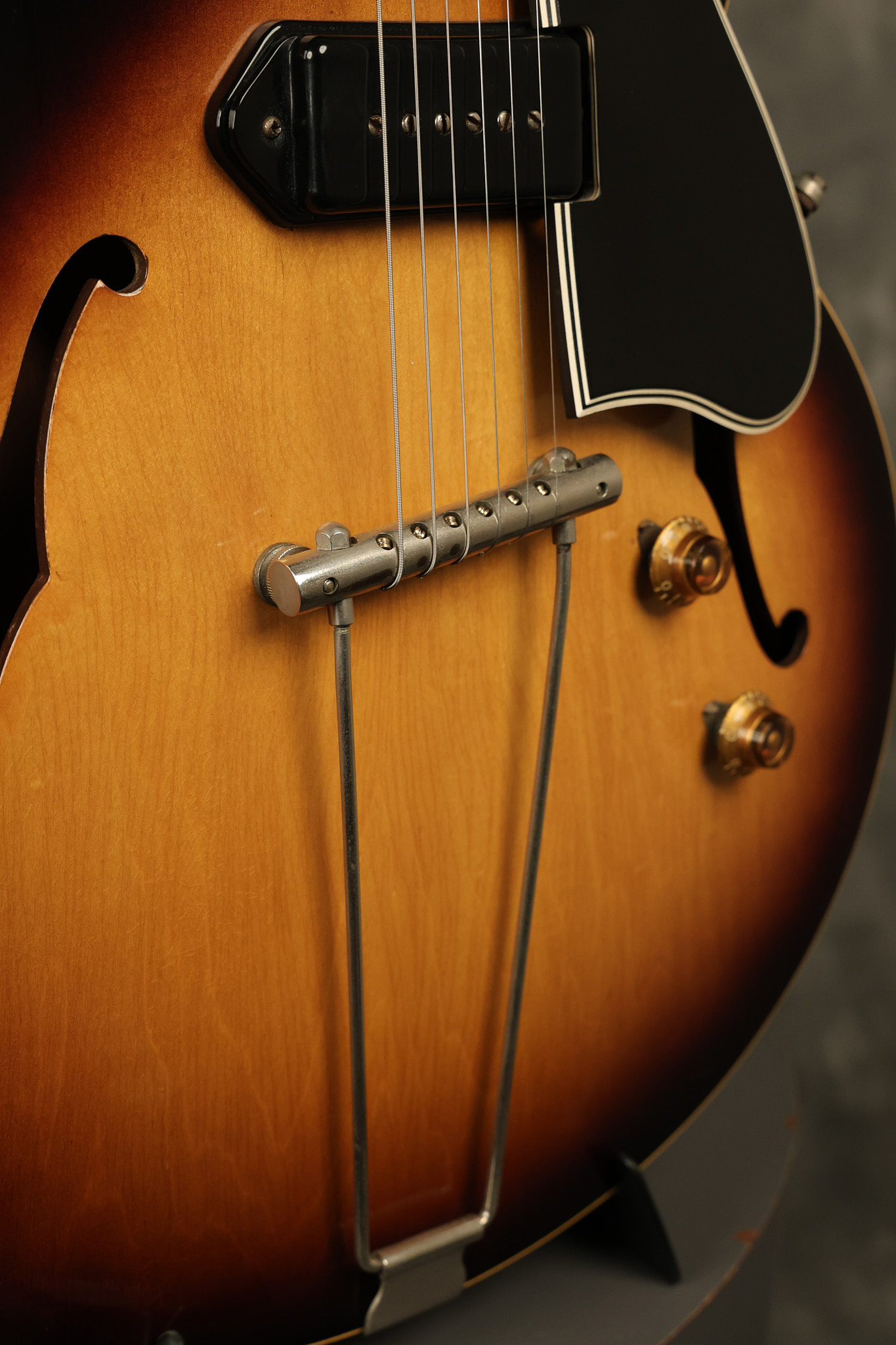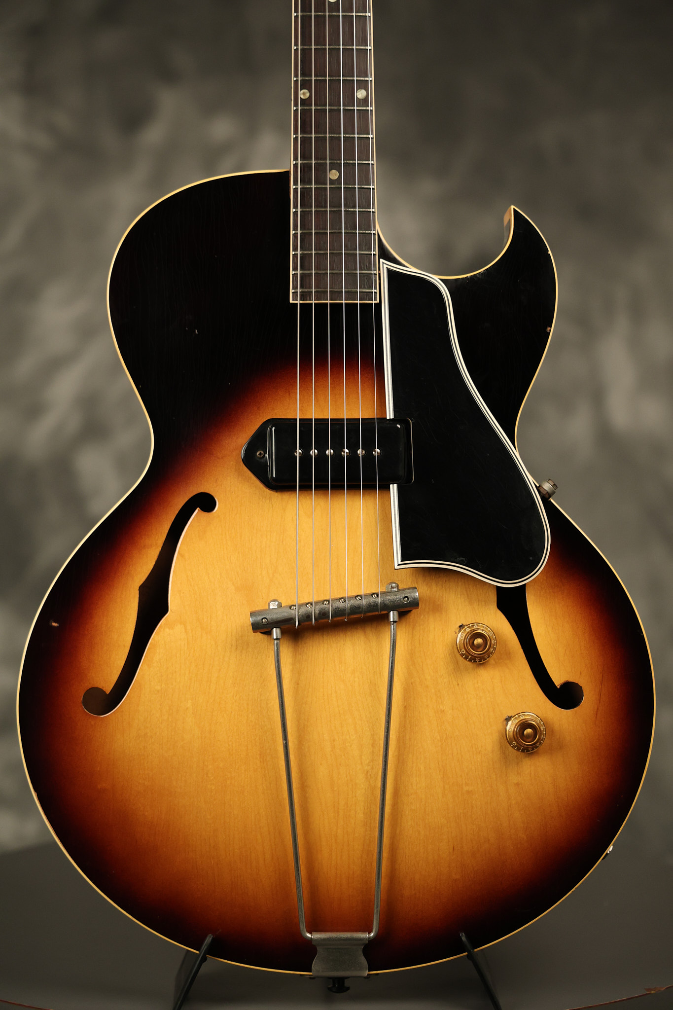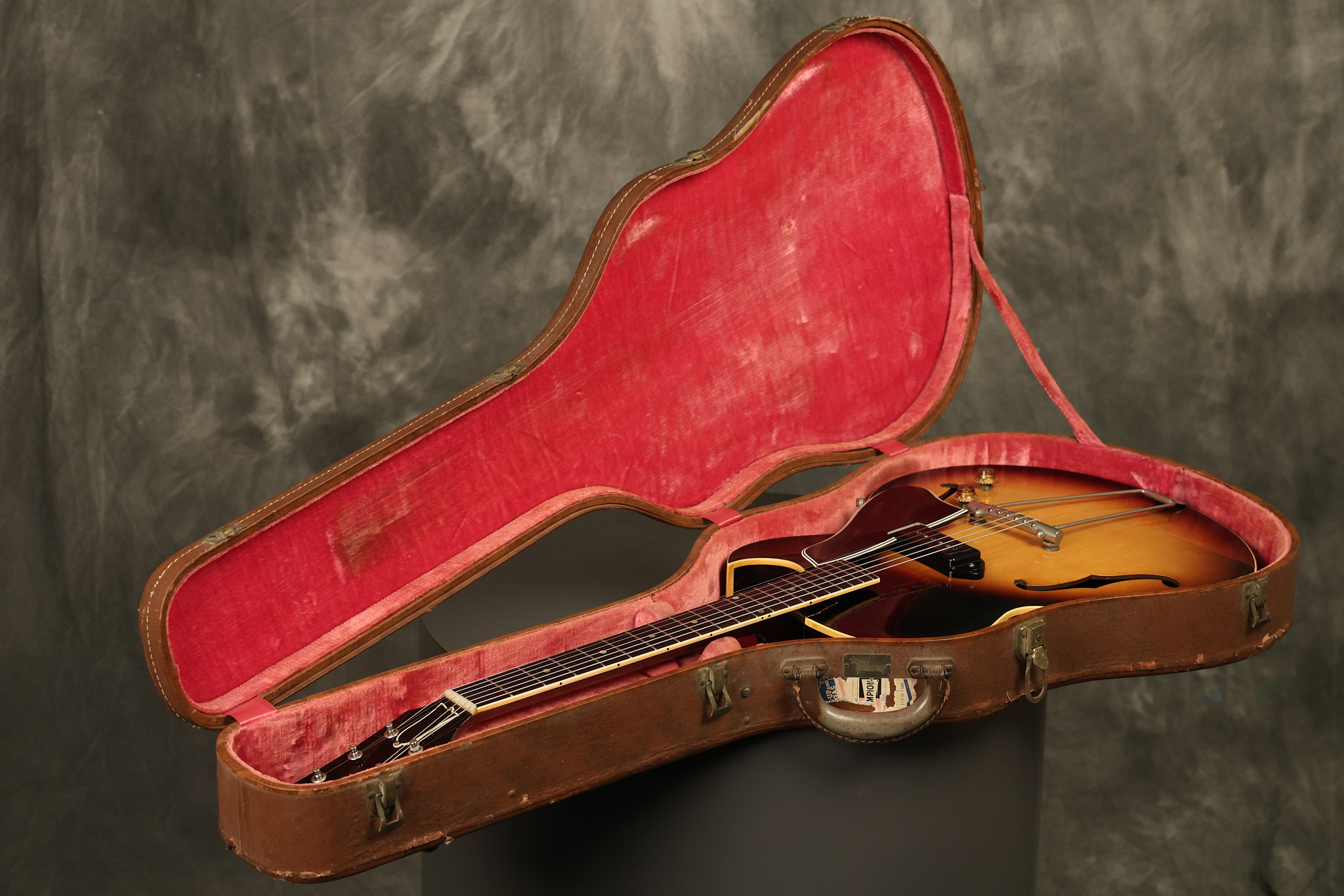 1956 Gibson ES-225 T in its original Sunburst finish. It has a great playing neck with worn, but good frets. The low E buzzes against the surface of the pickup on the last/highest fret. It's all original with the exception of the strap buttons, the buttons for the tuning keys and the screw and outer nut for the pickguard bracket. It's also 100% complete along with its original Brown hardshell case. This 225 looks great and has lots of nicks + dings with several being on the back of the neck near the 7th-10th fret area. There is a surface crack on the back of the body near the bass side edge of the lower bout along with lots of finish checking and other cosmetic wear. These are all cosmetic issues as everything remains structurally sound. All electronics work and sound great with its original P-90.