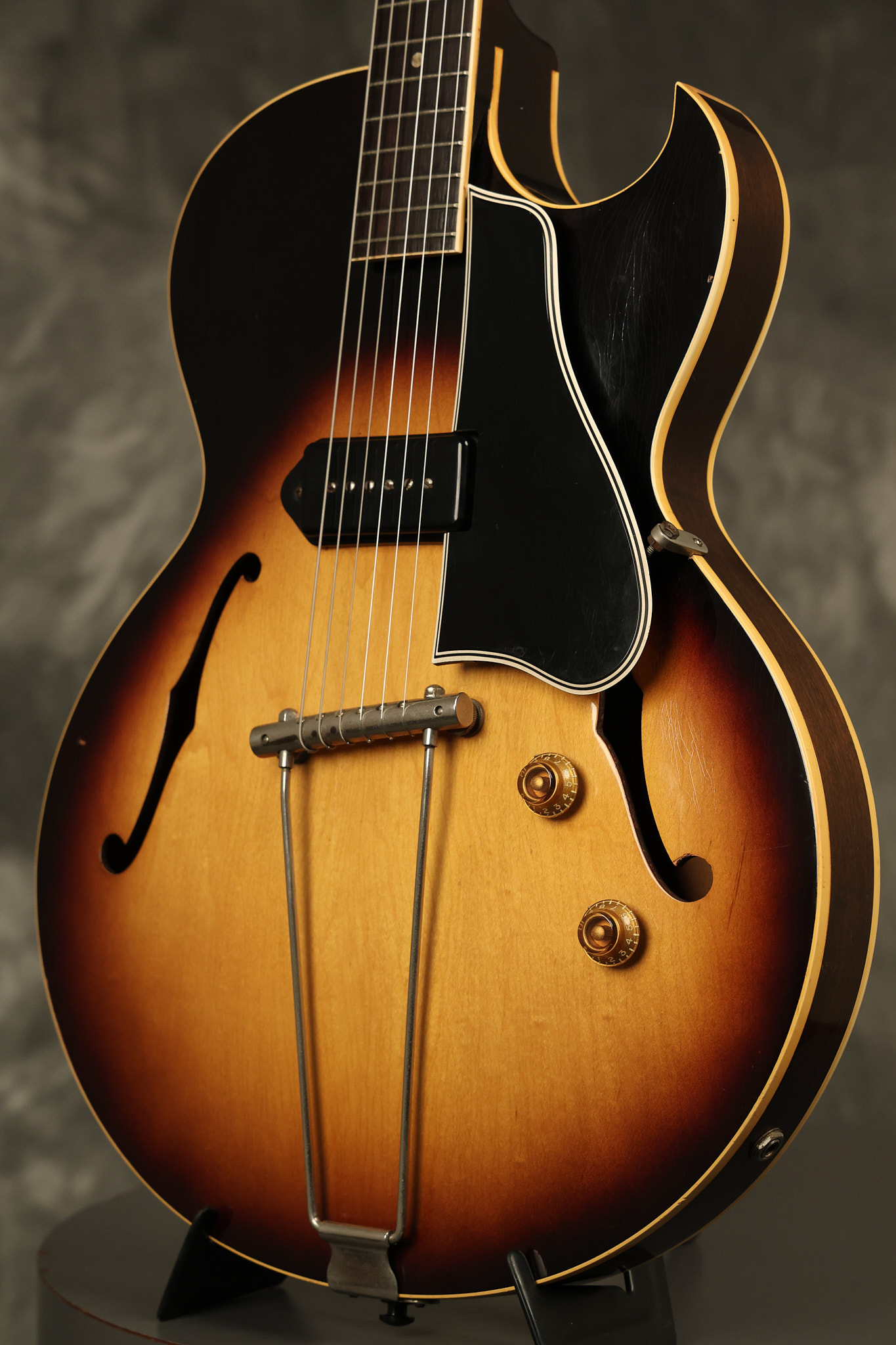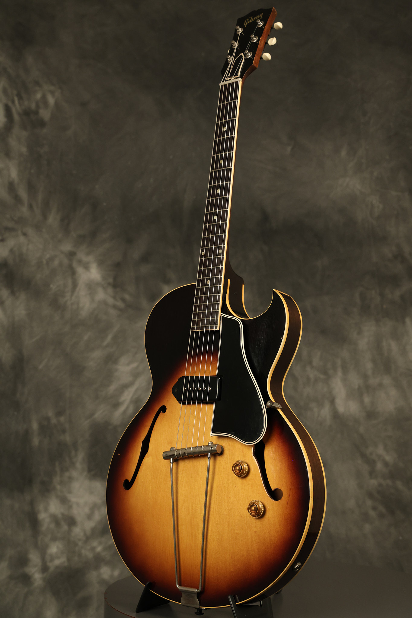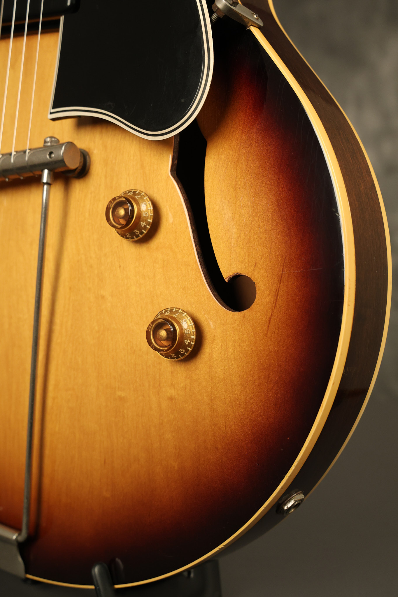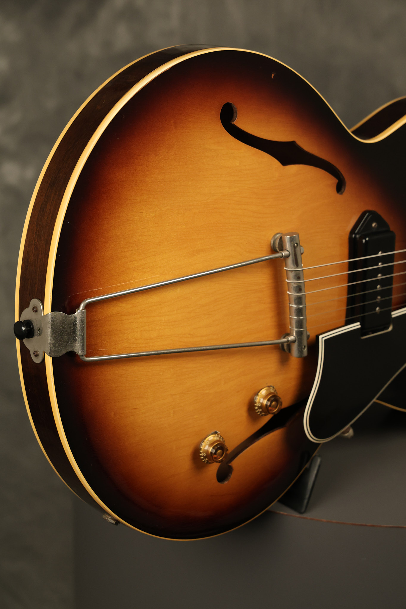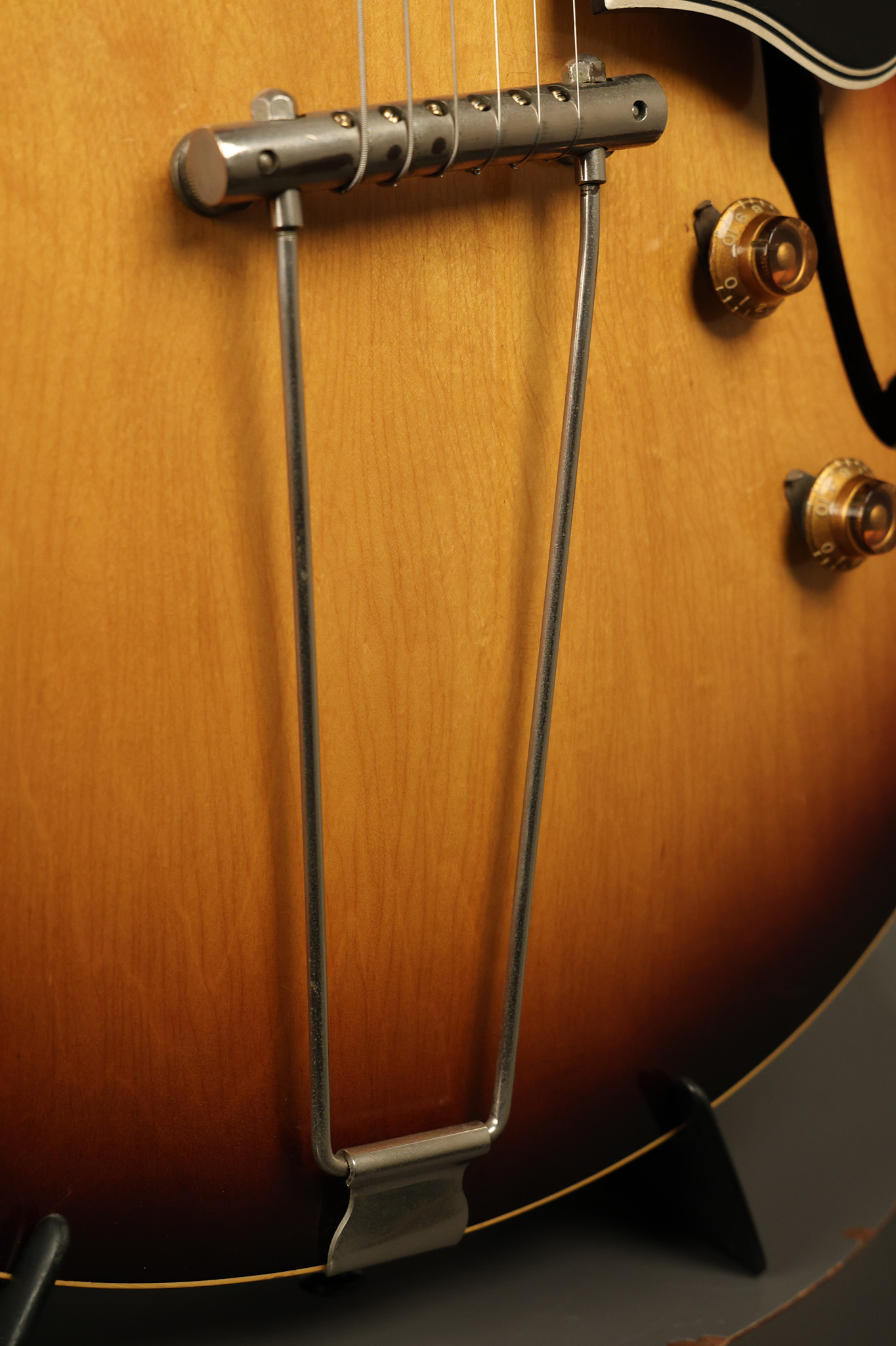 1956 Gibson ES-225 T in its original Sunburst finish. It has a great playing neck with worn, but good frets. The low E buzzes against the surface of the pickup on the last/highest fret. It's all original with the exception of the strap buttons, the buttons for the tuning keys and the screw and outer nut for the pickguard bracket. It's also 100% complete along with its original Brown hardshell case. This 225 looks great and has lots of nicks + dings with several being on the back of the neck near the 7th-10th fret area. There is a surface crack on the back of the body near the bass side edge of the lower bout along with lots of finish checking and other cosmetic wear. These are all cosmetic issues as everything remains structurally sound. All electronics work and sound great with its original P-90.