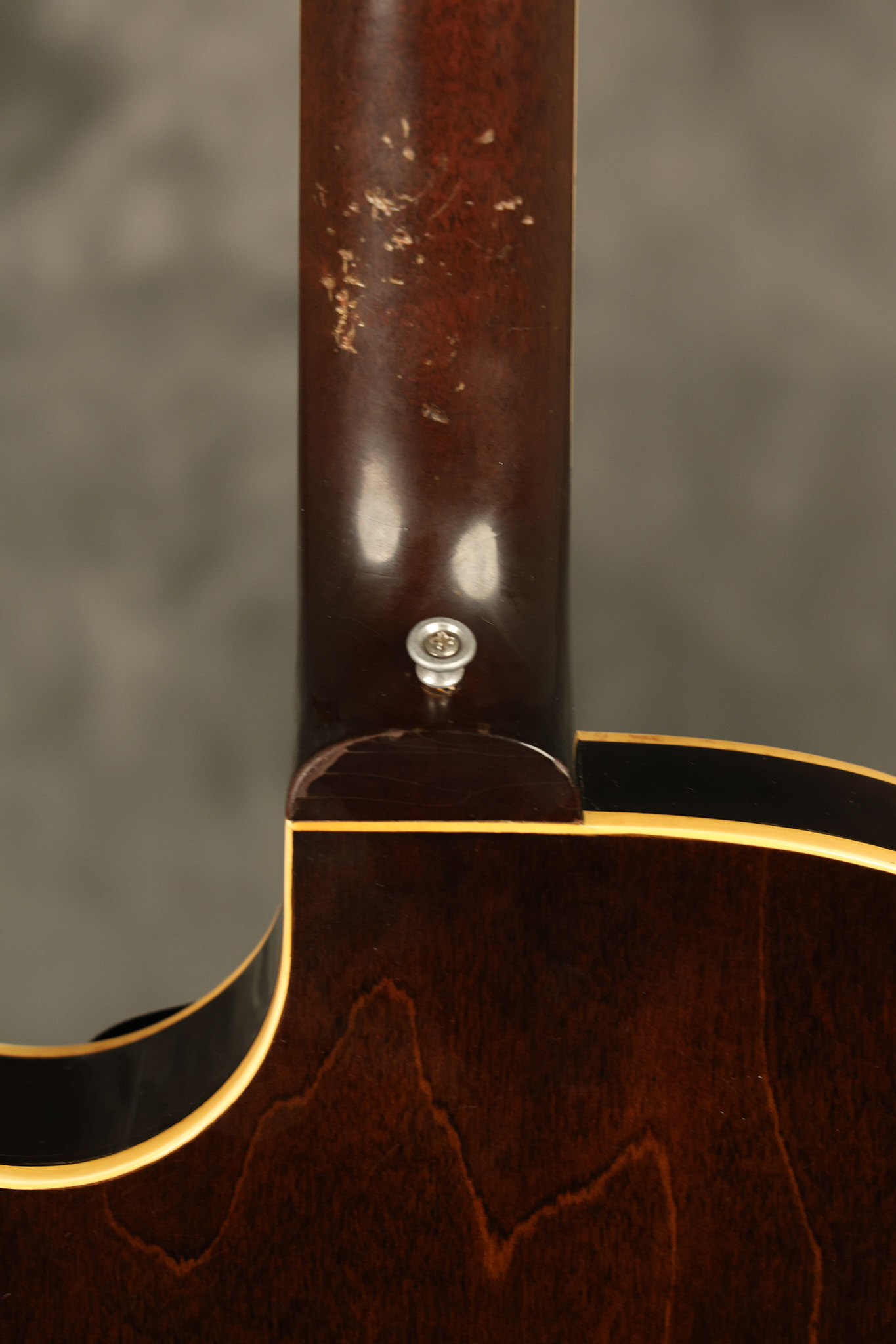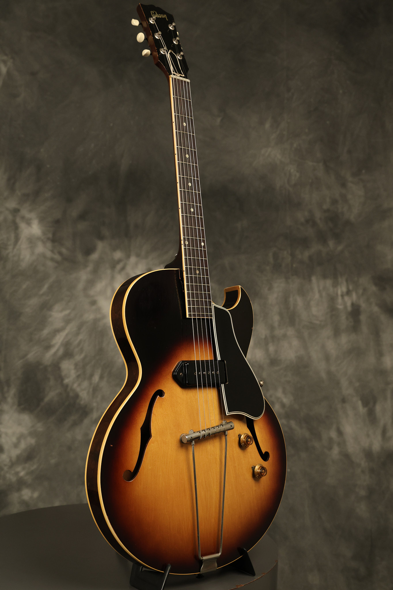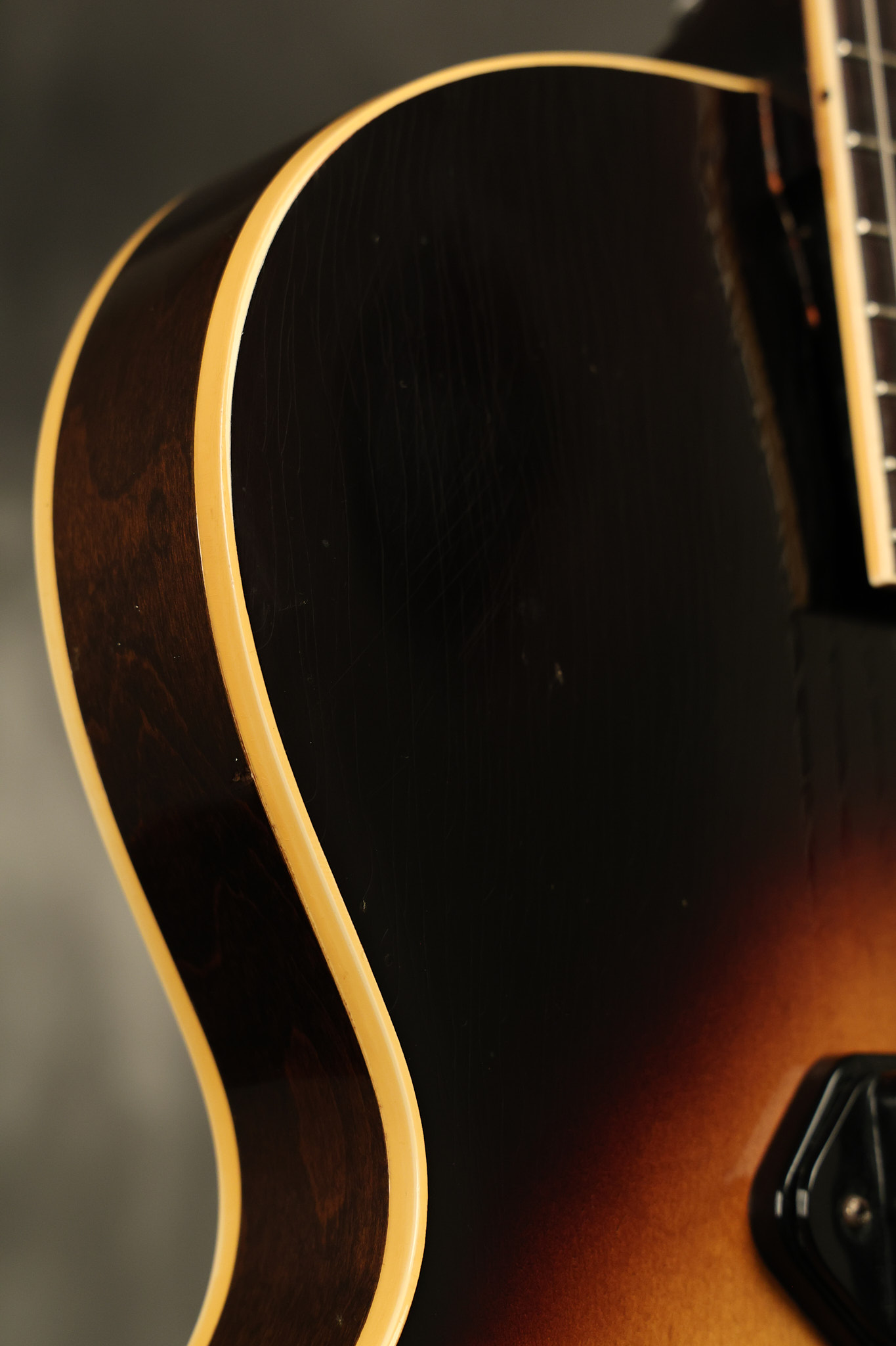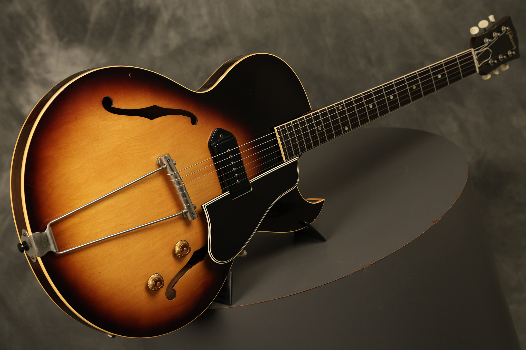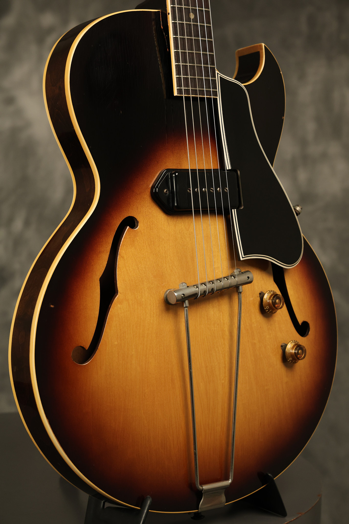 1956 Gibson ES-225 T in its original Sunburst finish. It has a great playing neck with worn, but good frets. The low E buzzes against the surface of the pickup on the last/highest fret. It's all original with the exception of the strap buttons, the buttons for the tuning keys and the screw and outer nut for the pickguard bracket. It's also 100% complete along with its original Brown hardshell case. This 225 looks great and has lots of nicks + dings with several being on the back of the neck near the 7th-10th fret area. There is a surface crack on the back of the body near the bass side edge of the lower bout along with lots of finish checking and other cosmetic wear. These are all cosmetic issues as everything remains structurally sound. All electronics work and sound great with its original P-90.