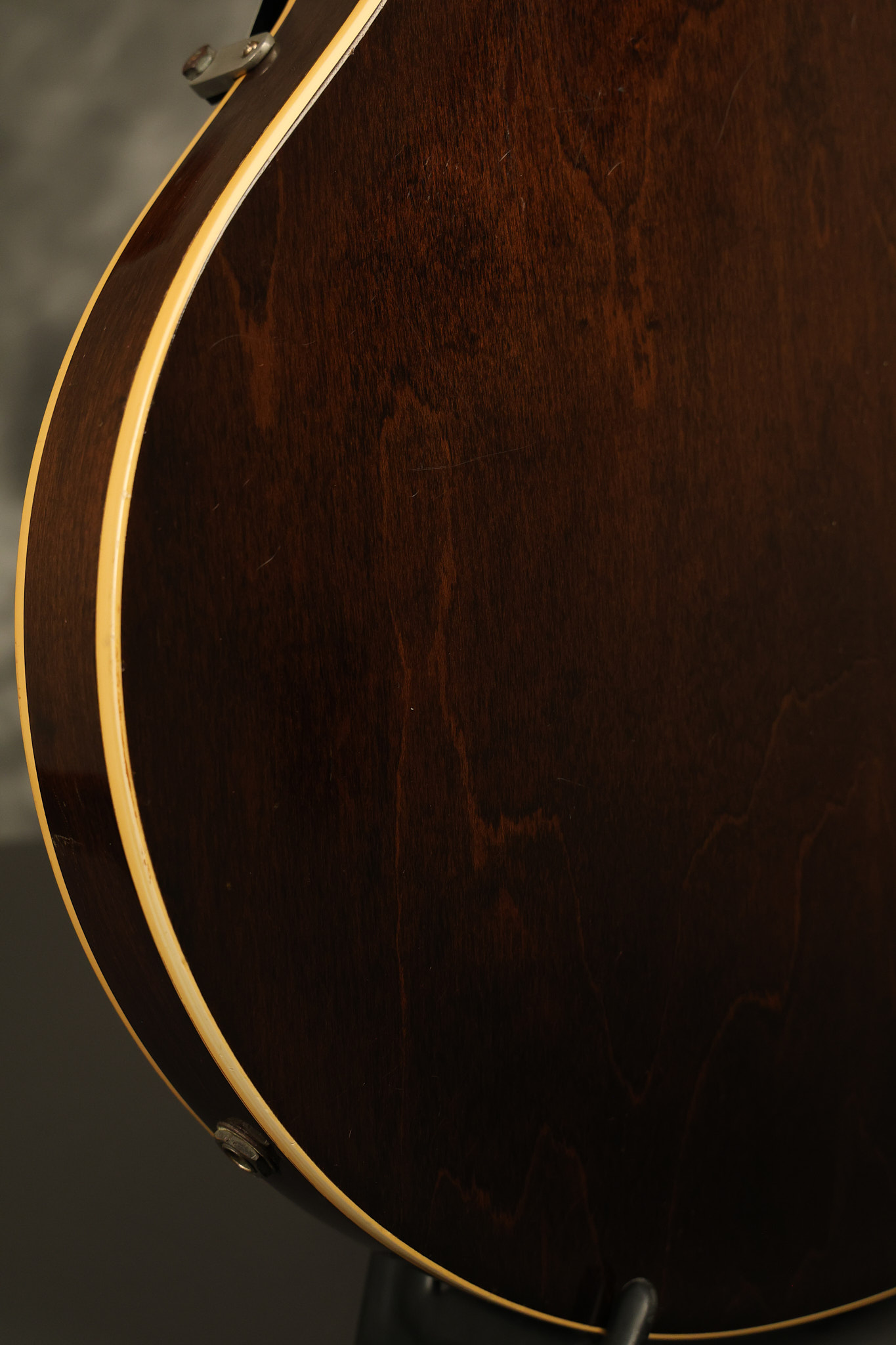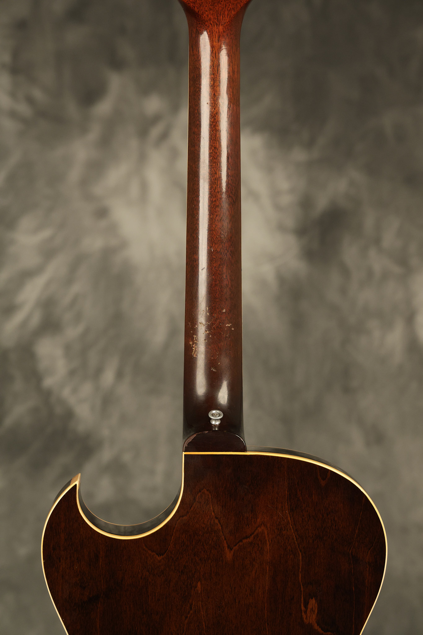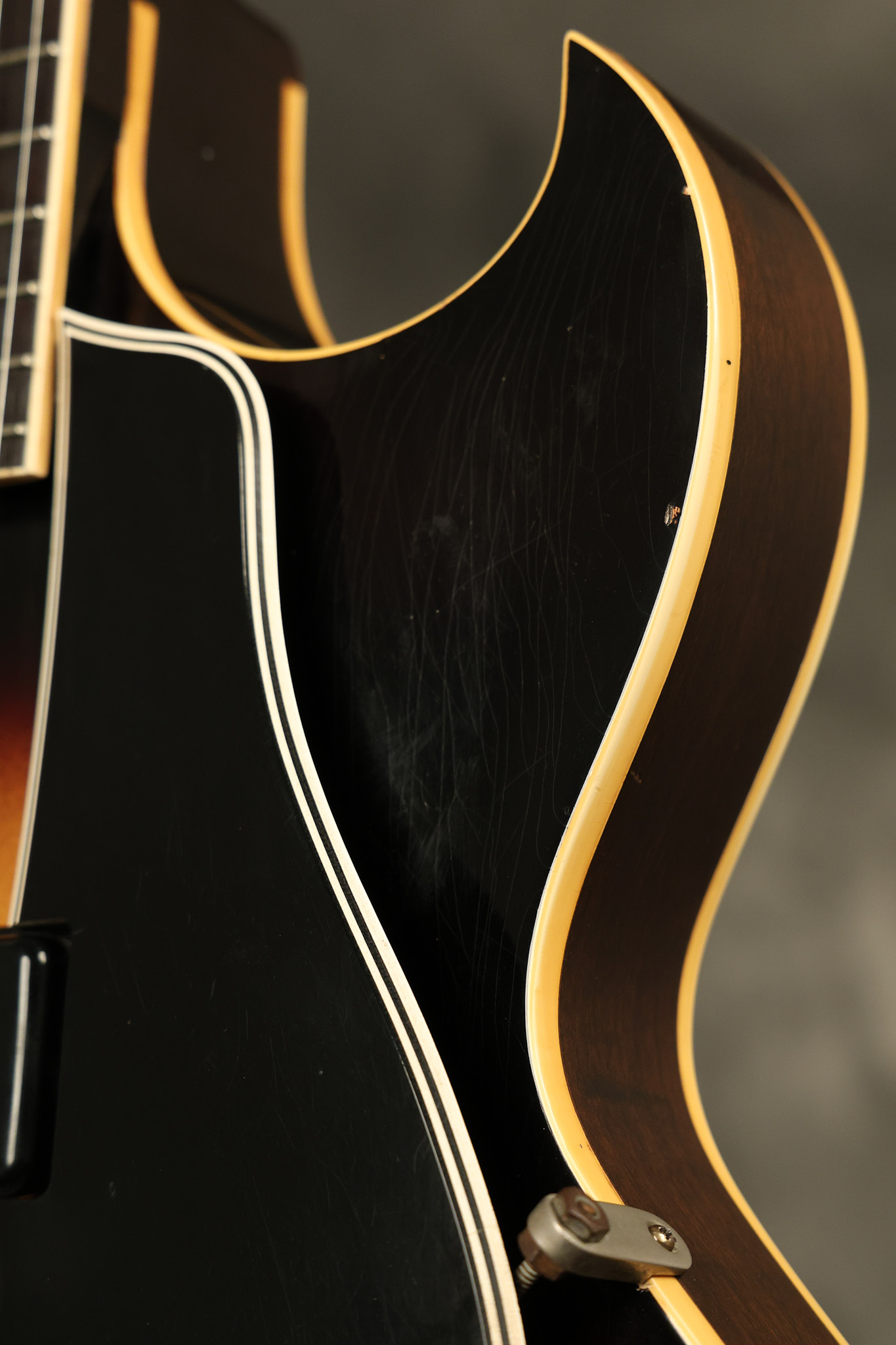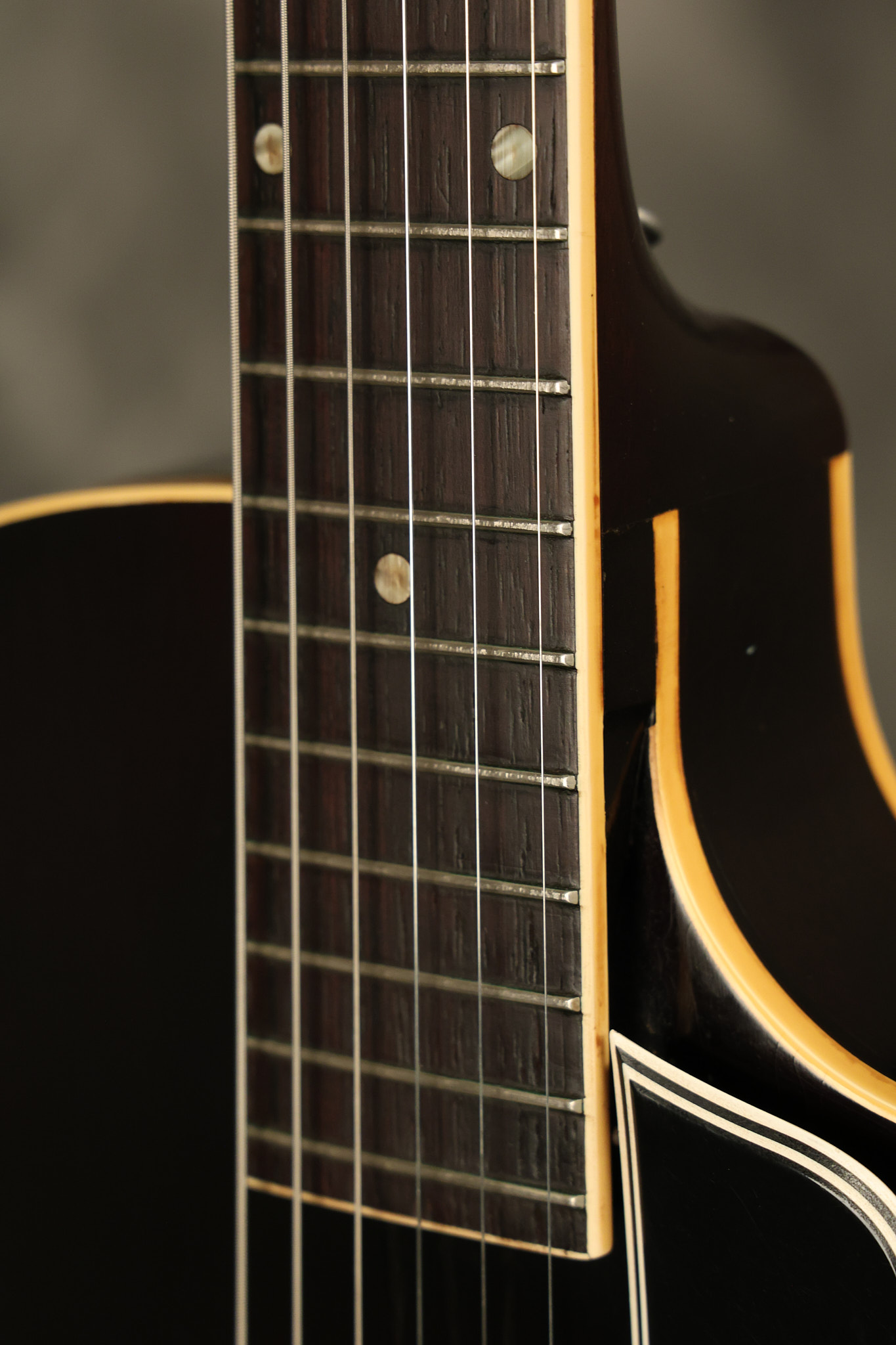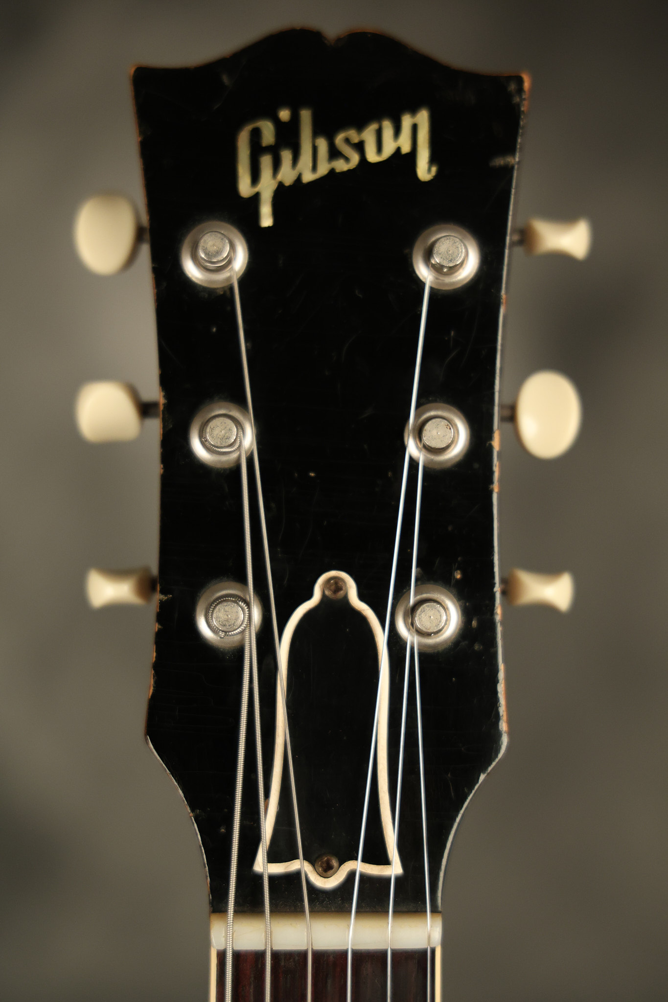 1956 Gibson ES-225 T in its original Sunburst finish. It has a great playing neck with worn, but good frets. The low E buzzes against the surface of the pickup on the last/highest fret. It's all original with the exception of the strap buttons, the buttons for the tuning keys and the screw and outer nut for the pickguard bracket. It's also 100% complete along with its original Brown hardshell case. This 225 looks great and has lots of nicks + dings with several being on the back of the neck near the 7th-10th fret area. There is a surface crack on the back of the body near the bass side edge of the lower bout along with lots of finish checking and other cosmetic wear. These are all cosmetic issues as everything remains structurally sound. All electronics work and sound great with its original P-90.