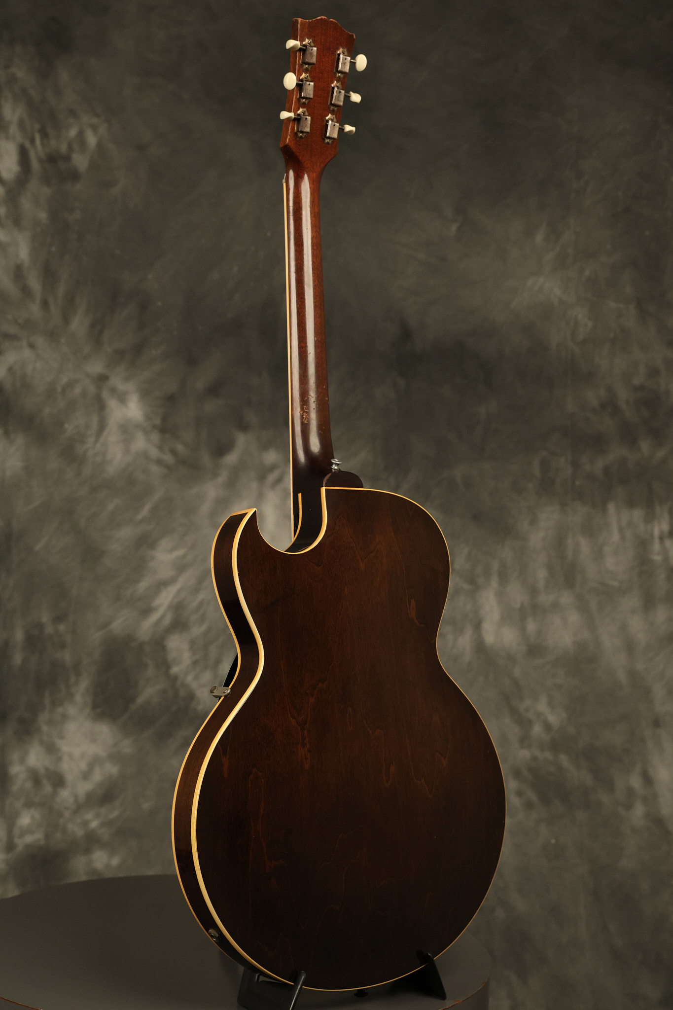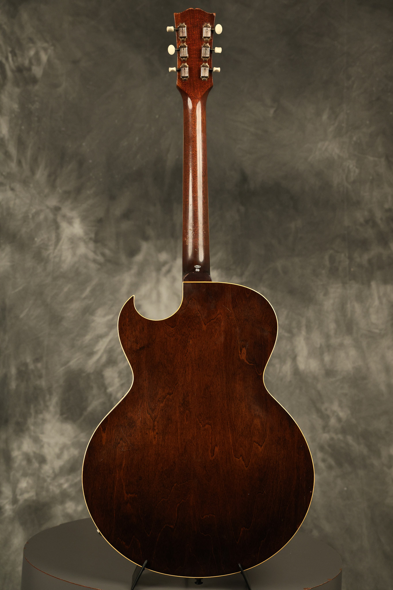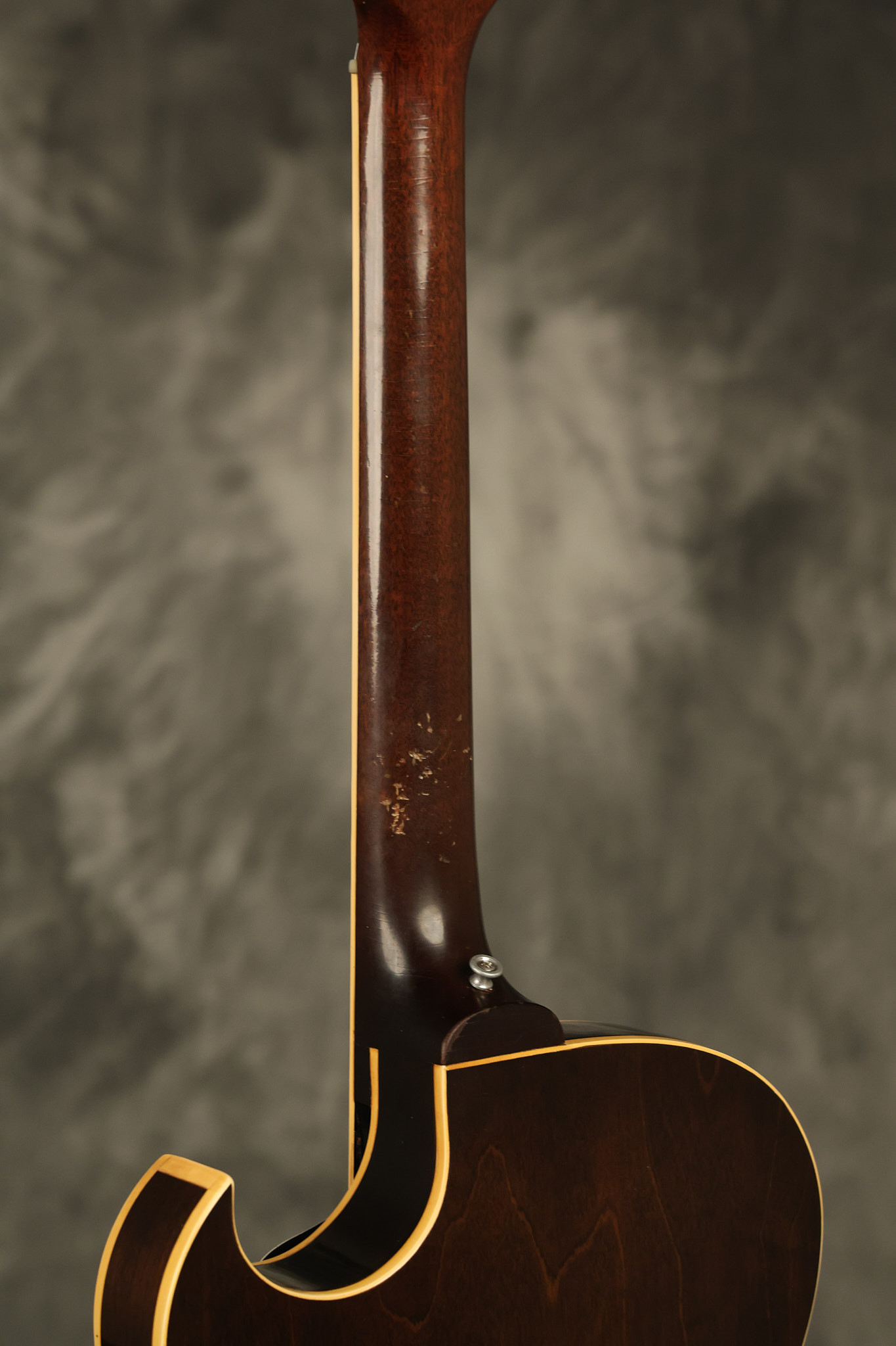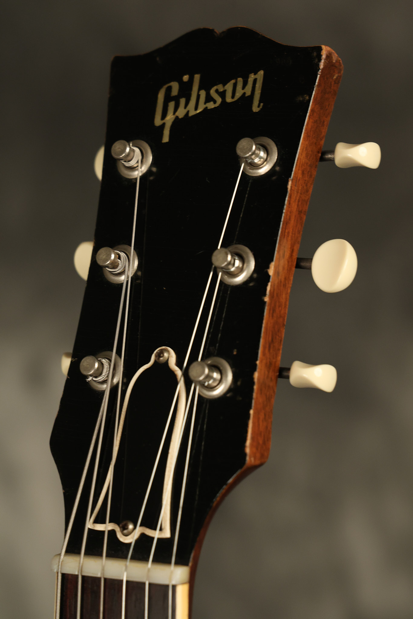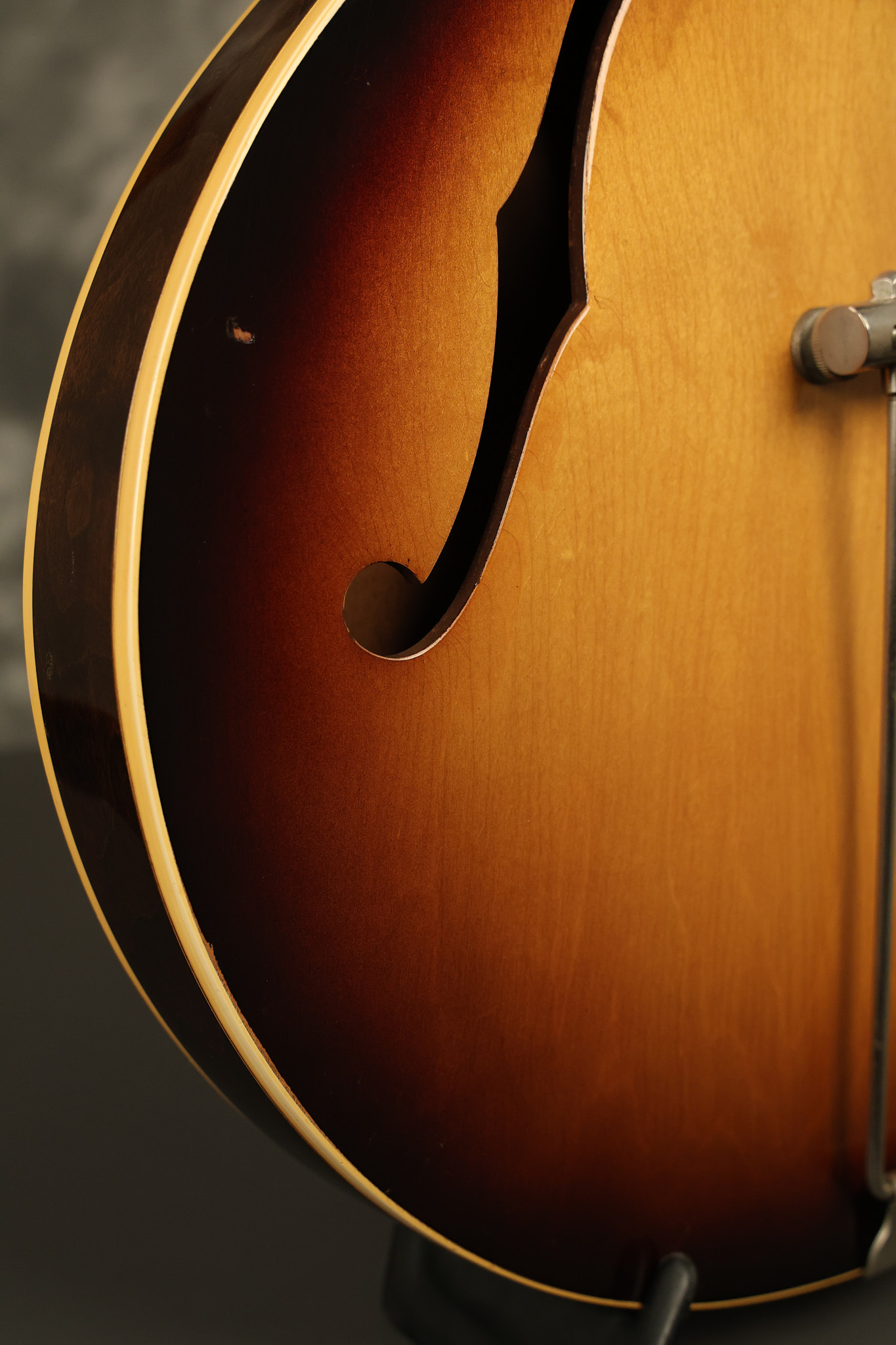 1956 Gibson ES-225 T in its original Sunburst finish. It has a great playing neck with worn, but good frets. The low E buzzes against the surface of the pickup on the last/highest fret. It's all original with the exception of the strap buttons, the buttons for the tuning keys and the screw and outer nut for the pickguard bracket. It's also 100% complete along with its original Brown hardshell case. This 225 looks great and has lots of nicks + dings with several being on the back of the neck near the 7th-10th fret area. There is a surface crack on the back of the body near the bass side edge of the lower bout along with lots of finish checking and other cosmetic wear. These are all cosmetic issues as everything remains structurally sound. All electronics work and sound great with its original P-90.