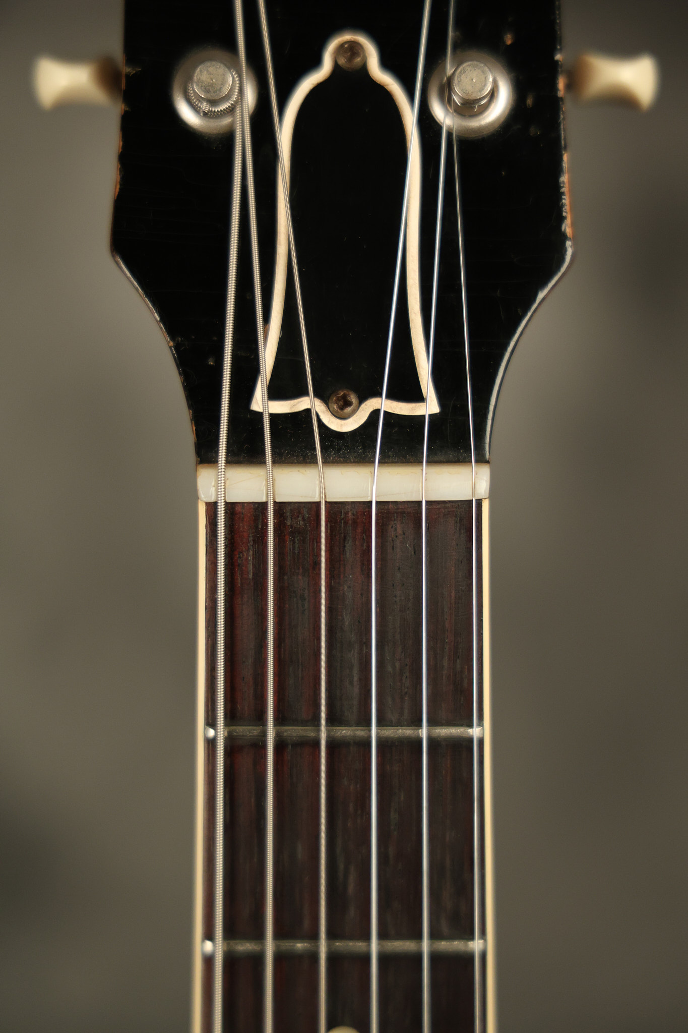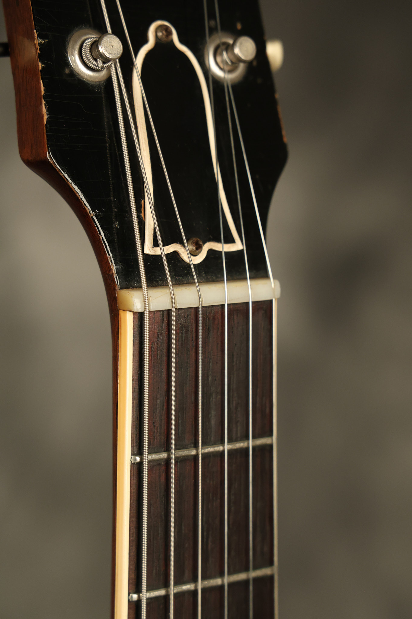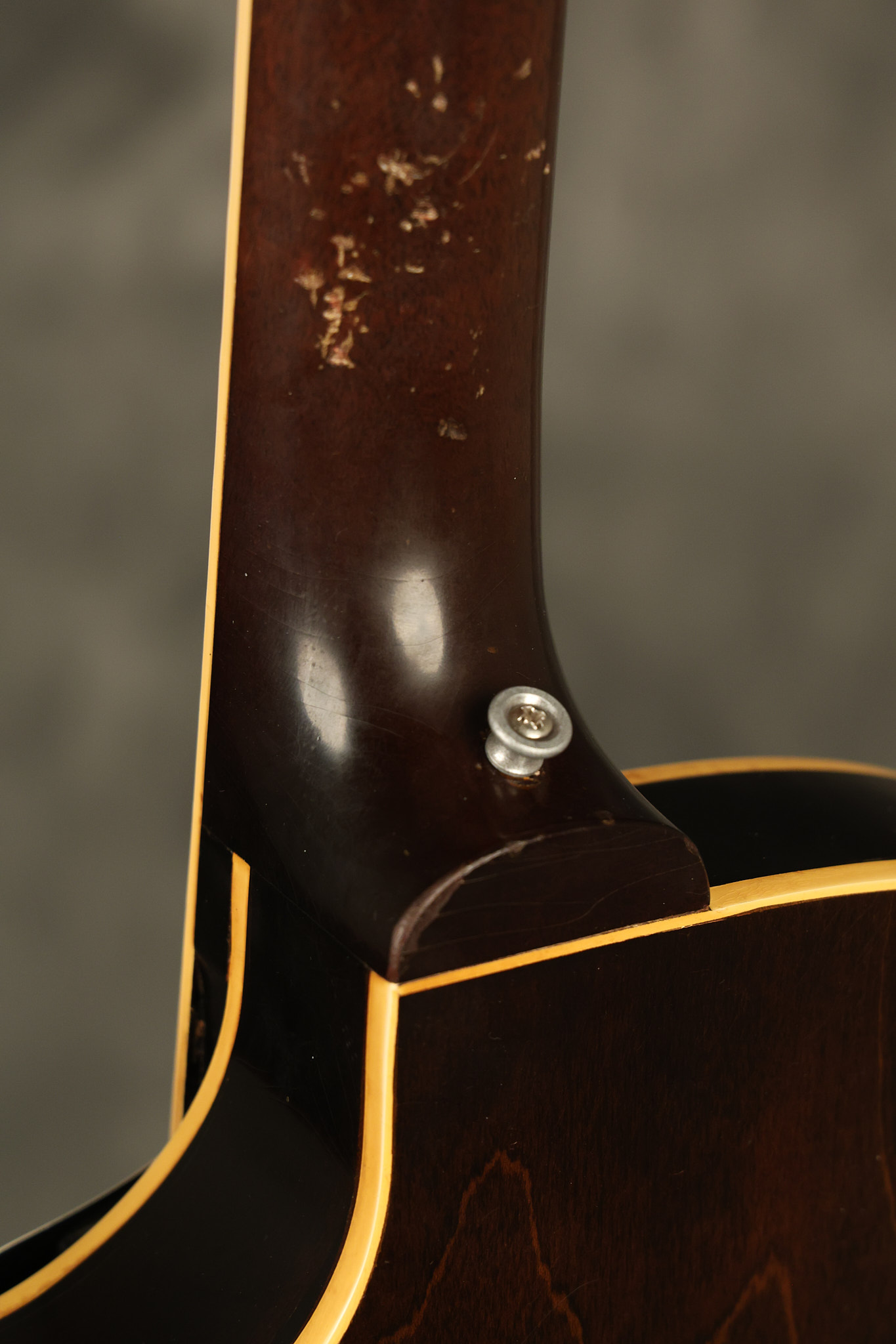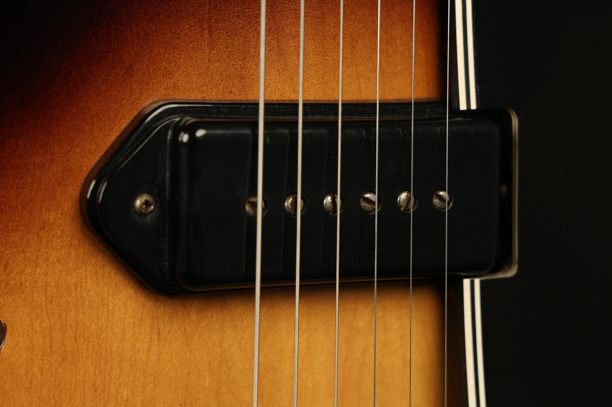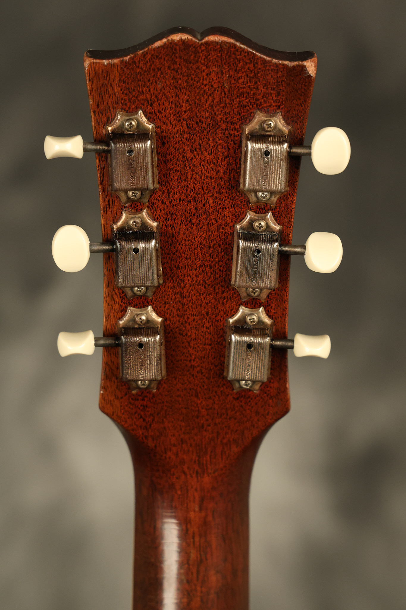 1956 Gibson ES-225 T in its original Sunburst finish. It has a great playing neck with worn, but good frets. The low E buzzes against the surface of the pickup on the last/highest fret. It's all original with the exception of the strap buttons, the buttons for the tuning keys and the screw and outer nut for the pickguard bracket. It's also 100% complete along with its original Brown hardshell case. This 225 looks great and has lots of nicks + dings with several being on the back of the neck near the 7th-10th fret area. There is a surface crack on the back of the body near the bass side edge of the lower bout along with lots of finish checking and other cosmetic wear. These are all cosmetic issues as everything remains structurally sound. All electronics work and sound great with its original P-90.