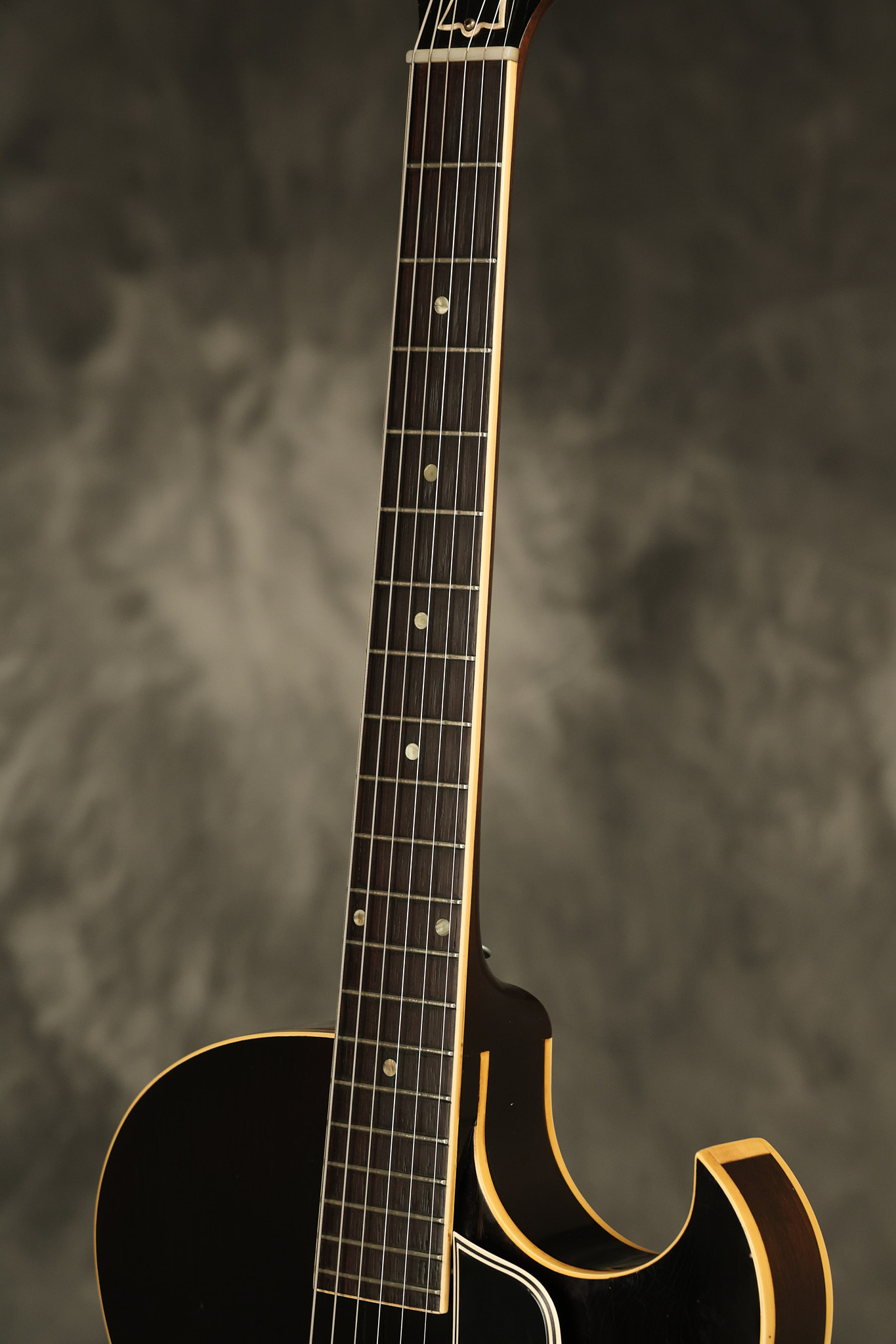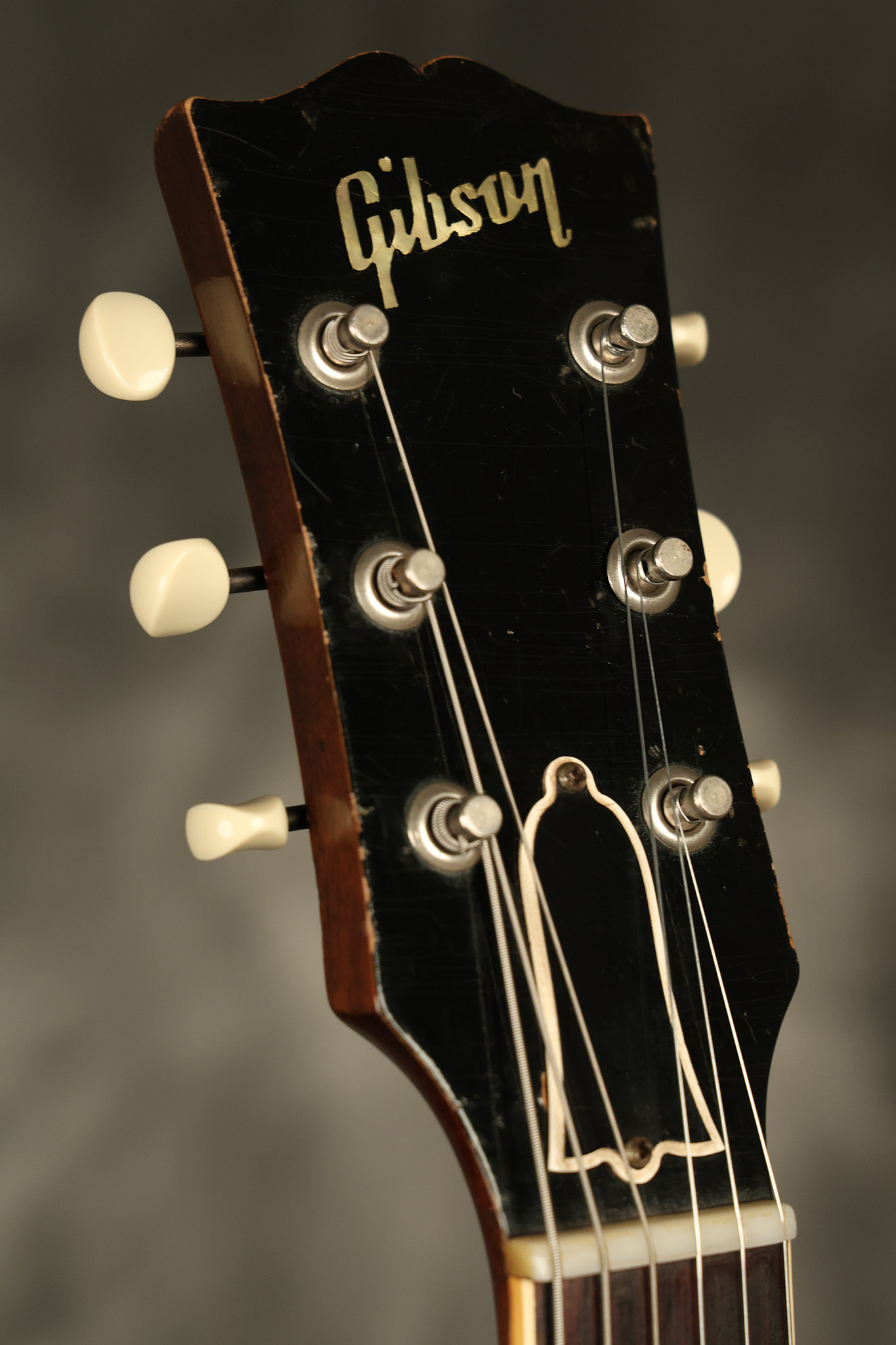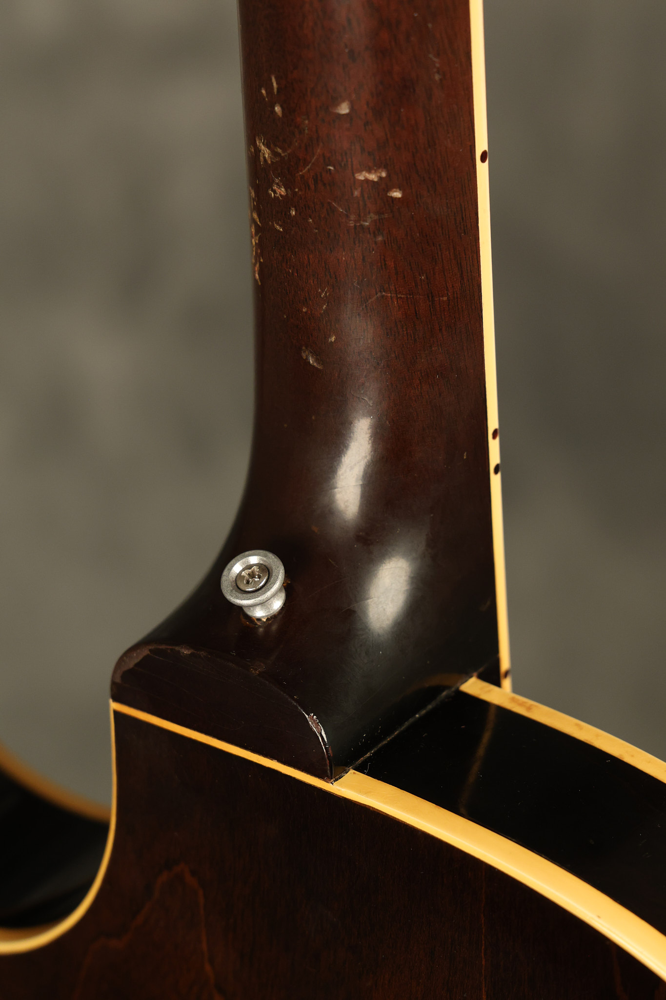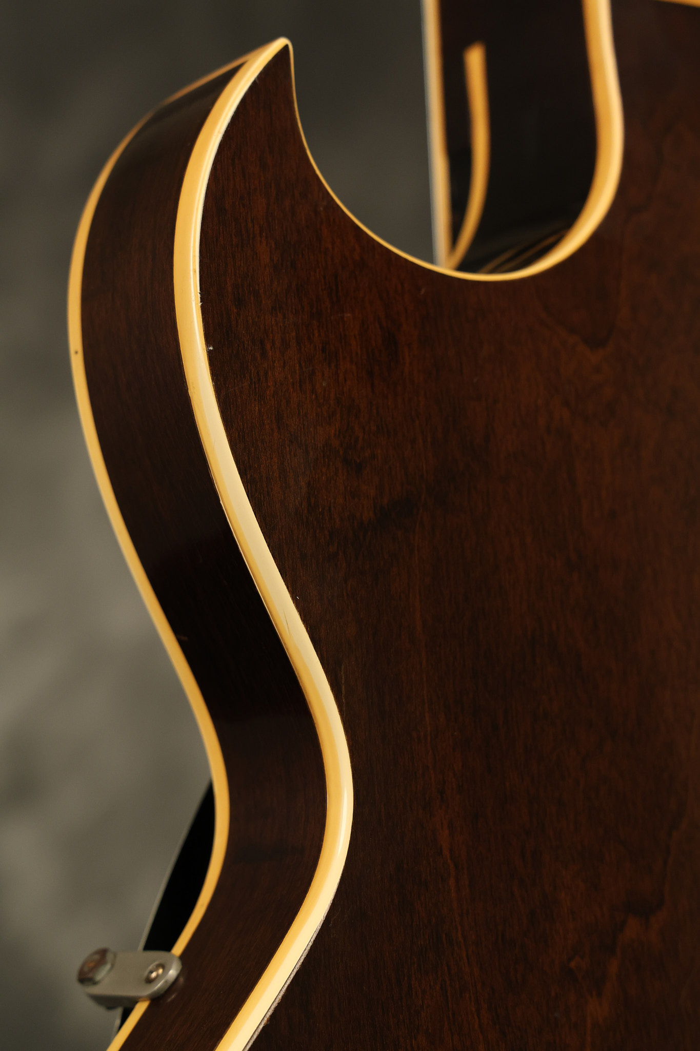 1956 Gibson ES-225 T in its original Sunburst finish. It has a great playing neck with worn, but good frets. The low E buzzes against the surface of the pickup on the last/highest fret. It's all original with the exception of the strap buttons, the buttons for the tuning keys and the screw and outer nut for the pickguard bracket. It's also 100% complete along with its original Brown hardshell case. This 225 looks great and has lots of nicks + dings with several being on the back of the neck near the 7th-10th fret area. There is a surface crack on the back of the body near the bass side edge of the lower bout along with lots of finish checking and other cosmetic wear. These are all cosmetic issues as everything remains structurally sound. All electronics work and sound great with its original P-90.