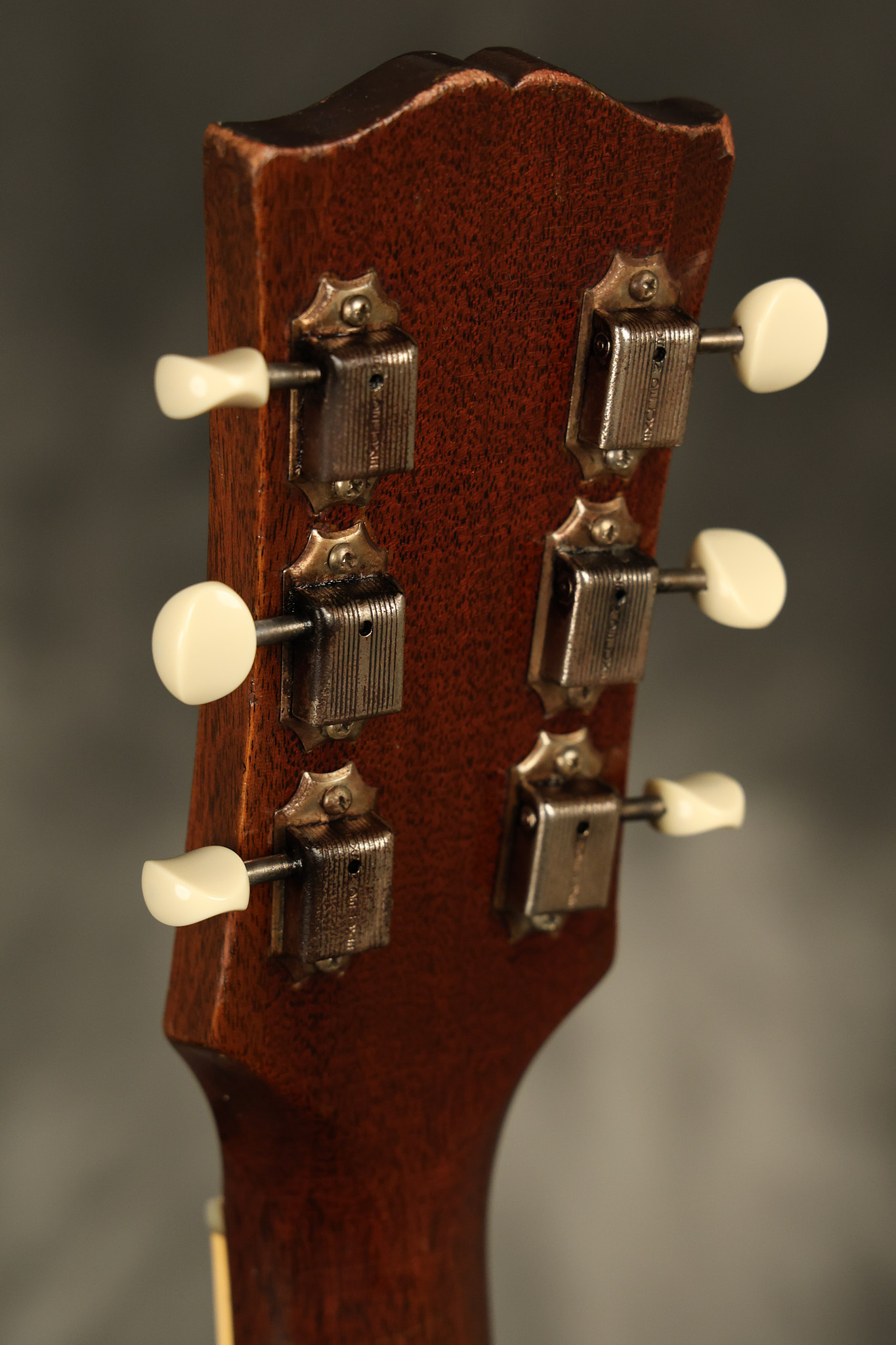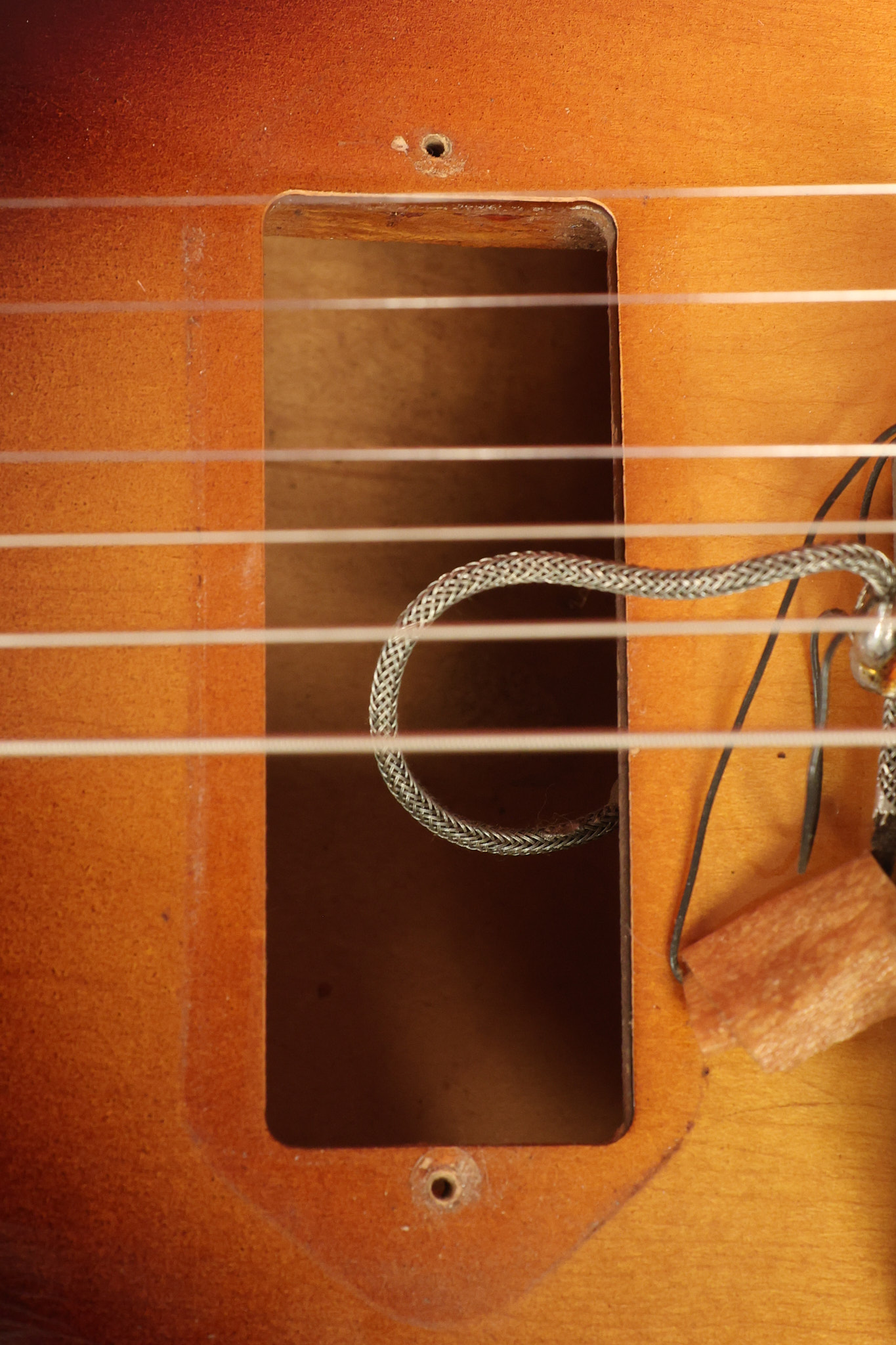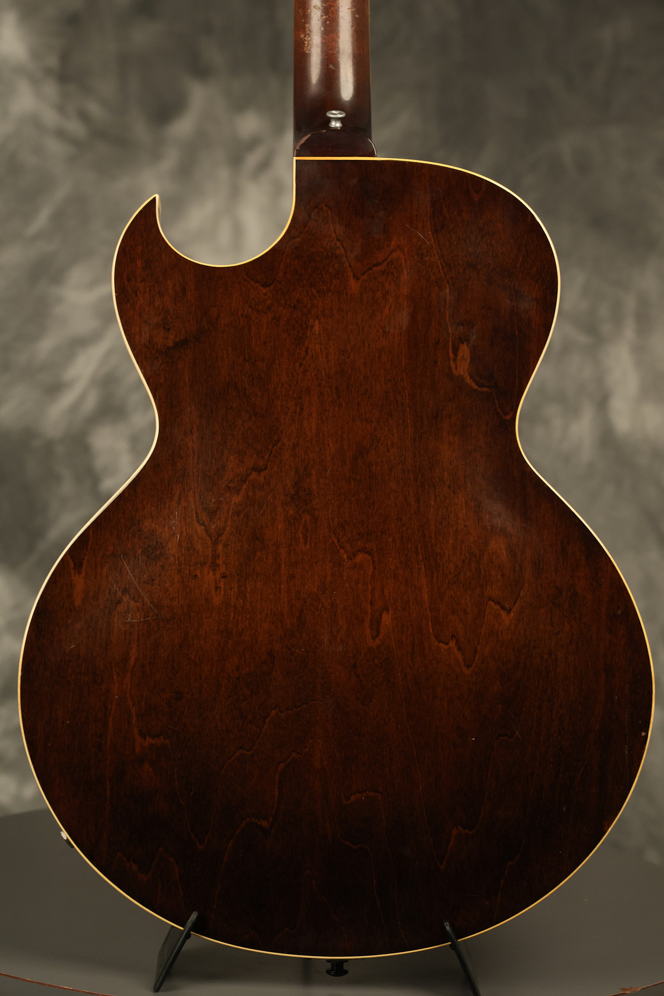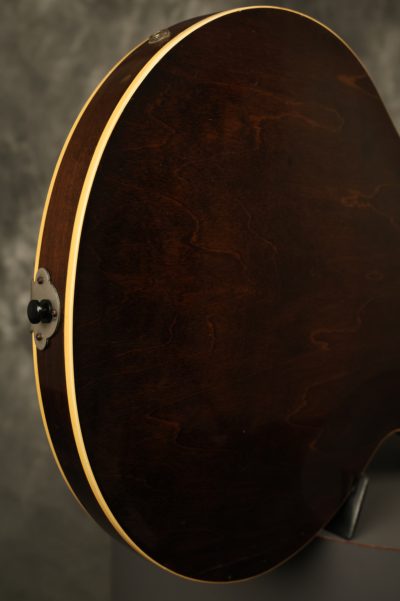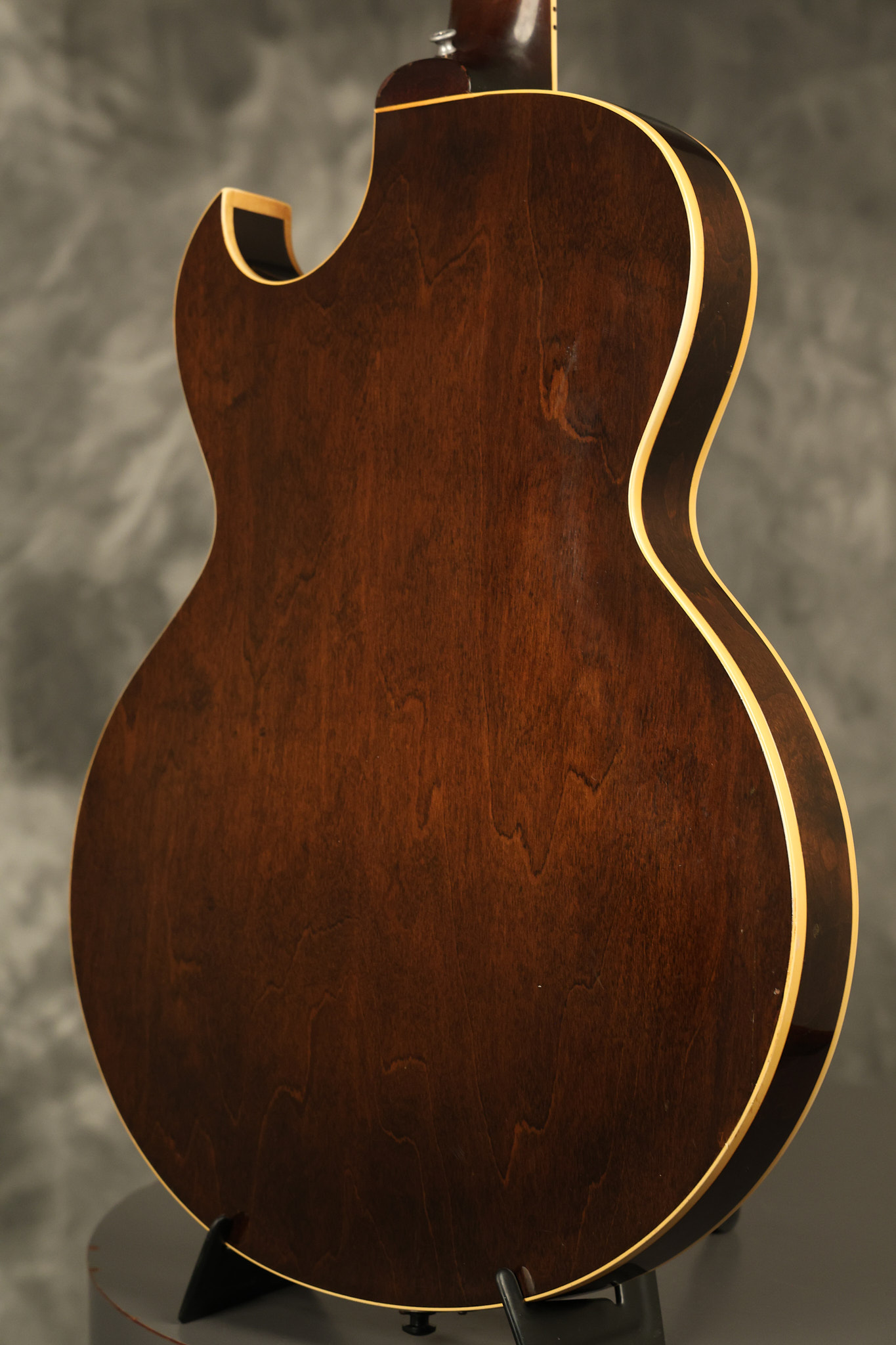 1956 Gibson ES-225 T in its original Sunburst finish. It has a great playing neck with worn, but good frets. The low E buzzes against the surface of the pickup on the last/highest fret. It's all original with the exception of the strap buttons, the buttons for the tuning keys and the screw and outer nut for the pickguard bracket. It's also 100% complete along with its original Brown hardshell case. This 225 looks great and has lots of nicks + dings with several being on the back of the neck near the 7th-10th fret area. There is a surface crack on the back of the body near the bass side edge of the lower bout along with lots of finish checking and other cosmetic wear. These are all cosmetic issues as everything remains structurally sound. All electronics work and sound great with its original P-90.