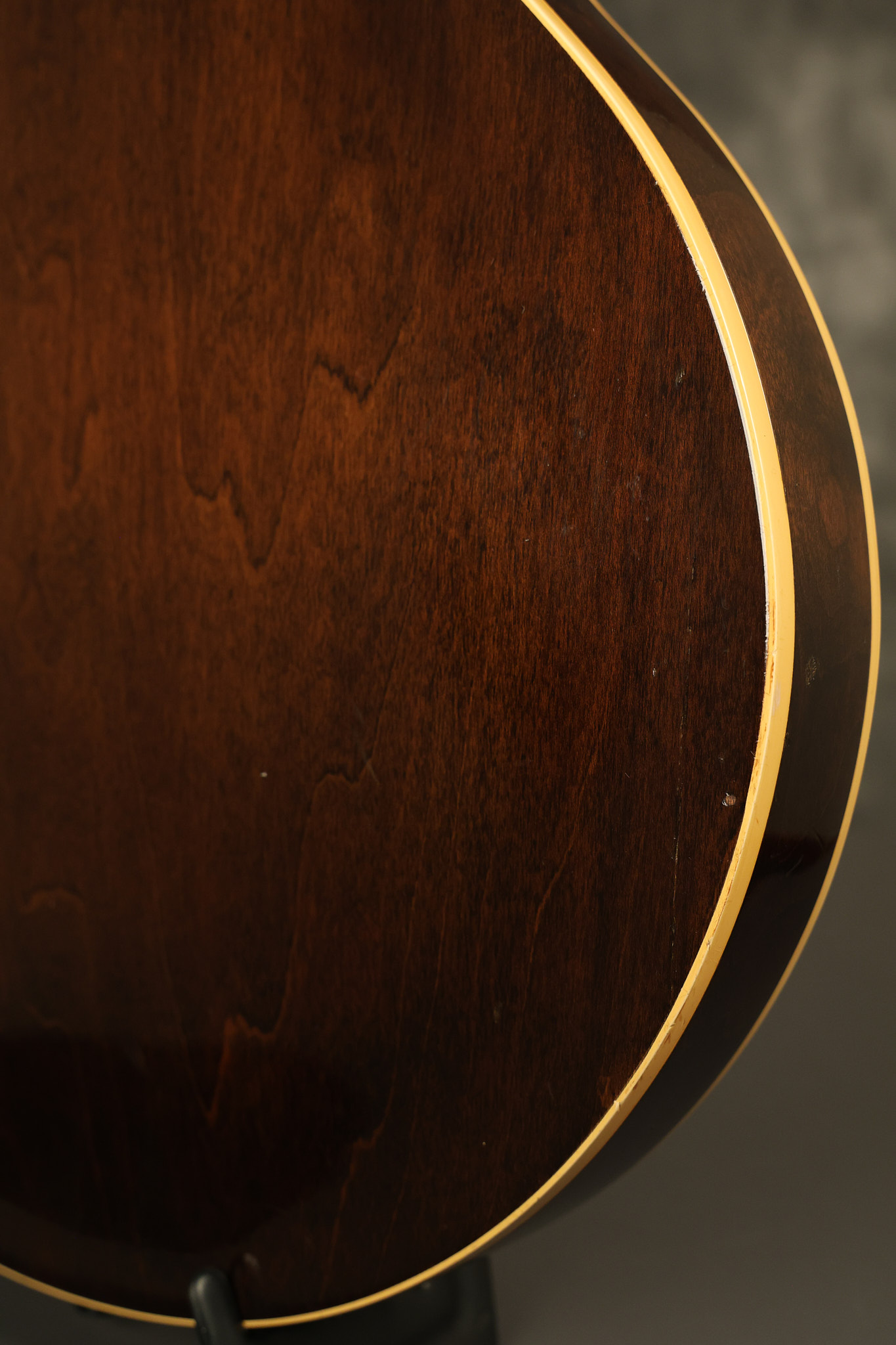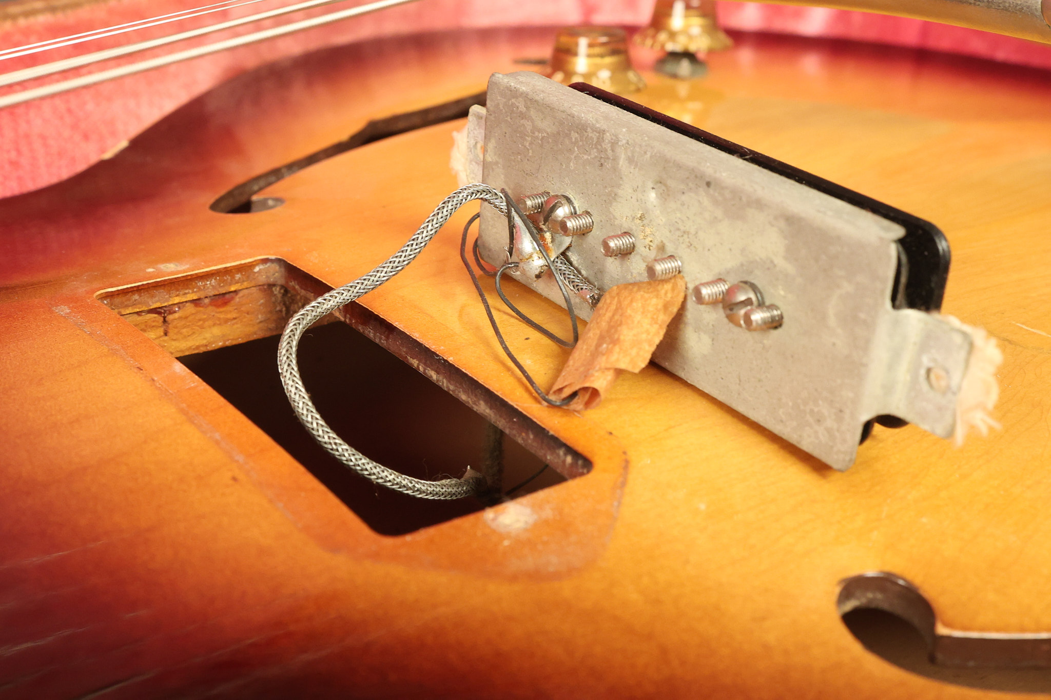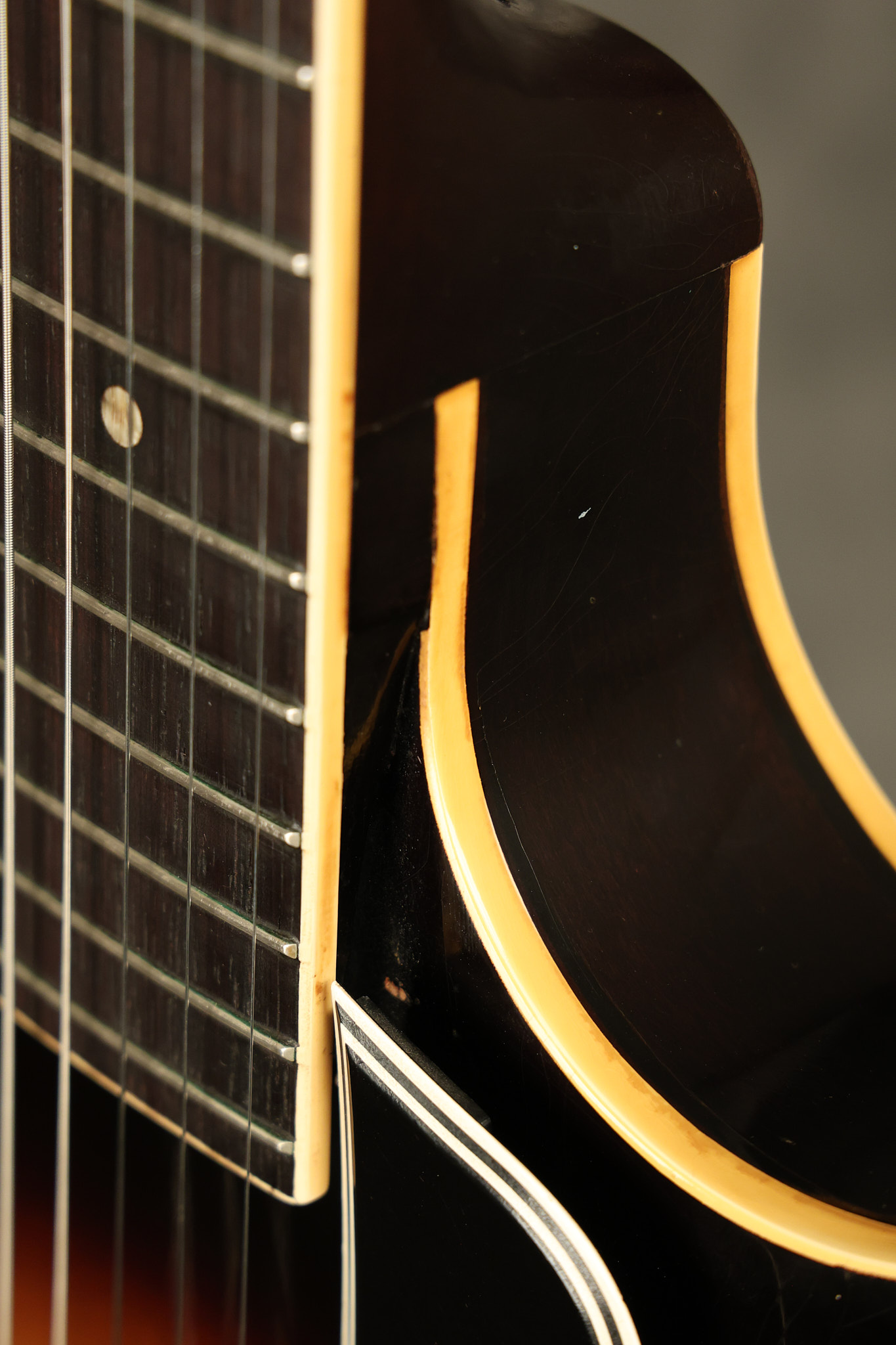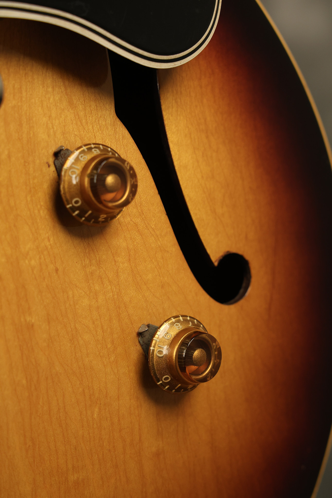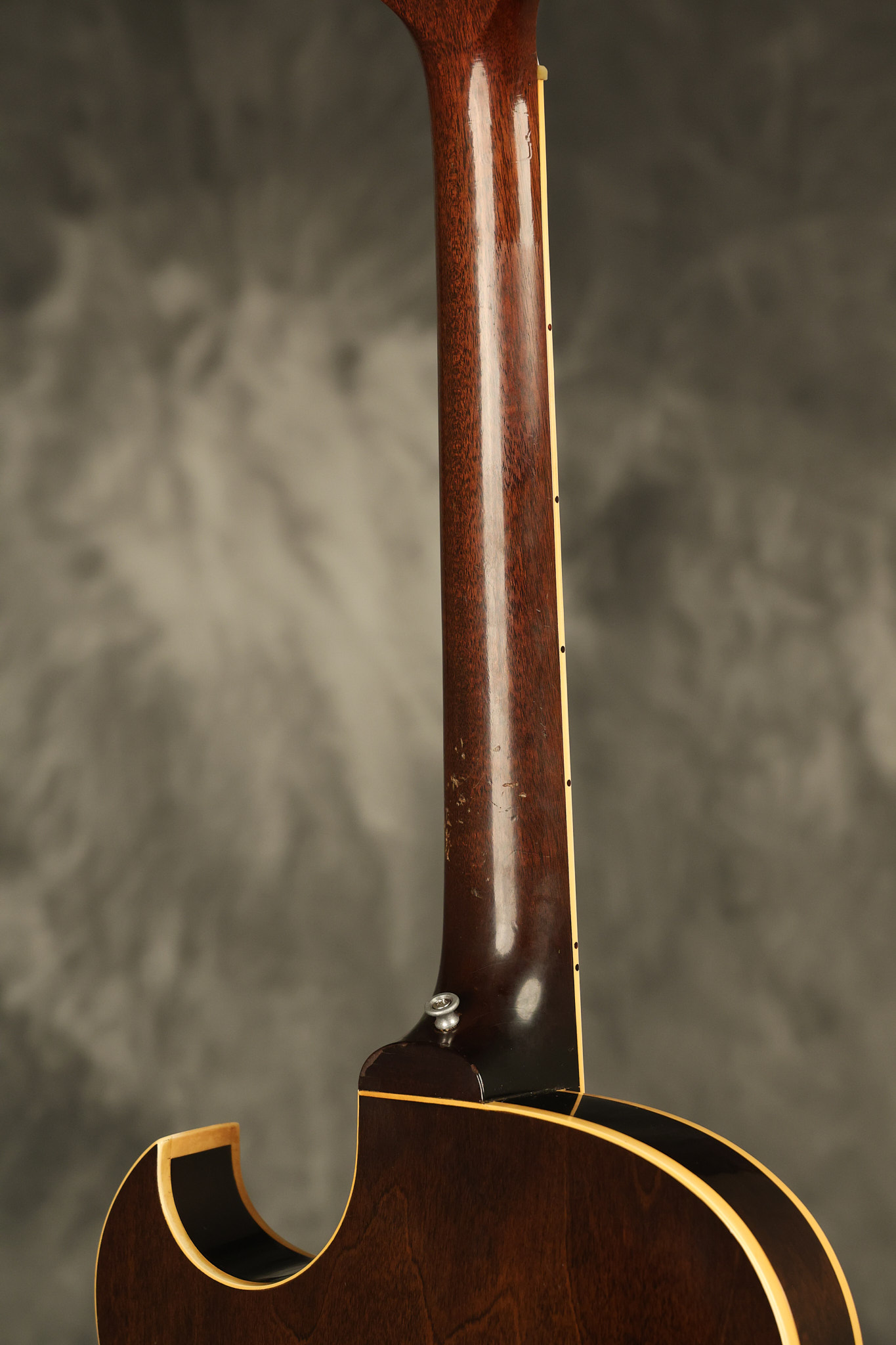 1956 Gibson ES-225 T in its original Sunburst finish. It has a great playing neck with worn, but good frets. The low E buzzes against the surface of the pickup on the last/highest fret. It's all original with the exception of the strap buttons, the buttons for the tuning keys and the screw and outer nut for the pickguard bracket. It's also 100% complete along with its original Brown hardshell case. This 225 looks great and has lots of nicks + dings with several being on the back of the neck near the 7th-10th fret area. There is a surface crack on the back of the body near the bass side edge of the lower bout along with lots of finish checking and other cosmetic wear. These are all cosmetic issues as everything remains structurally sound. All electronics work and sound great with its original P-90.