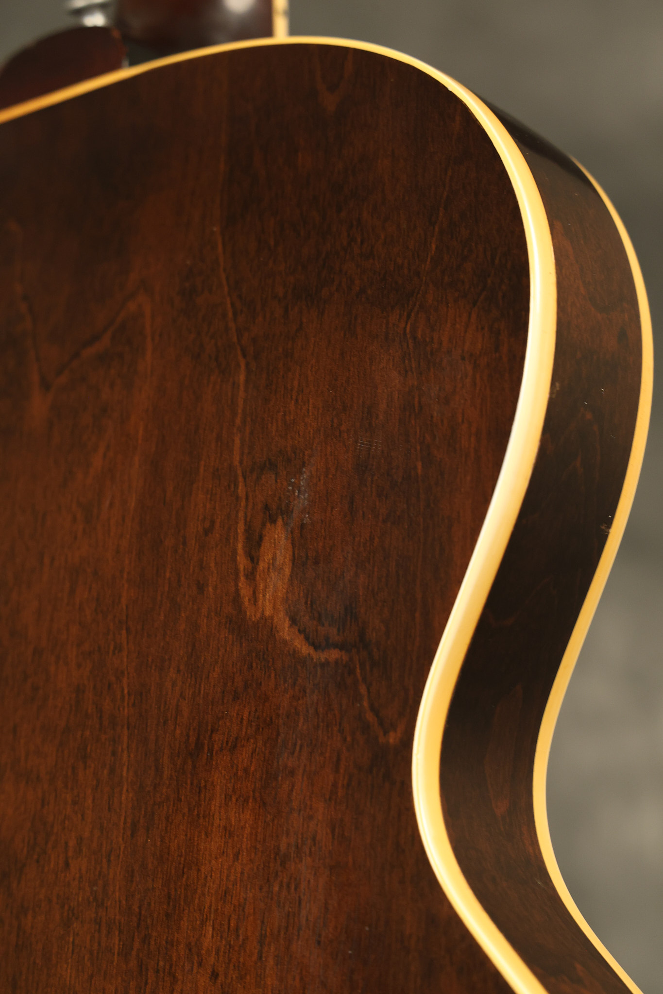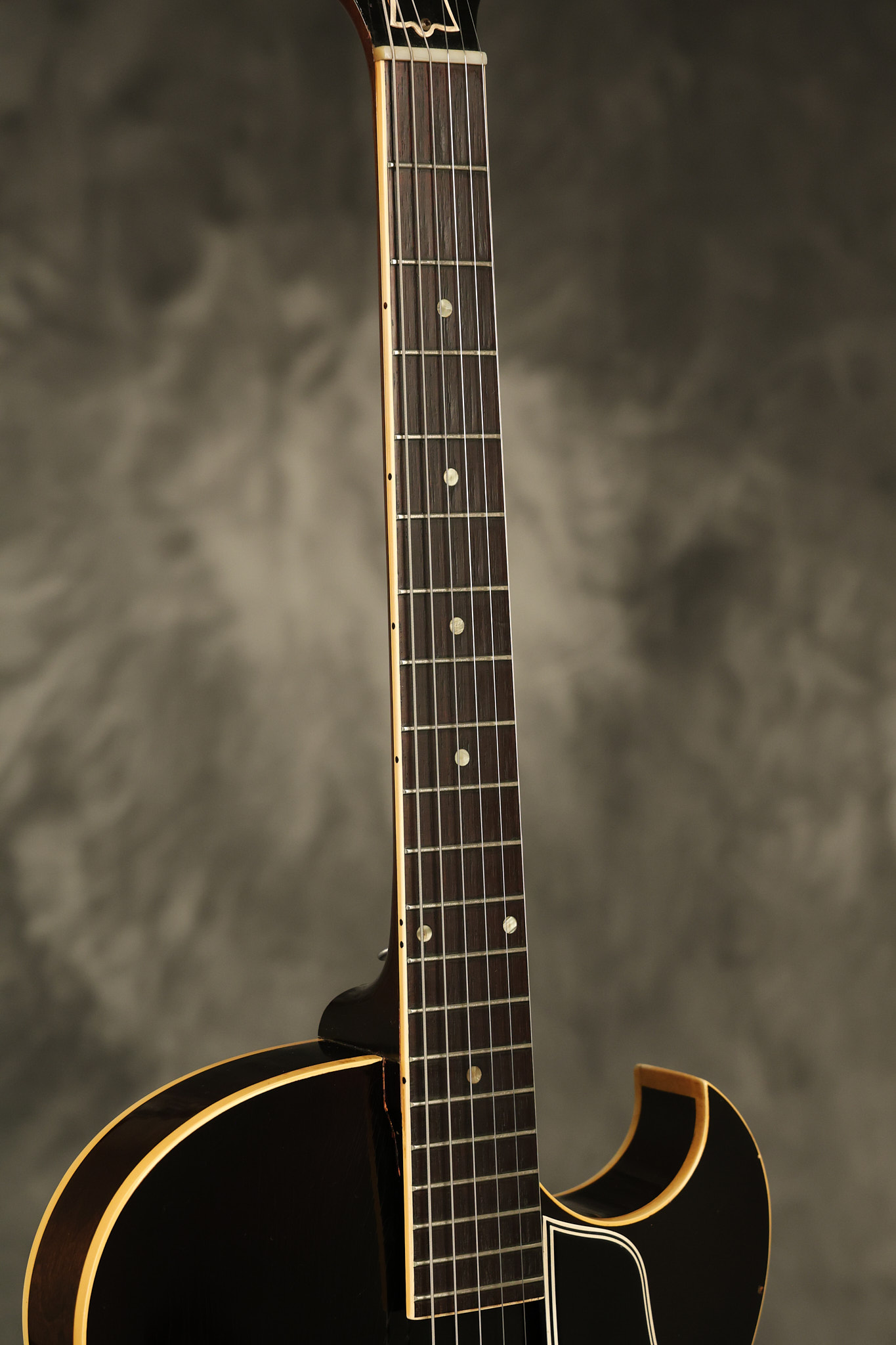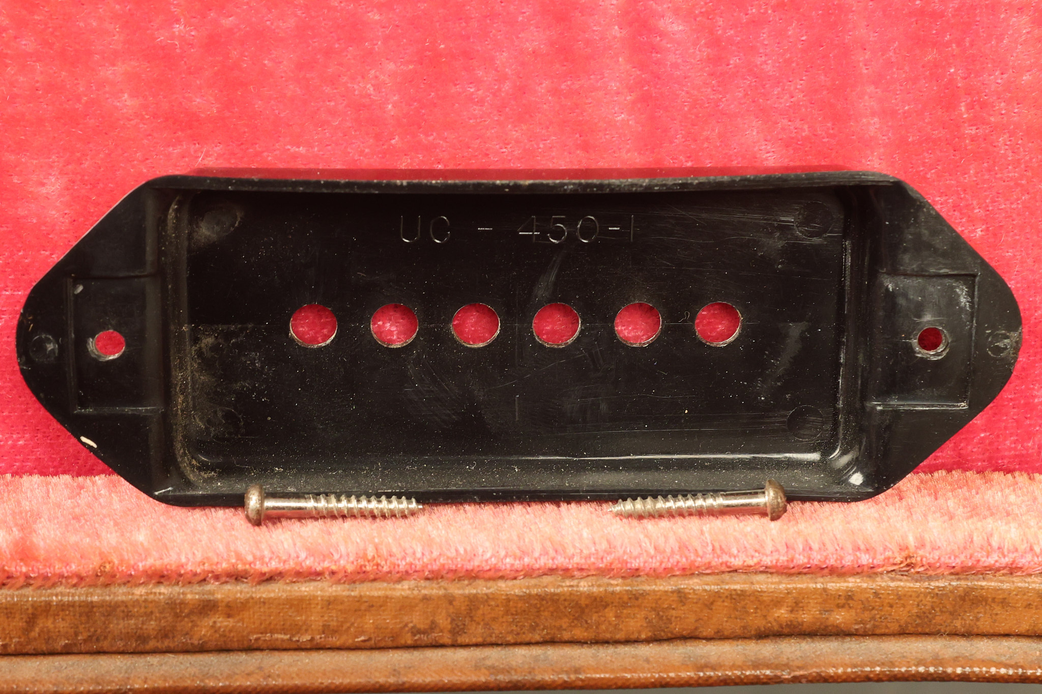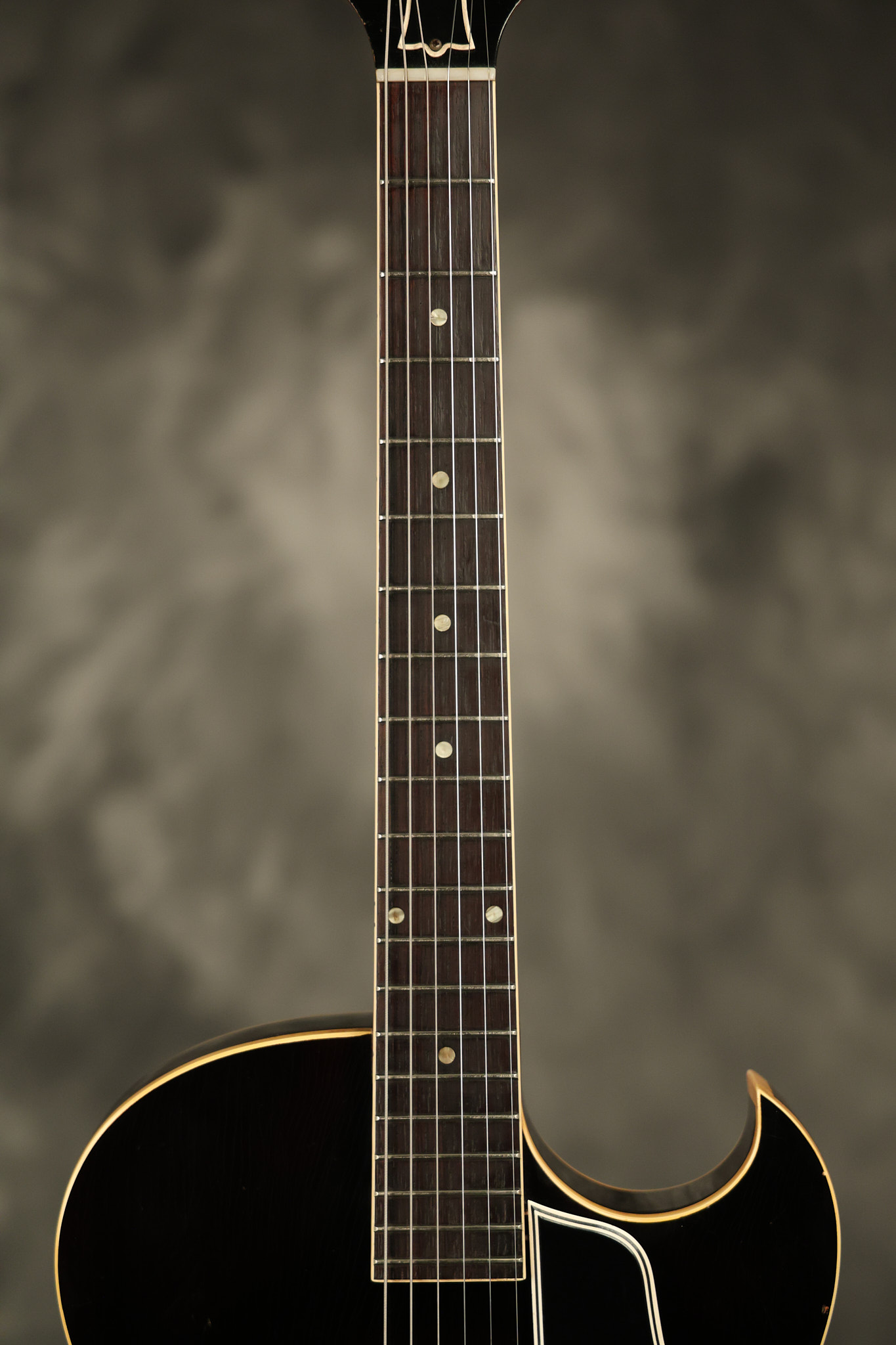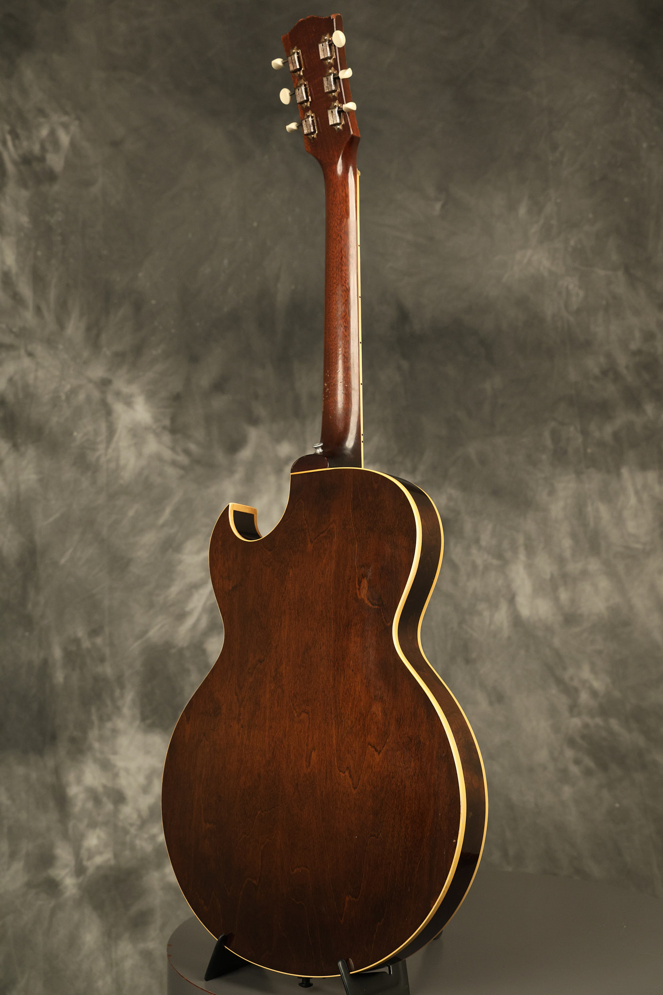 1956 Gibson ES-225 T in its original Sunburst finish. It has a great playing neck with worn, but good frets. The low E buzzes against the surface of the pickup on the last/highest fret. It's all original with the exception of the strap buttons, the buttons for the tuning keys and the screw and outer nut for the pickguard bracket. It's also 100% complete along with its original Brown hardshell case. This 225 looks great and has lots of nicks + dings with several being on the back of the neck near the 7th-10th fret area. There is a surface crack on the back of the body near the bass side edge of the lower bout along with lots of finish checking and other cosmetic wear. These are all cosmetic issues as everything remains structurally sound. All electronics work and sound great with its original P-90.