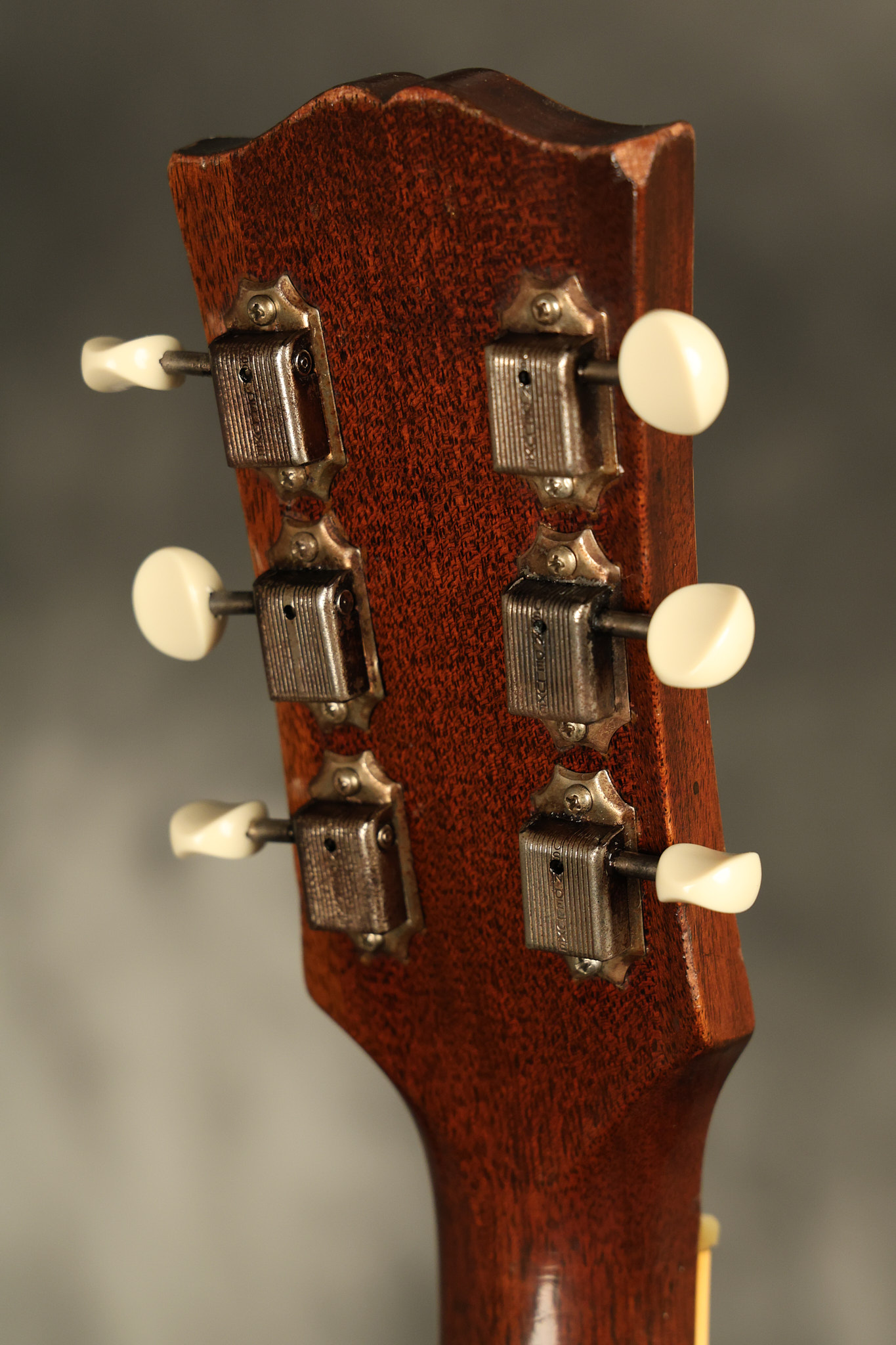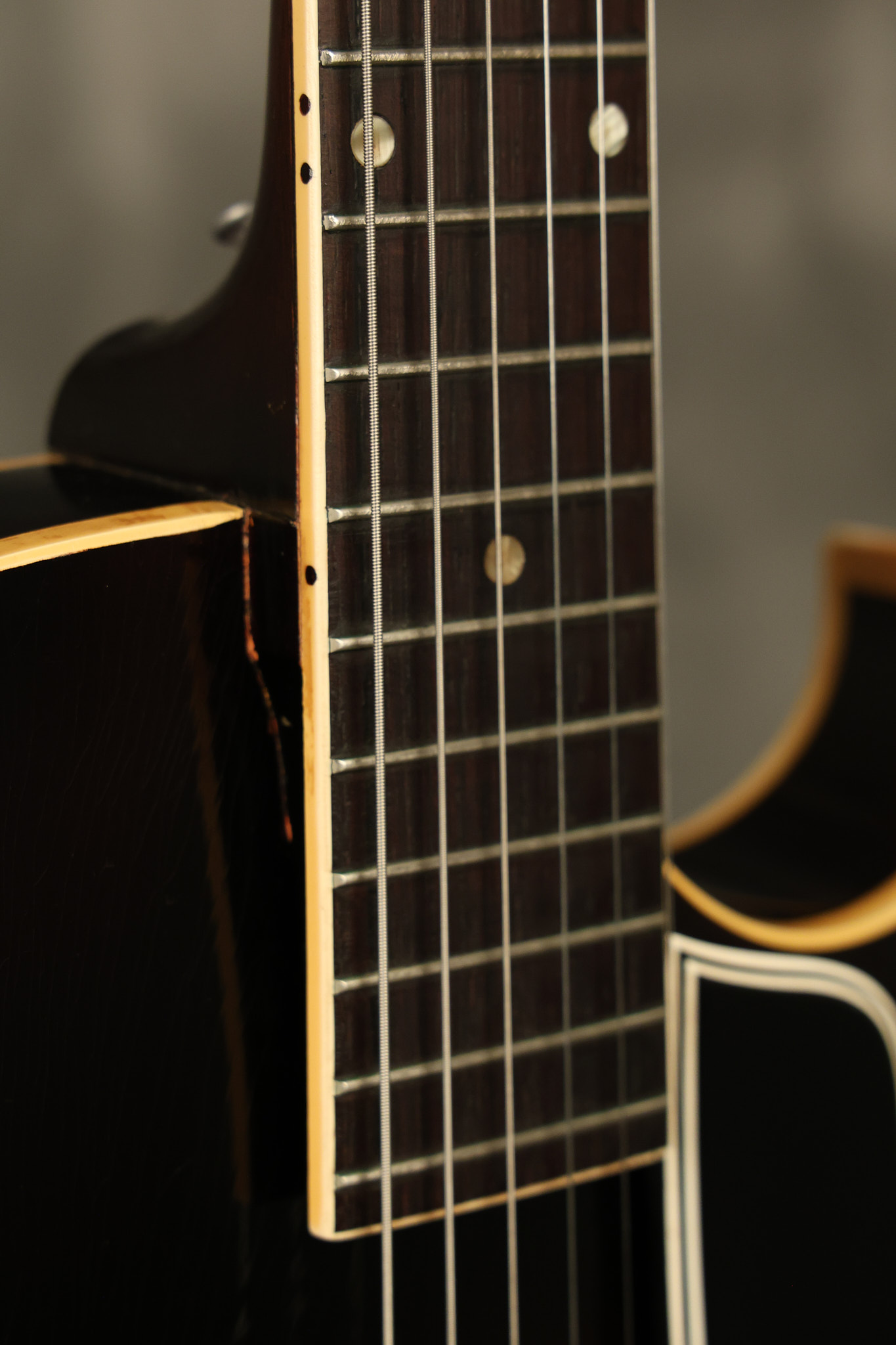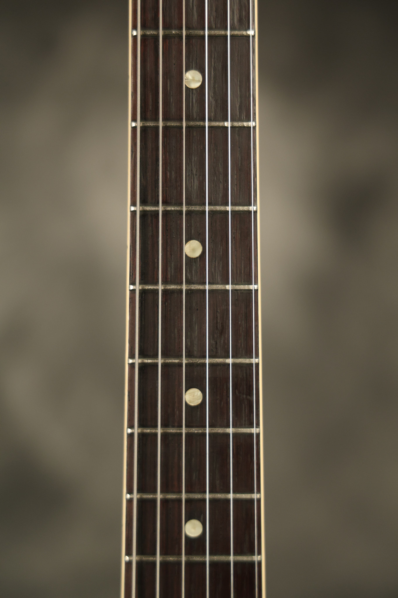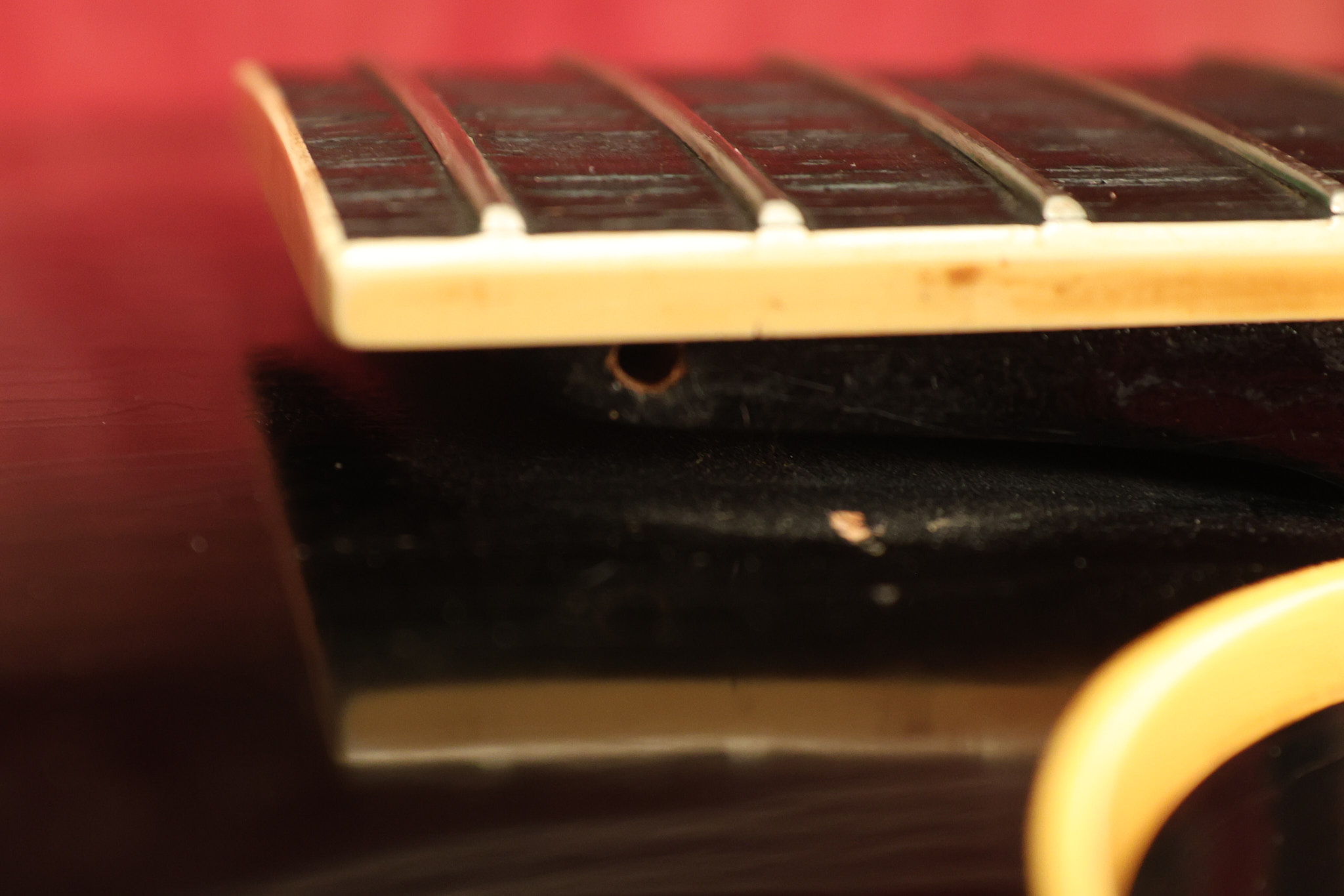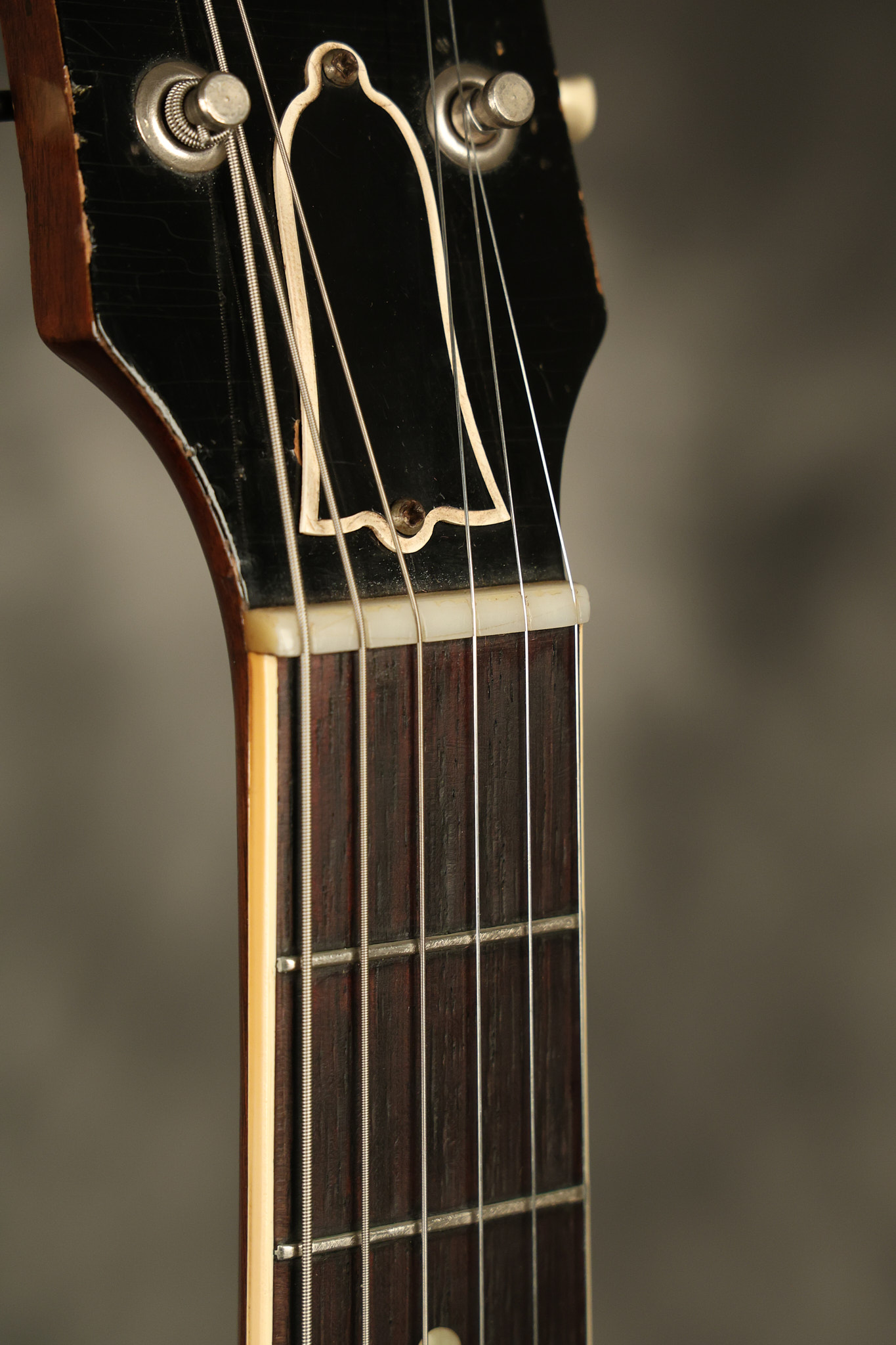 1956 Gibson ES-225 T in its original Sunburst finish. It has a great playing neck with worn, but good frets. The low E buzzes against the surface of the pickup on the last/highest fret. It's all original with the exception of the strap buttons, the buttons for the tuning keys and the screw and outer nut for the pickguard bracket. It's also 100% complete along with its original Brown hardshell case. This 225 looks great and has lots of nicks + dings with several being on the back of the neck near the 7th-10th fret area. There is a surface crack on the back of the body near the bass side edge of the lower bout along with lots of finish checking and other cosmetic wear. These are all cosmetic issues as everything remains structurally sound. All electronics work and sound great with its original P-90.