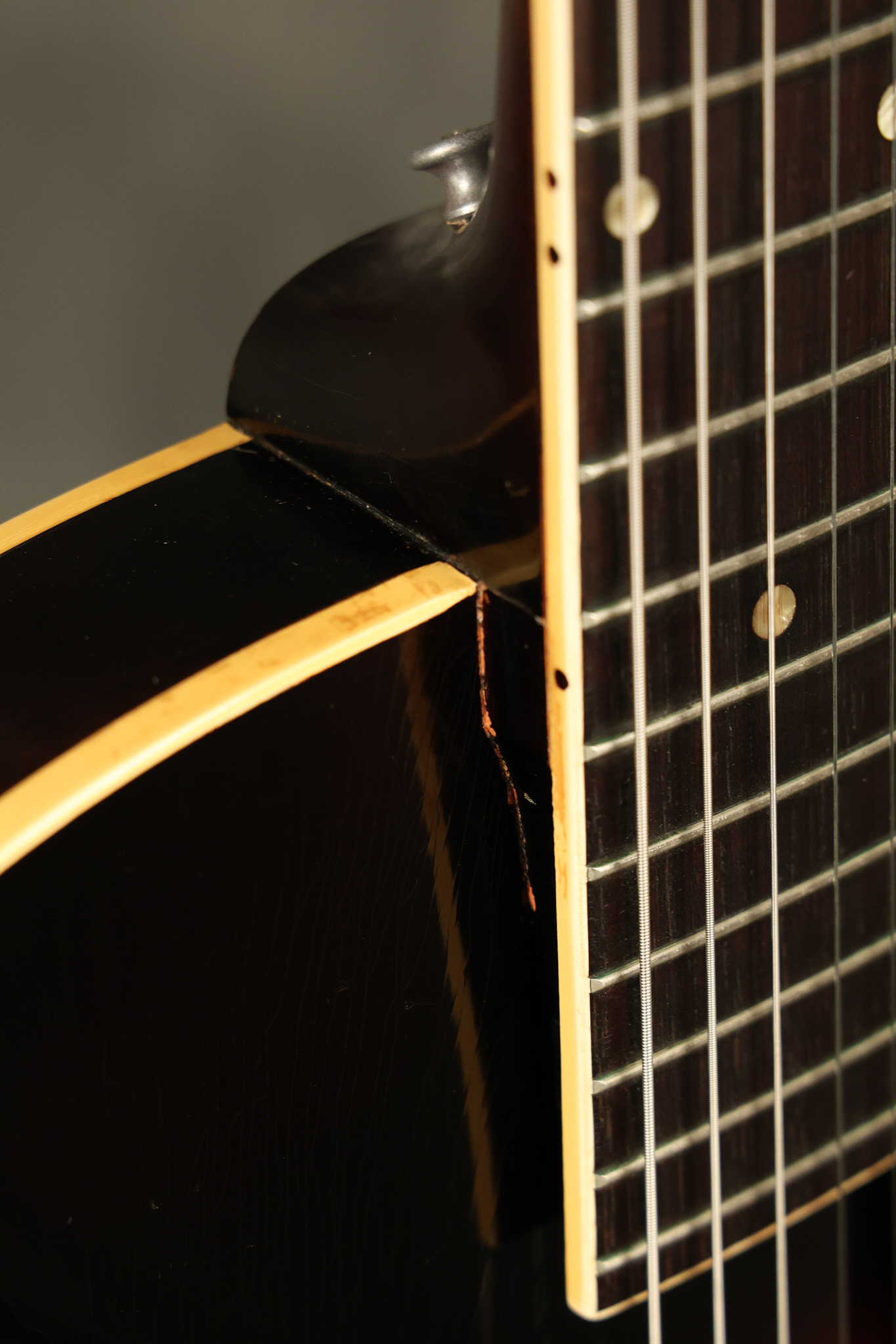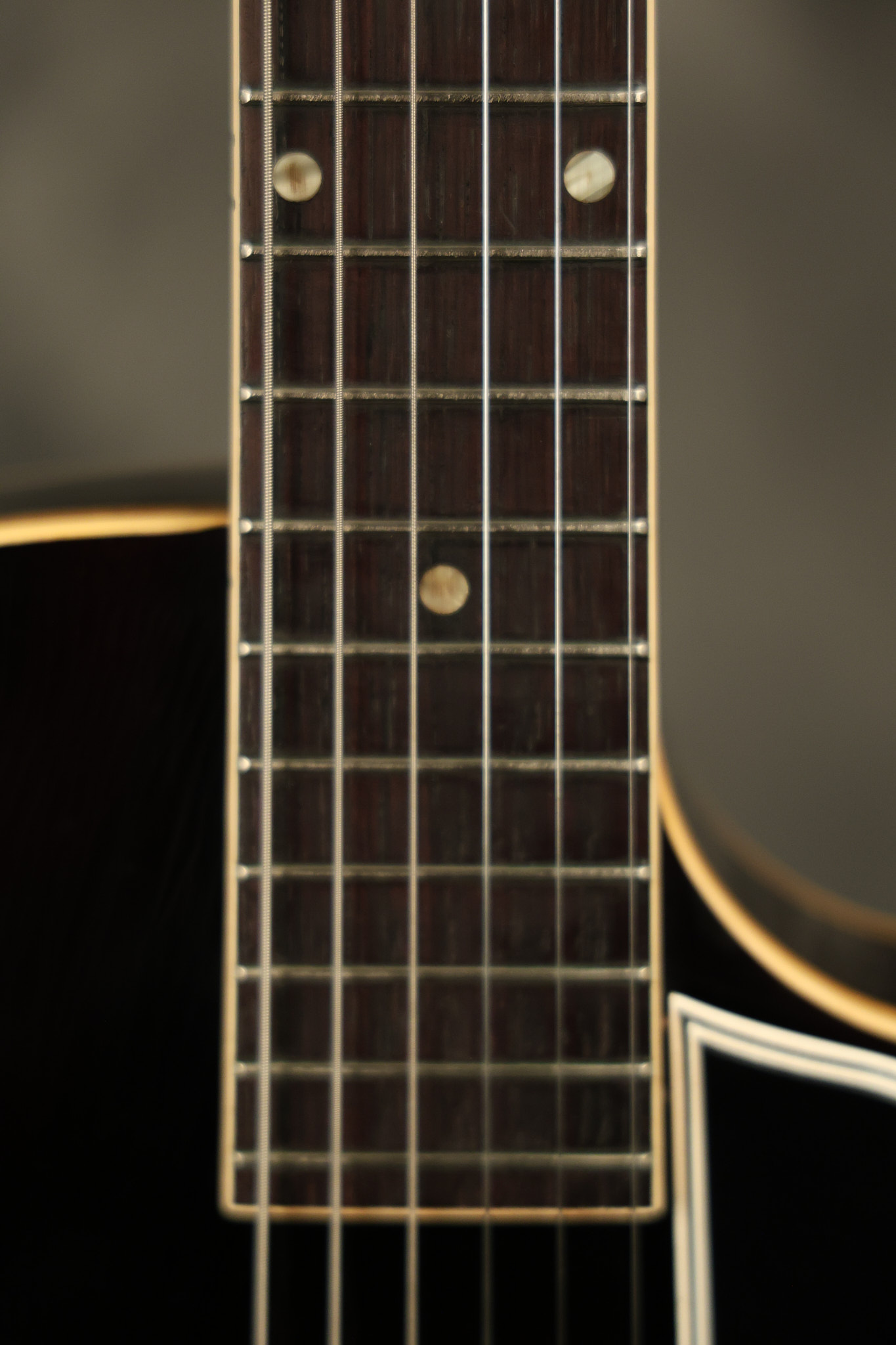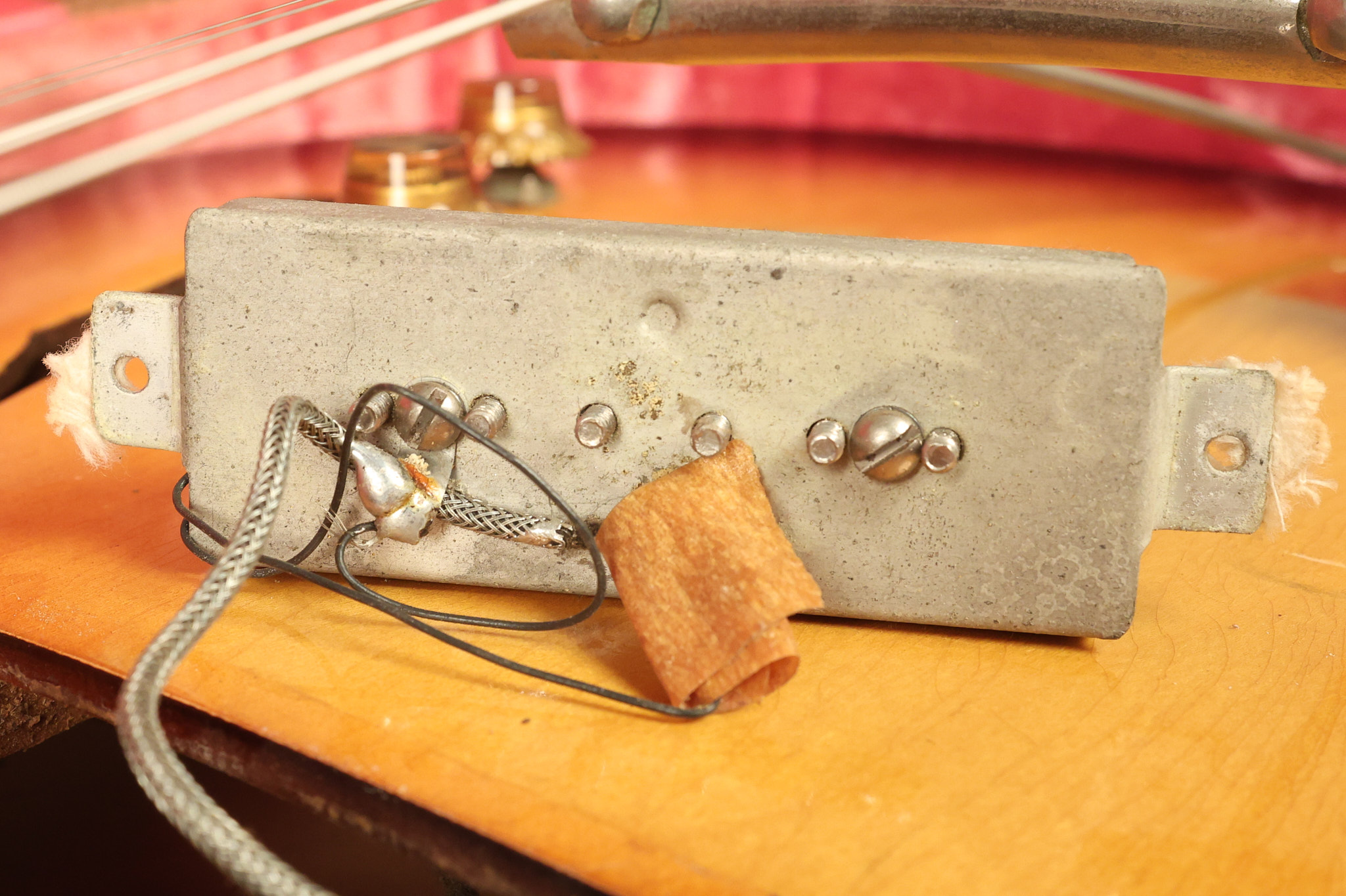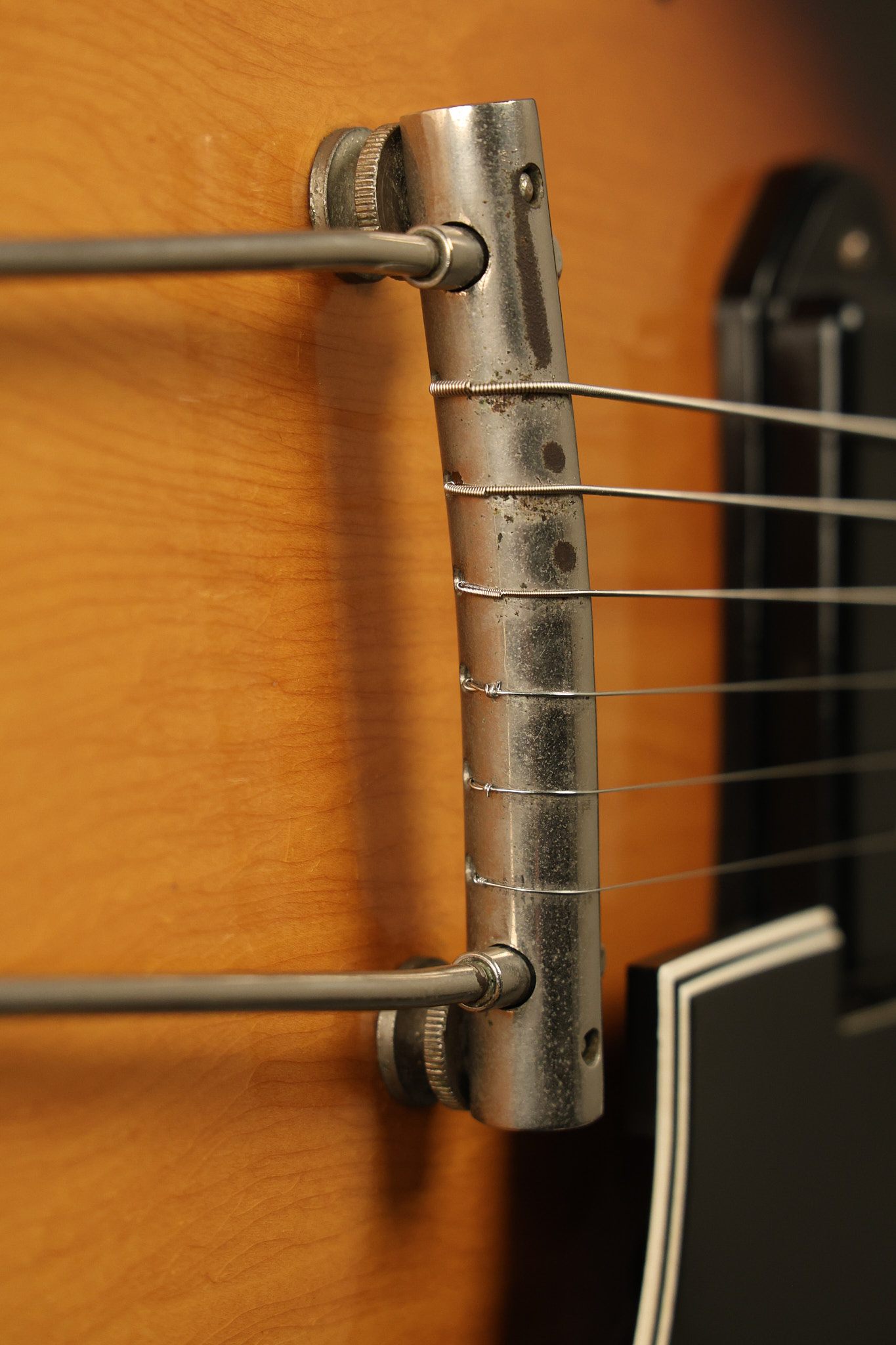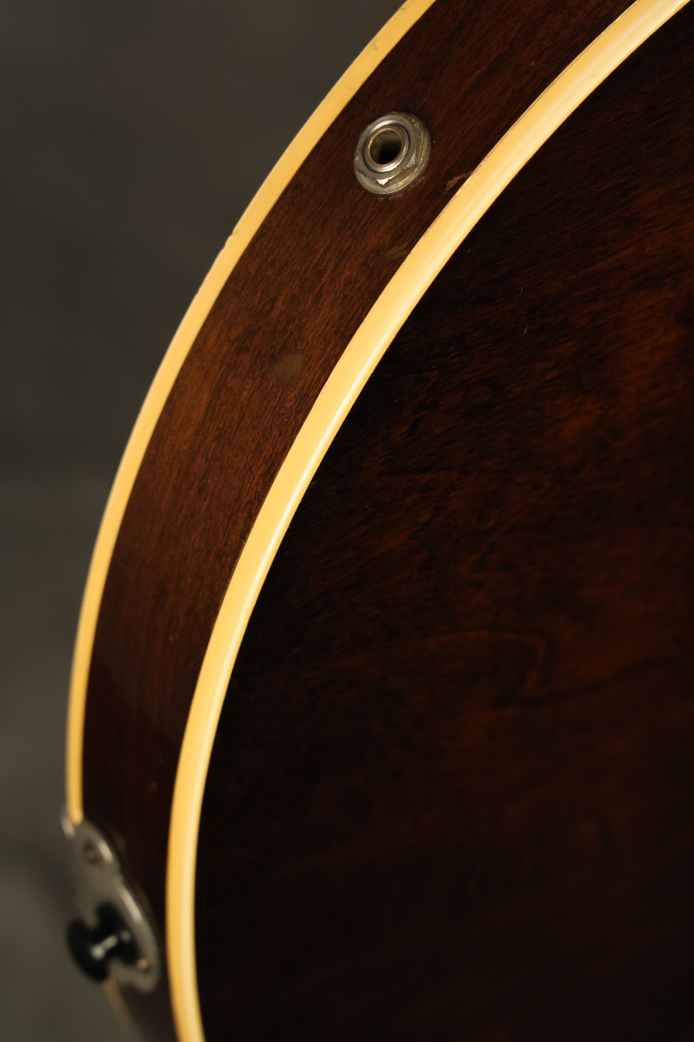 1956 Gibson ES-225 T in its original Sunburst finish. It has a great playing neck with worn, but good frets. The low E buzzes against the surface of the pickup on the last/highest fret. It's all original with the exception of the strap buttons, the buttons for the tuning keys and the screw and outer nut for the pickguard bracket. It's also 100% complete along with its original Brown hardshell case. This 225 looks great and has lots of nicks + dings with several being on the back of the neck near the 7th-10th fret area. There is a surface crack on the back of the body near the bass side edge of the lower bout along with lots of finish checking and other cosmetic wear. These are all cosmetic issues as everything remains structurally sound. All electronics work and sound great with its original P-90.