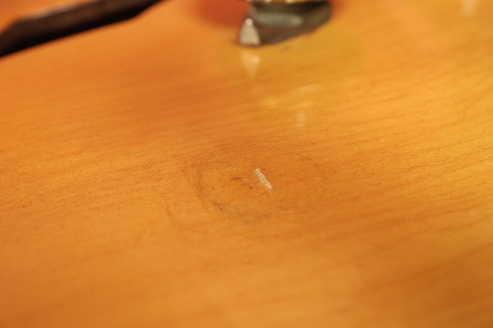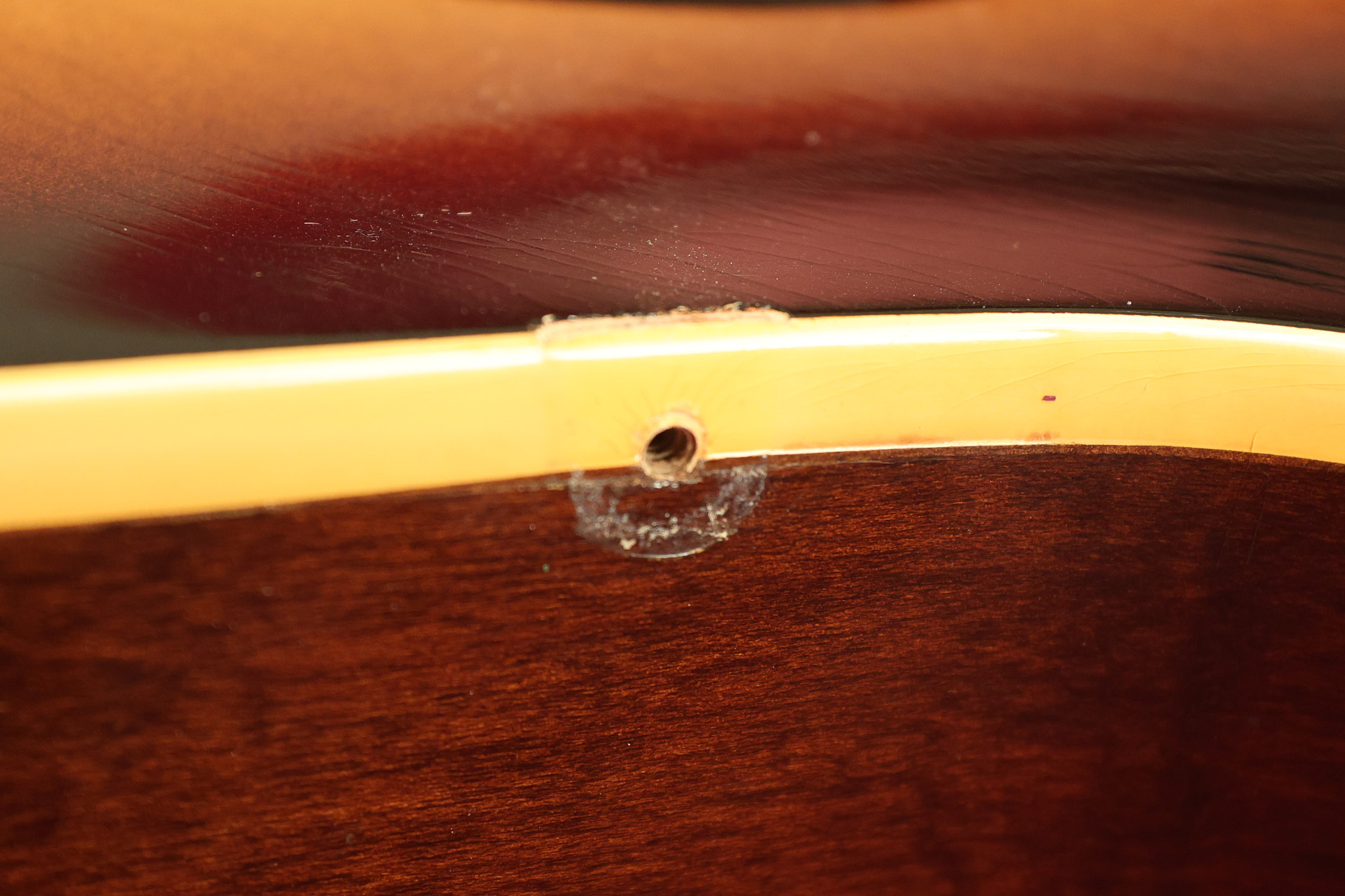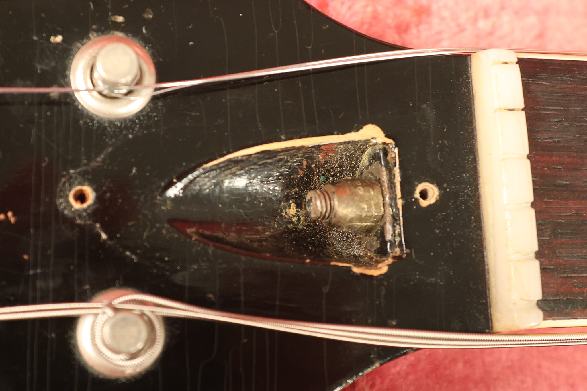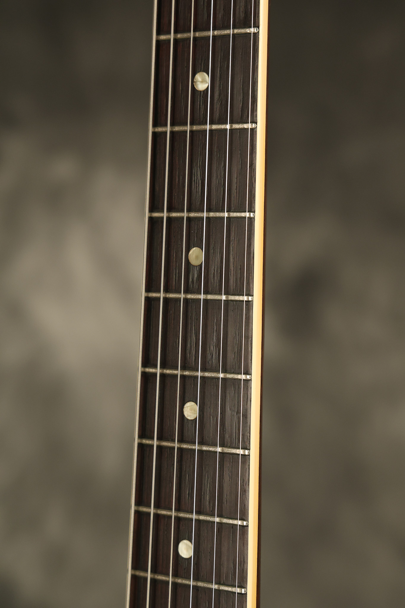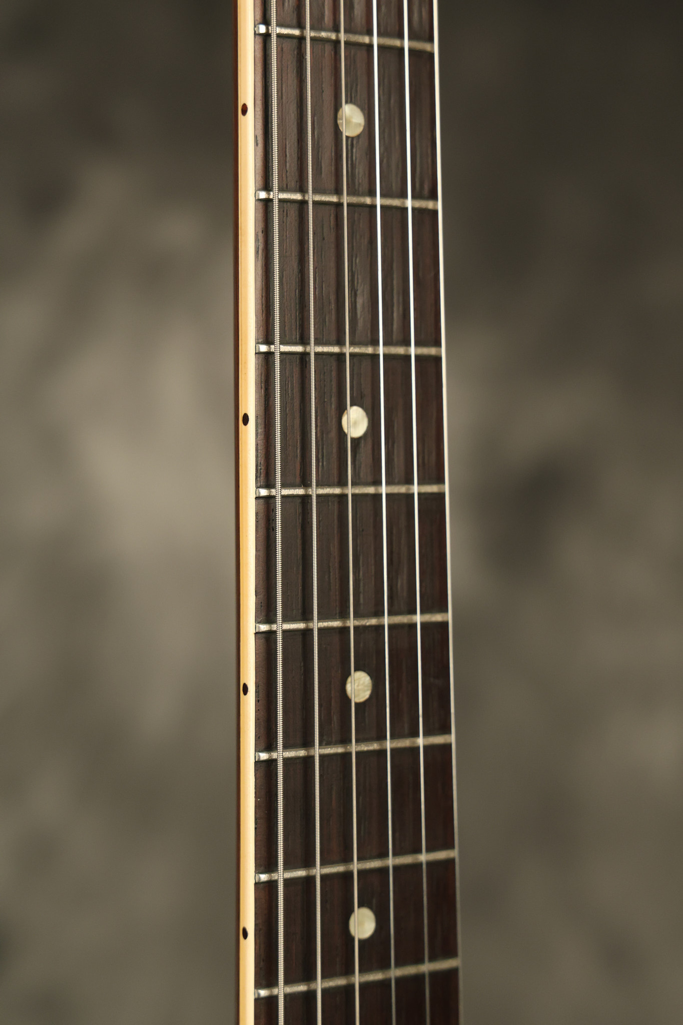 1956 Gibson ES-225 T in its original Sunburst finish. It has a great playing neck with worn, but good frets. The low E buzzes against the surface of the pickup on the last/highest fret. It's all original with the exception of the strap buttons, the buttons for the tuning keys and the screw and outer nut for the pickguard bracket. It's also 100% complete along with its original Brown hardshell case. This 225 looks great and has lots of nicks + dings with several being on the back of the neck near the 7th-10th fret area. There is a surface crack on the back of the body near the bass side edge of the lower bout along with lots of finish checking and other cosmetic wear. These are all cosmetic issues as everything remains structurally sound. All electronics work and sound great with its original P-90.