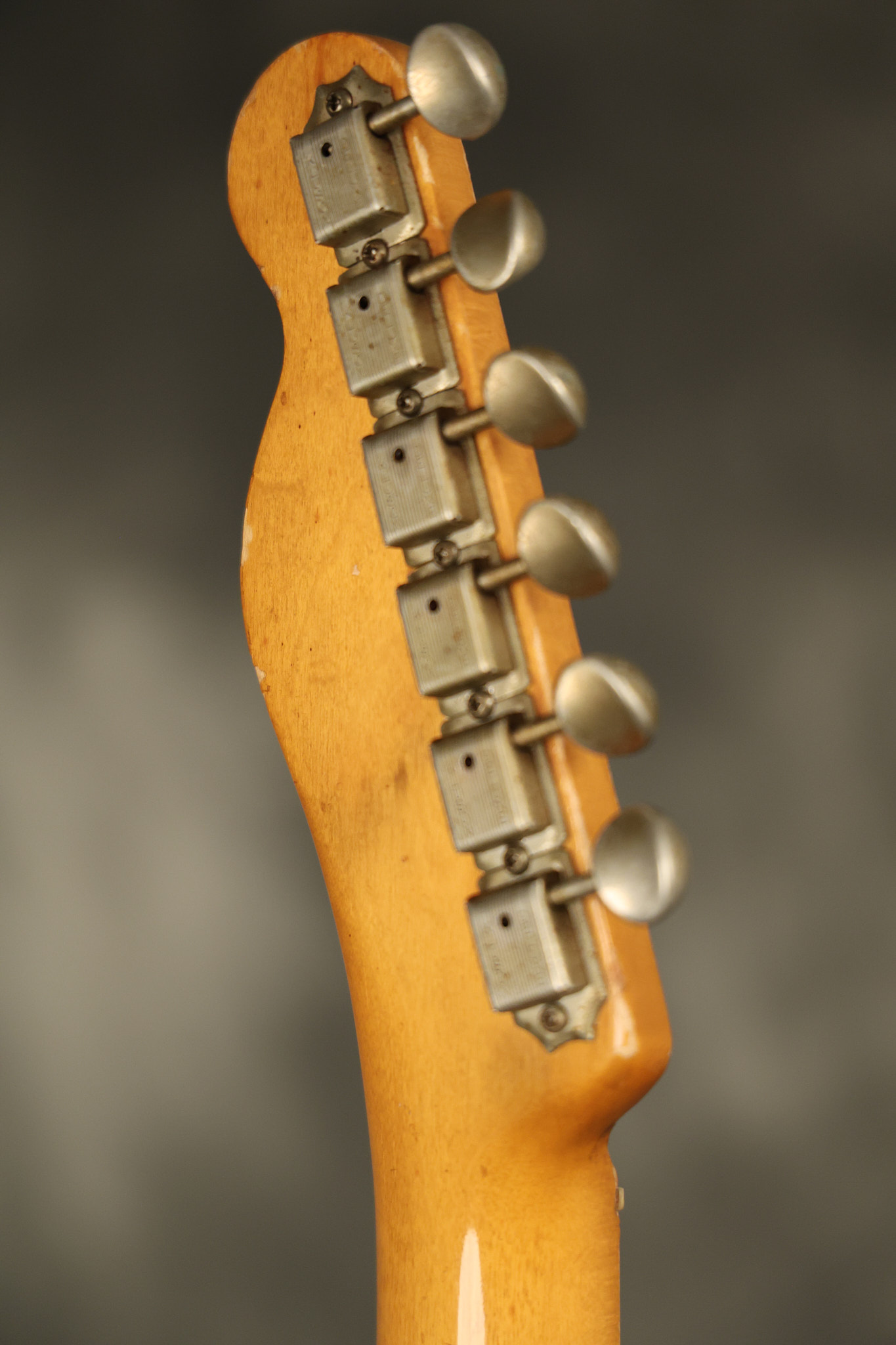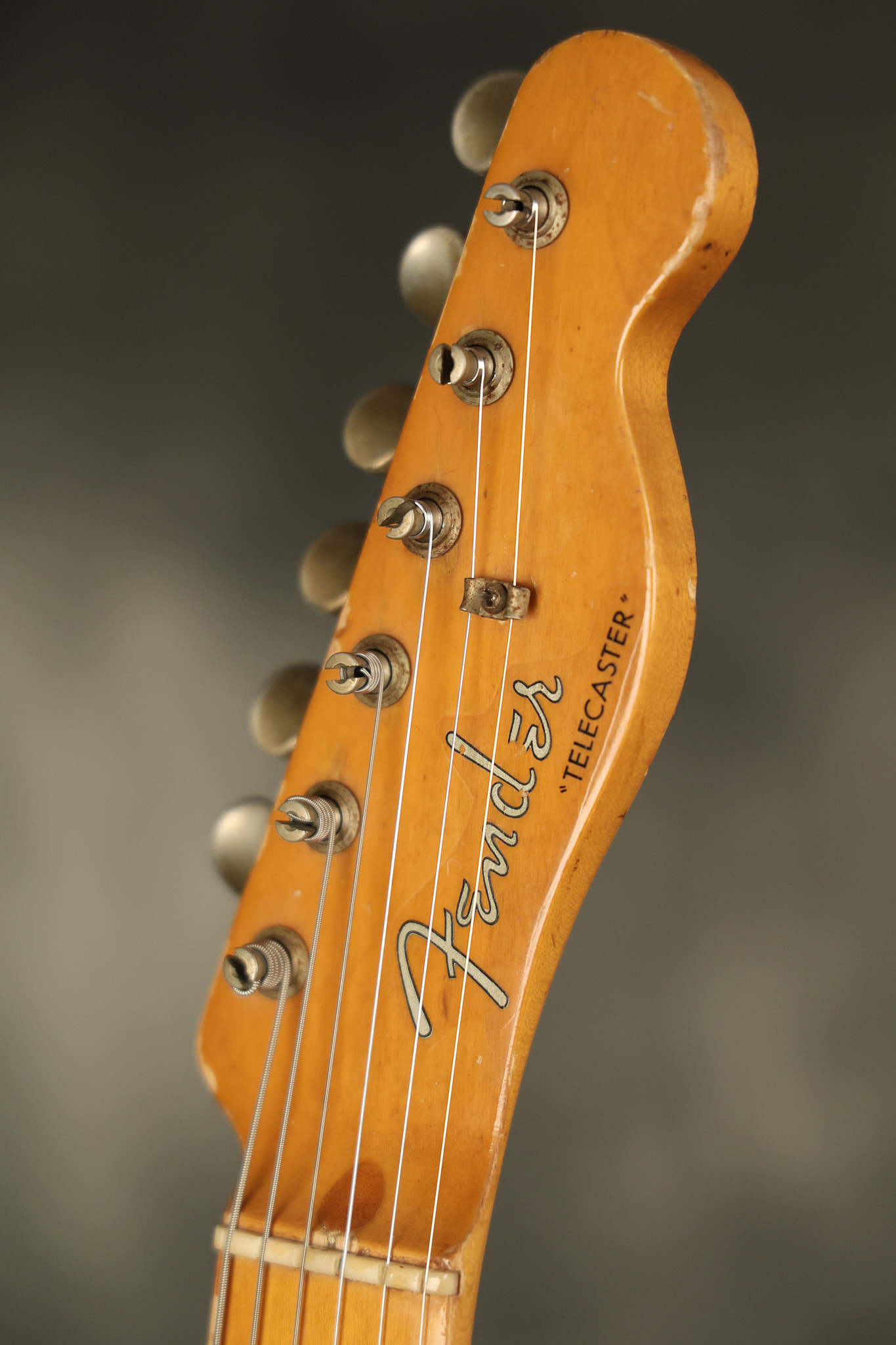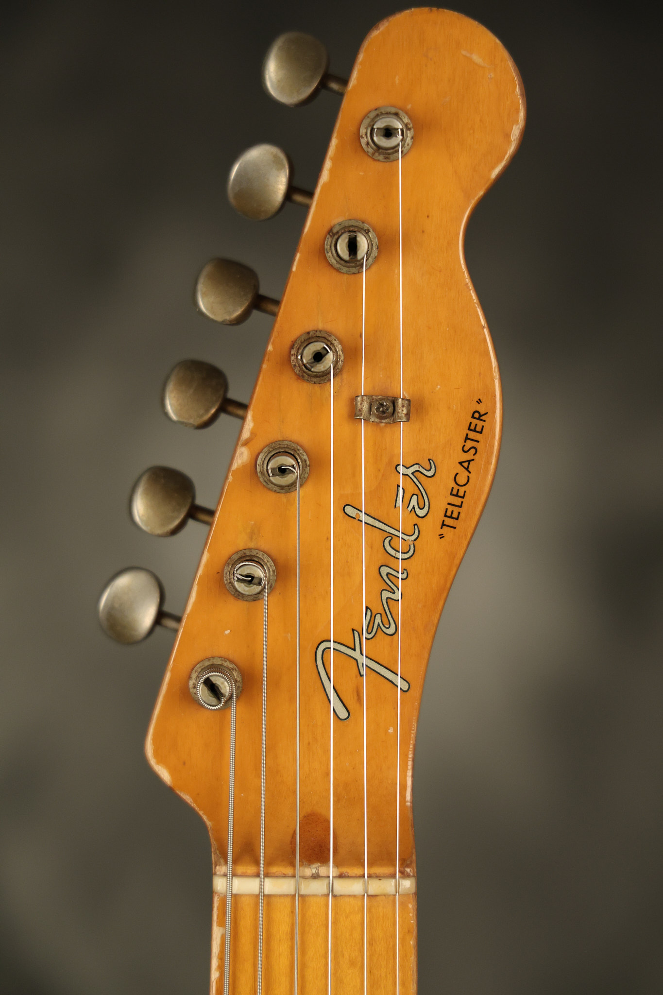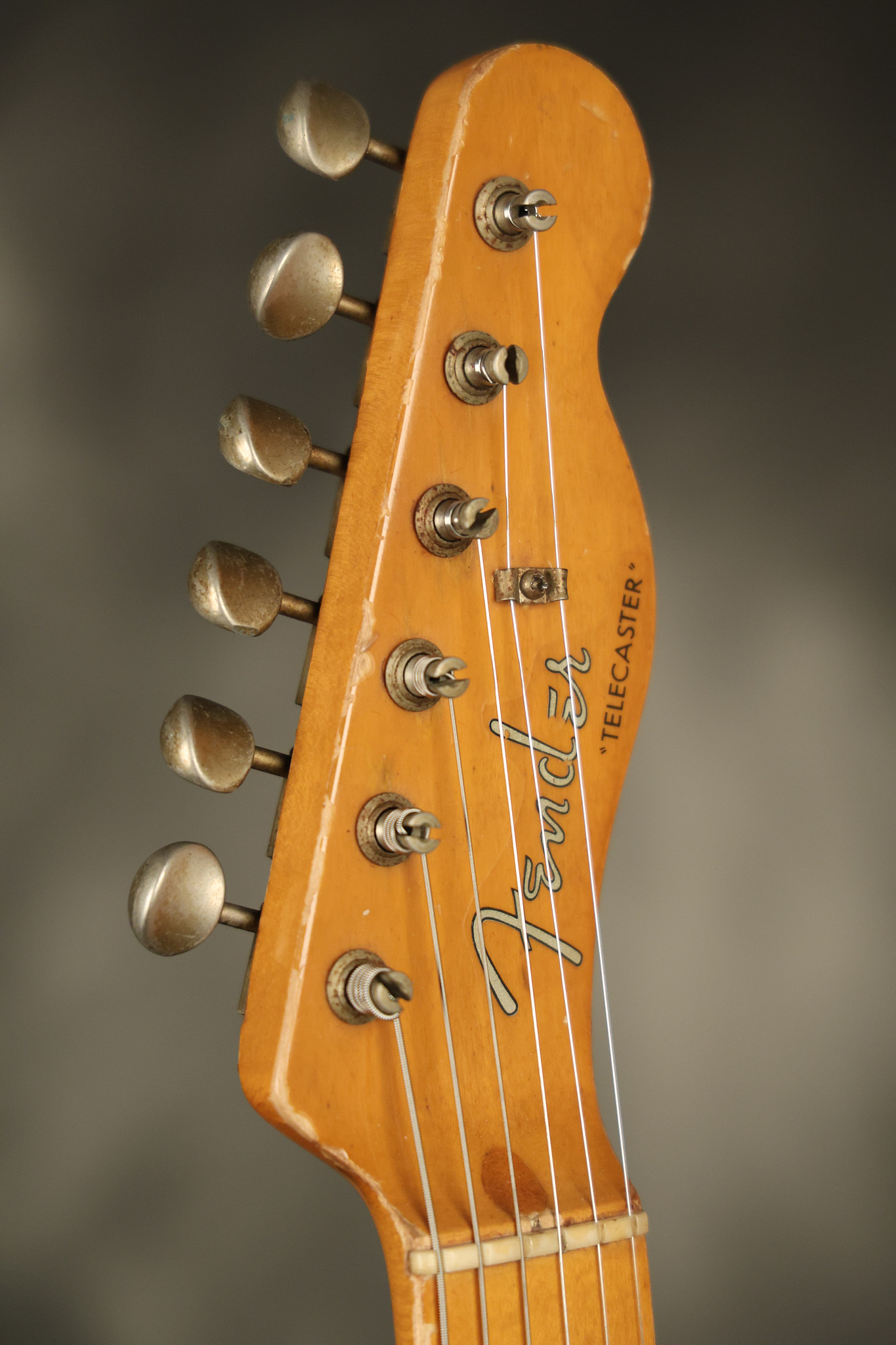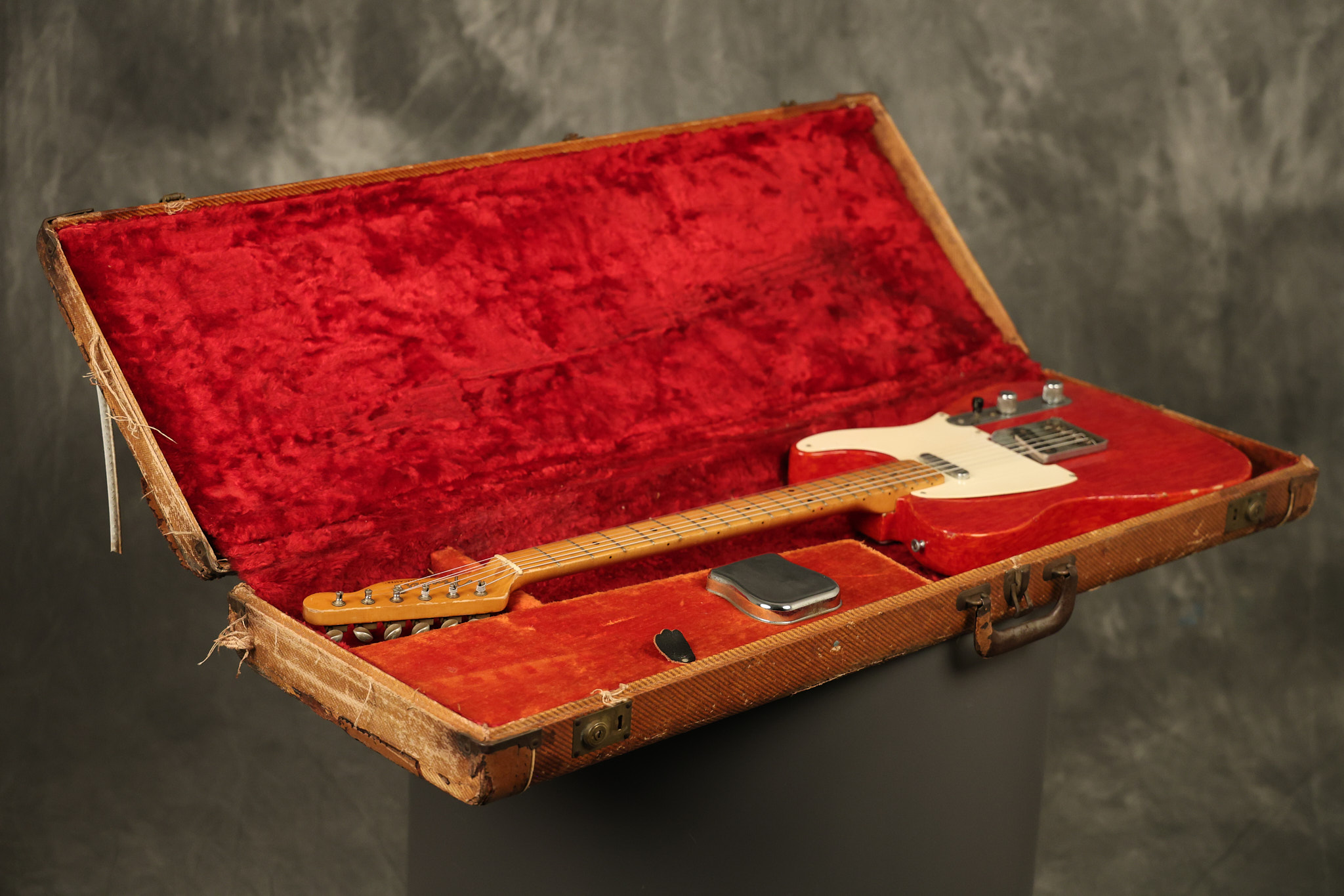 1957 Fender Telecaster with a refinished neck and a poorly refinished body. It has a great playing neck with good frets as it has been refretted. Changed parts include the tuning keys, switch, one capacitor (one is missing), the nut and some of the screws. The original pickugard has been oversprayed and has a crack through one corner. The neck position pickup has some traces of blue on the underside and on the original wires which have been extended. The bridge position pickup has been rewound. All electronics work and sound great. The tone pot sounds a little dirty when it's turned all the way down. The lower screw for the control cavity does not have enough wood on the edge of the cavity to firmly grab, so it is rather loose. There are lots of nicks + dings, finish cracks and other cosmetic wear. The guitar itself remains structurally sound. The weight is 7 lbs. 3.4 oz. The original tweed hardshell case is included, but it is in poor condition with patched areas, one broken latch and the side pocket and neck rest was replaced with one from a later 1960's Fender case.