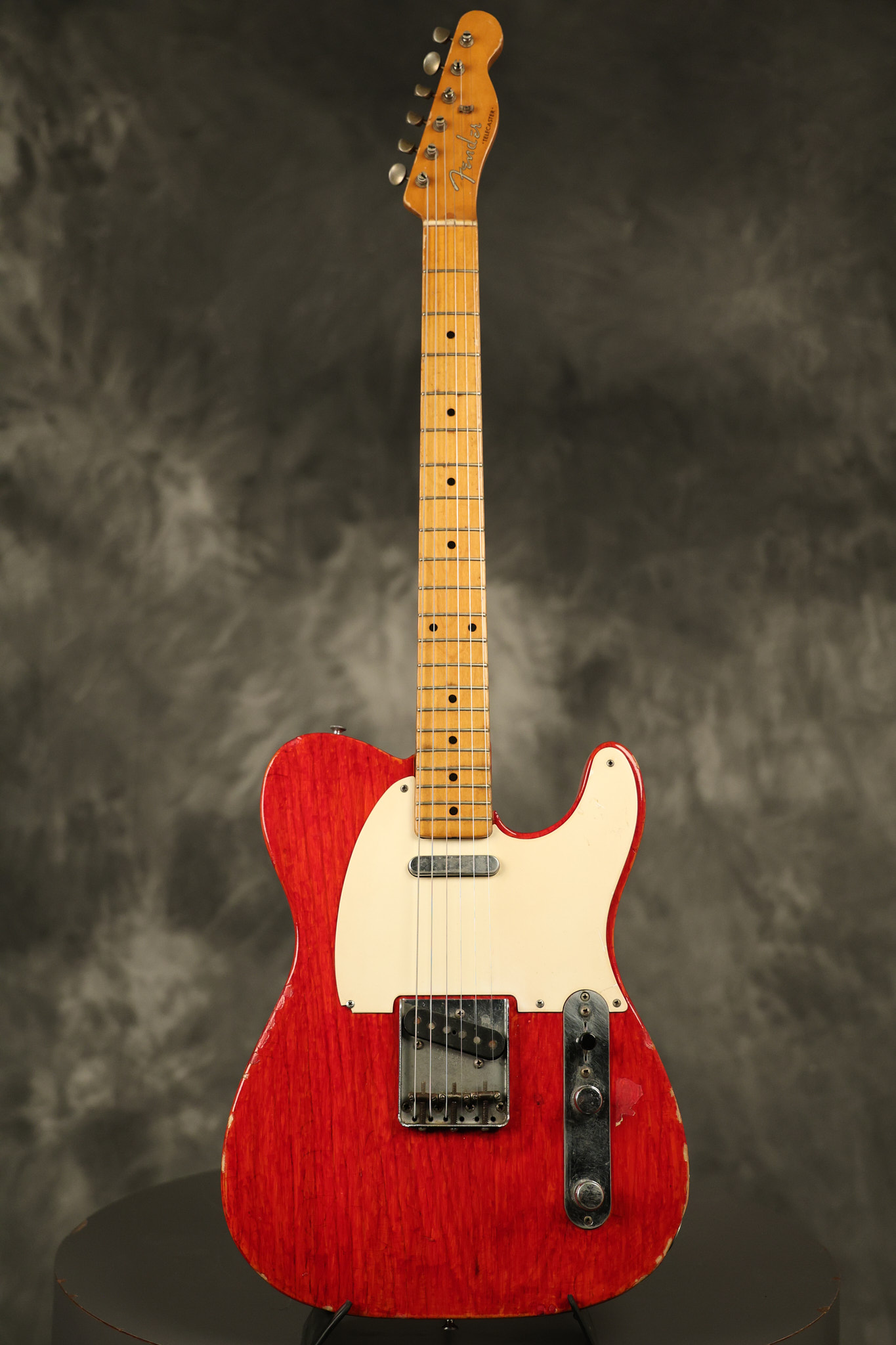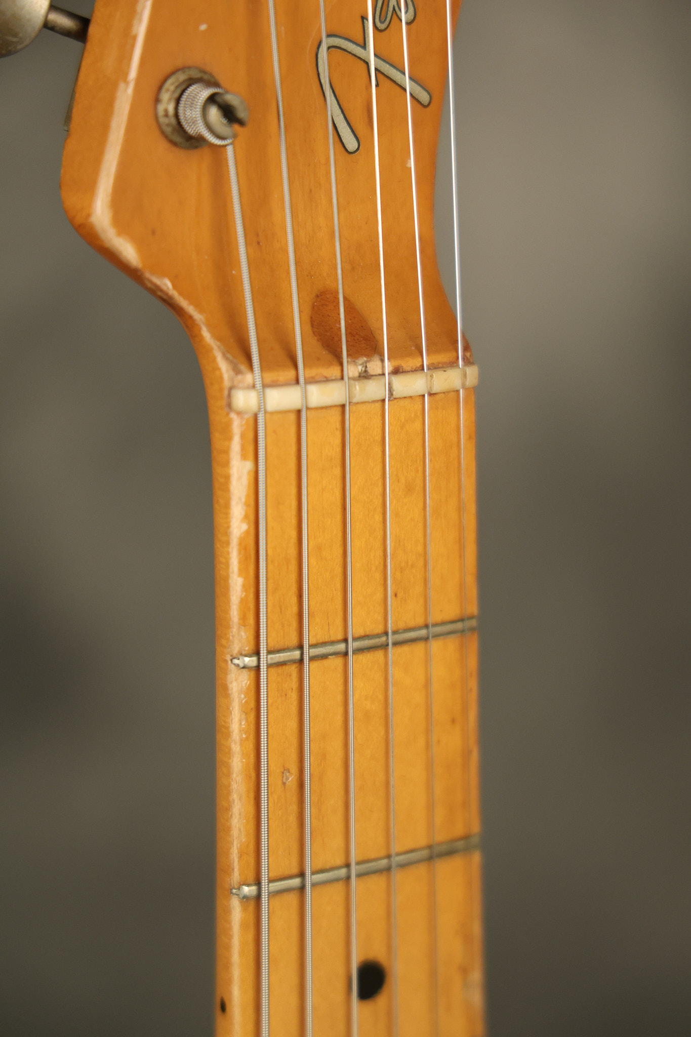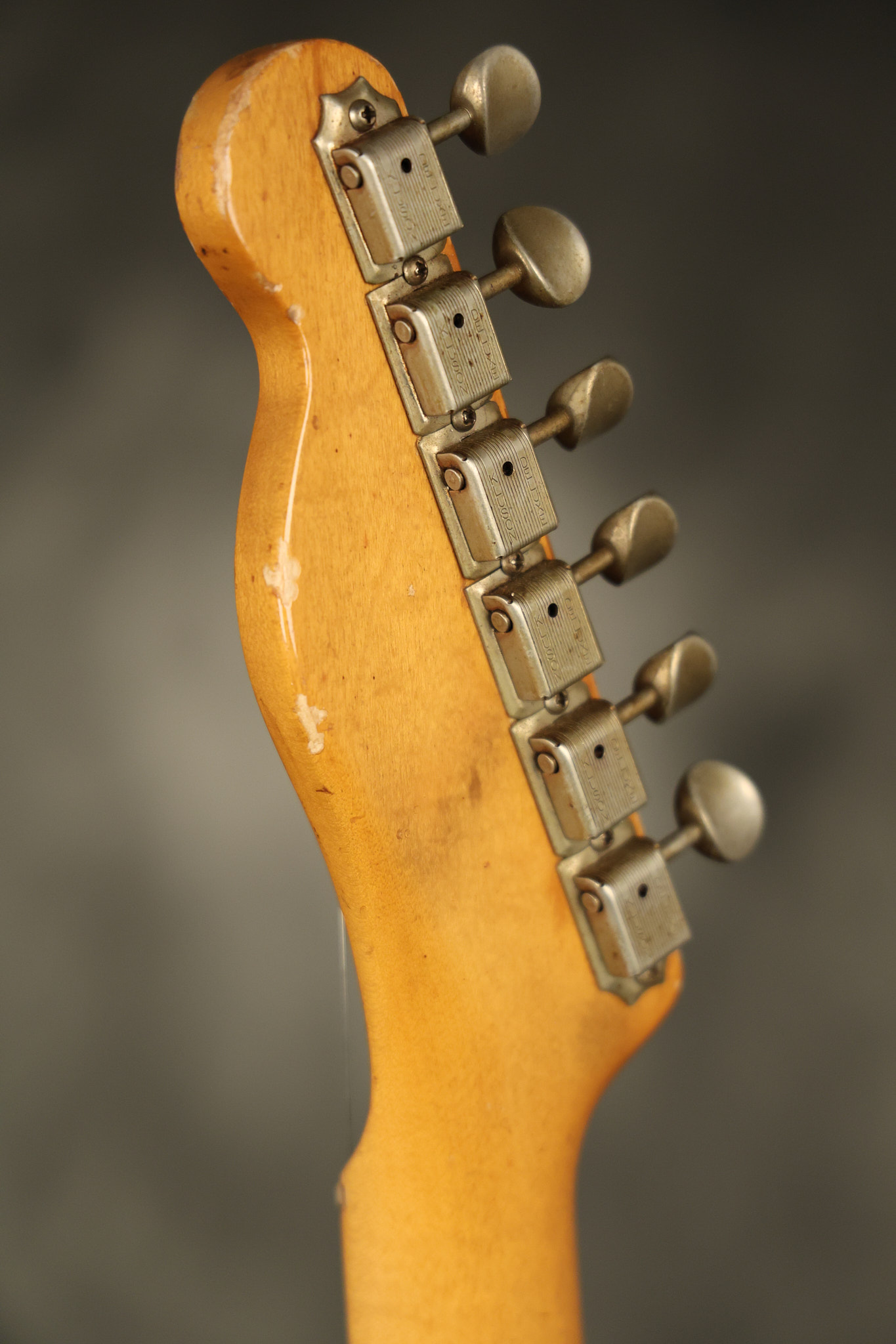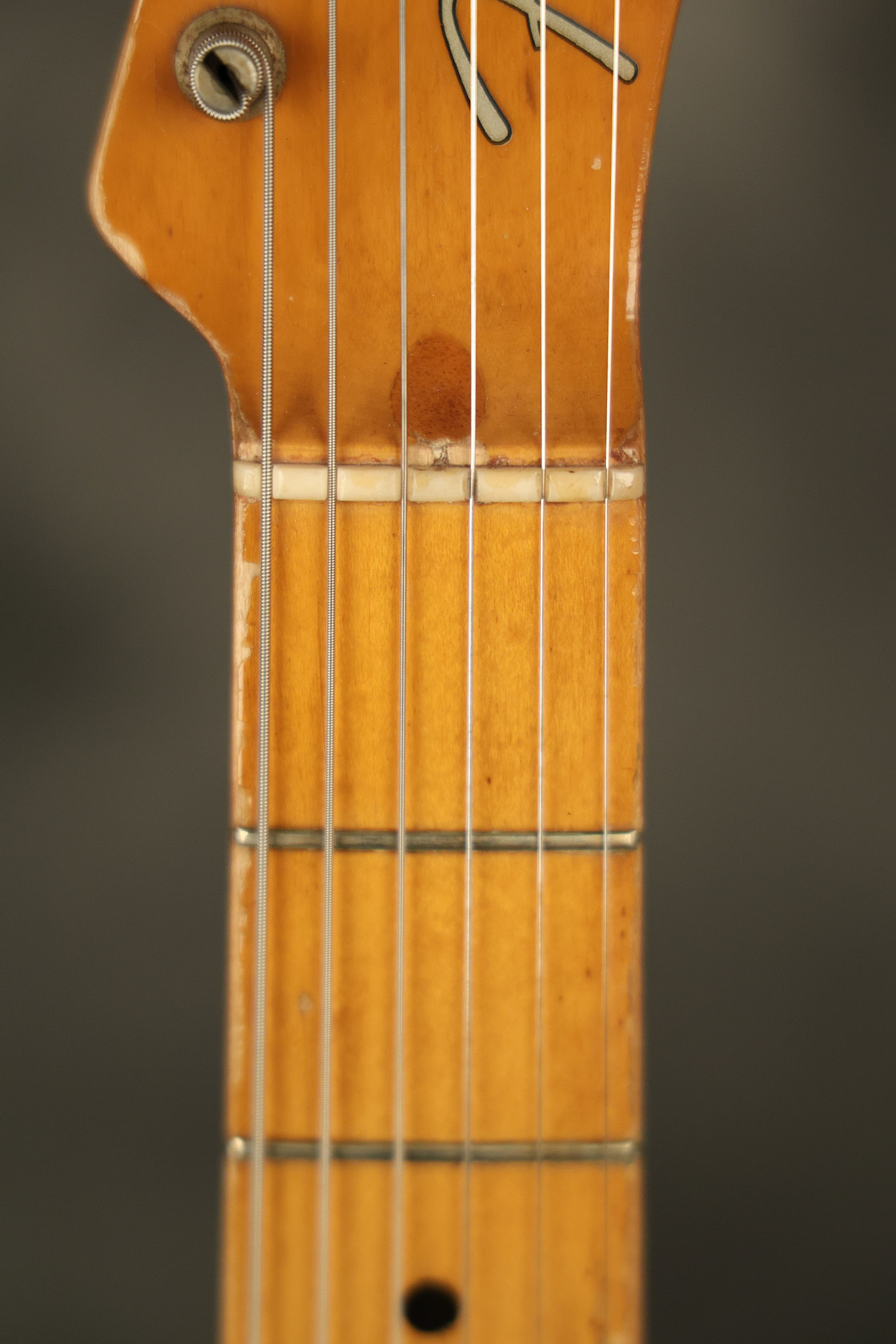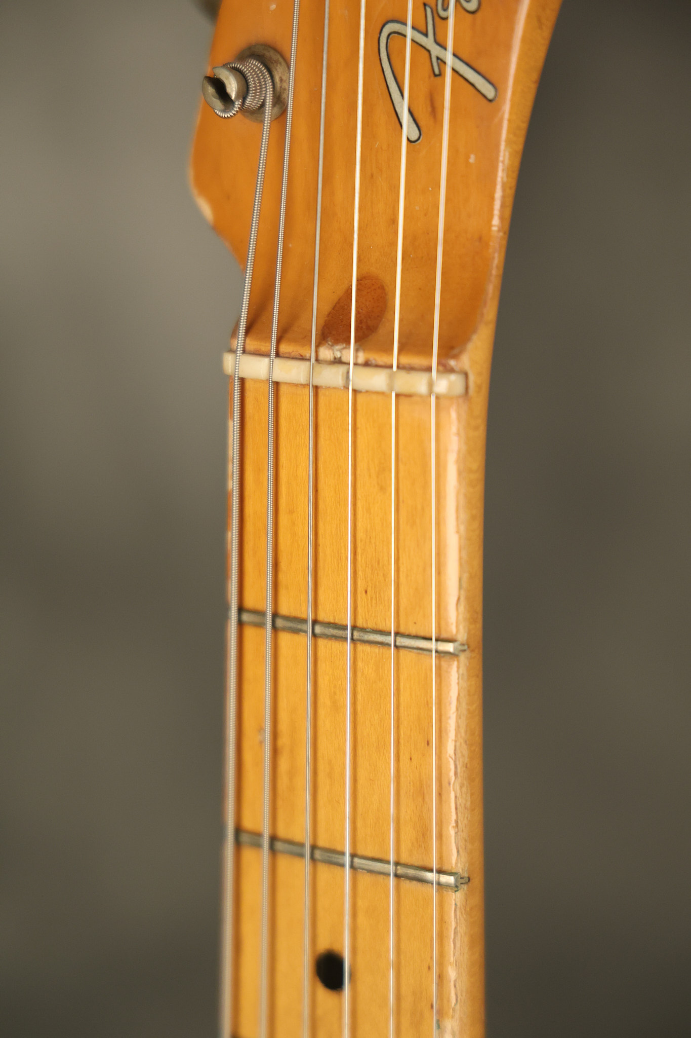 1957 Fender Telecaster with a refinished neck and a poorly refinished body. It has a great playing neck with good frets as it has been refretted. Changed parts include the tuning keys, switch, one capacitor (one is missing), the nut and some of the screws. The original pickugard has been oversprayed and has a crack through one corner. The neck position pickup has some traces of blue on the underside and on the original wires which have been extended. The bridge position pickup has been rewound. All electronics work and sound great. The tone pot sounds a little dirty when it's turned all the way down. The lower screw for the control cavity does not have enough wood on the edge of the cavity to firmly grab, so it is rather loose. There are lots of nicks + dings, finish cracks and other cosmetic wear. The guitar itself remains structurally sound. The weight is 7 lbs. 3.4 oz. The original tweed hardshell case is included, but it is in poor condition with patched areas, one broken latch and the side pocket and neck rest was replaced with one from a later 1960's Fender case.