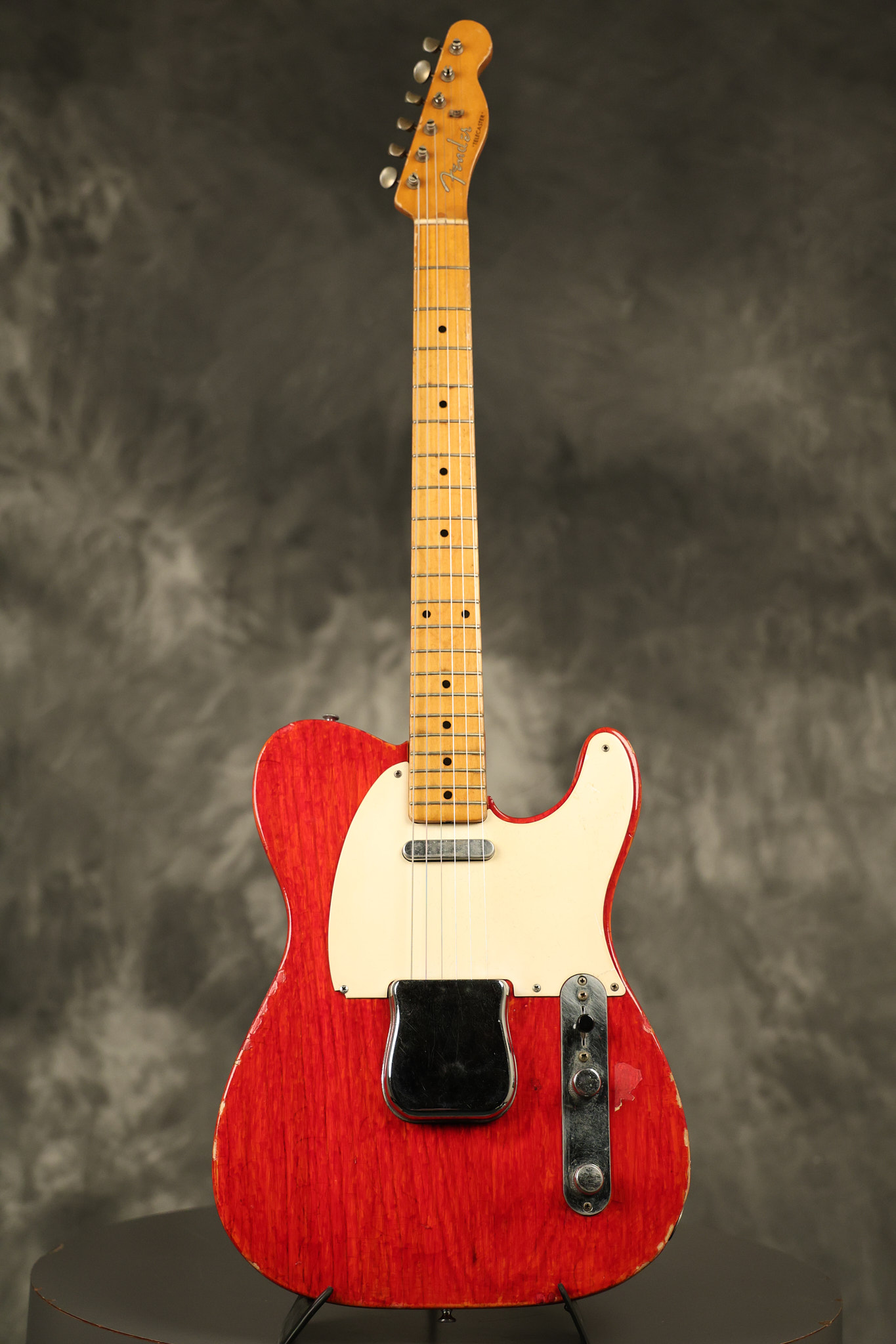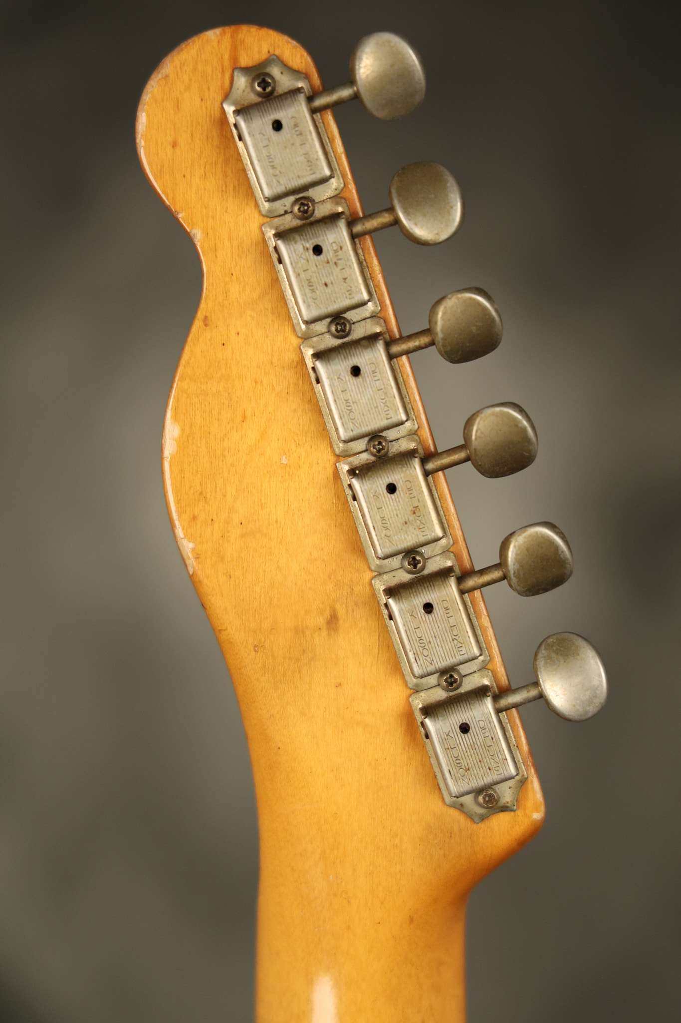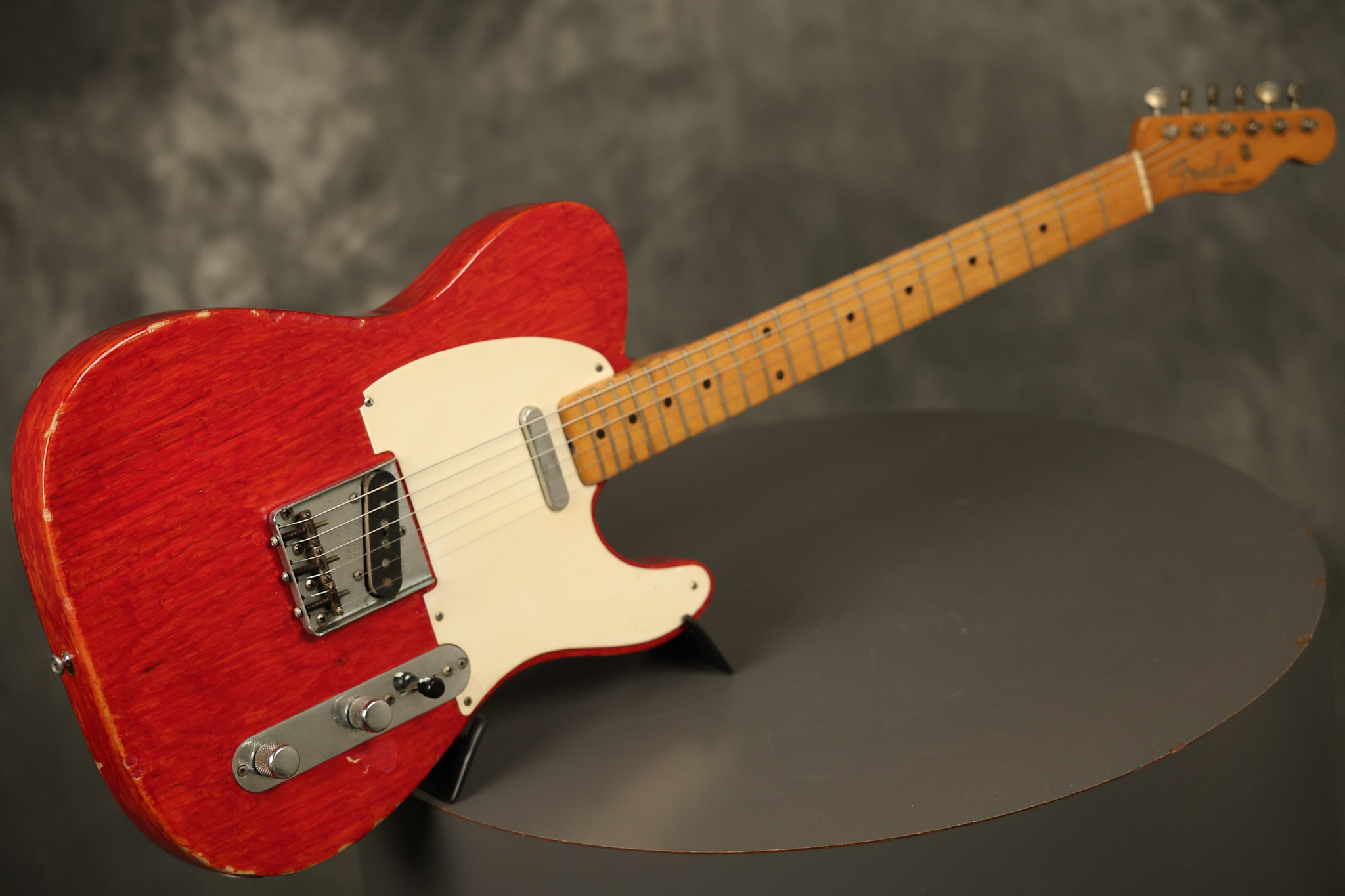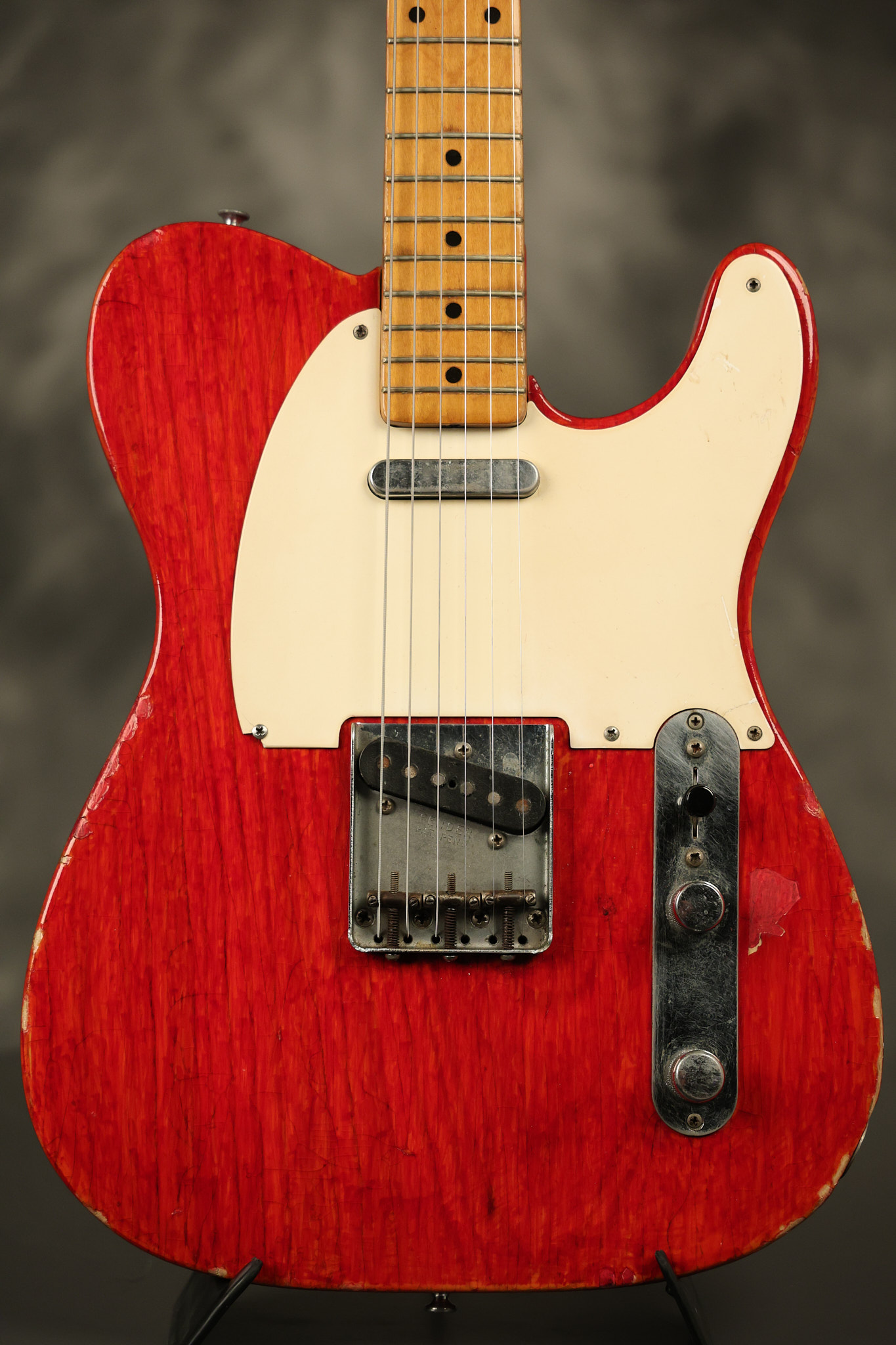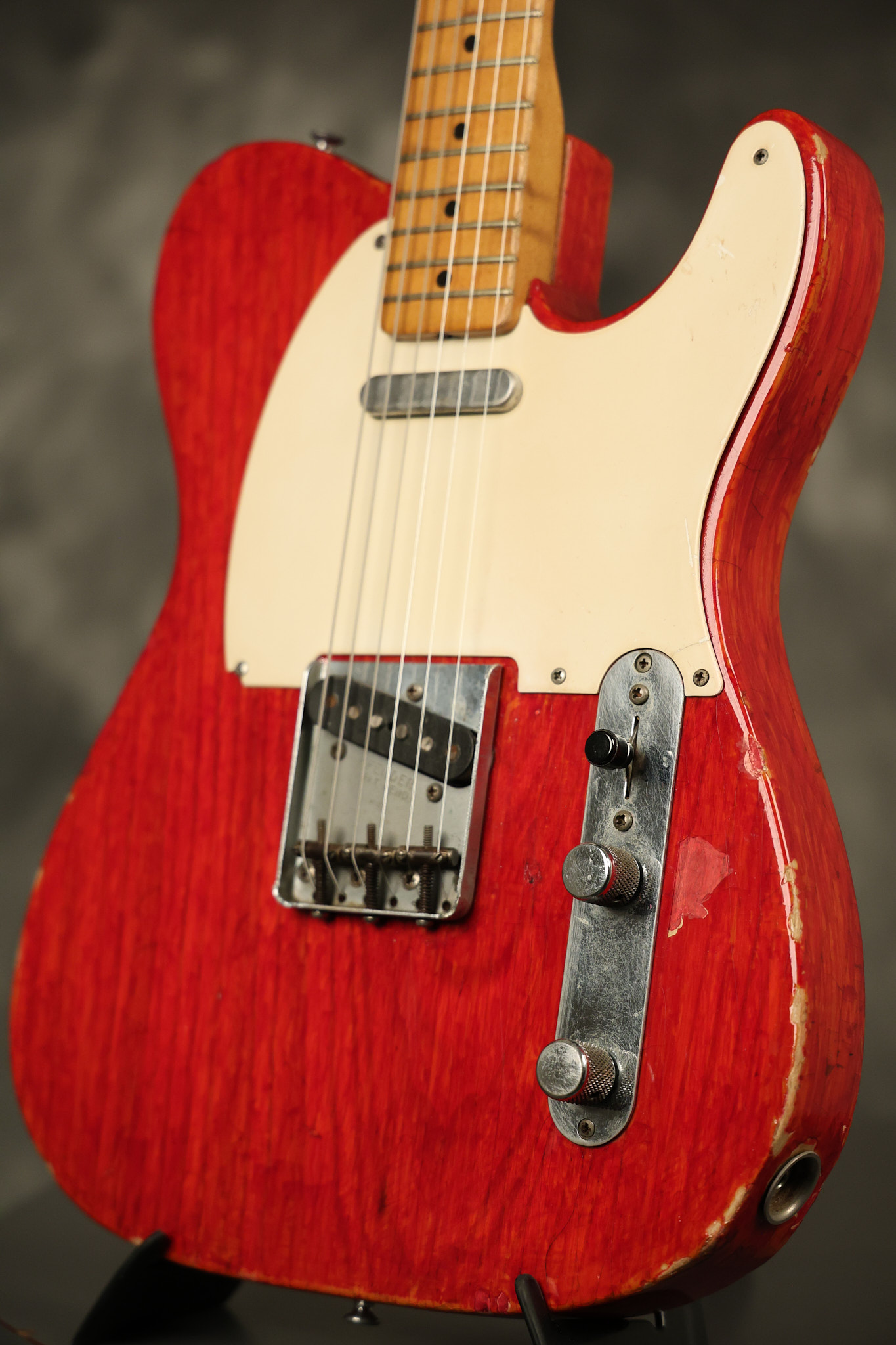 1957 Fender Telecaster with a refinished neck and a poorly refinished body. It has a great playing neck with good frets as it has been refretted. Changed parts include the tuning keys, switch, one capacitor (one is missing), the nut and some of the screws. The original pickugard has been oversprayed and has a crack through one corner. The neck position pickup has some traces of blue on the underside and on the original wires which have been extended. The bridge position pickup has been rewound. All electronics work and sound great. The tone pot sounds a little dirty when it's turned all the way down. The lower screw for the control cavity does not have enough wood on the edge of the cavity to firmly grab, so it is rather loose. There are lots of nicks + dings, finish cracks and other cosmetic wear. The guitar itself remains structurally sound. The weight is 7 lbs. 3.4 oz. The original tweed hardshell case is included, but it is in poor condition with patched areas, one broken latch and the side pocket and neck rest was replaced with one from a later 1960's Fender case.