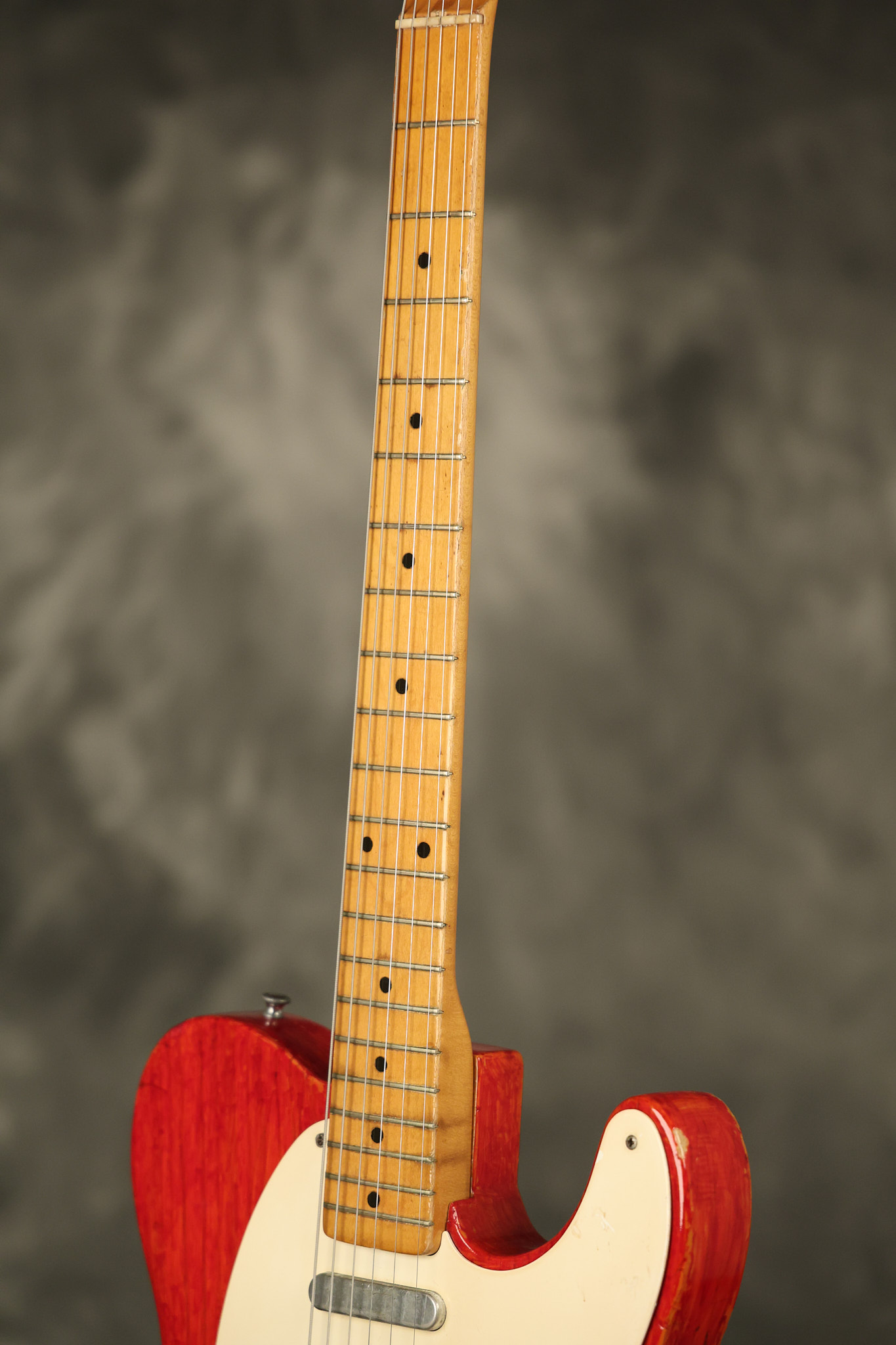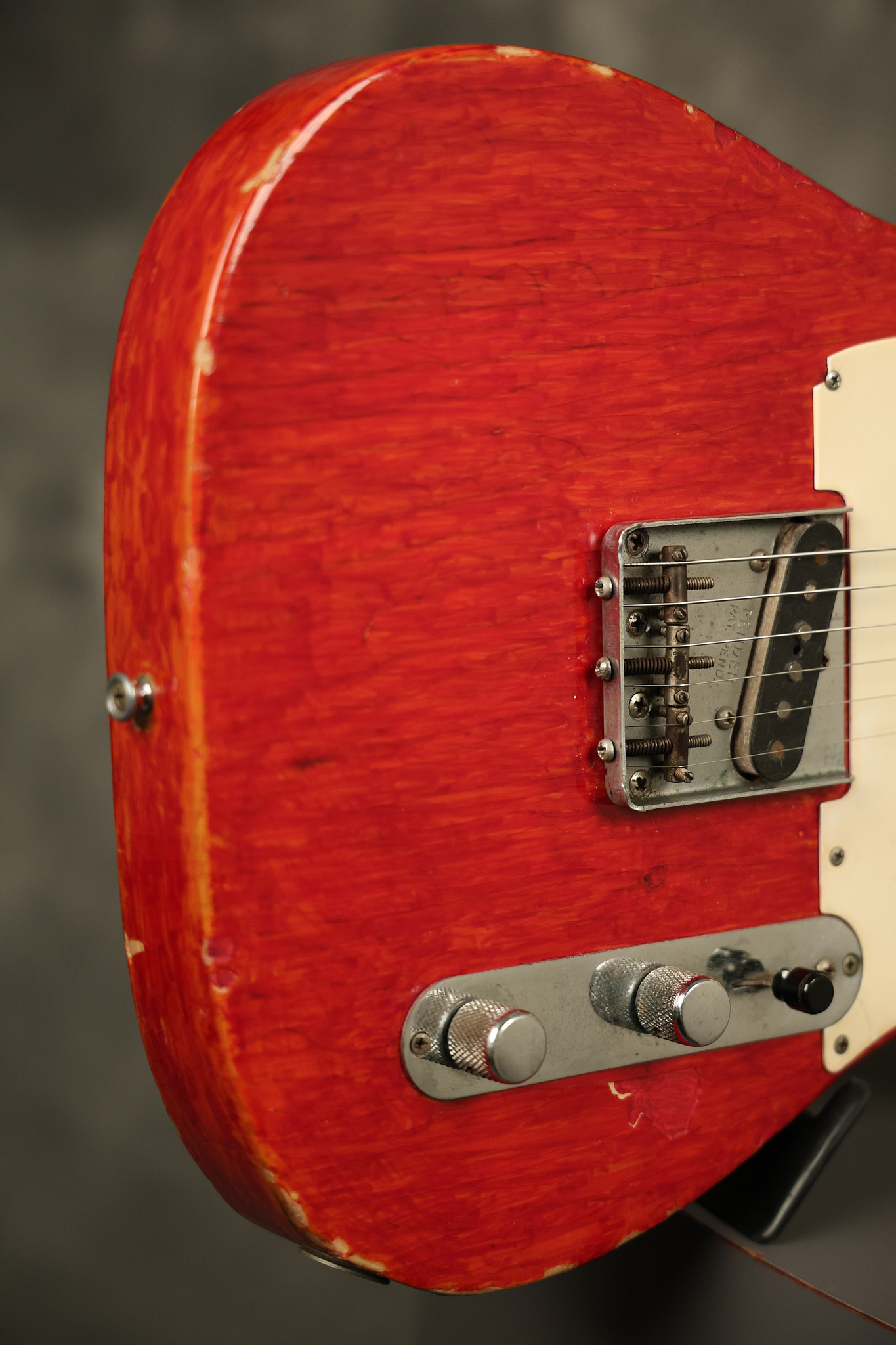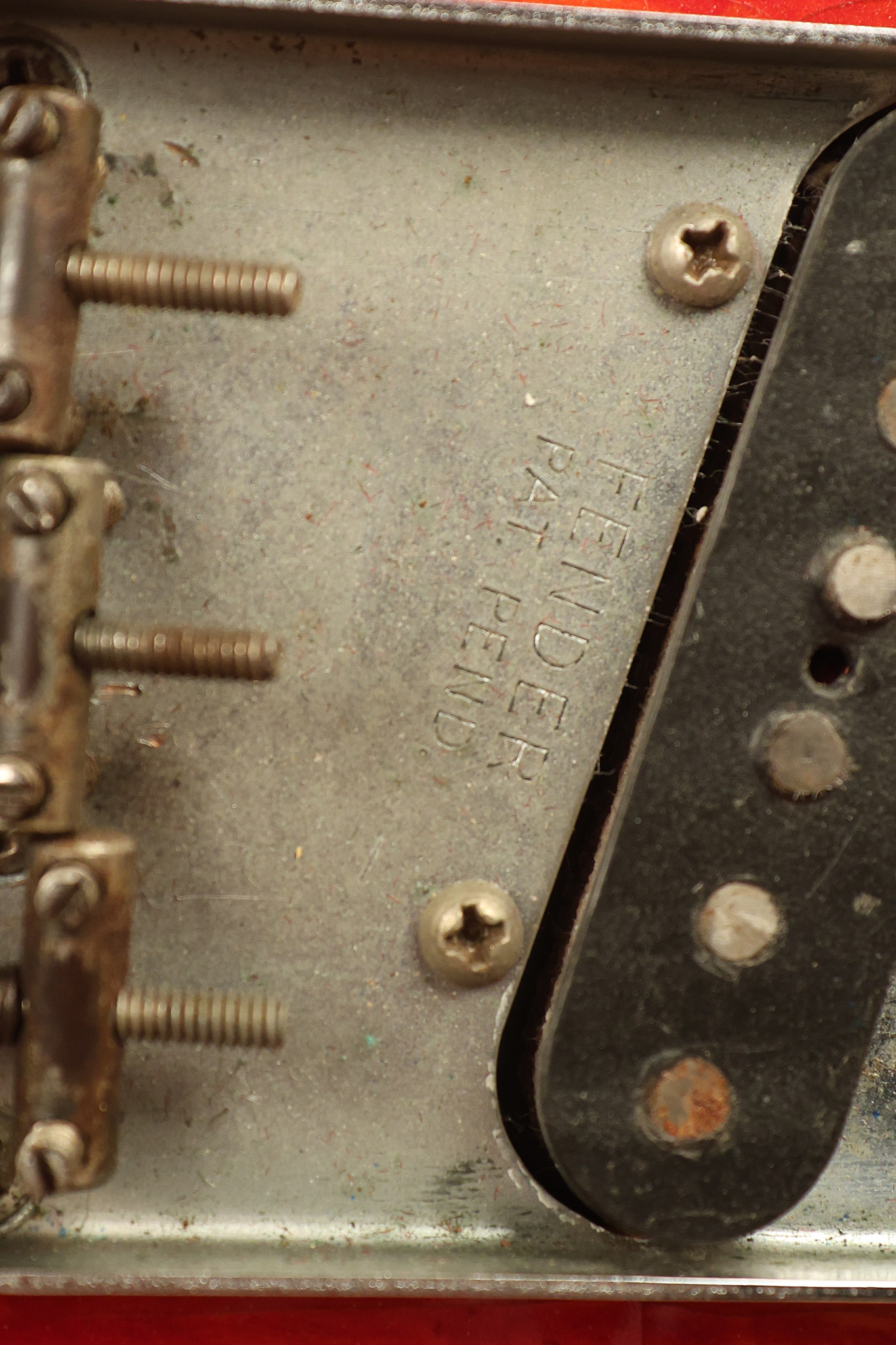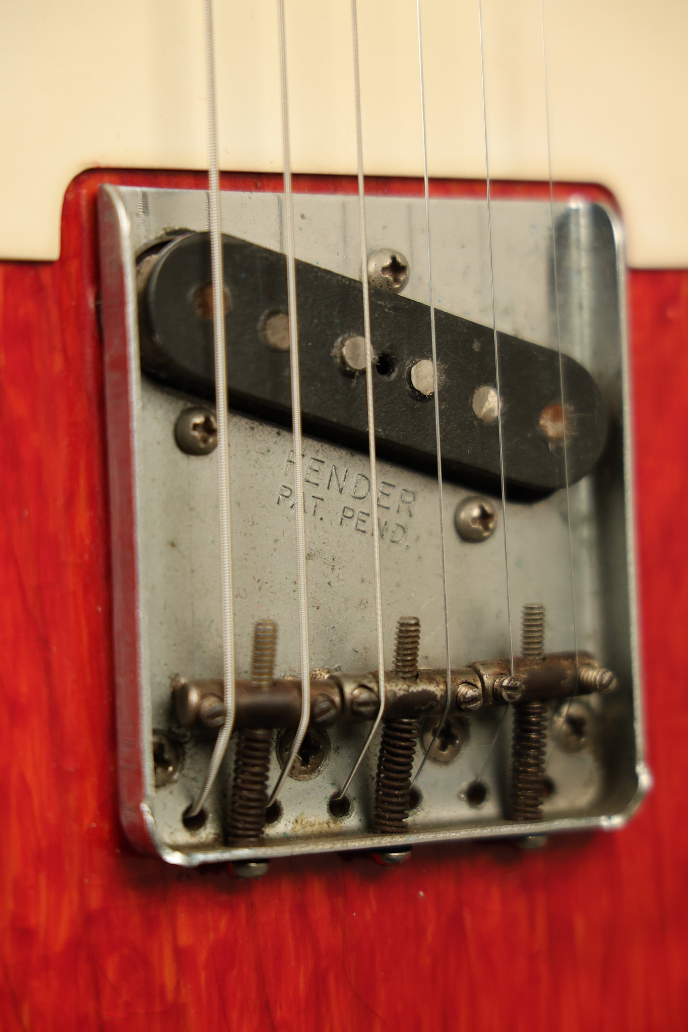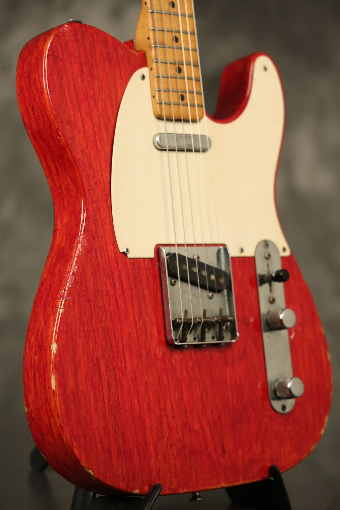 1957 Fender Telecaster with a refinished neck and a poorly refinished body. It has a great playing neck with good frets as it has been refretted. Changed parts include the tuning keys, switch, one capacitor (one is missing), the nut and some of the screws. The original pickugard has been oversprayed and has a crack through one corner. The neck position pickup has some traces of blue on the underside and on the original wires which have been extended. The bridge position pickup has been rewound. All electronics work and sound great. The tone pot sounds a little dirty when it's turned all the way down. The lower screw for the control cavity does not have enough wood on the edge of the cavity to firmly grab, so it is rather loose. There are lots of nicks + dings, finish cracks and other cosmetic wear. The guitar itself remains structurally sound. The weight is 7 lbs. 3.4 oz. The original tweed hardshell case is included, but it is in poor condition with patched areas, one broken latch and the side pocket and neck rest was replaced with one from a later 1960's Fender case.