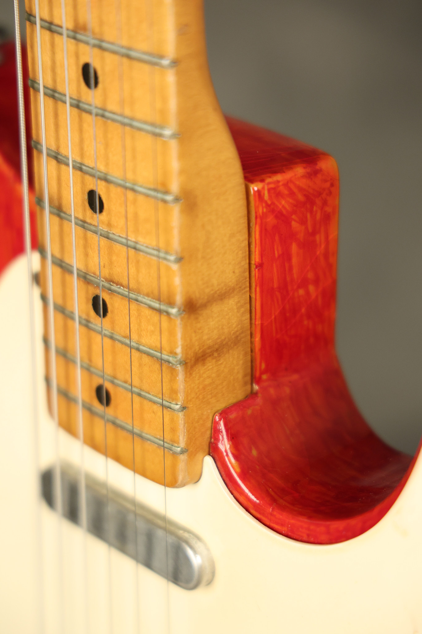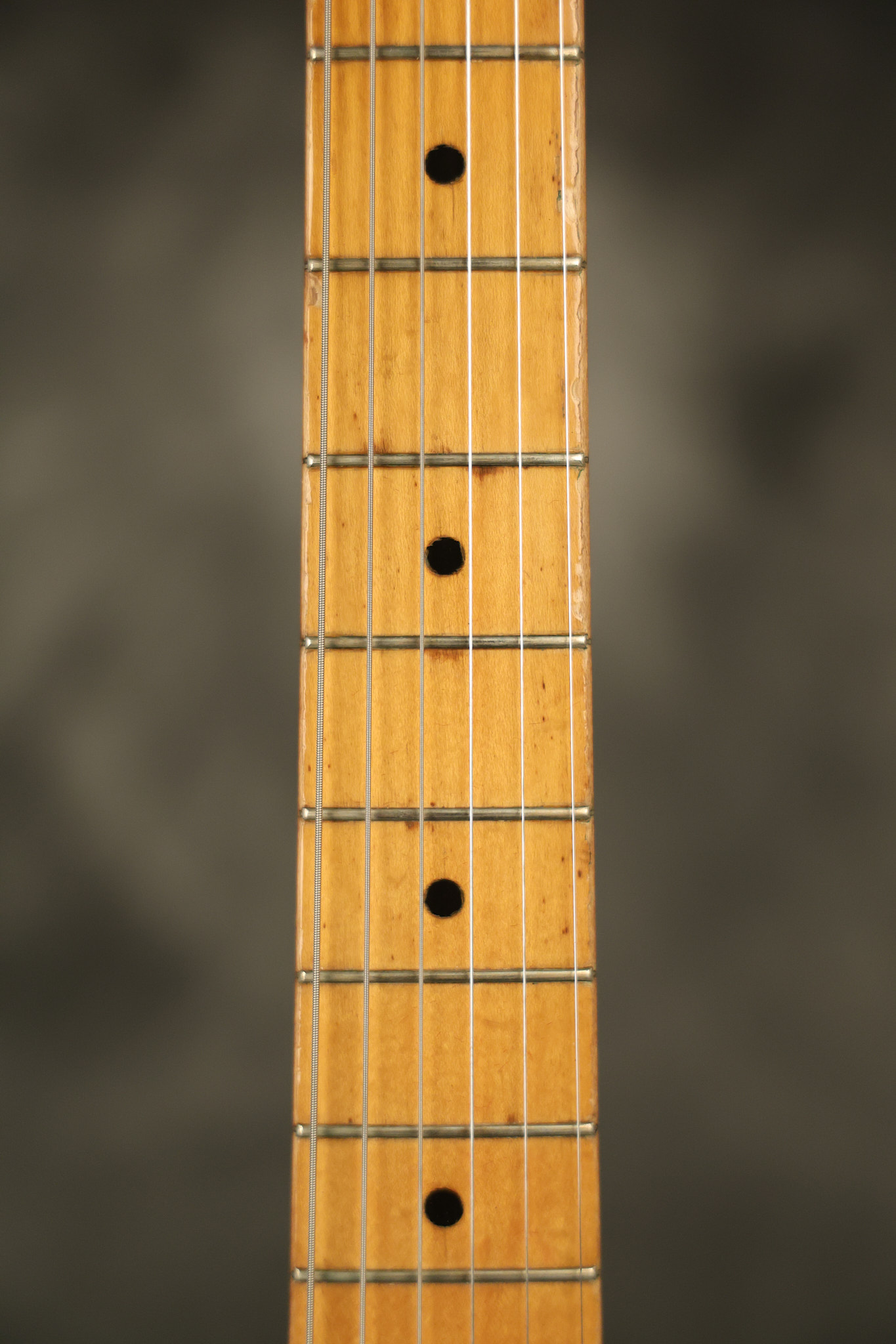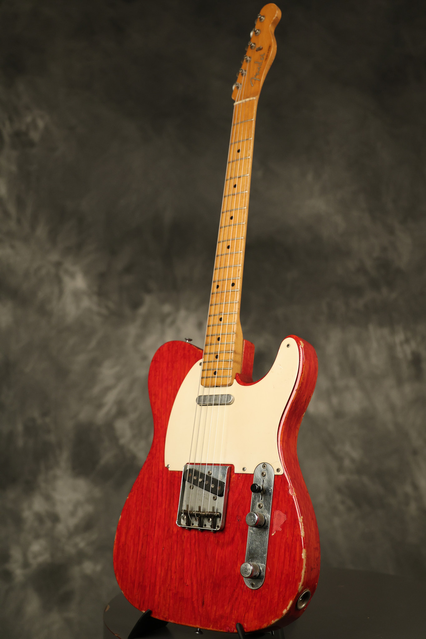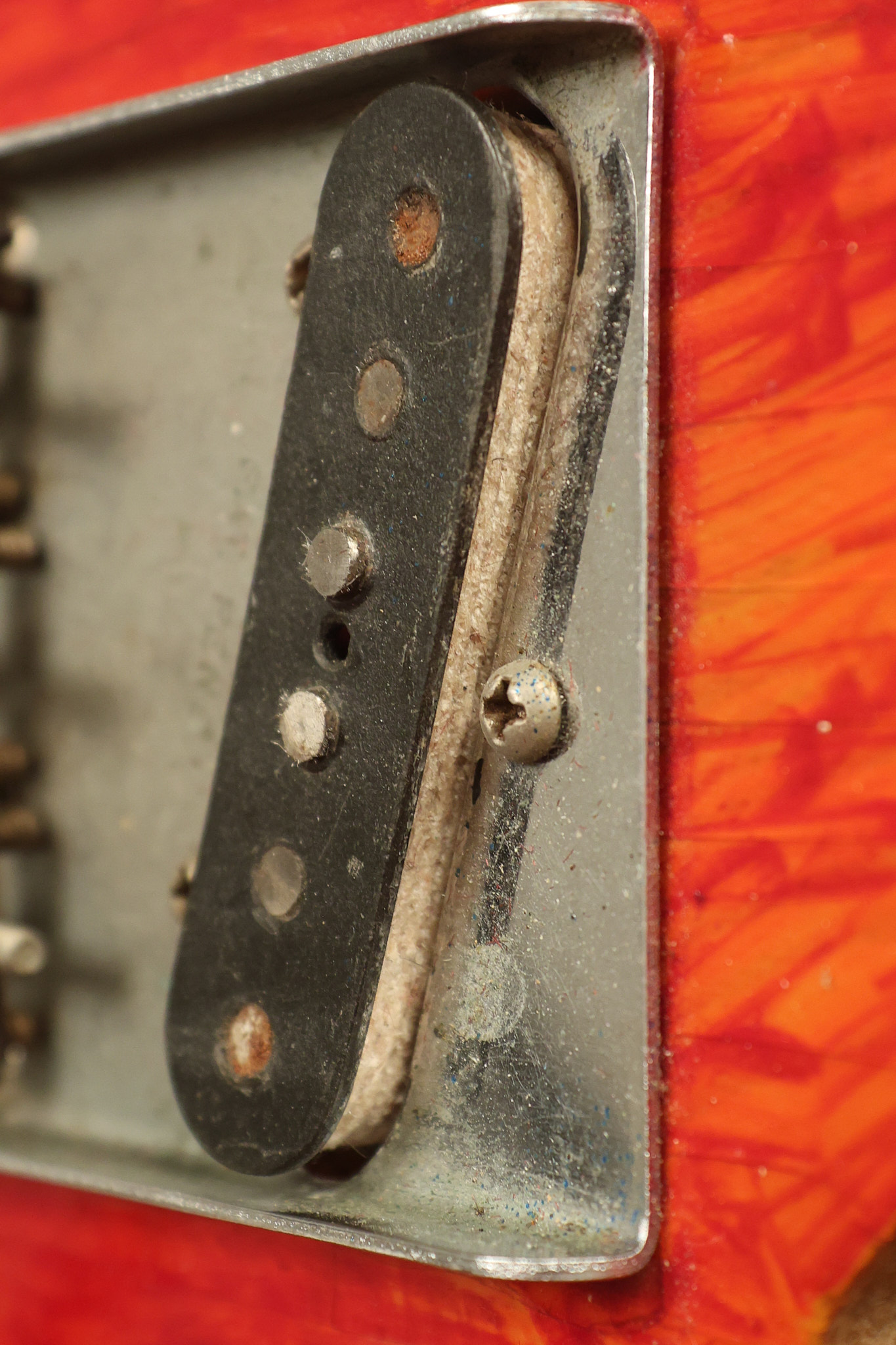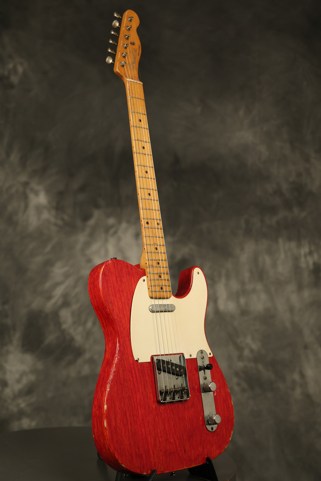 1957 Fender Telecaster with a refinished neck and a poorly refinished body. It has a great playing neck with good frets as it has been refretted. Changed parts include the tuning keys, switch, one capacitor (one is missing), the nut and some of the screws. The original pickugard has been oversprayed and has a crack through one corner. The neck position pickup has some traces of blue on the underside and on the original wires which have been extended. The bridge position pickup has been rewound. All electronics work and sound great. The tone pot sounds a little dirty when it's turned all the way down. The lower screw for the control cavity does not have enough wood on the edge of the cavity to firmly grab, so it is rather loose. There are lots of nicks + dings, finish cracks and other cosmetic wear. The guitar itself remains structurally sound. The weight is 7 lbs. 3.4 oz. The original tweed hardshell case is included, but it is in poor condition with patched areas, one broken latch and the side pocket and neck rest was replaced with one from a later 1960's Fender case.
