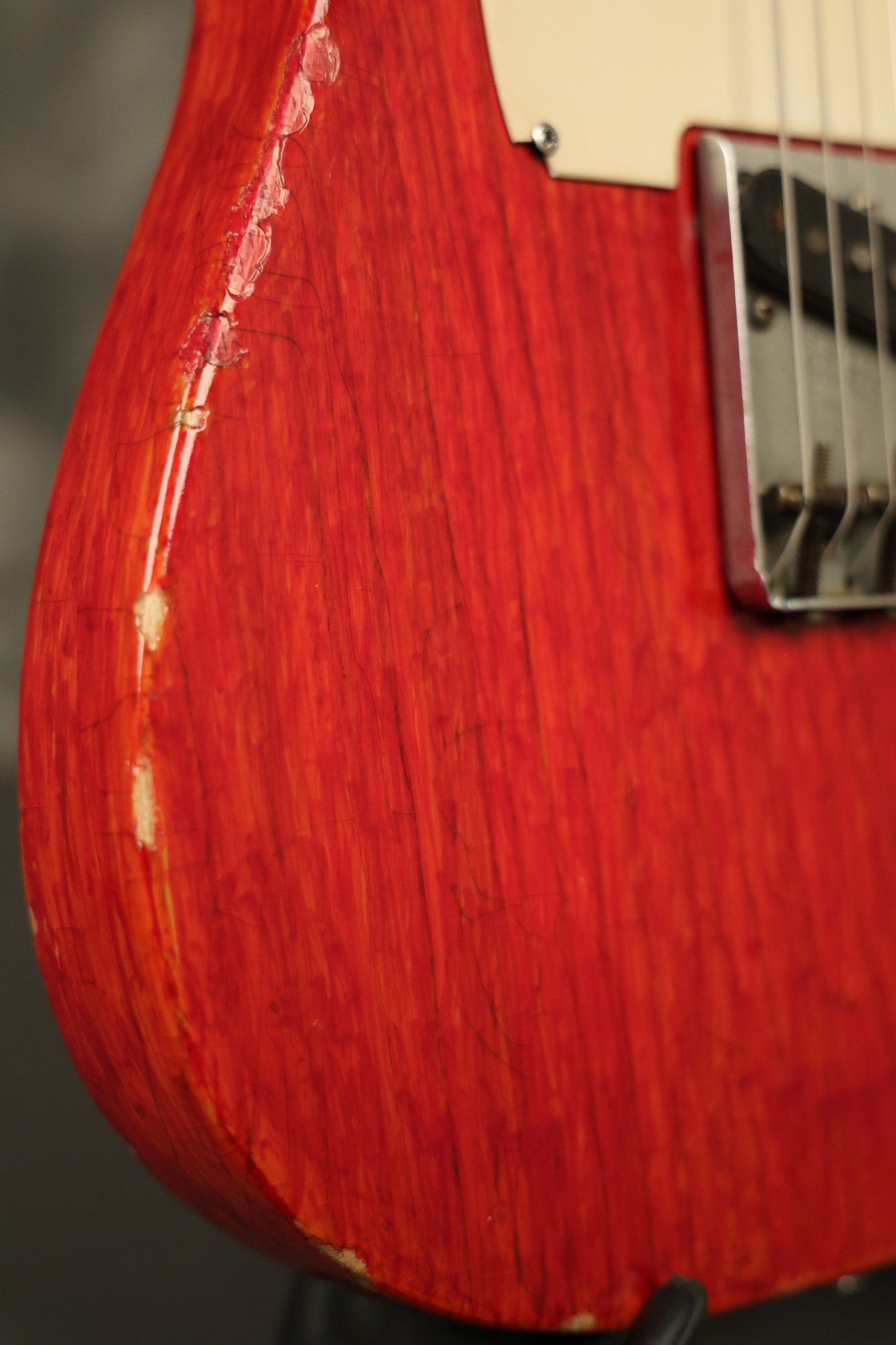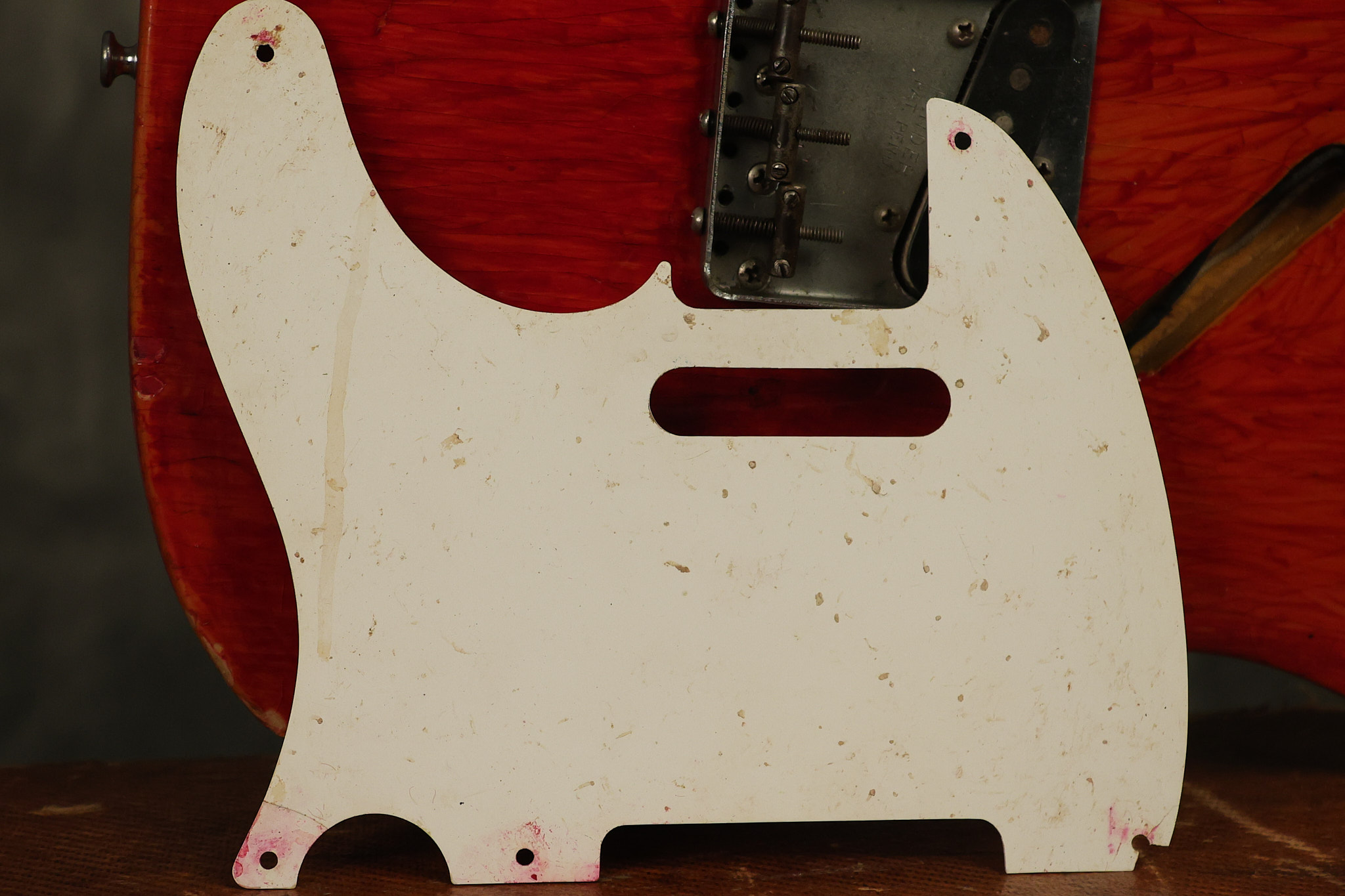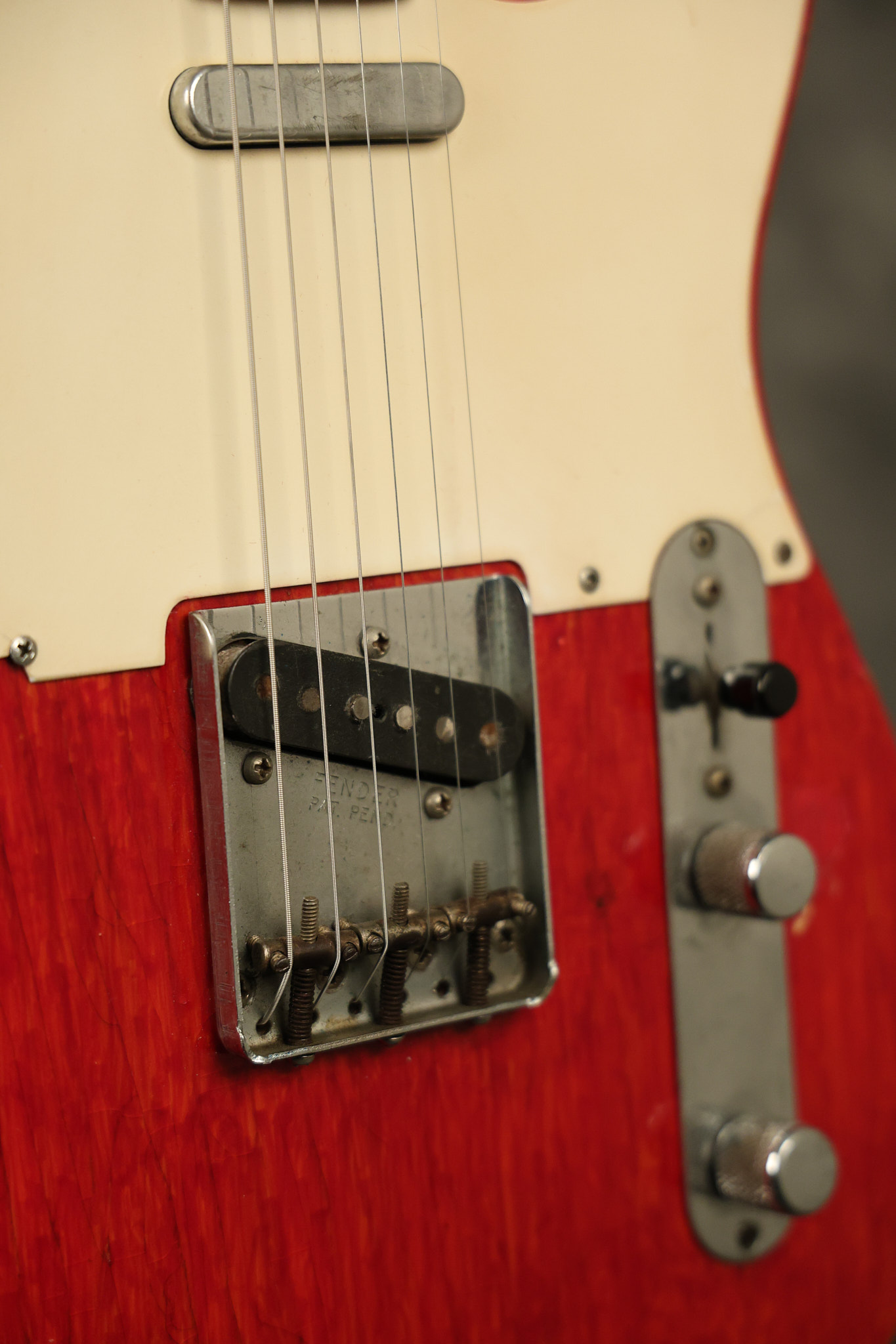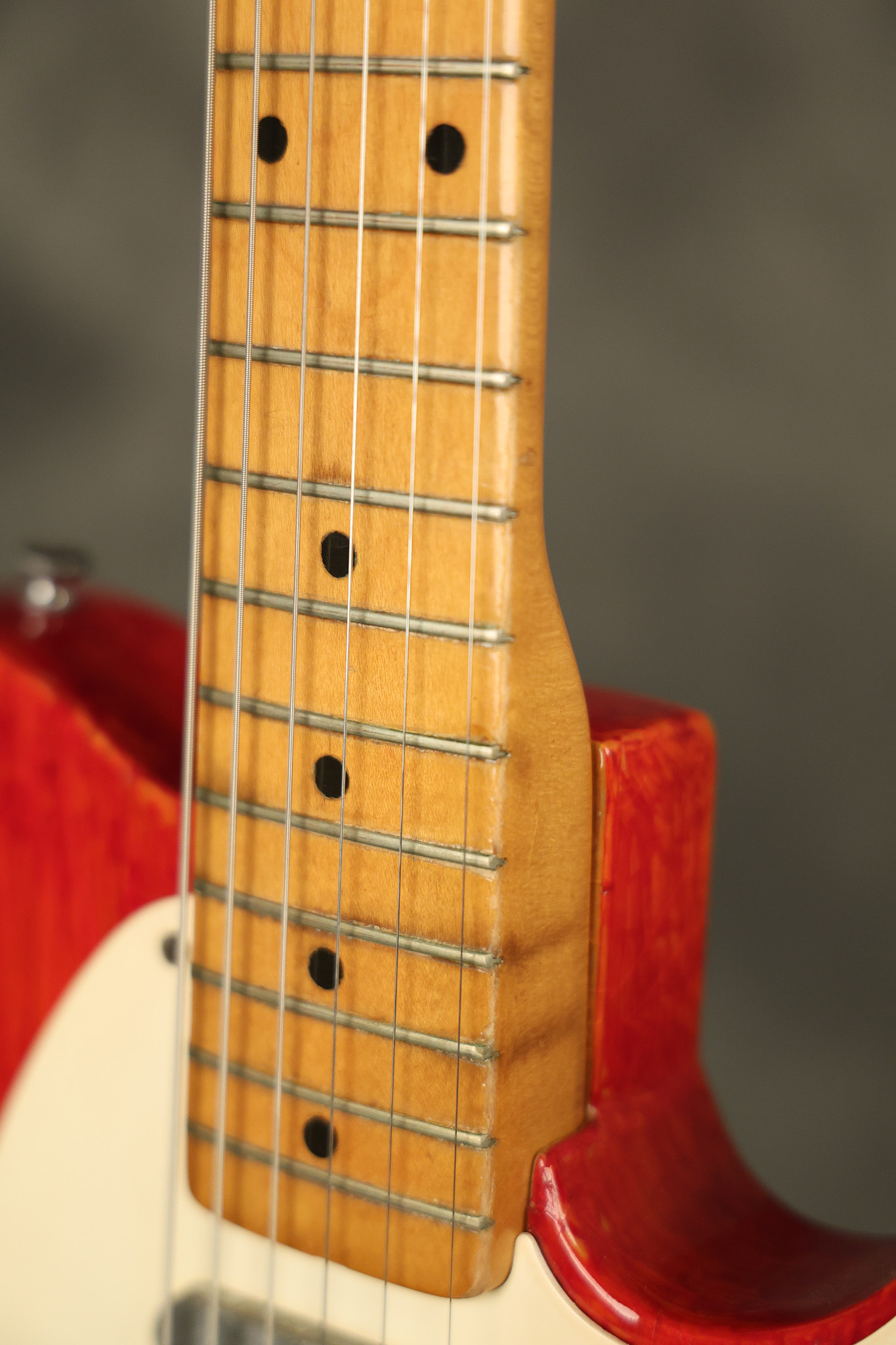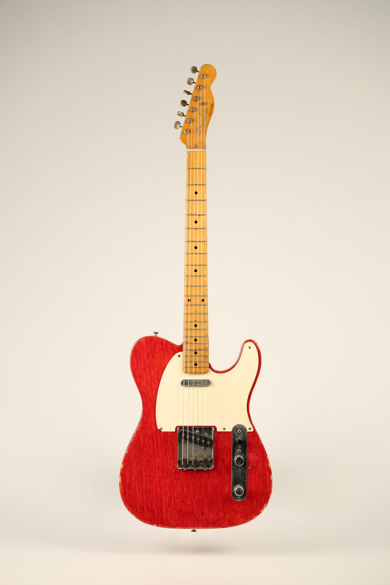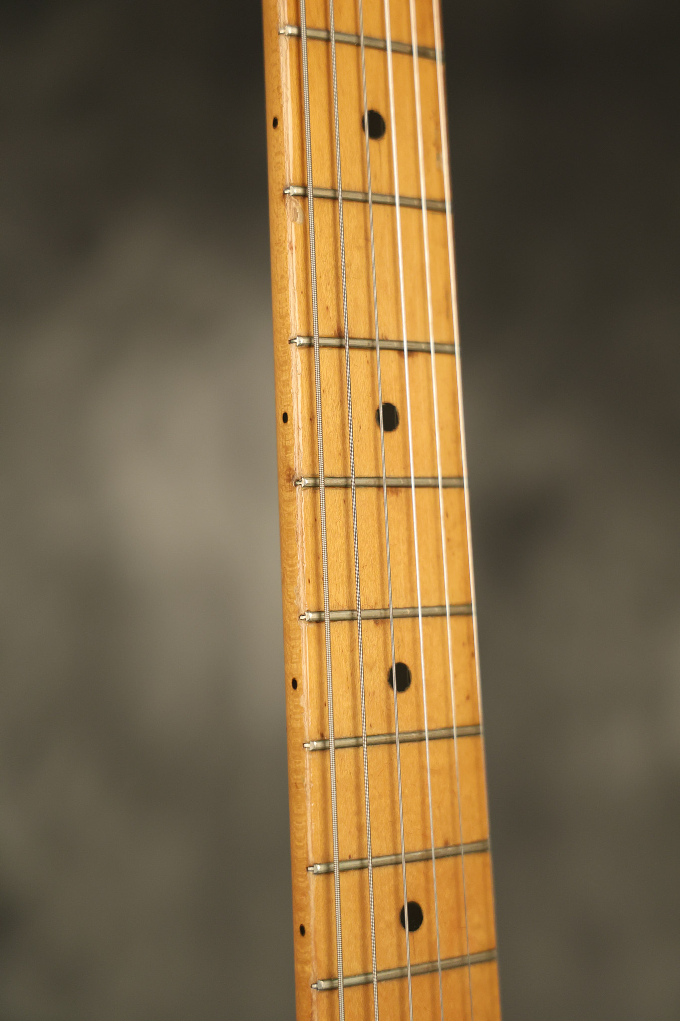 1957 Fender Telecaster with a refinished neck and a poorly refinished body. It has a great playing neck with good frets as it has been refretted. Changed parts include the tuning keys, switch, one capacitor (one is missing), the nut and some of the screws. The original pickugard has been oversprayed and has a crack through one corner. The neck position pickup has some traces of blue on the underside and on the original wires which have been extended. The bridge position pickup has been rewound. All electronics work and sound great. The tone pot sounds a little dirty when it's turned all the way down. The lower screw for the control cavity does not have enough wood on the edge of the cavity to firmly grab, so it is rather loose. There are lots of nicks + dings, finish cracks and other cosmetic wear. The guitar itself remains structurally sound. The weight is 7 lbs. 3.4 oz. The original tweed hardshell case is included, but it is in poor condition with patched areas, one broken latch and the side pocket and neck rest was replaced with one from a later 1960's Fender case.