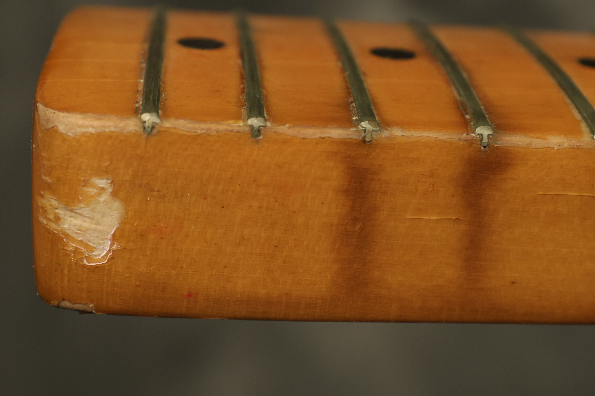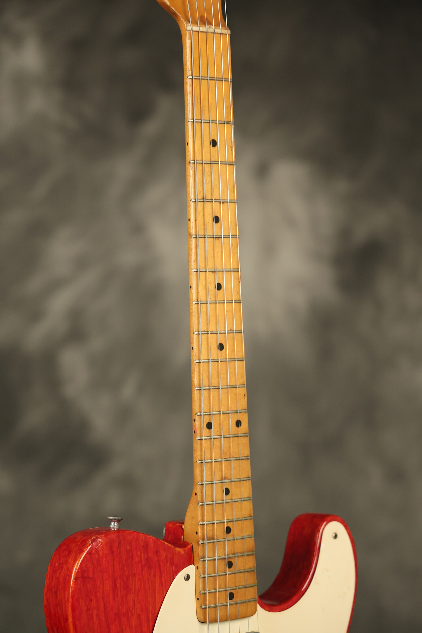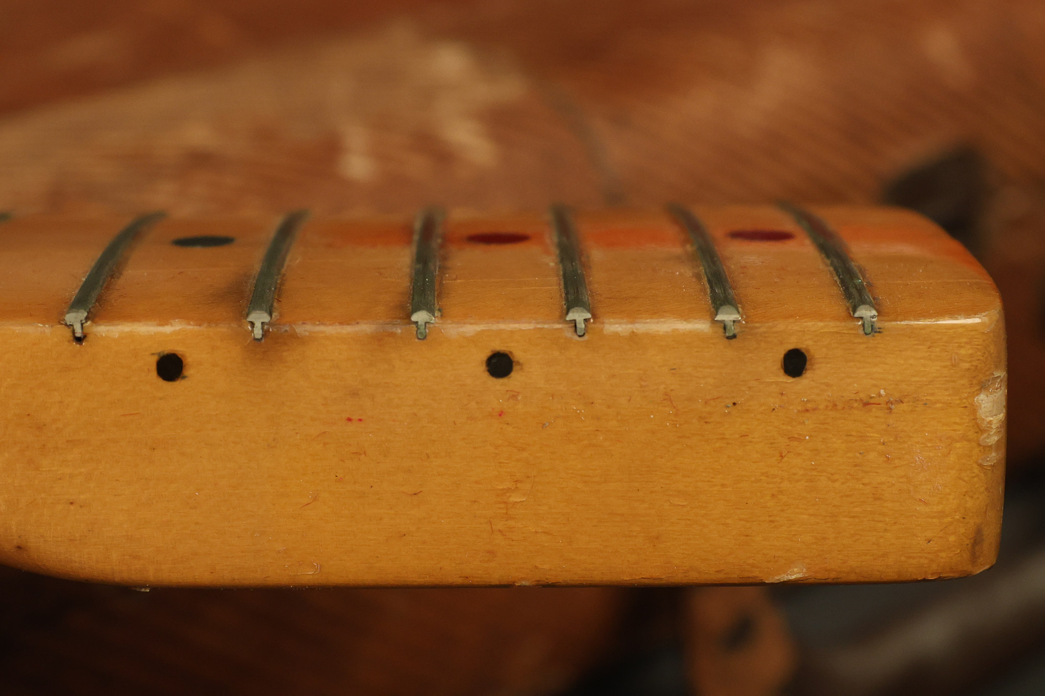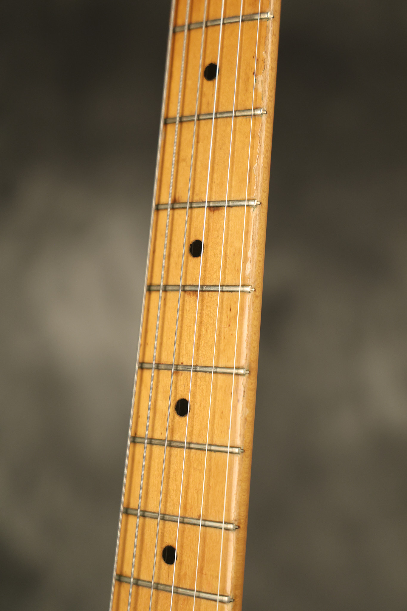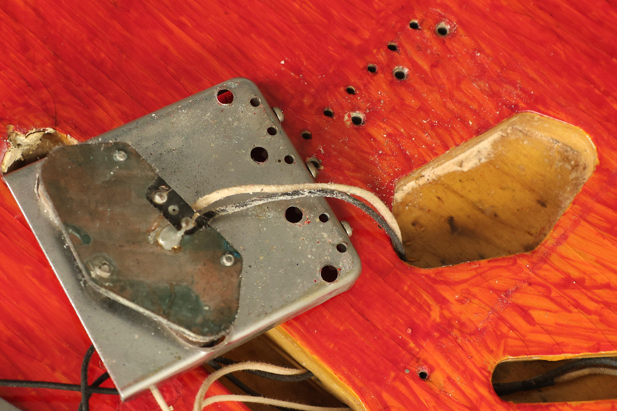 1957 Fender Telecaster with a refinished neck and a poorly refinished body. It has a great playing neck with good frets as it has been refretted. Changed parts include the tuning keys, switch, one capacitor (one is missing), the nut and some of the screws. The original pickugard has been oversprayed and has a crack through one corner. The neck position pickup has some traces of blue on the underside and on the original wires which have been extended. The bridge position pickup has been rewound. All electronics work and sound great. The tone pot sounds a little dirty when it's turned all the way down. The lower screw for the control cavity does not have enough wood on the edge of the cavity to firmly grab, so it is rather loose. There are lots of nicks + dings, finish cracks and other cosmetic wear. The guitar itself remains structurally sound. The weight is 7 lbs. 3.4 oz. The original tweed hardshell case is included, but it is in poor condition with patched areas, one broken latch and the side pocket and neck rest was replaced with one from a later 1960's Fender case.
