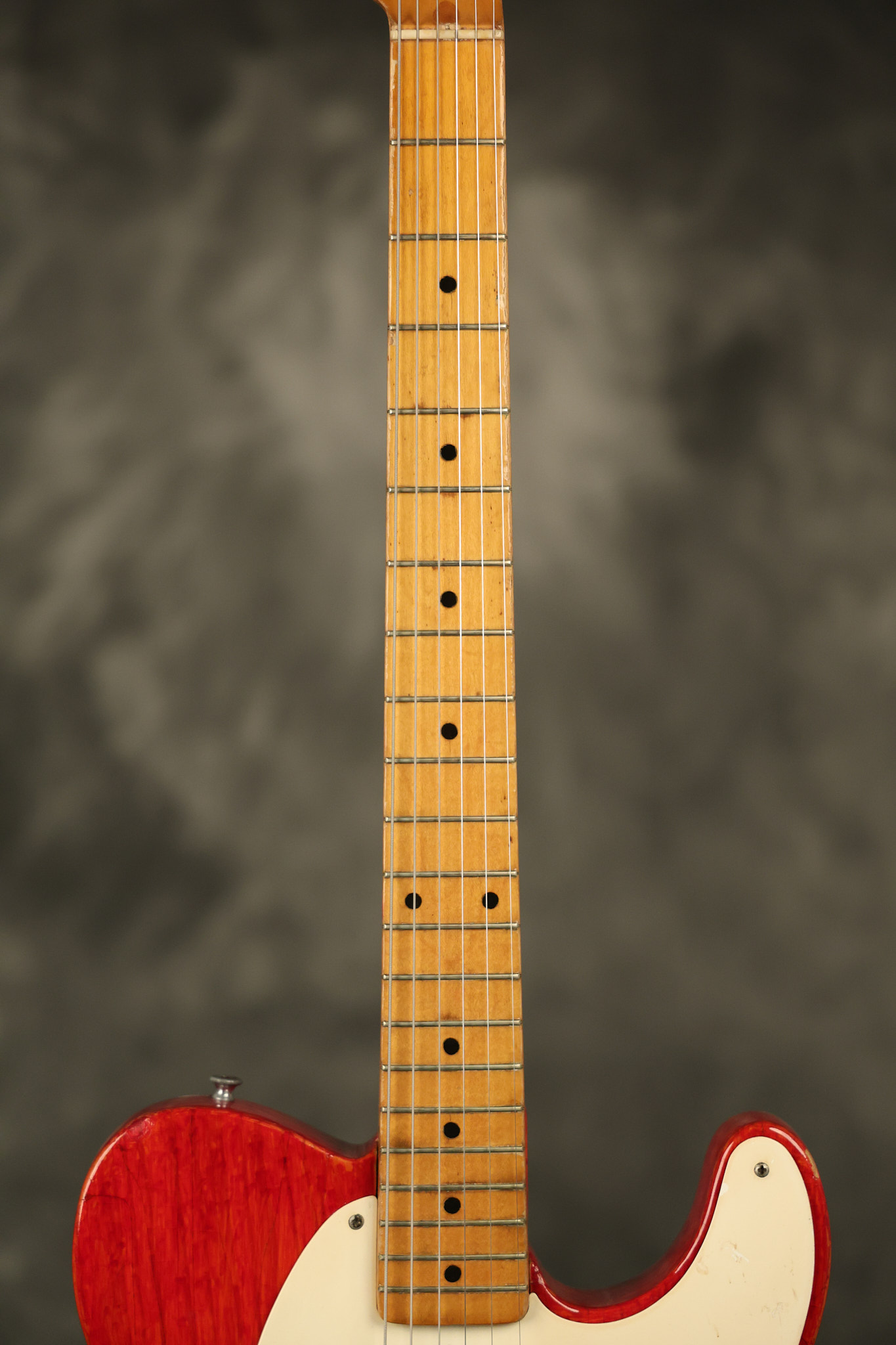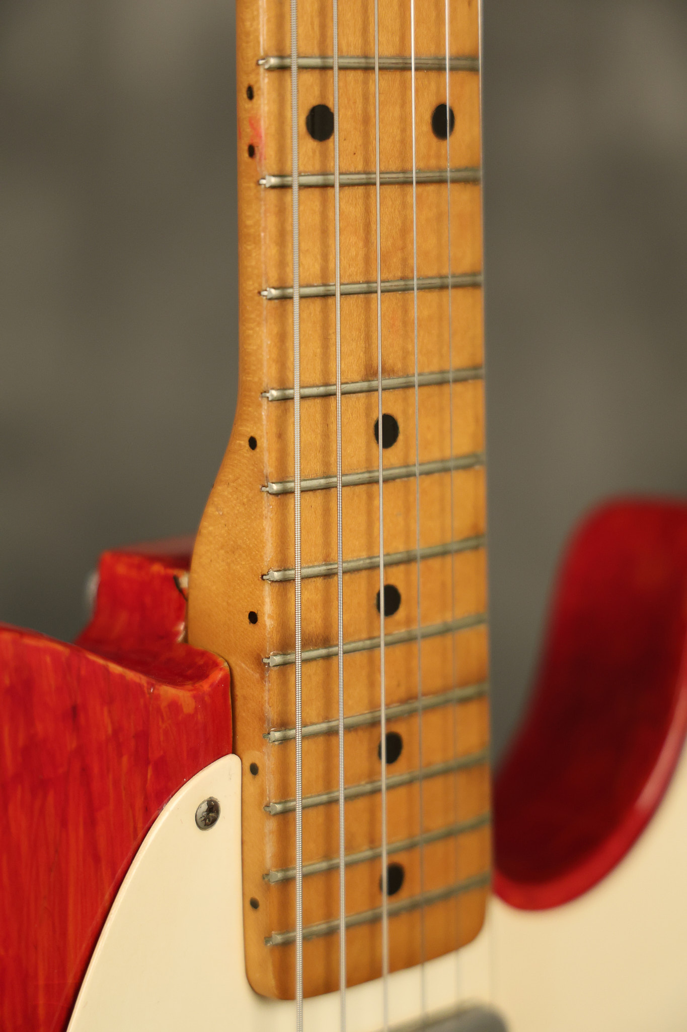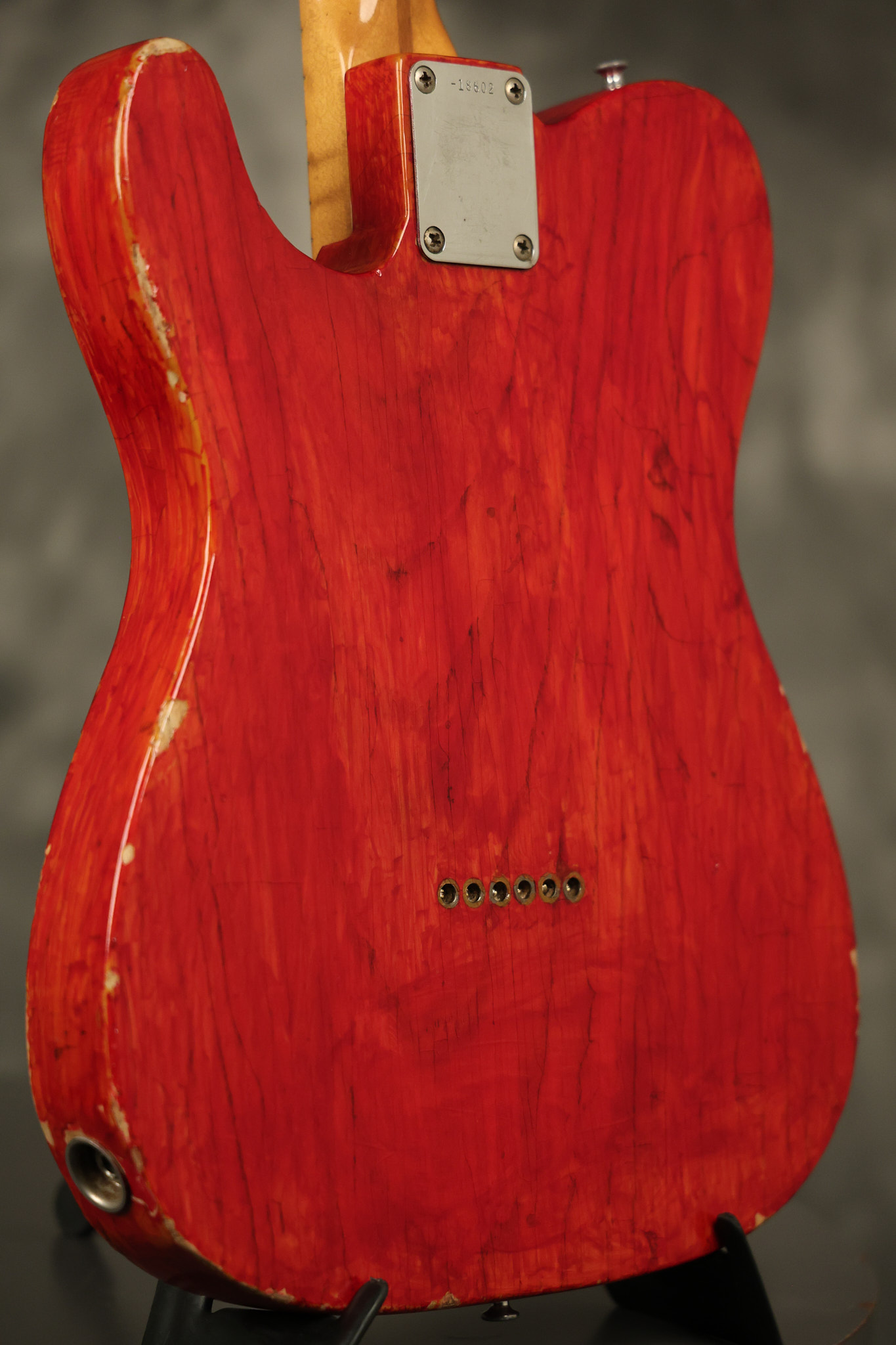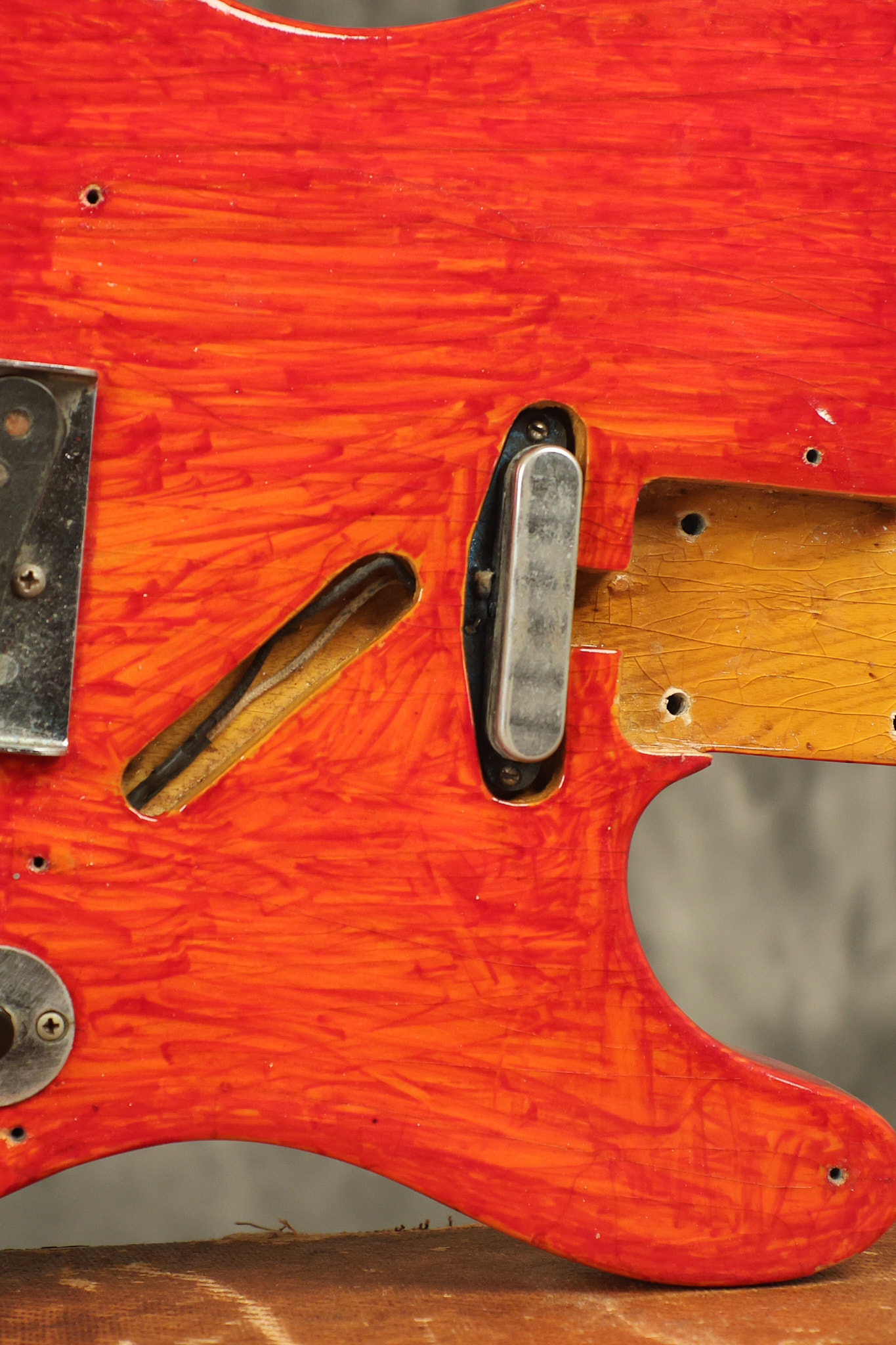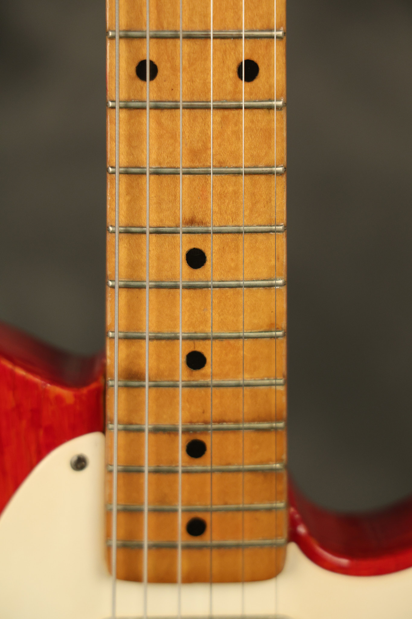 1957 Fender Telecaster with a refinished neck and a poorly refinished body. It has a great playing neck with good frets as it has been refretted. Changed parts include the tuning keys, switch, one capacitor (one is missing), the nut and some of the screws. The original pickugard has been oversprayed and has a crack through one corner. The neck position pickup has some traces of blue on the underside and on the original wires which have been extended. The bridge position pickup has been rewound. All electronics work and sound great. The tone pot sounds a little dirty when it's turned all the way down. The lower screw for the control cavity does not have enough wood on the edge of the cavity to firmly grab, so it is rather loose. There are lots of nicks + dings, finish cracks and other cosmetic wear. The guitar itself remains structurally sound. The weight is 7 lbs. 3.4 oz. The original tweed hardshell case is included, but it is in poor condition with patched areas, one broken latch and the side pocket and neck rest was replaced with one from a later 1960's Fender case.