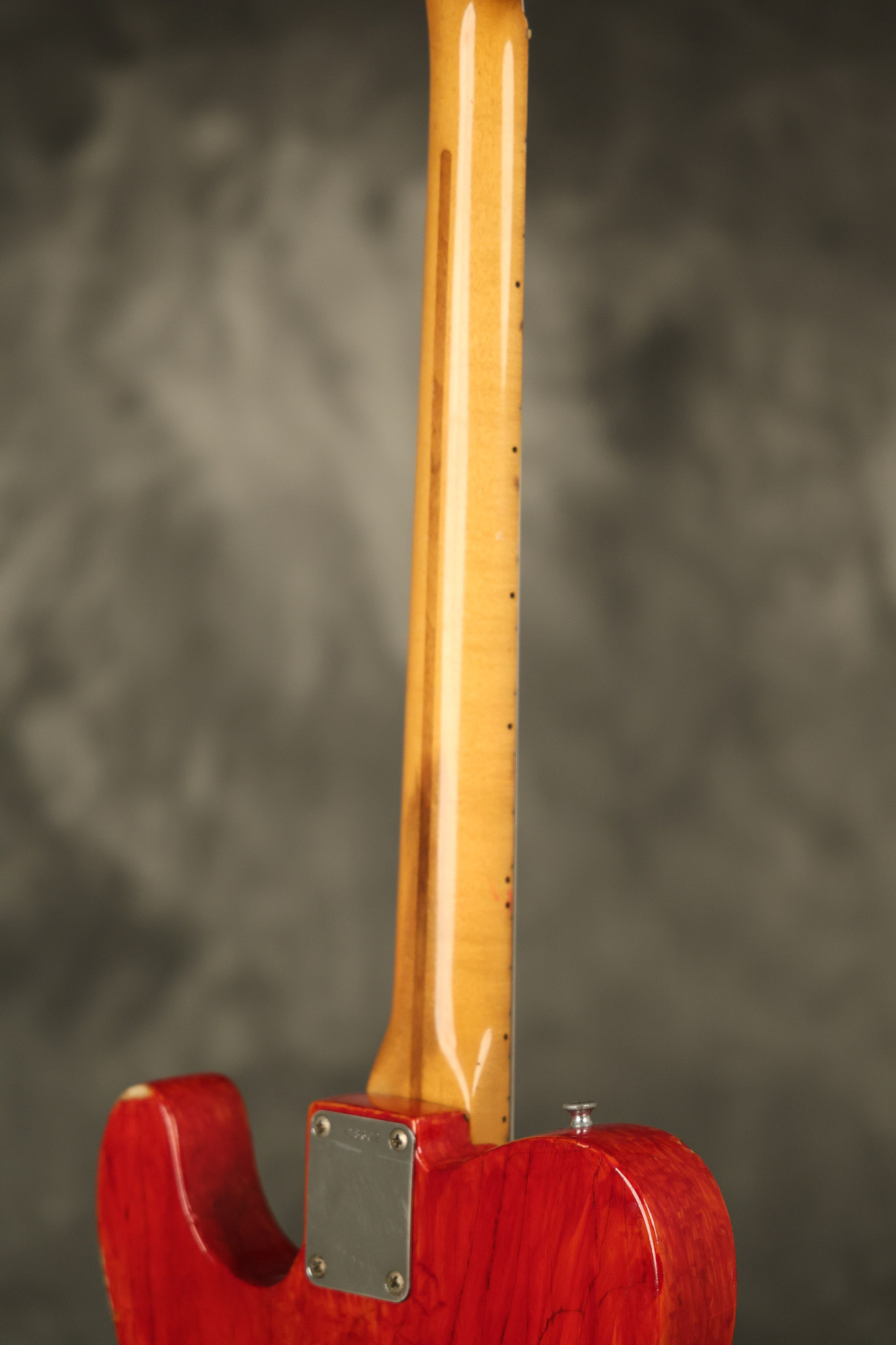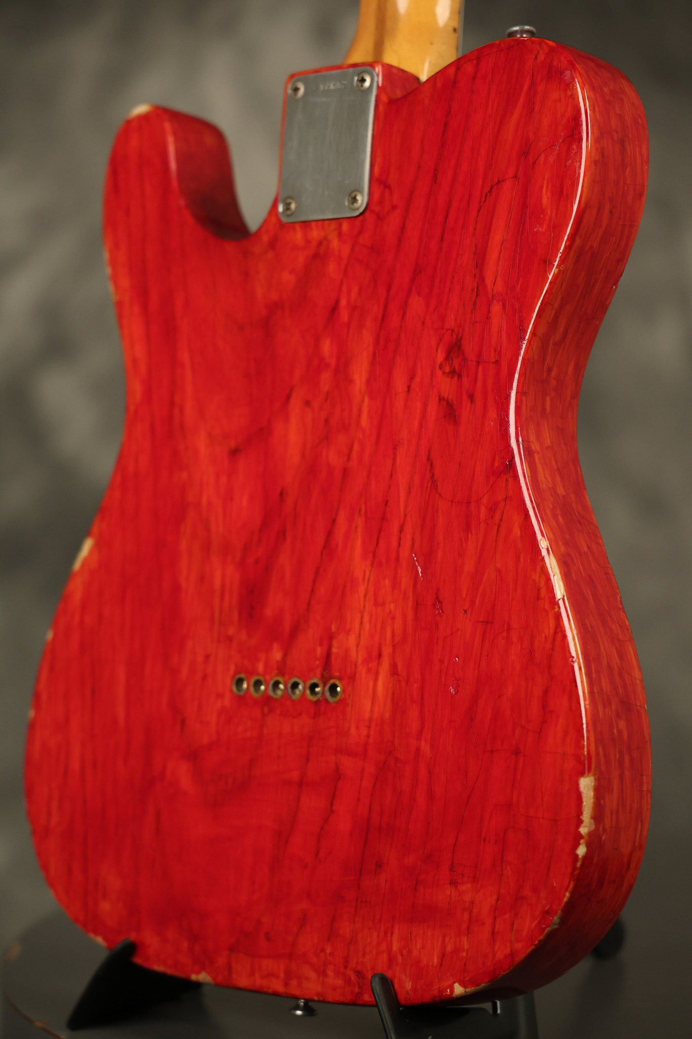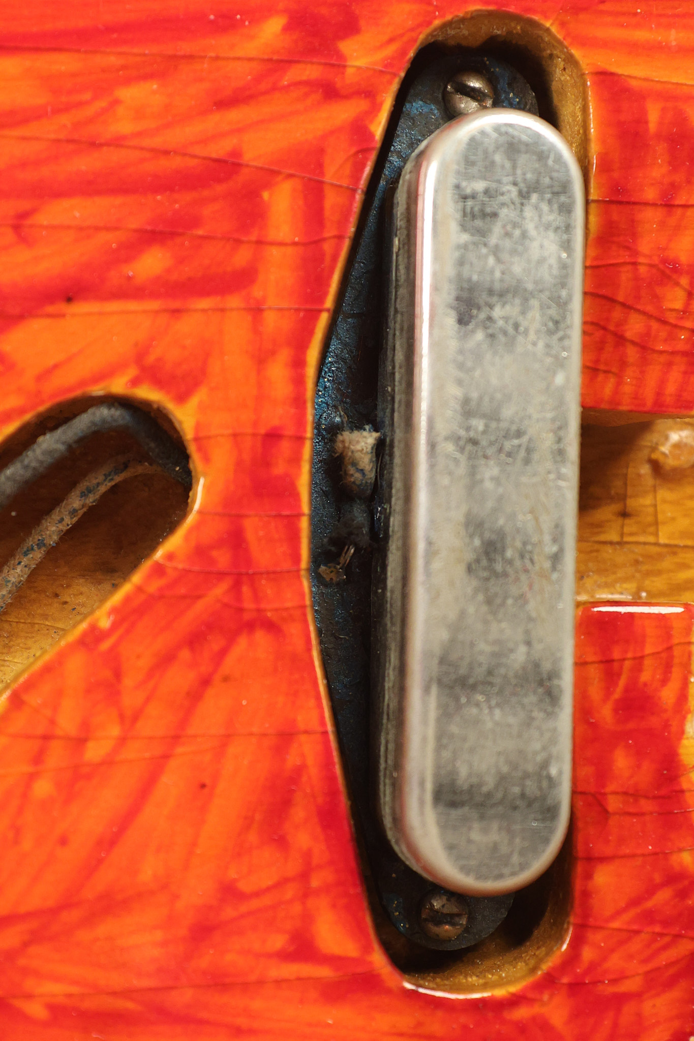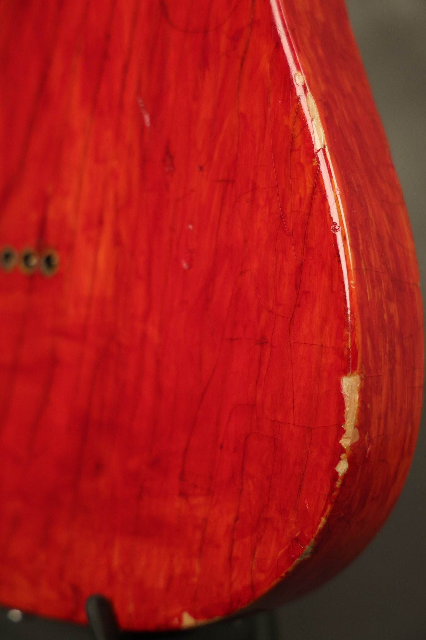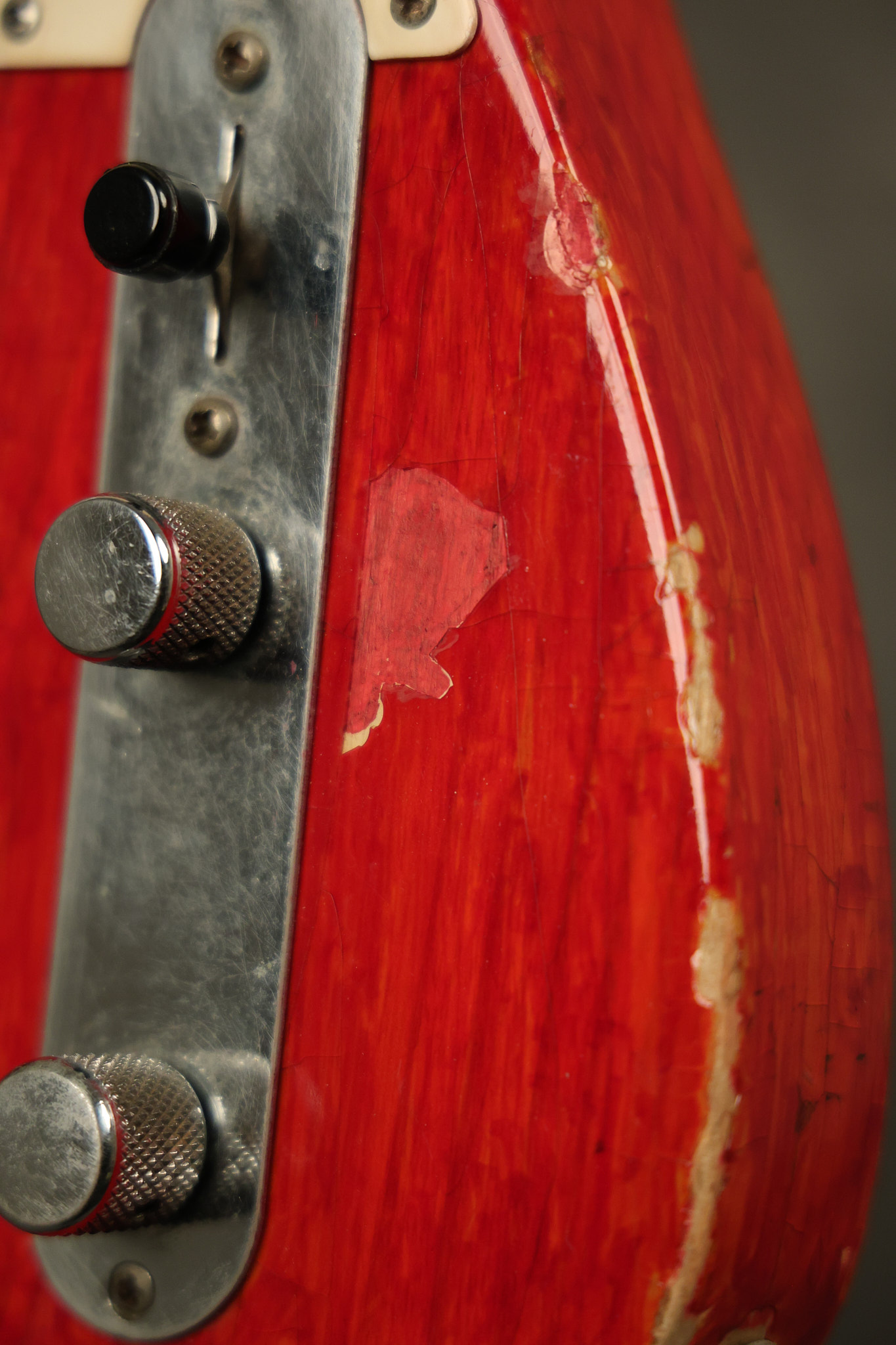1957 Fender Telecaster with a refinished neck and a poorly refinished body. It has a great playing neck with good frets as it has been refretted. Changed parts include the tuning keys, switch, one capacitor (one is missing), the nut and some of the screws. The original pickugard has been oversprayed and has a crack through one corner. The neck position pickup has some traces of blue on the underside and on the original wires which have been extended. The bridge position pickup has been rewound. All electronics work and sound great. The tone pot sounds a little dirty when it's turned all the way down. The lower screw for the control cavity does not have enough wood on the edge of the cavity to firmly grab, so it is rather loose. There are lots of nicks + dings, finish cracks and other cosmetic wear. The guitar itself remains structurally sound. The weight is 7 lbs. 3.4 oz. The original tweed hardshell case is included, but it is in poor condition with patched areas, one broken latch and the side pocket and neck rest was replaced with one from a later 1960's Fender case.