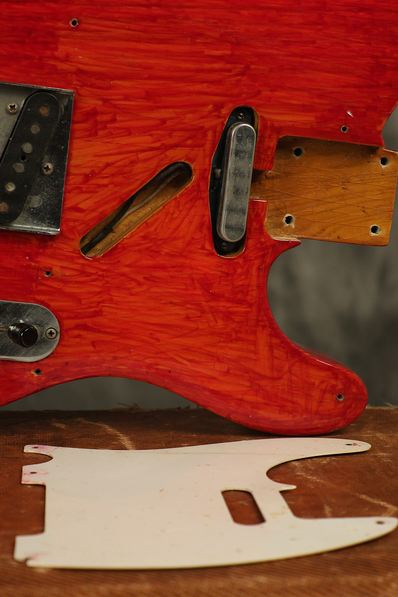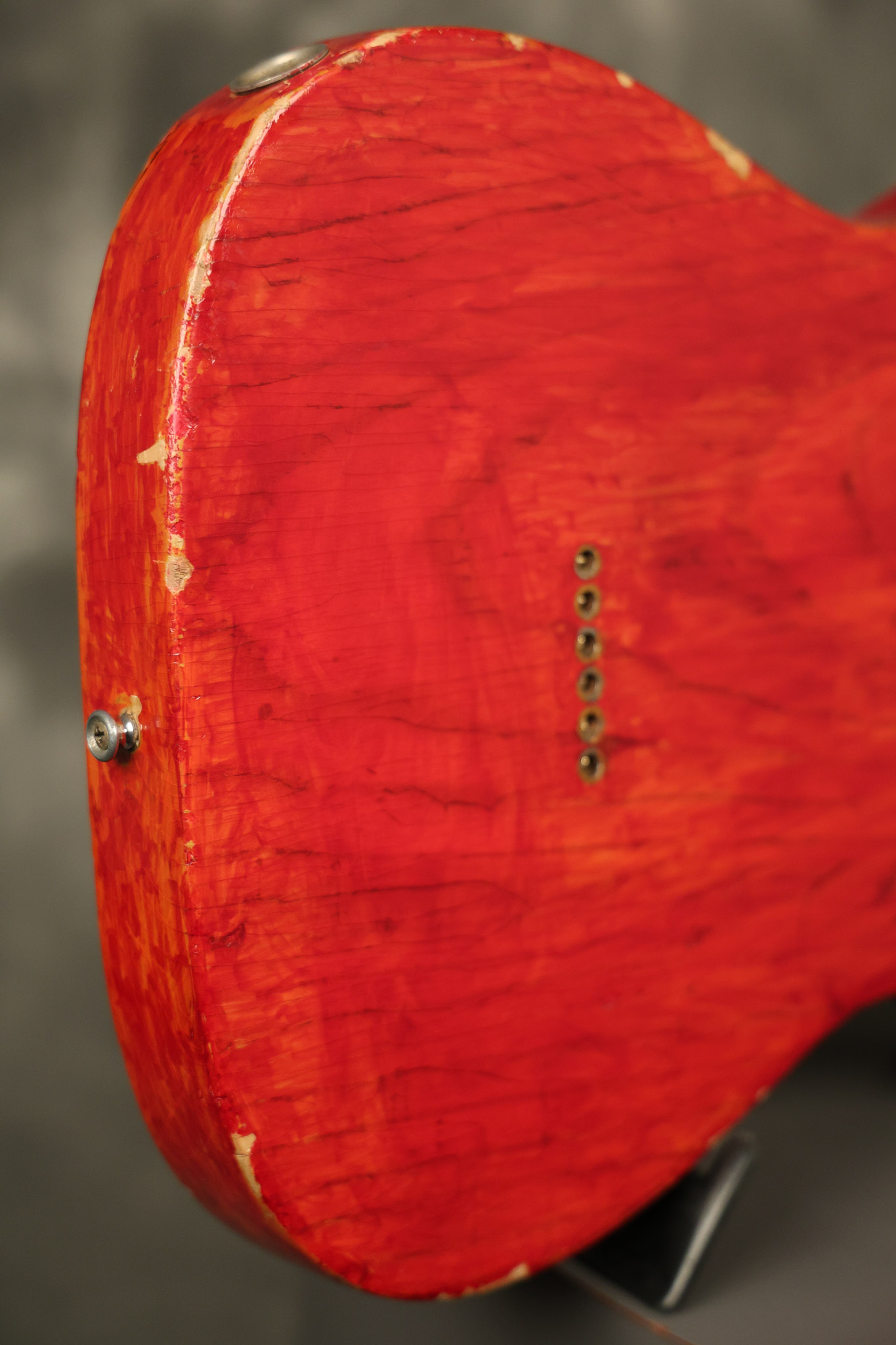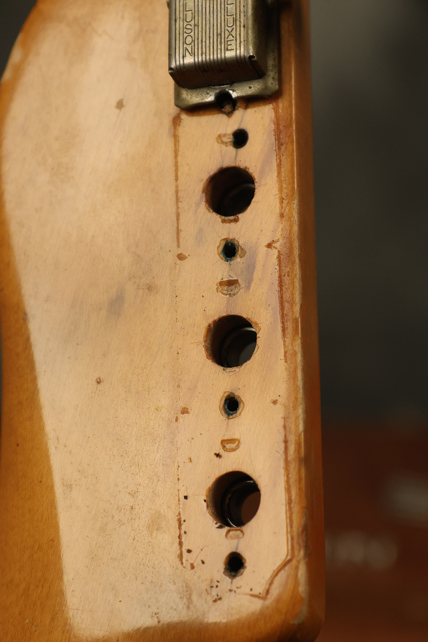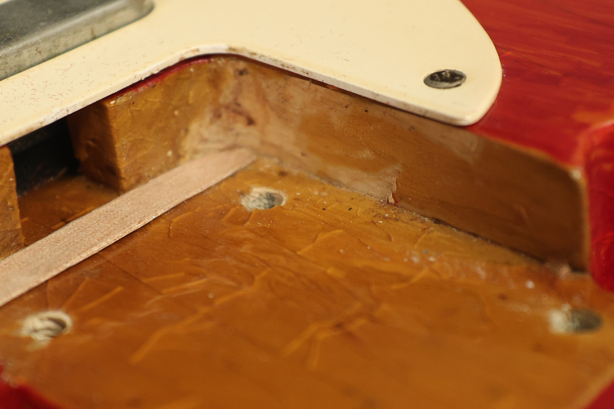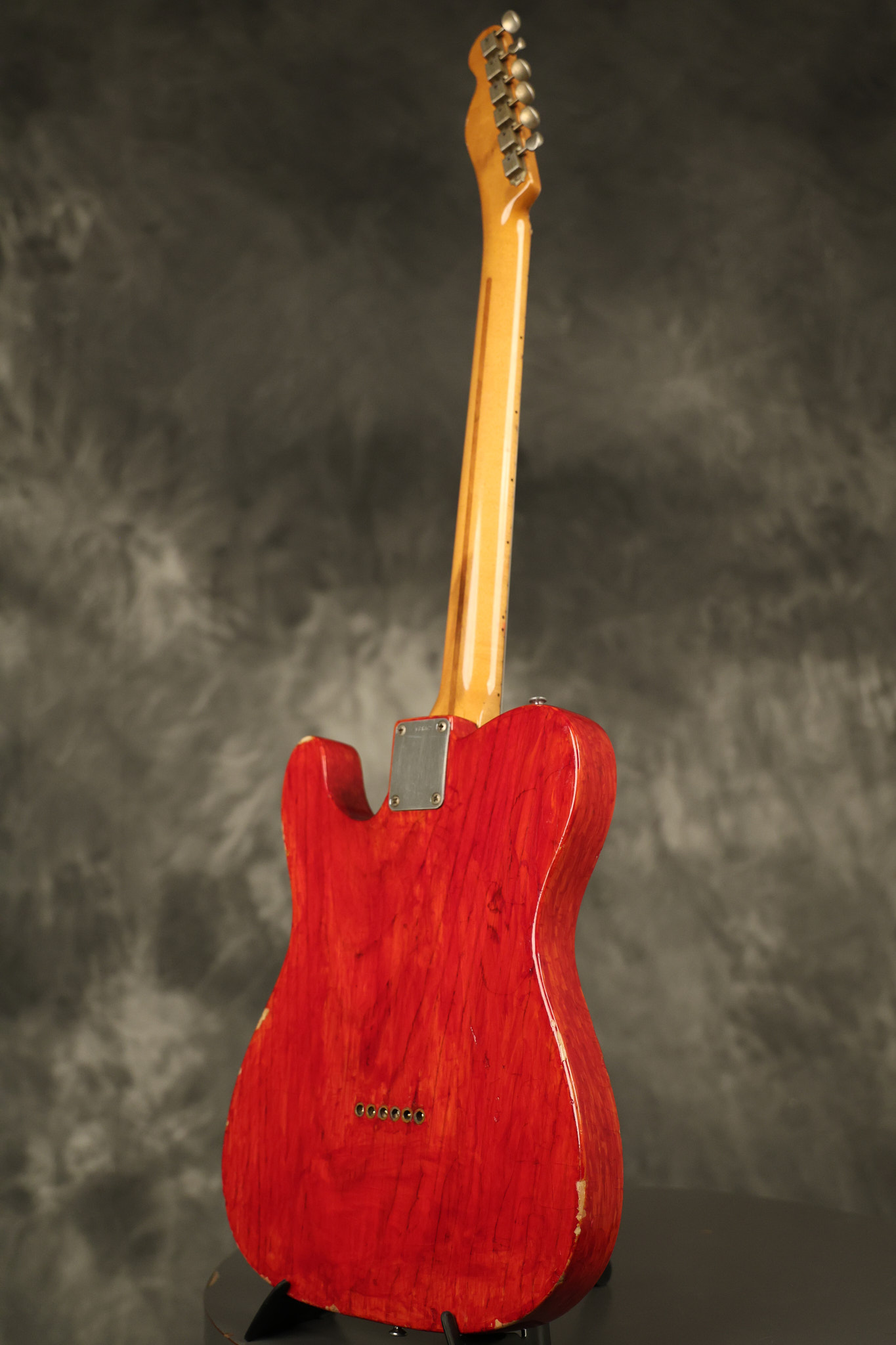 1957 Fender Telecaster with a refinished neck and a poorly refinished body. It has a great playing neck with good frets as it has been refretted. Changed parts include the tuning keys, switch, one capacitor (one is missing), the nut and some of the screws. The original pickugard has been oversprayed and has a crack through one corner. The neck position pickup has some traces of blue on the underside and on the original wires which have been extended. The bridge position pickup has been rewound. All electronics work and sound great. The tone pot sounds a little dirty when it's turned all the way down. The lower screw for the control cavity does not have enough wood on the edge of the cavity to firmly grab, so it is rather loose. There are lots of nicks + dings, finish cracks and other cosmetic wear. The guitar itself remains structurally sound. The weight is 7 lbs. 3.4 oz. The original tweed hardshell case is included, but it is in poor condition with patched areas, one broken latch and the side pocket and neck rest was replaced with one from a later 1960's Fender case.