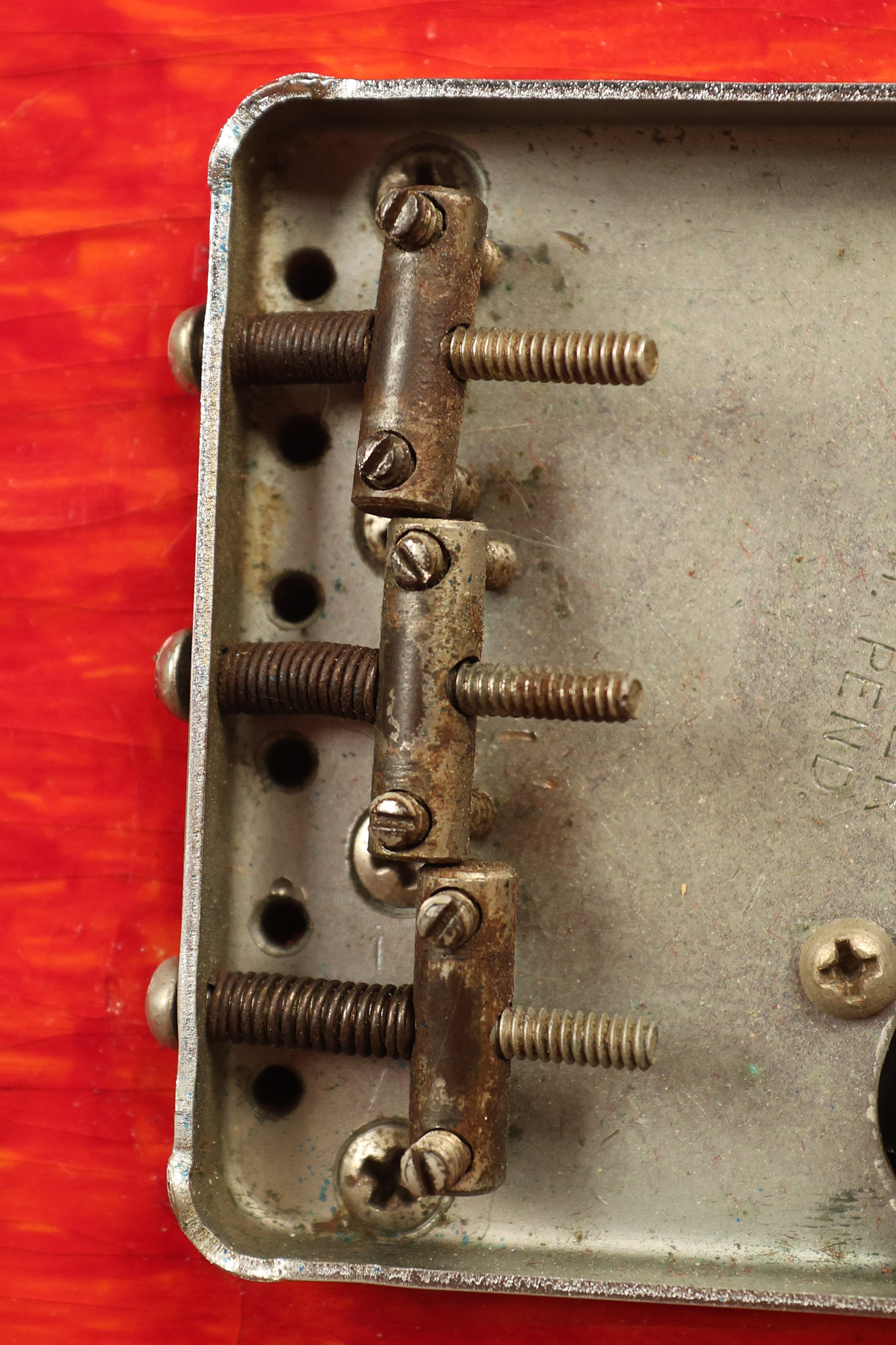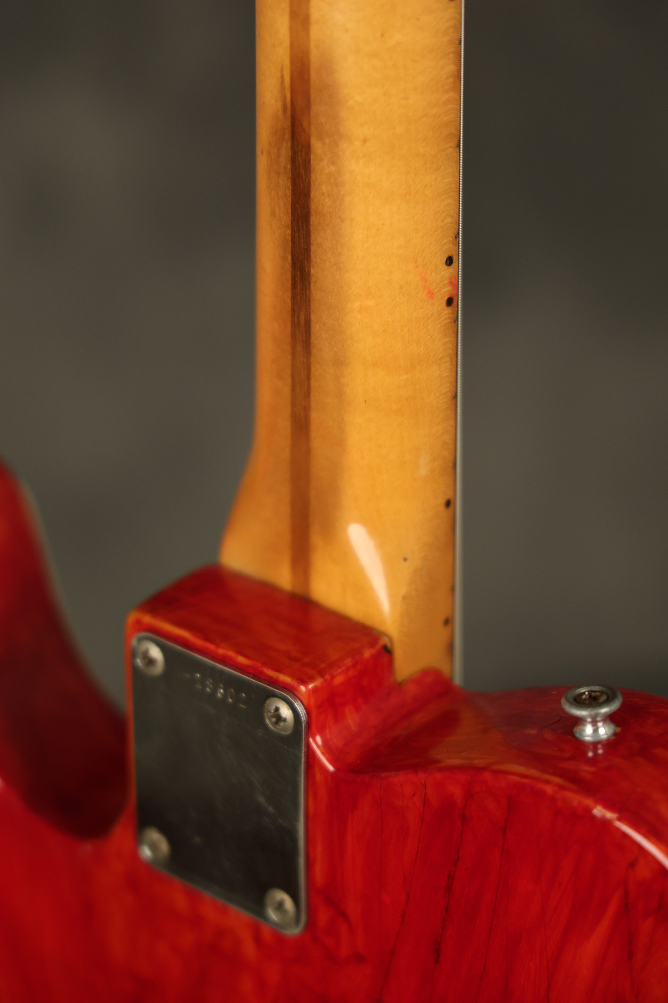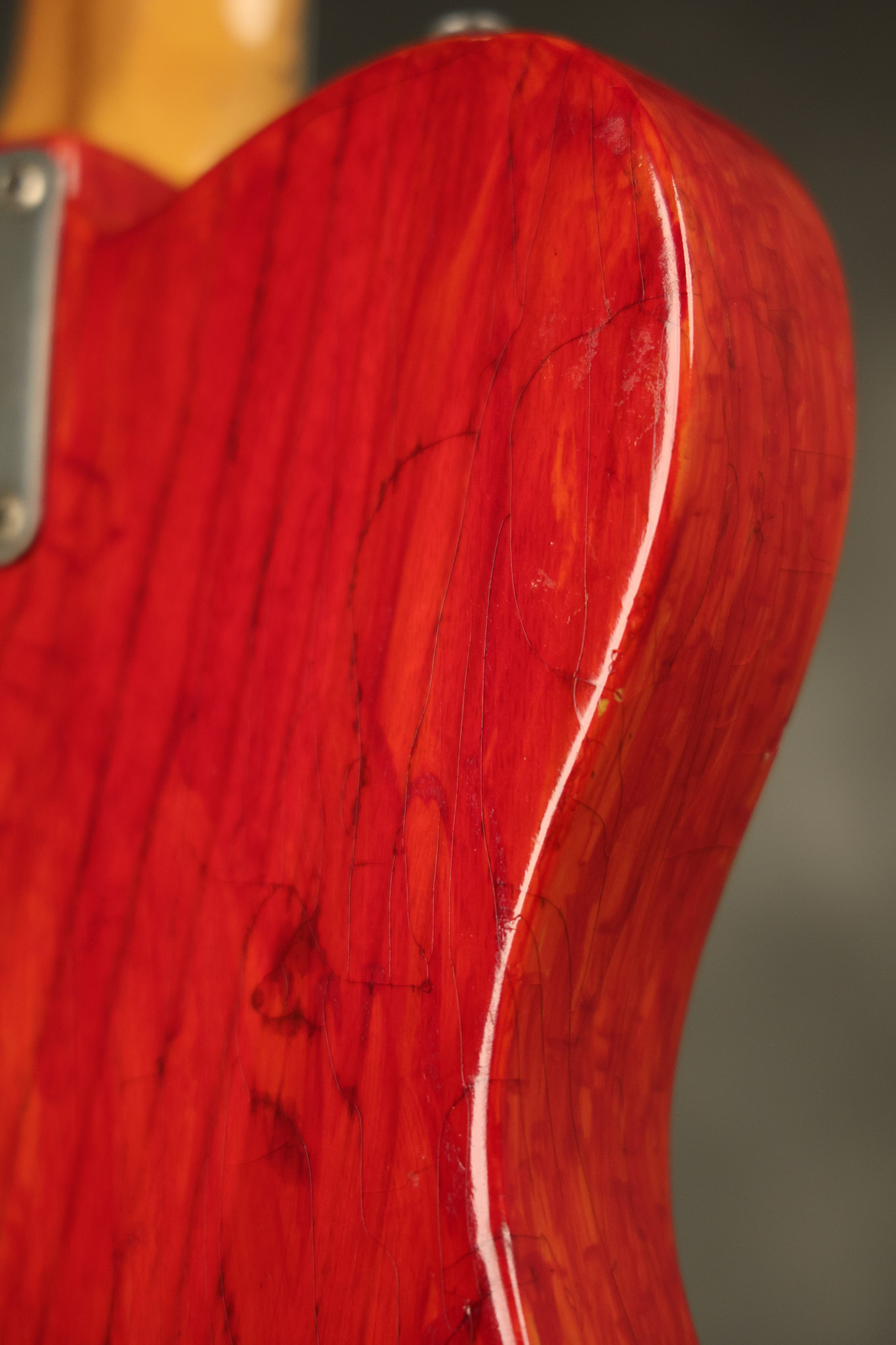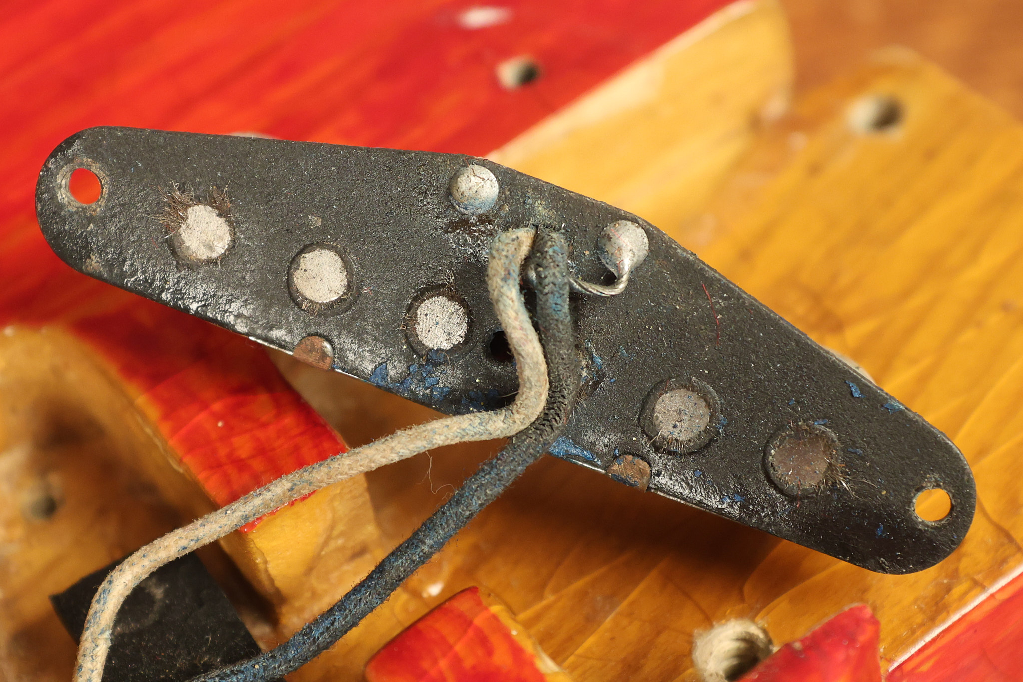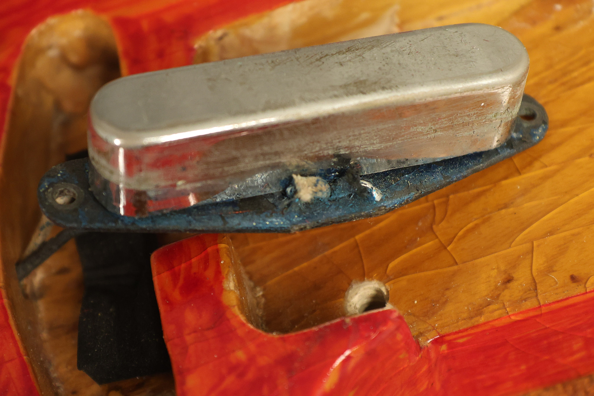 1957 Fender Telecaster with a refinished neck and a poorly refinished body. It has a great playing neck with good frets as it has been refretted. Changed parts include the tuning keys, switch, one capacitor (one is missing), the nut and some of the screws. The original pickugard has been oversprayed and has a crack through one corner. The neck position pickup has some traces of blue on the underside and on the original wires which have been extended. The bridge position pickup has been rewound. All electronics work and sound great. The tone pot sounds a little dirty when it's turned all the way down. The lower screw for the control cavity does not have enough wood on the edge of the cavity to firmly grab, so it is rather loose. There are lots of nicks + dings, finish cracks and other cosmetic wear. The guitar itself remains structurally sound. The weight is 7 lbs. 3.4 oz. The original tweed hardshell case is included, but it is in poor condition with patched areas, one broken latch and the side pocket and neck rest was replaced with one from a later 1960's Fender case.