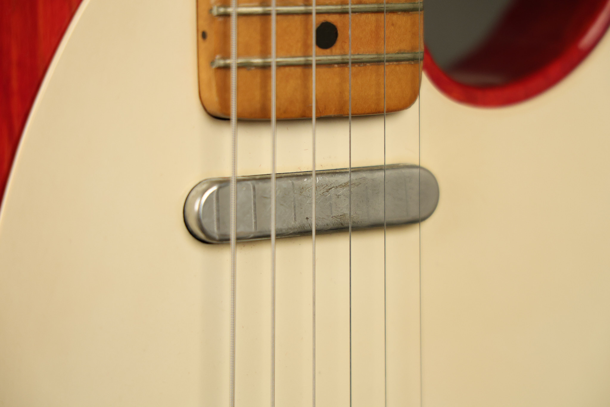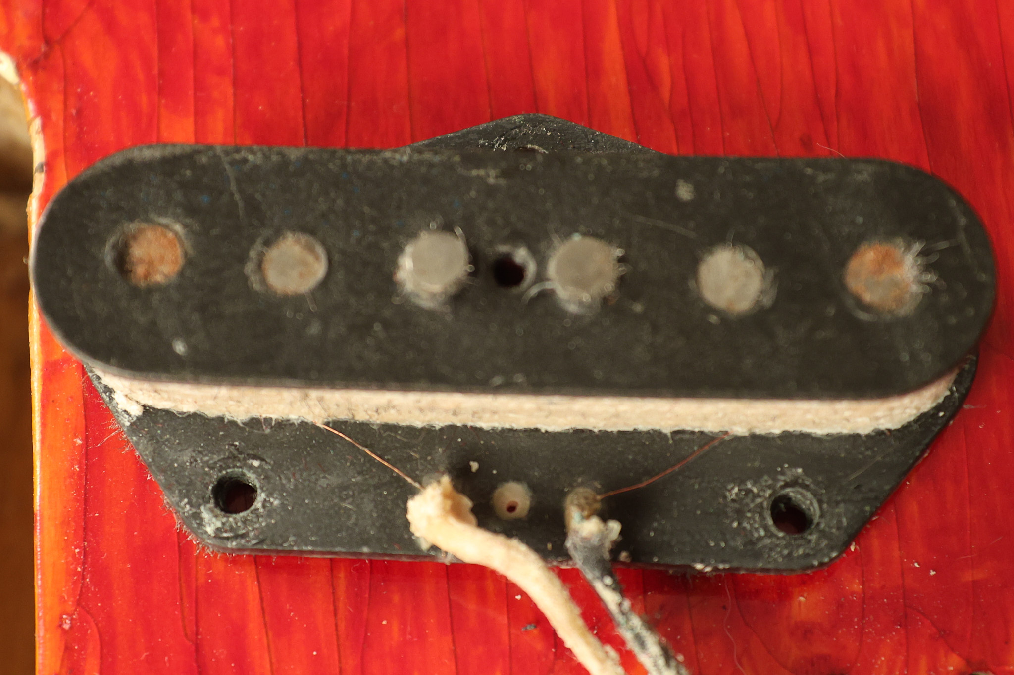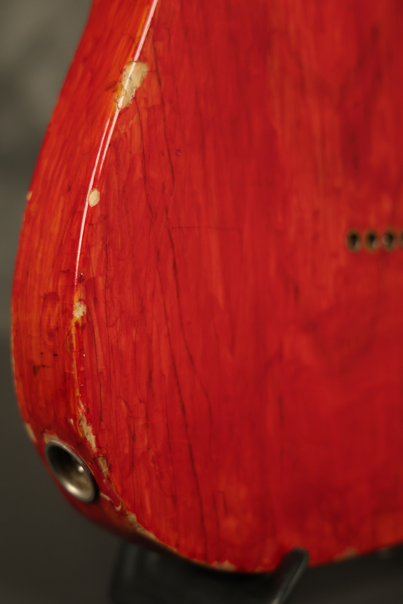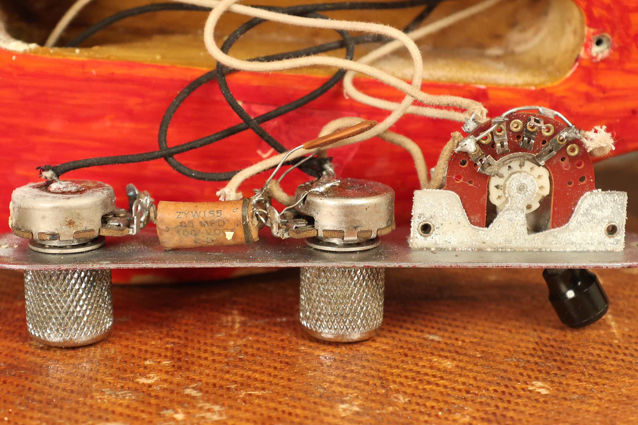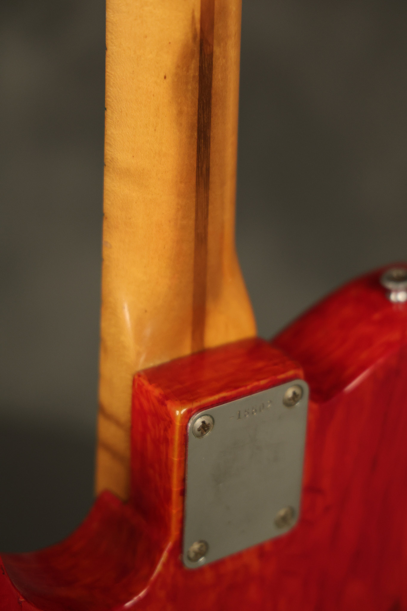1957 Fender Telecaster with a refinished neck and a poorly refinished body. It has a great playing neck with good frets as it has been refretted. Changed parts include the tuning keys, switch, one capacitor (one is missing), the nut and some of the screws. The original pickugard has been oversprayed and has a crack through one corner. The neck position pickup has some traces of blue on the underside and on the original wires which have been extended. The bridge position pickup has been rewound. All electronics work and sound great. The tone pot sounds a little dirty when it's turned all the way down. The lower screw for the control cavity does not have enough wood on the edge of the cavity to firmly grab, so it is rather loose. There are lots of nicks + dings, finish cracks and other cosmetic wear. The guitar itself remains structurally sound. The weight is 7 lbs. 3.4 oz. The original tweed hardshell case is included, but it is in poor condition with patched areas, one broken latch and the side pocket and neck rest was replaced with one from a later 1960's Fender case.